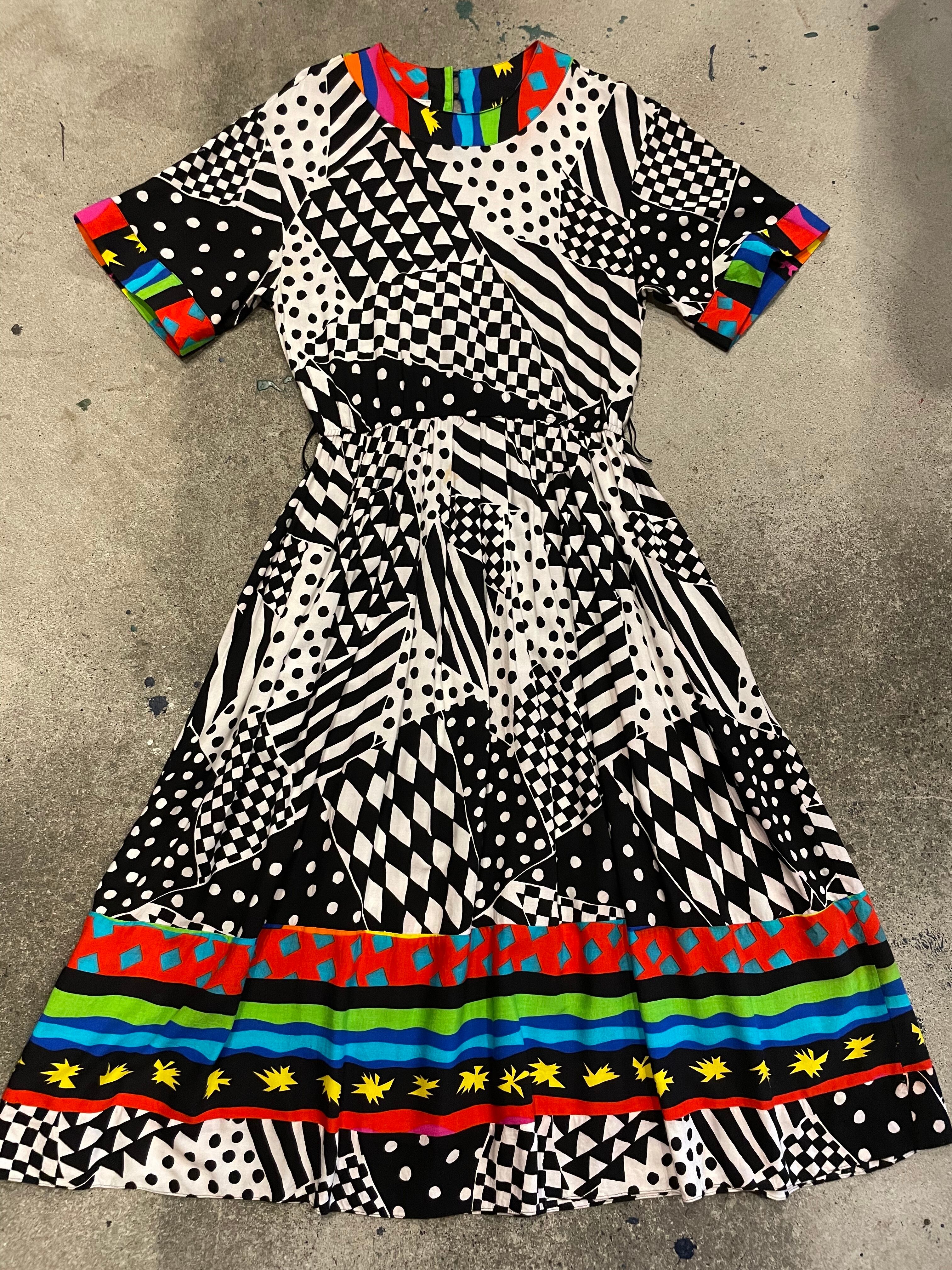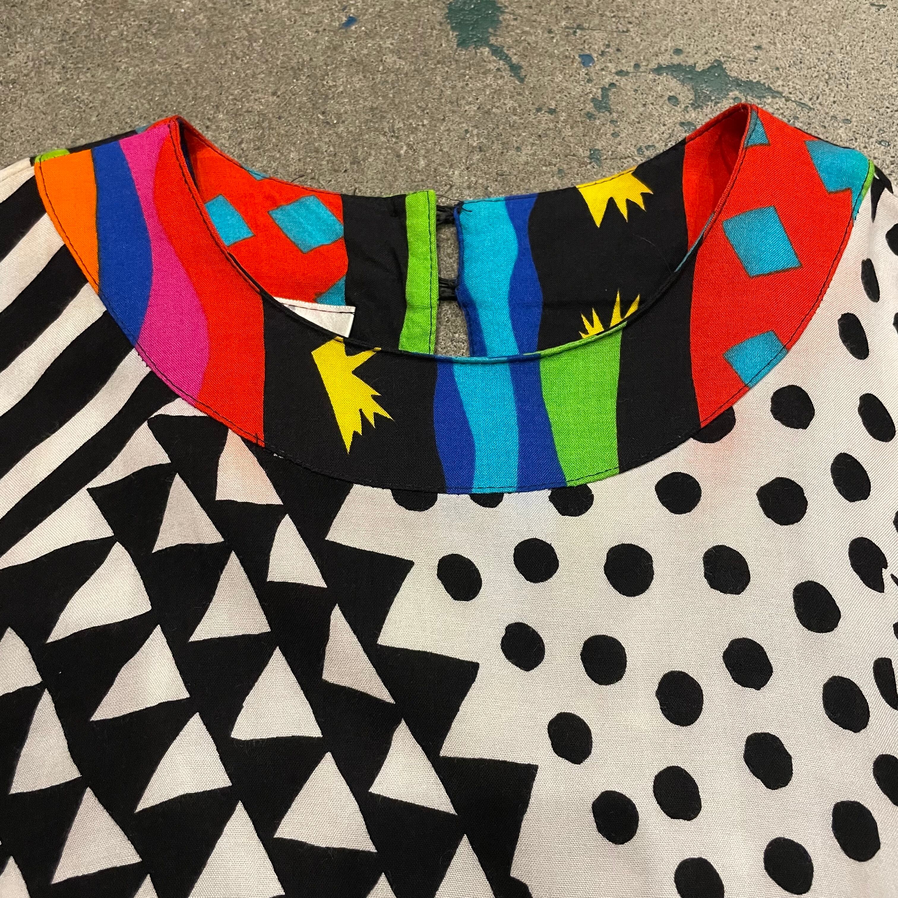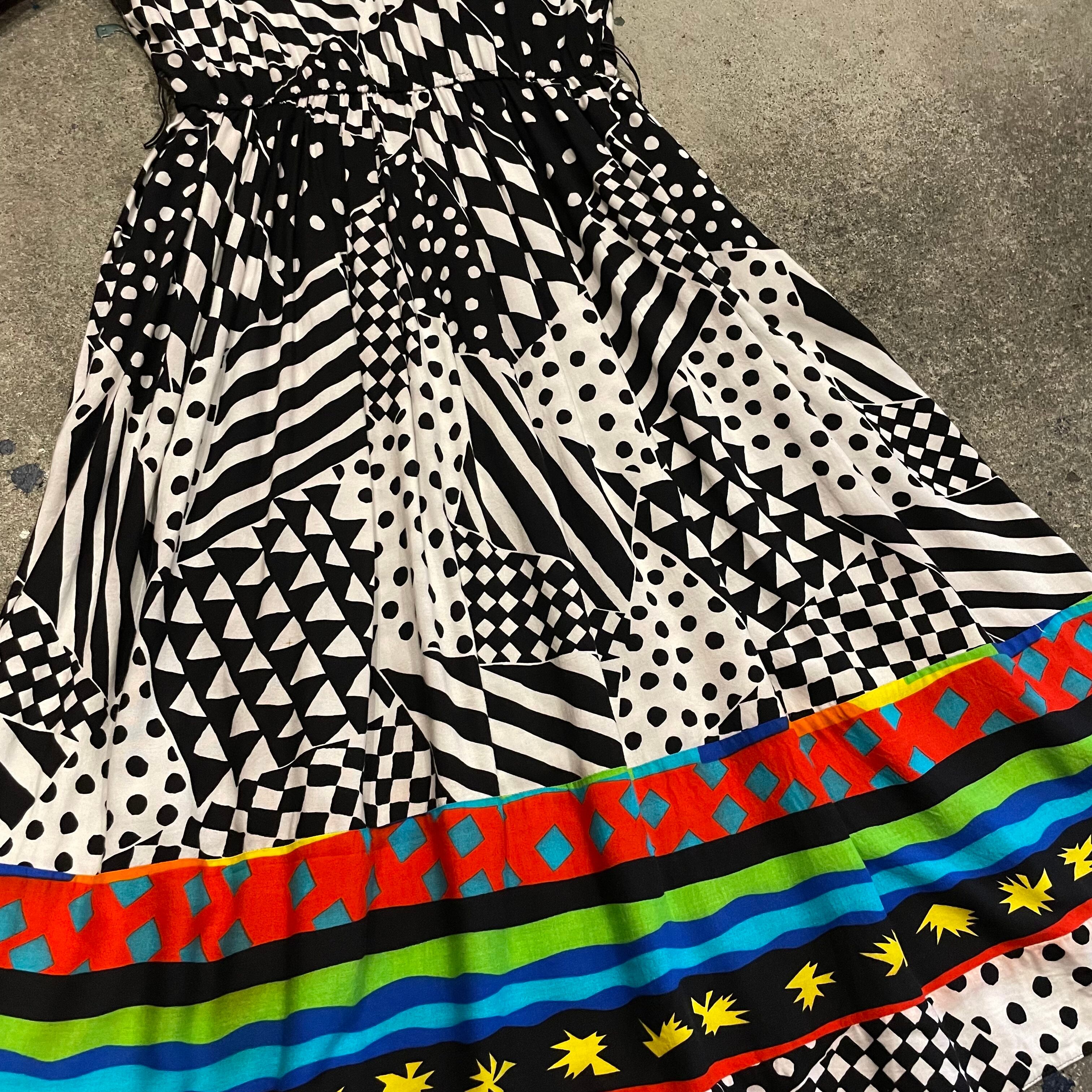 モノトーンとカラフルの柄×柄がかわいいワンピースです。とてもポップでアートな雰囲気が良いですね。長めの袖と程よいボリューム感があり、ウエストはゴムが入っています。ベルトでウエストマークしたり、大振りのアクセサリーをつけたり、頭にスカーフを巻いても可愛いと思います。