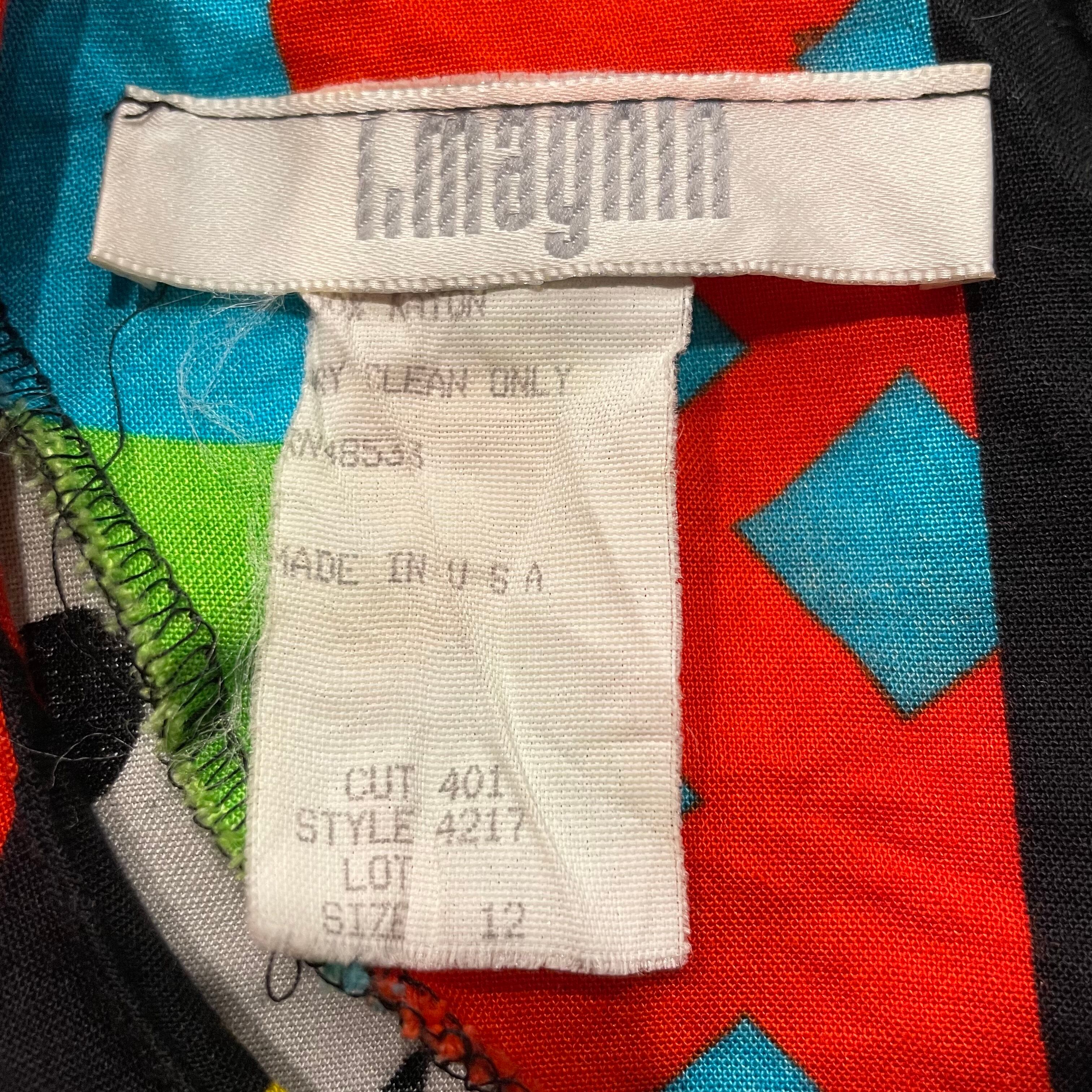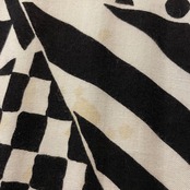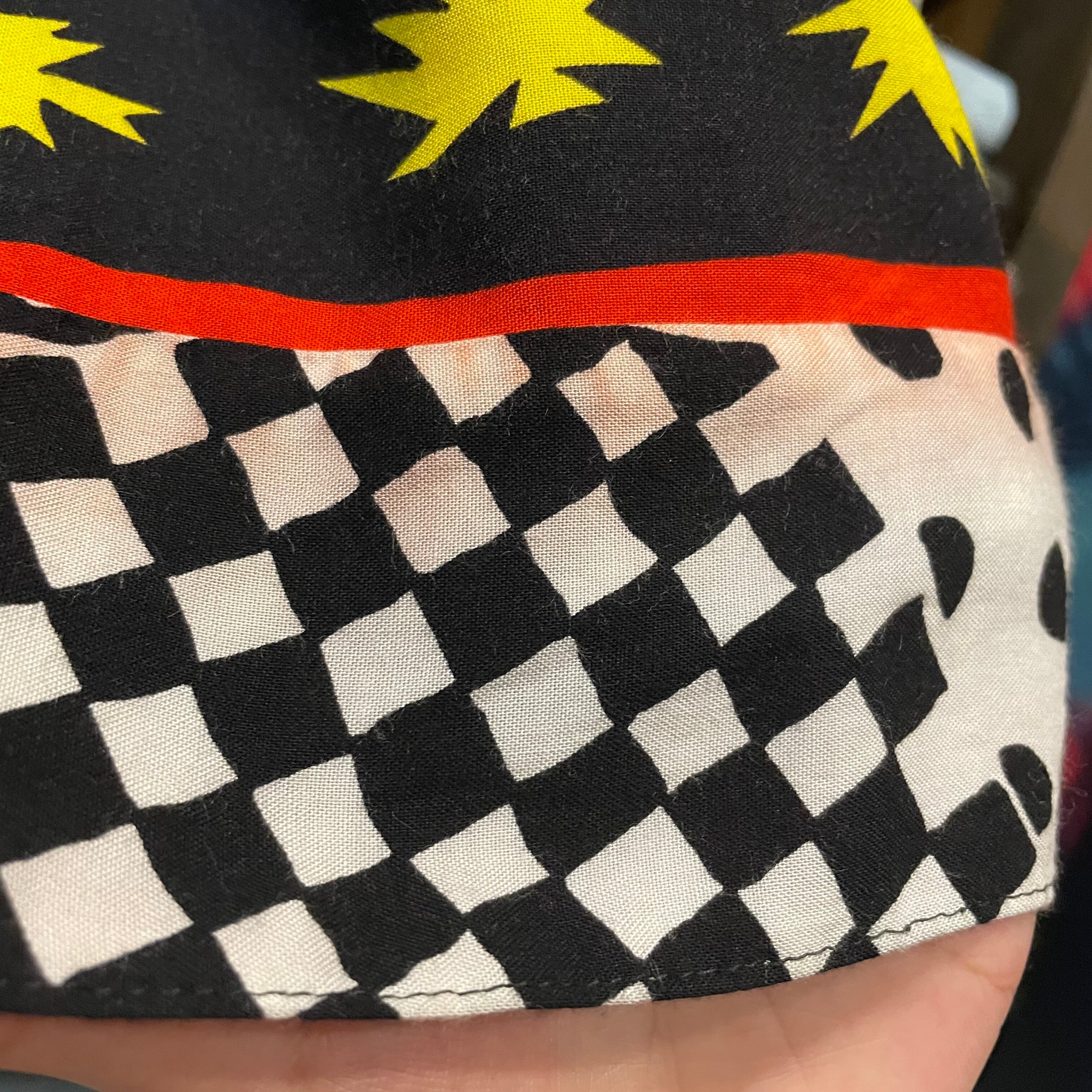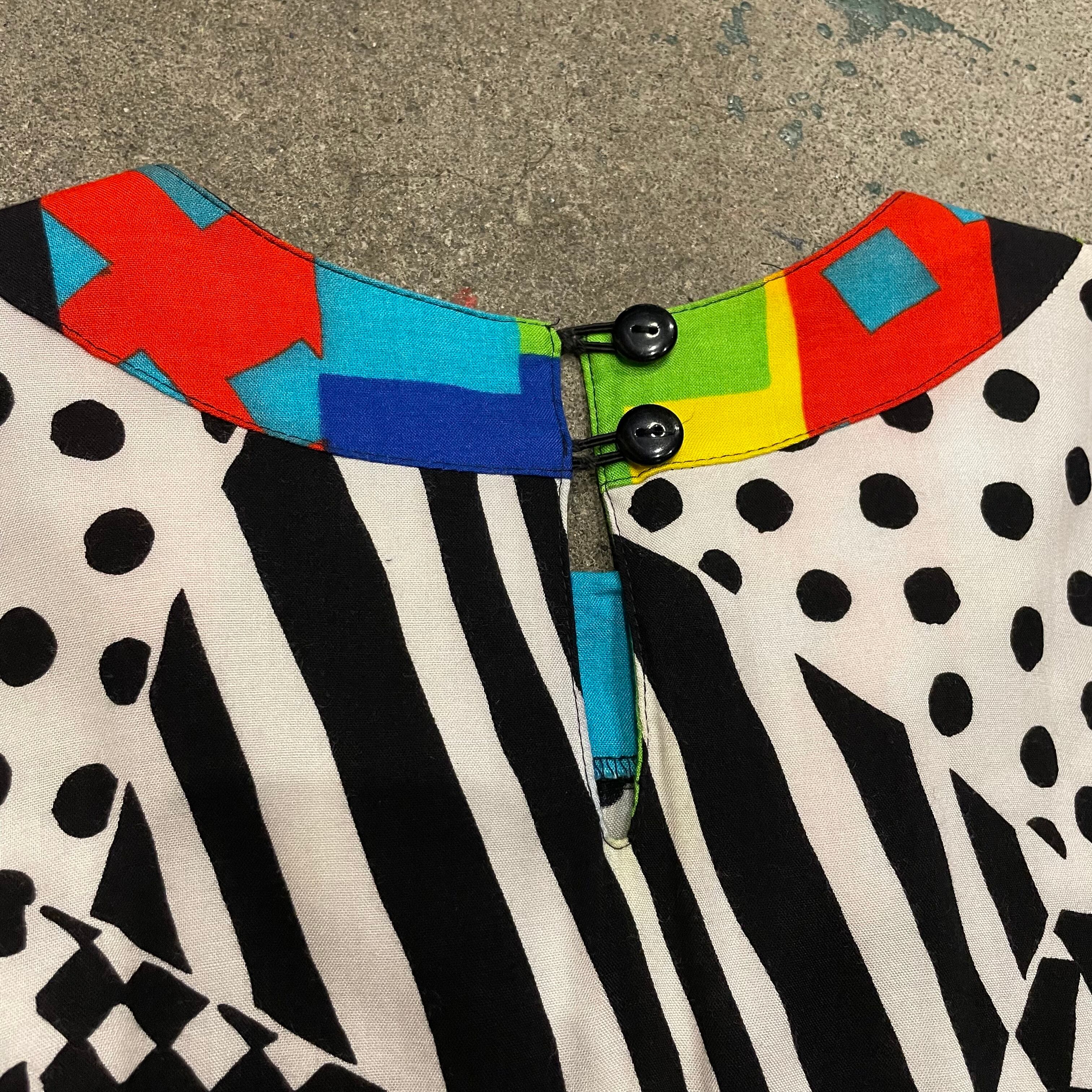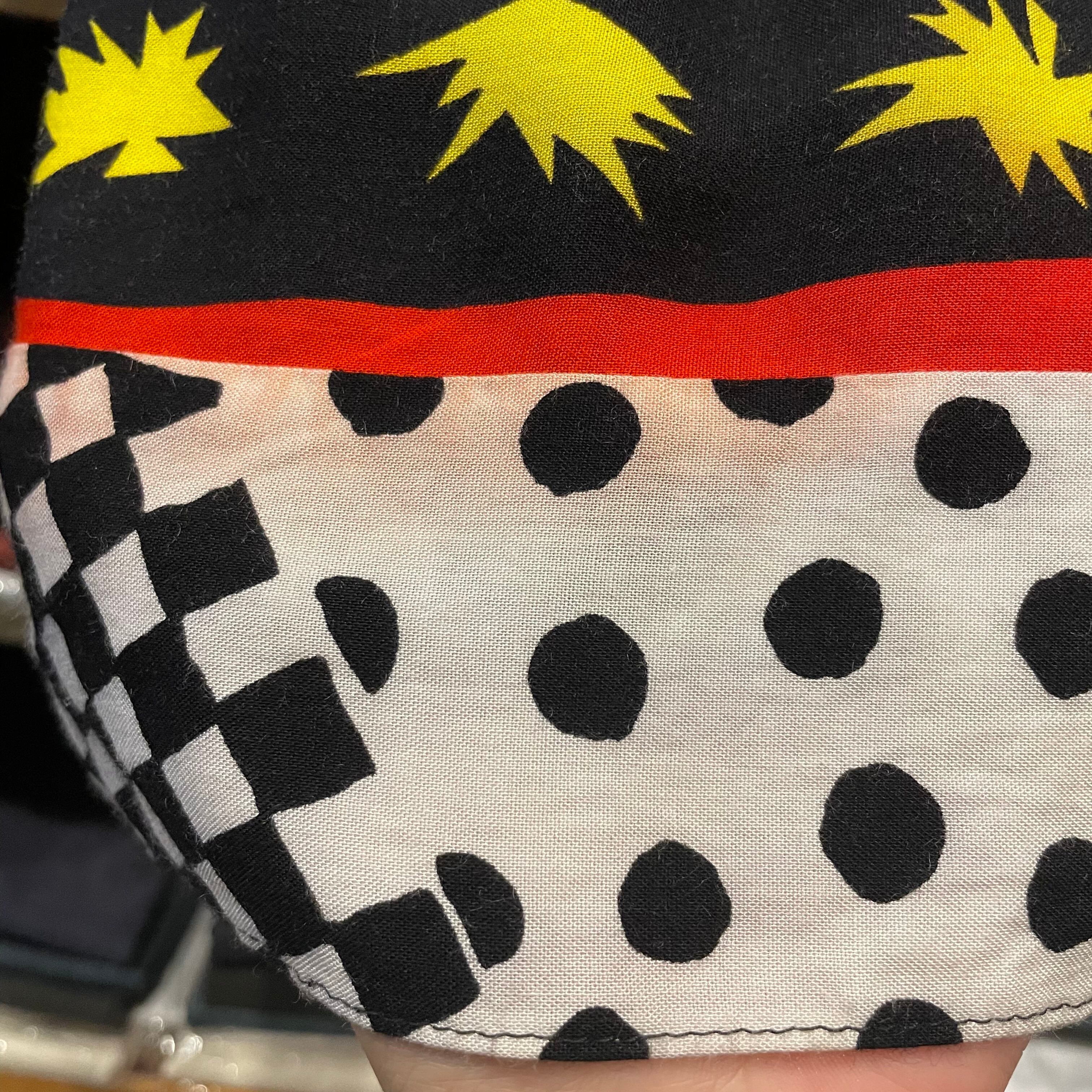 モノトーンとカラフルの柄×柄がかわいいワンピースです。とてもポップでアートな雰囲気が良いですね。長めの袖と程よいボリューム感があり、ウエストはゴムが入っています。ベルトでウエストマークしたり、大振りのアクセサリーをつけたり、頭にスカーフを巻いても可愛いと思います。