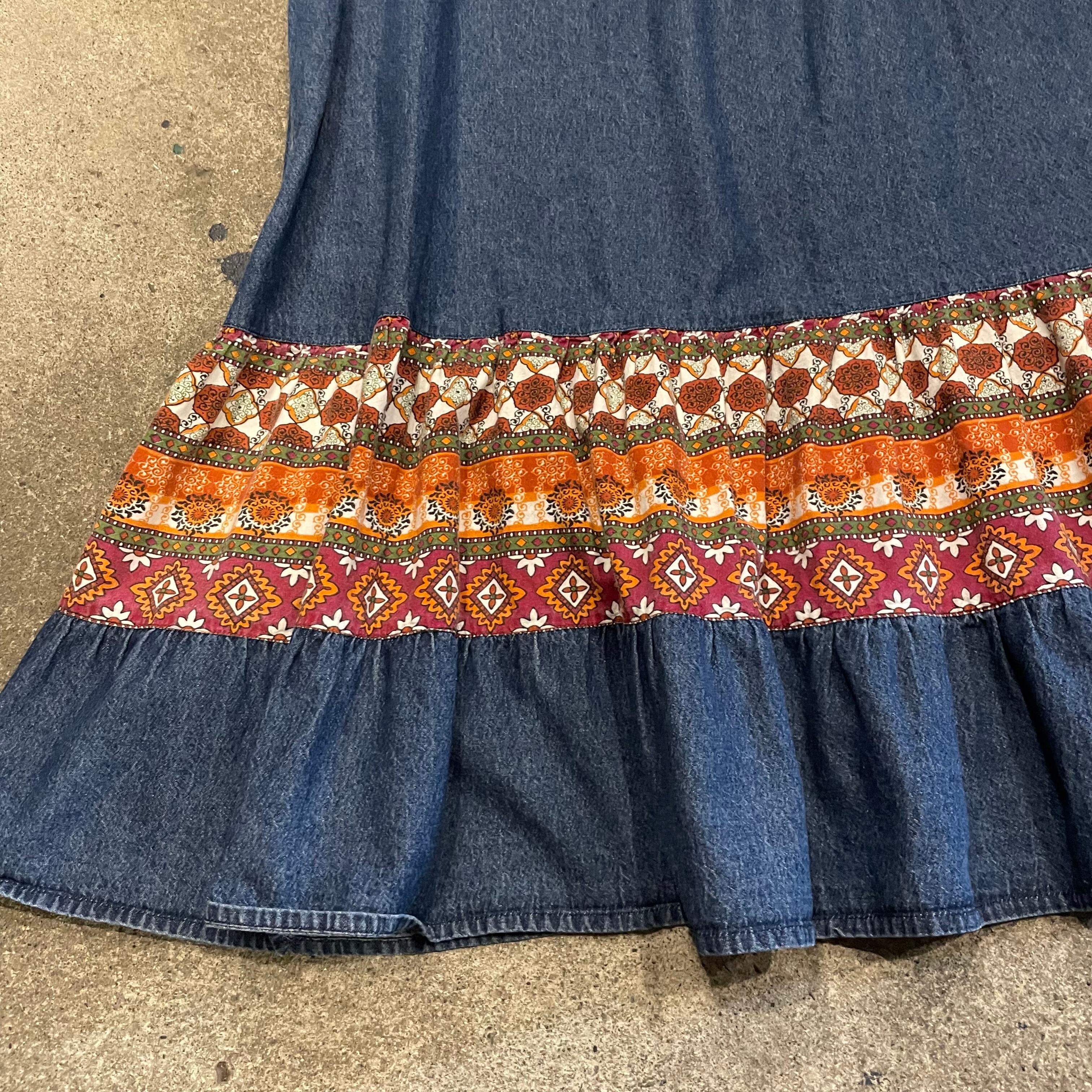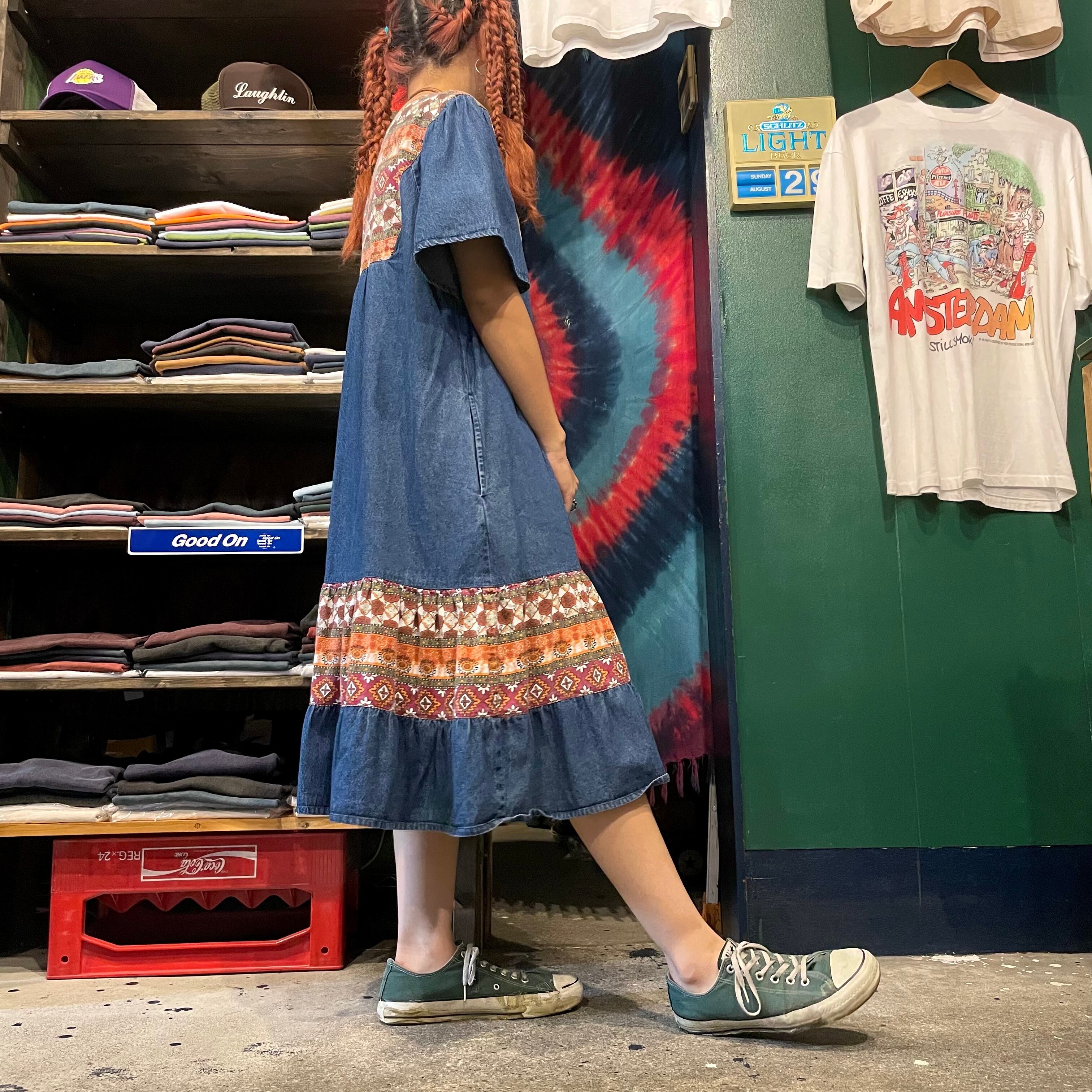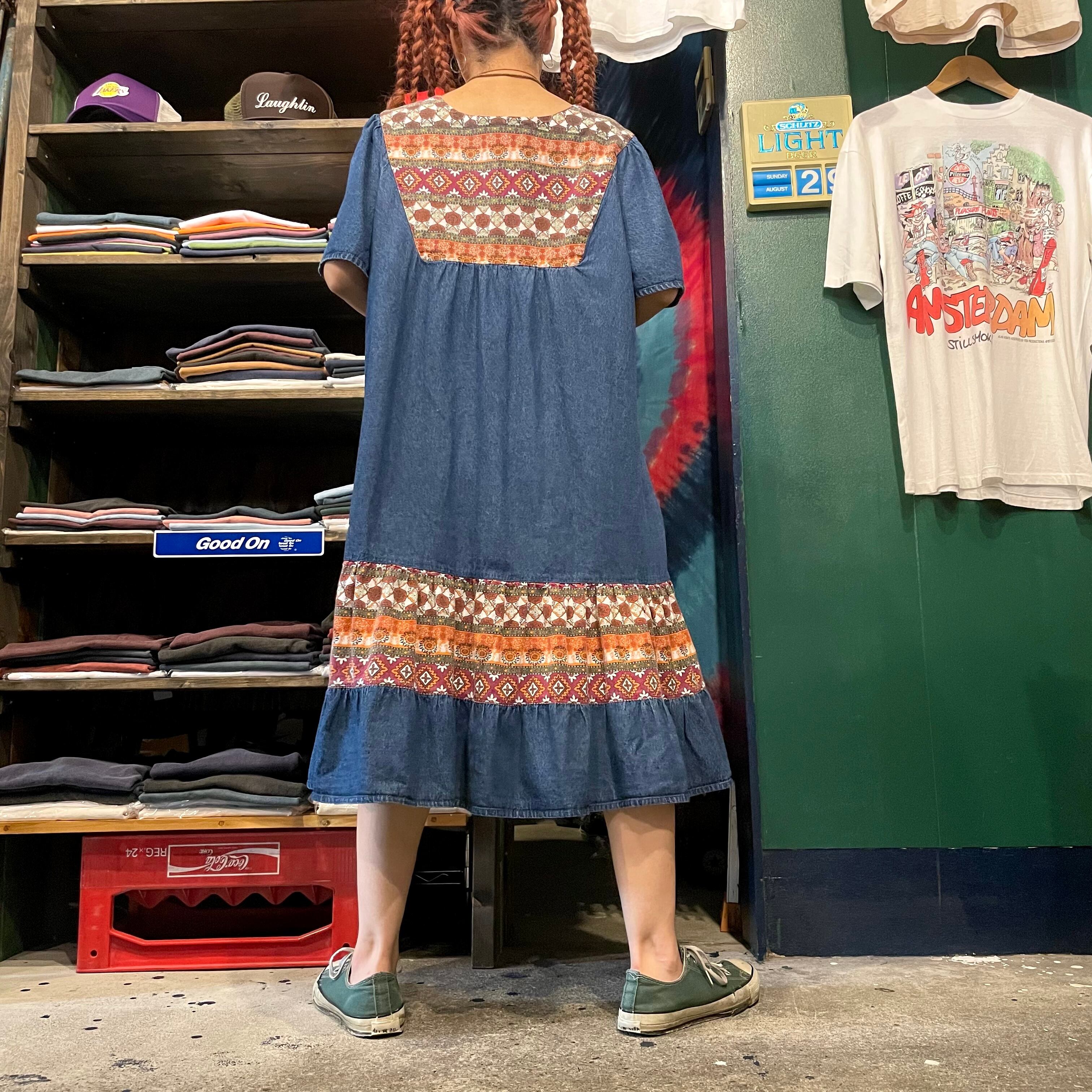 柔らかめのデニムと、タイルのような模様がかわいい生地の切り替えワンピースです。