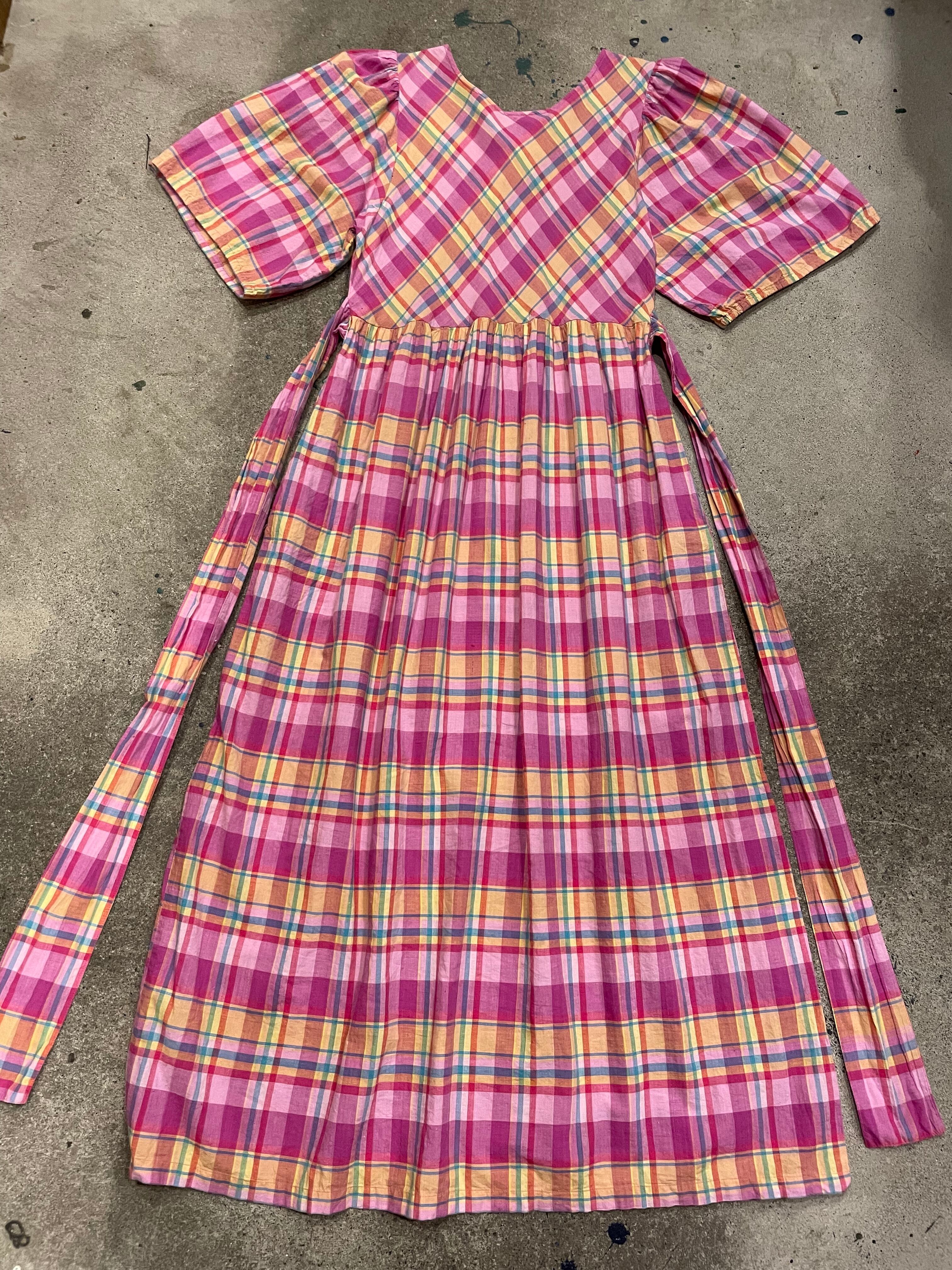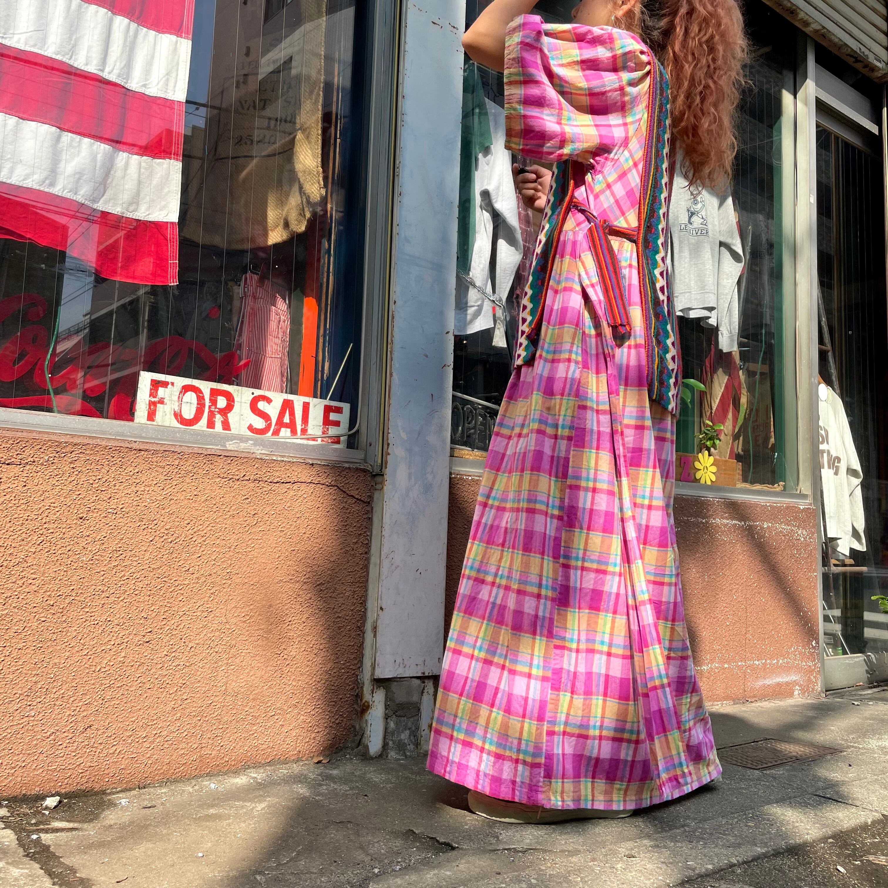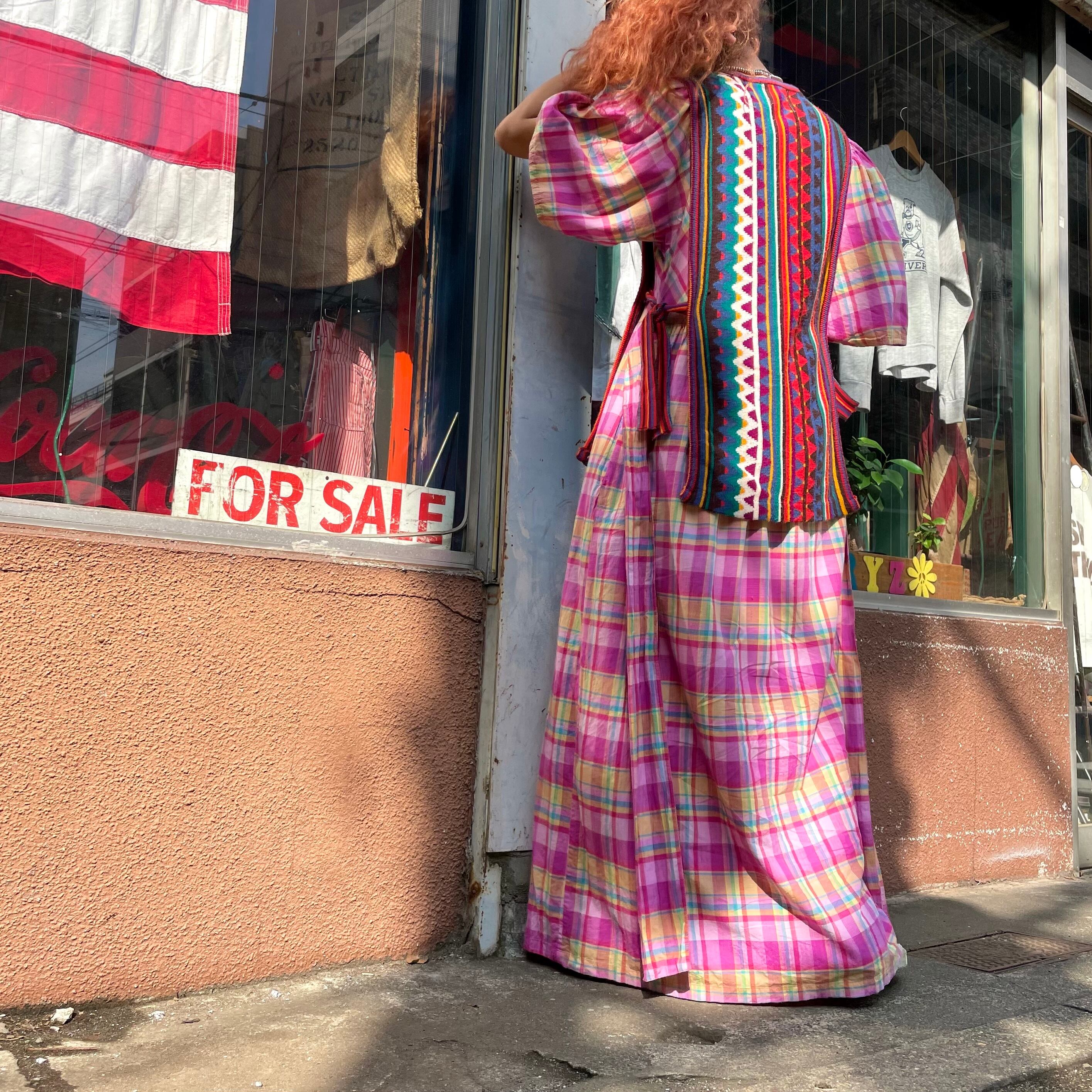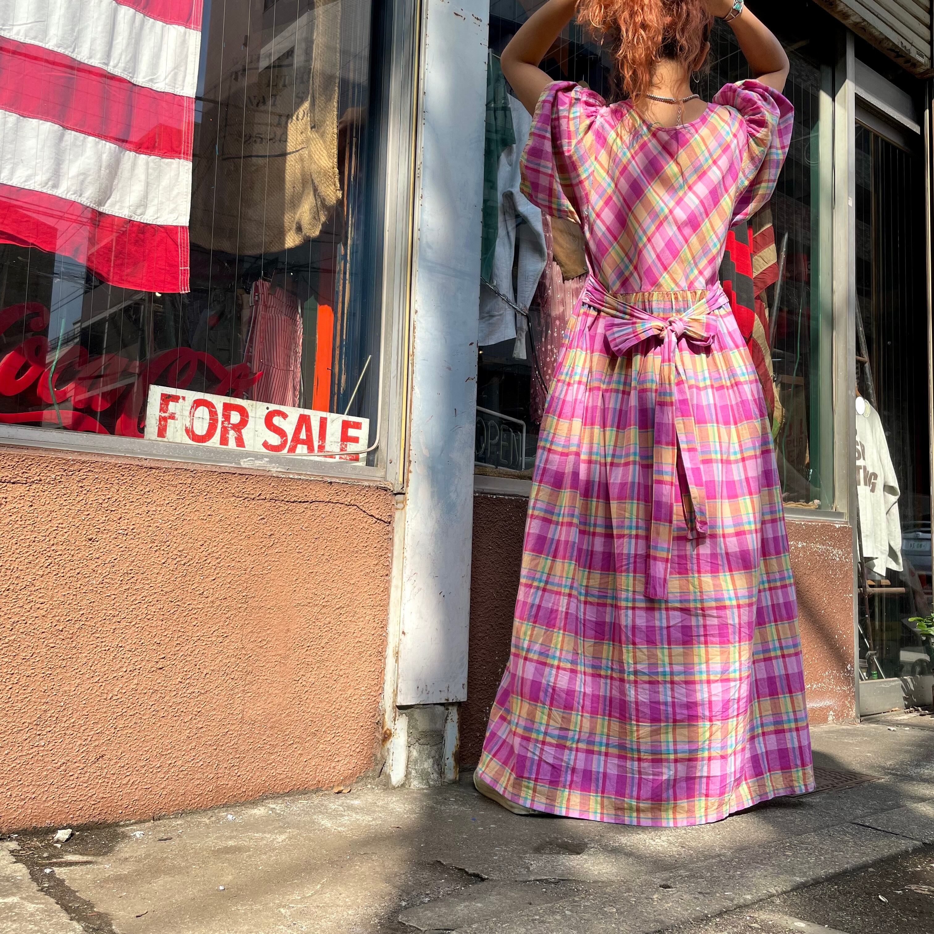 明るいピンク系のチェックがかわいいワンピースです。ボリュームのある袖、長めの丈、ゆったりしたサイズが良い感じでラブリーになりすぎず着ていただけると思います。