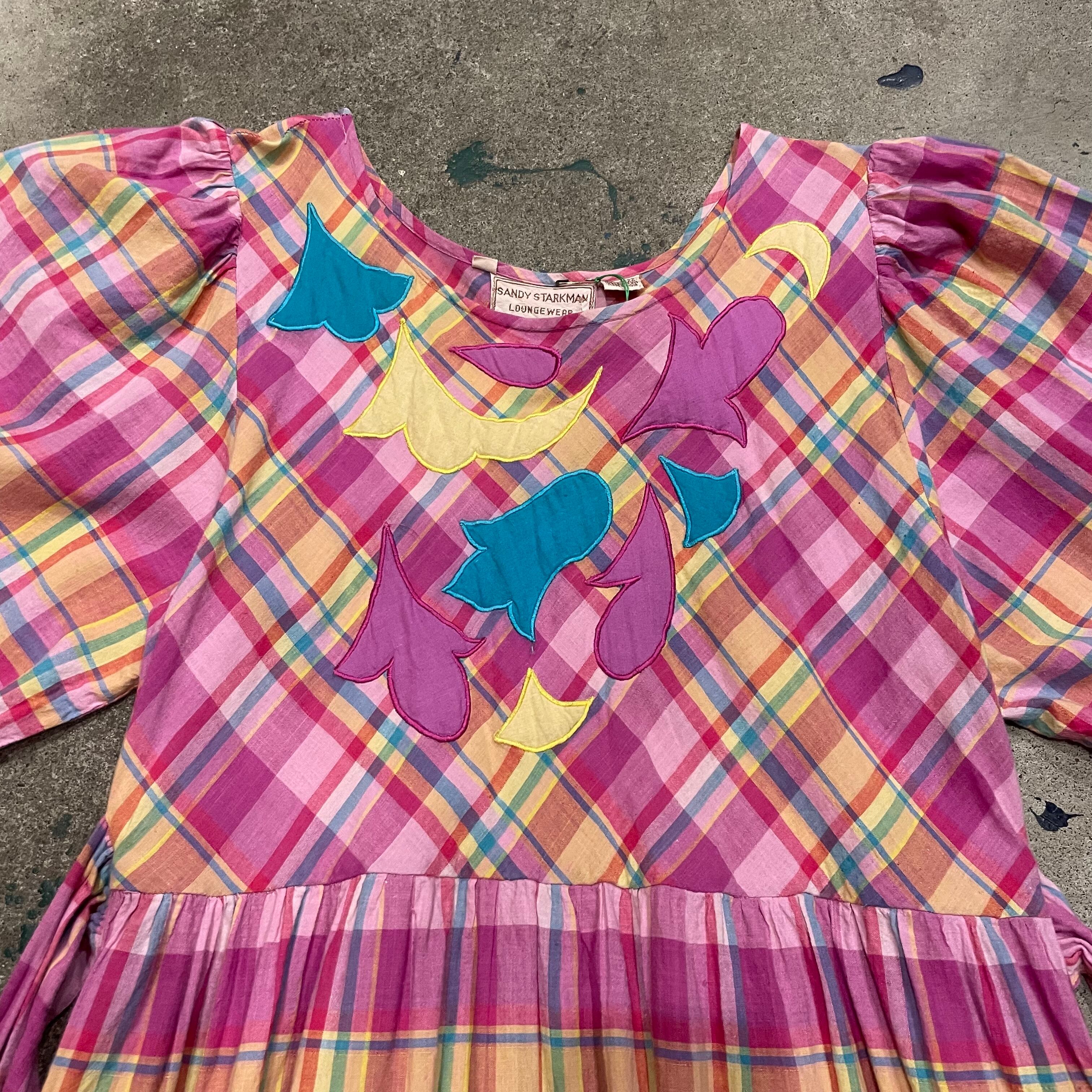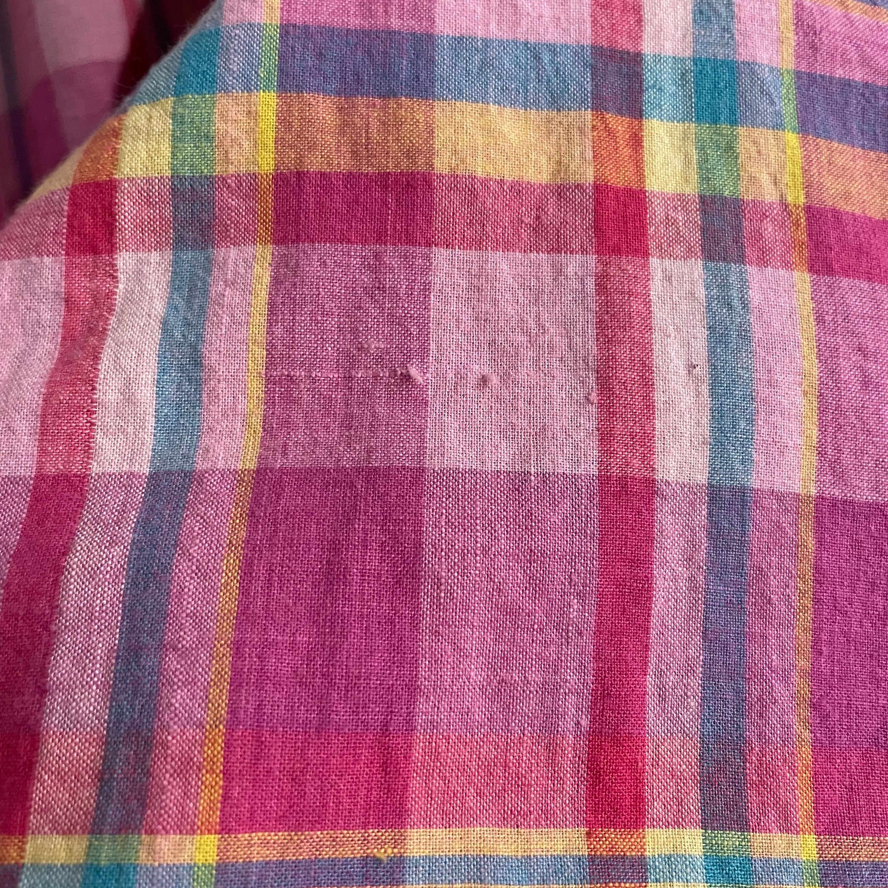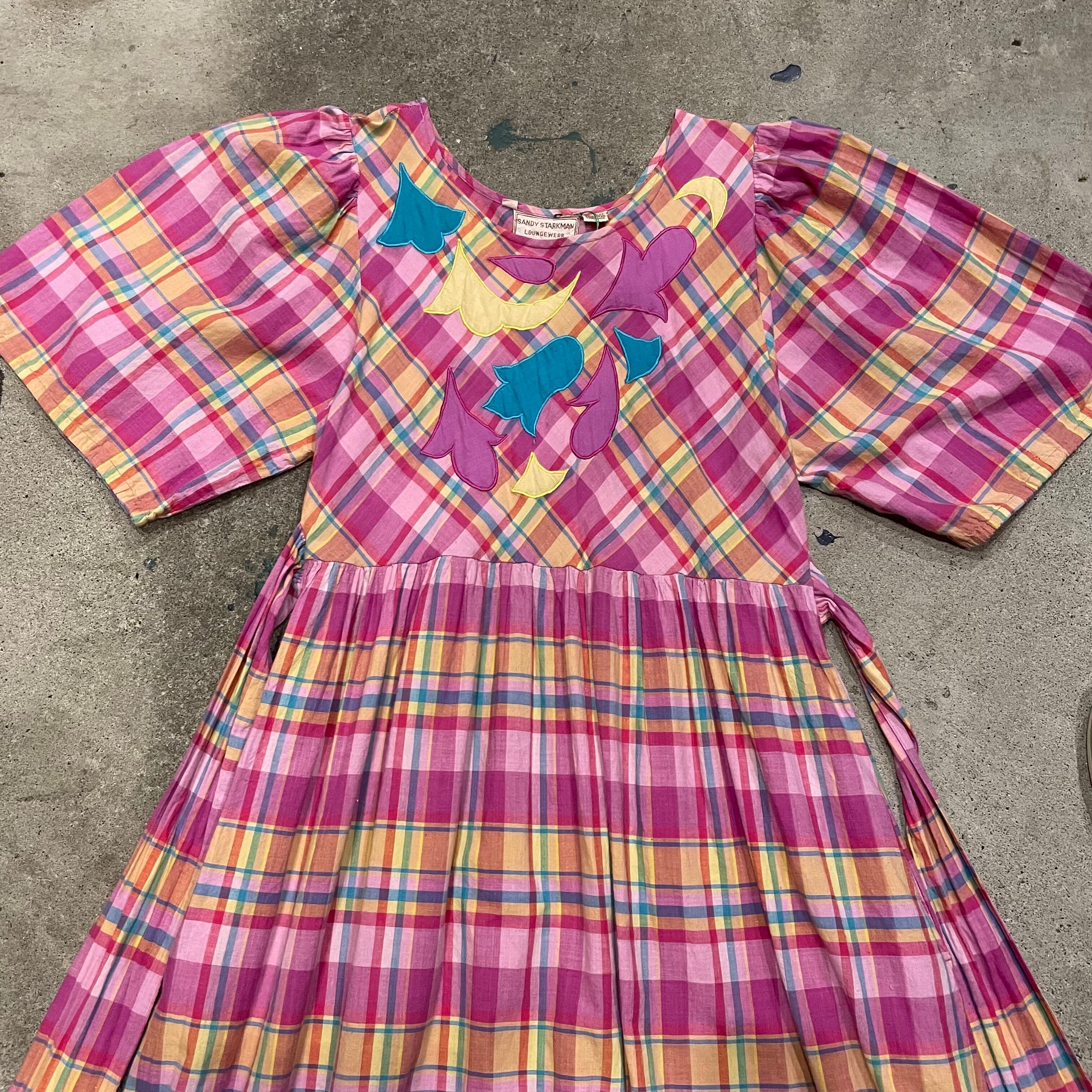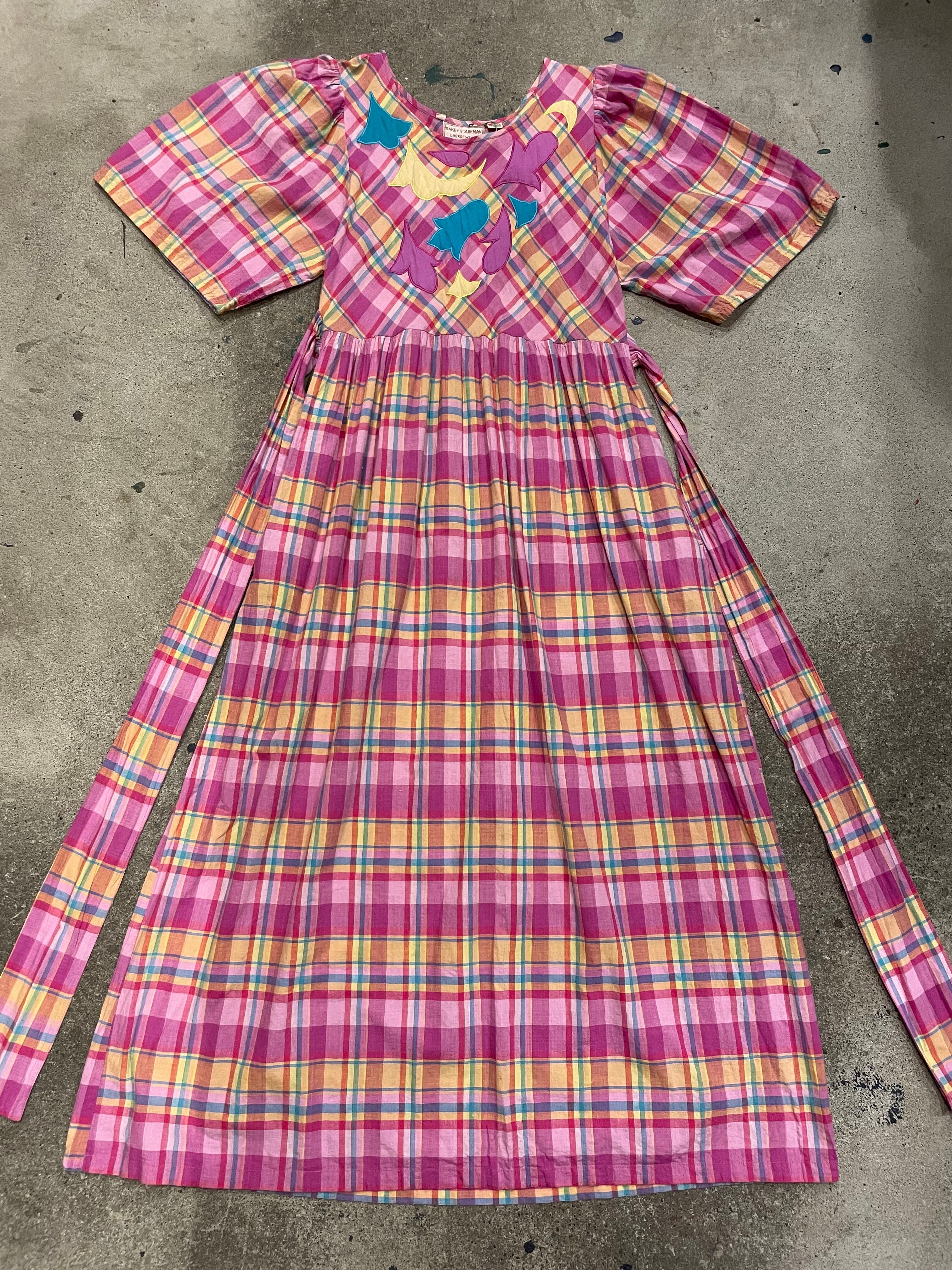 明るいピンク系のチェックがかわいいワンピースです。ボリュームのある袖、長めの丈、ゆったりしたサイズが良い感じでラブリーになりすぎず着ていただけると思います。