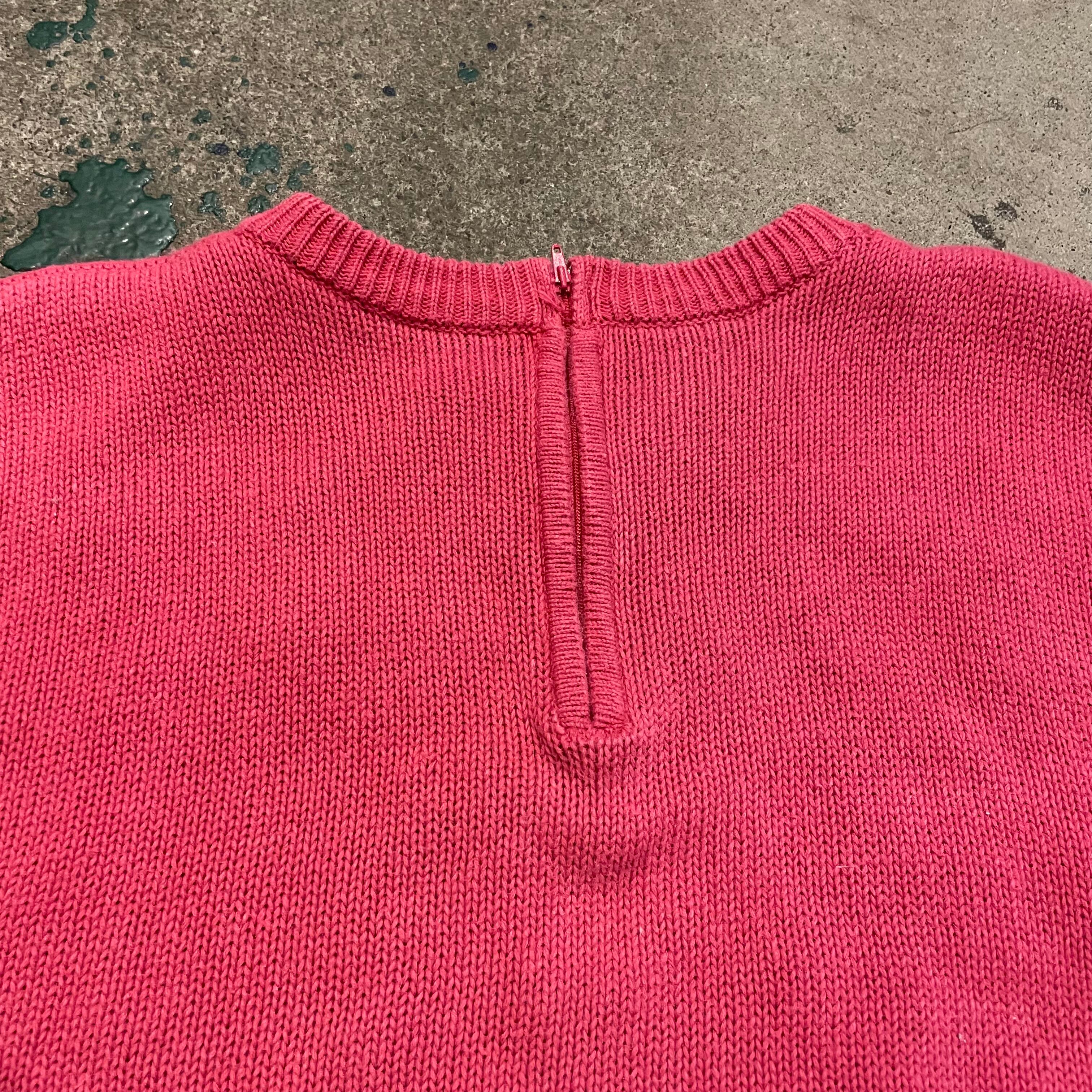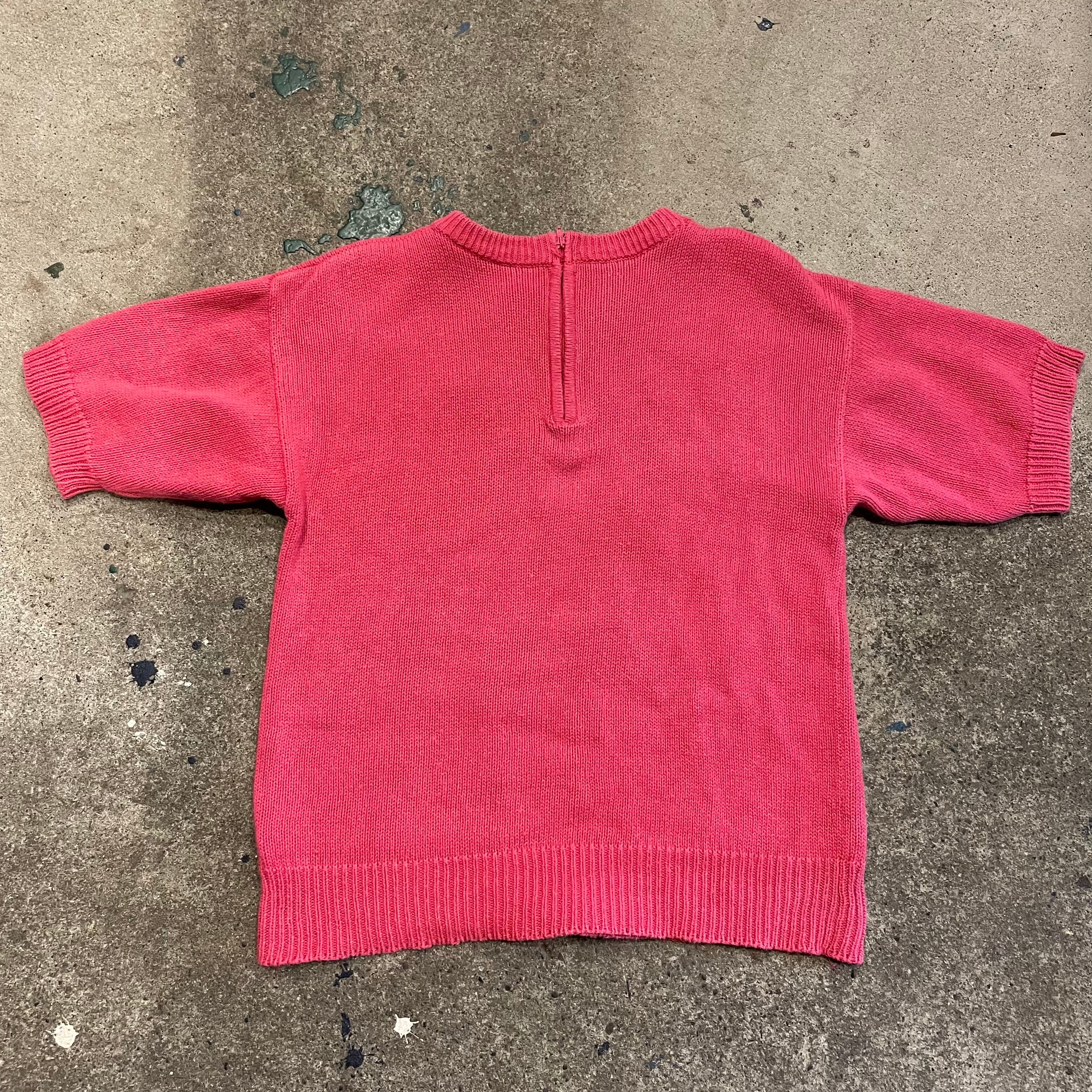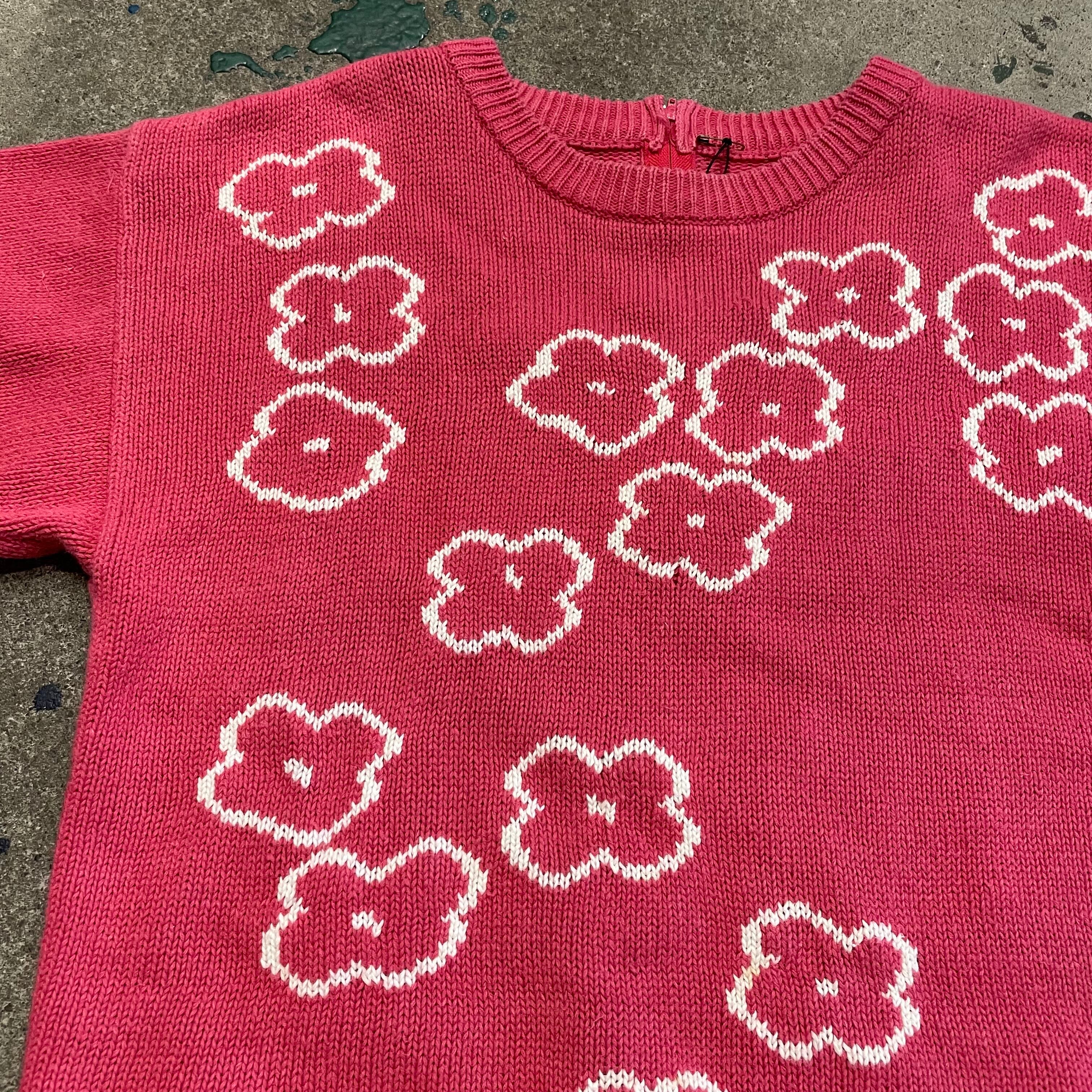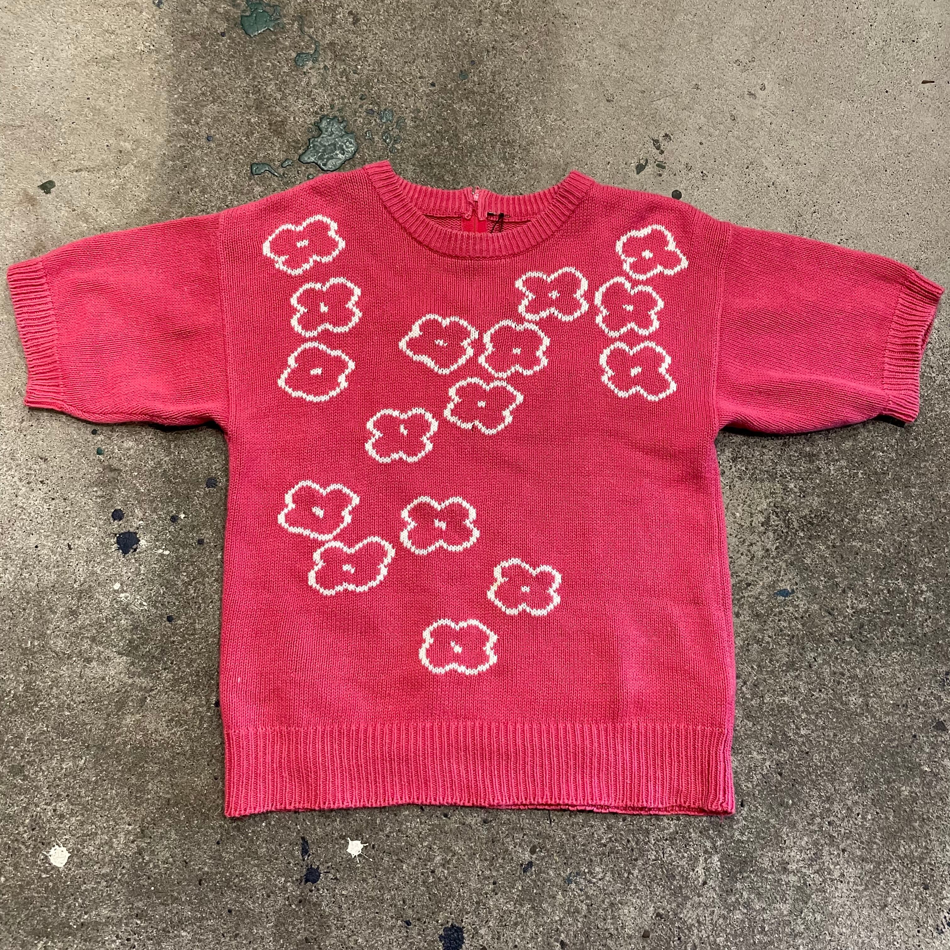 ピンクに白のゆるい花柄がかわいい半袖ニットです。サイズも程よく、ボーダーのロンTやサーマルなどを重ねたり、長袖ワンピースの上に重ねたりいろいろお楽しみ頂けると思います。