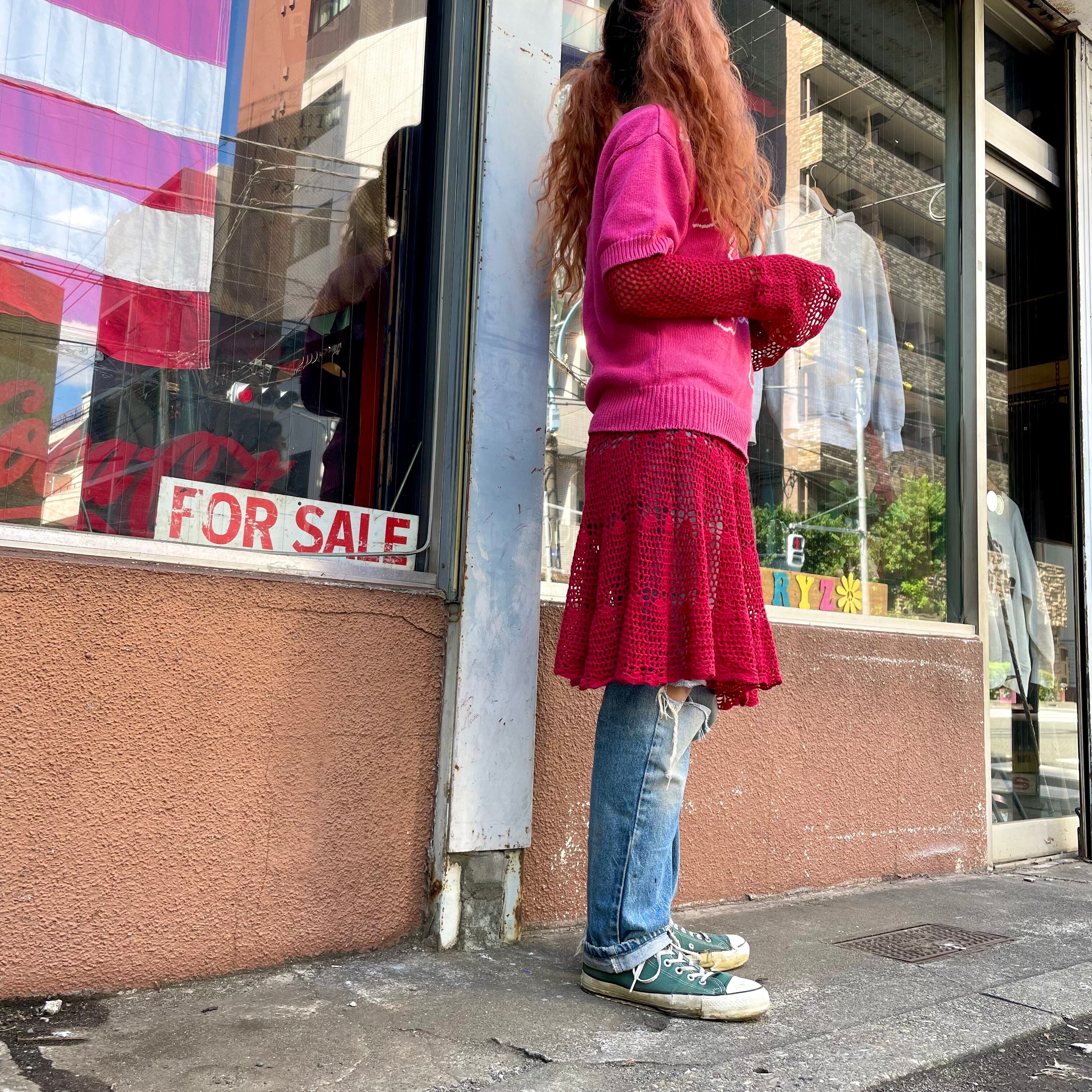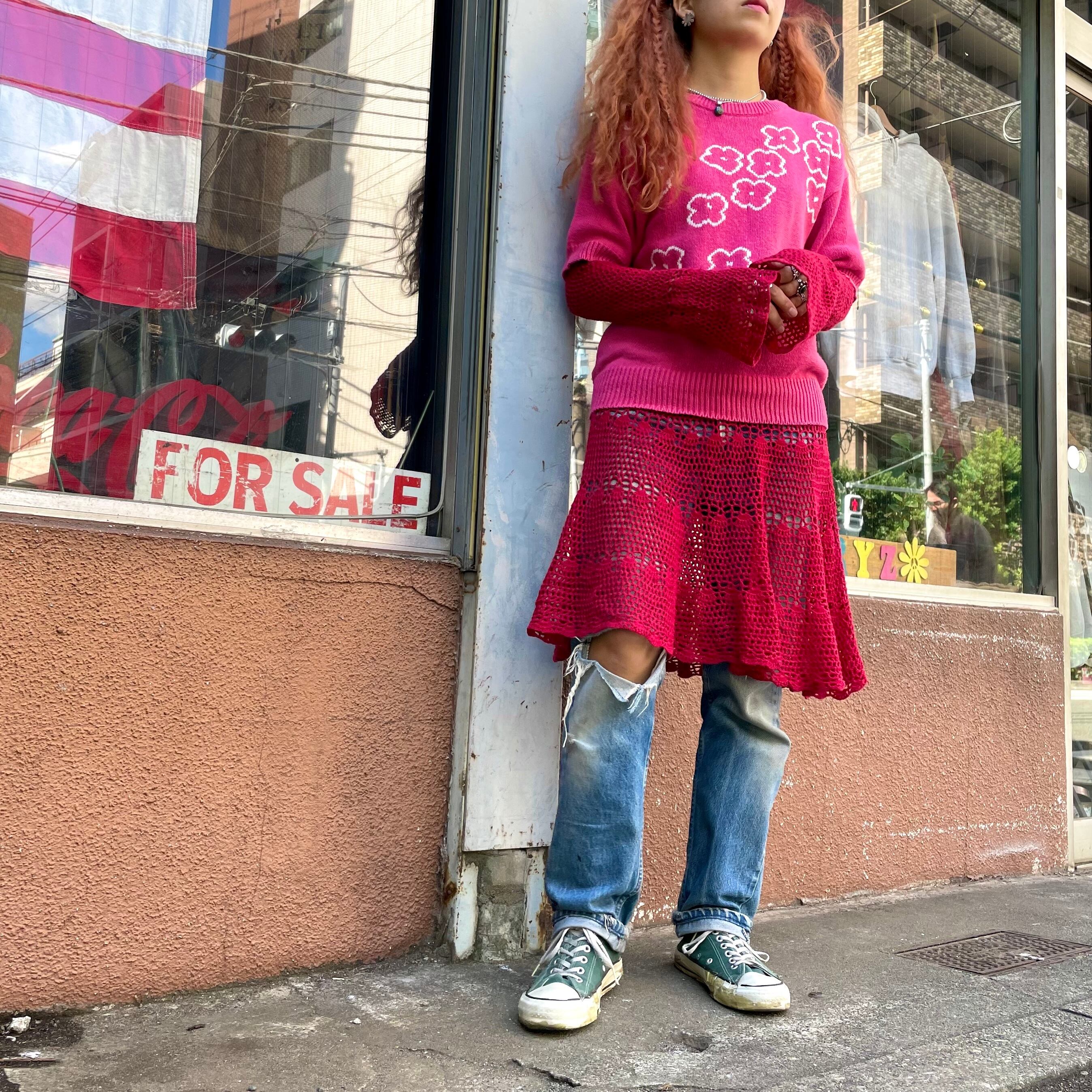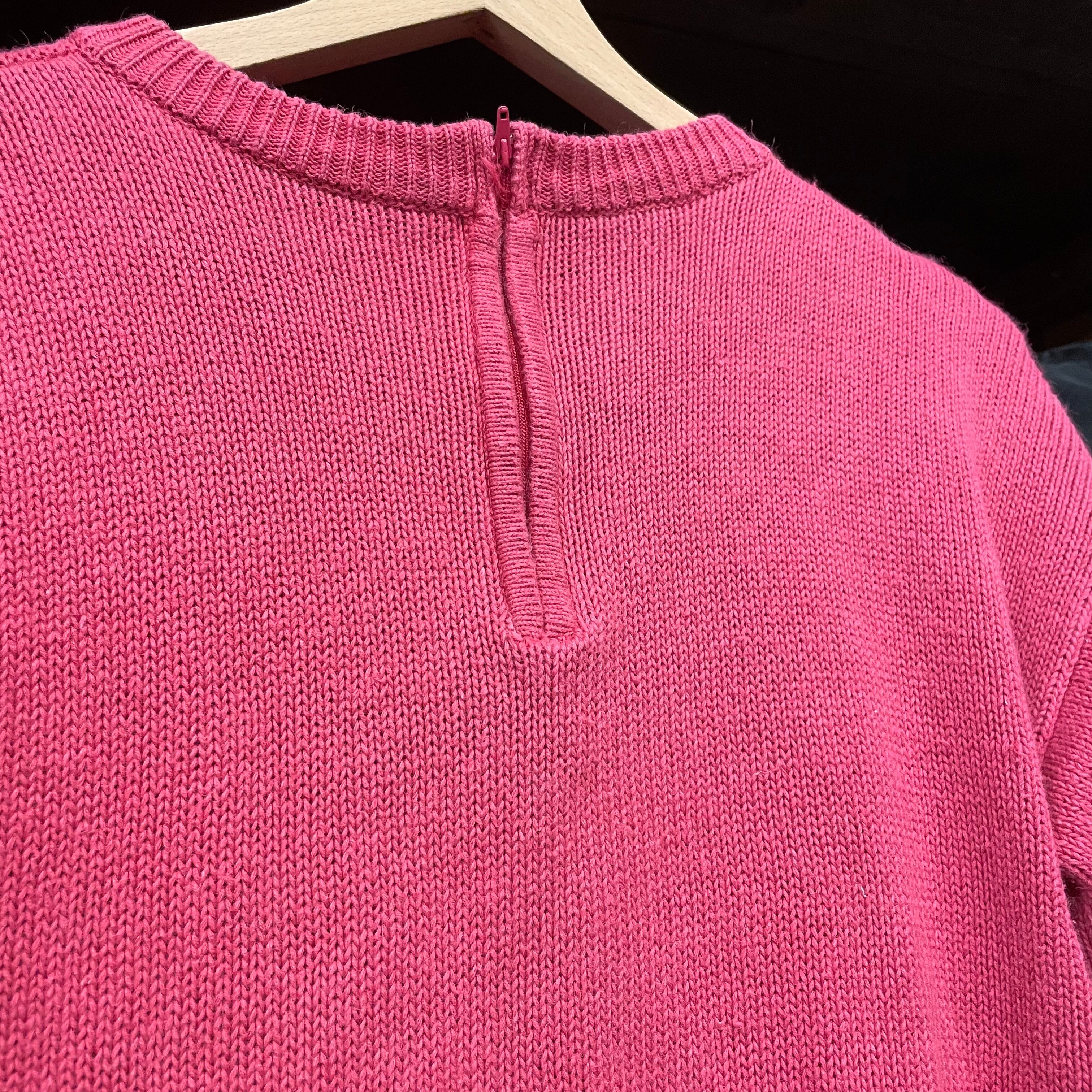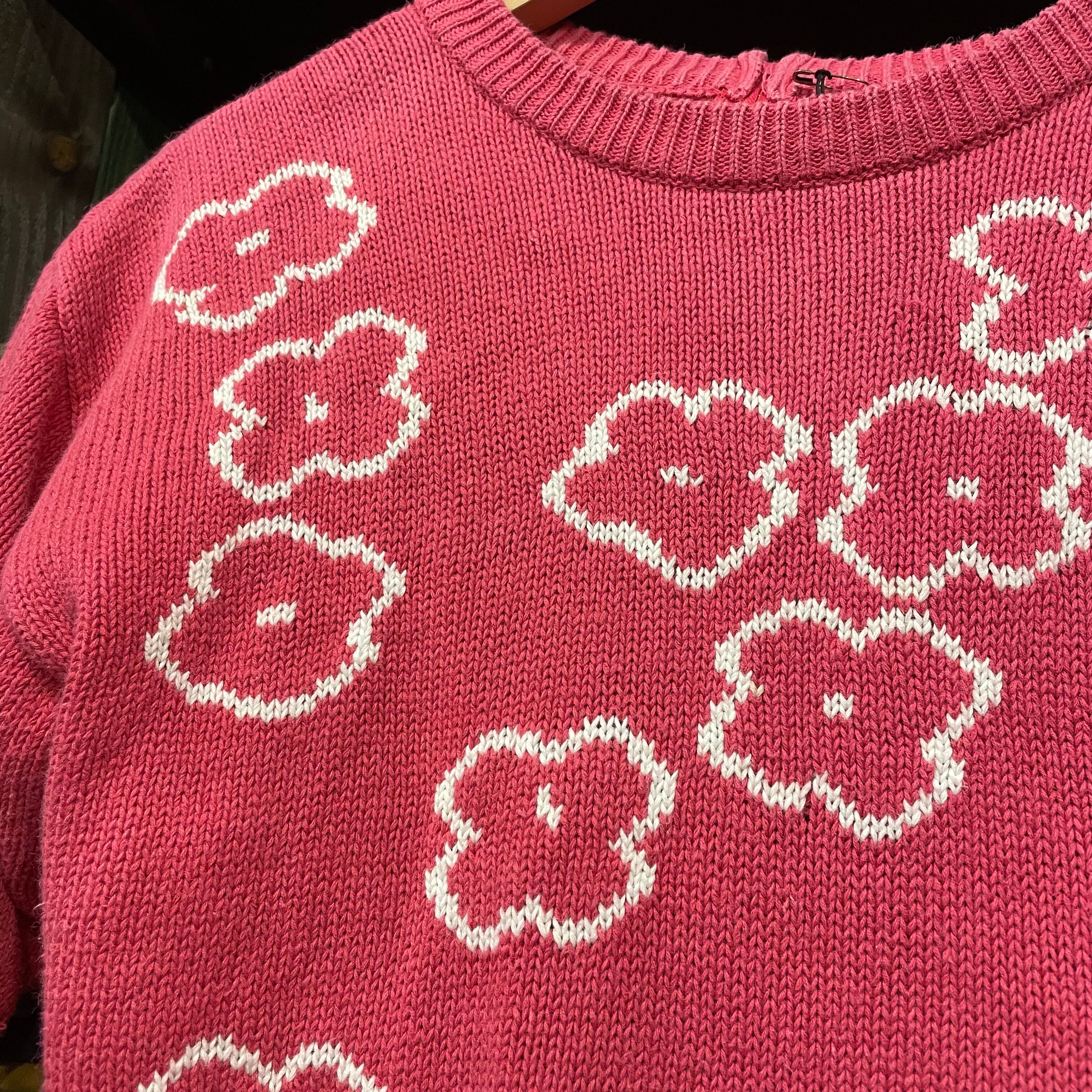 ピンクに白のゆるい花柄がかわいい半袖ニットです。サイズも程よく、ボーダーのロンTやサーマルなどを重ねたり、長袖ワンピースの上に重ねたりいろいろお楽しみ頂けると思います。