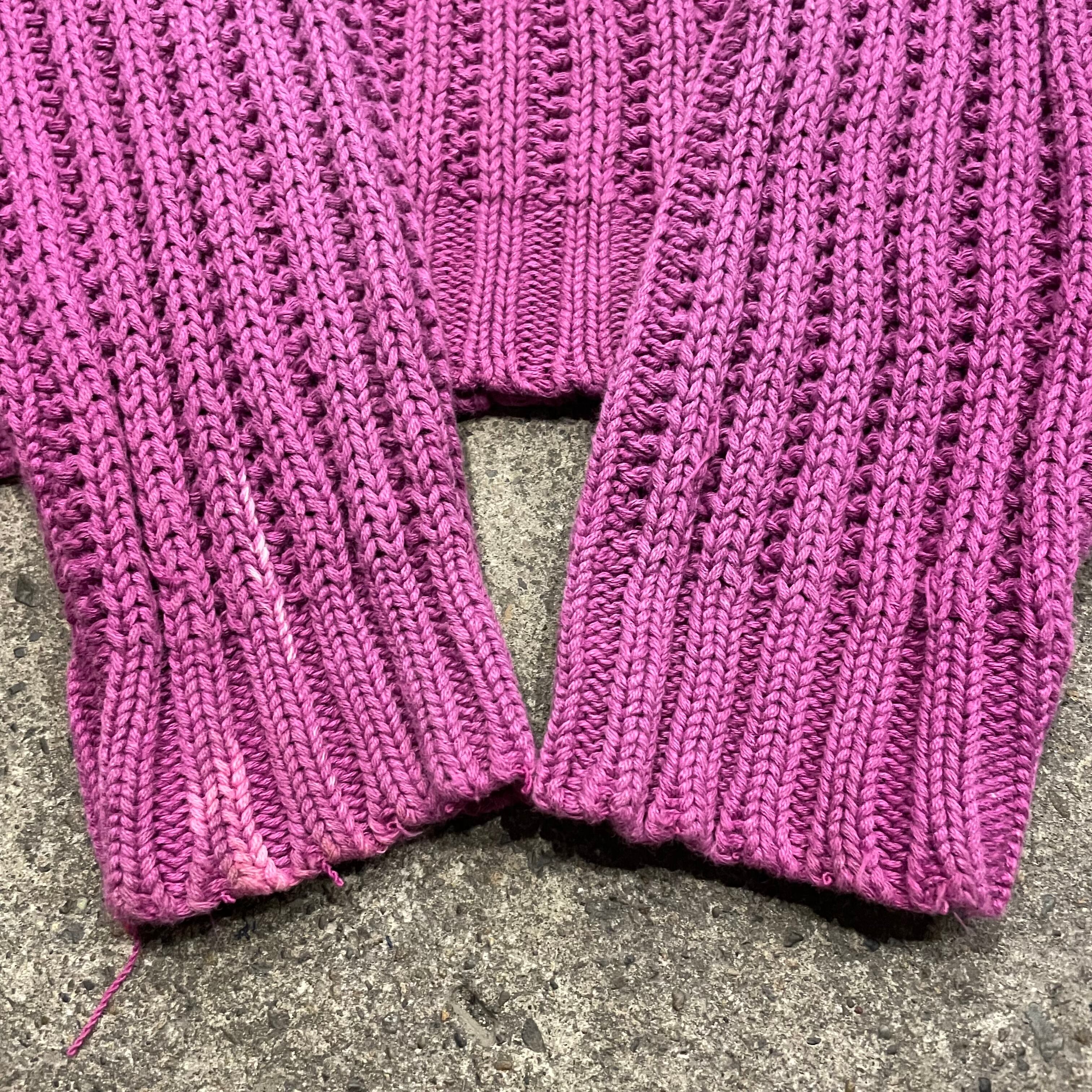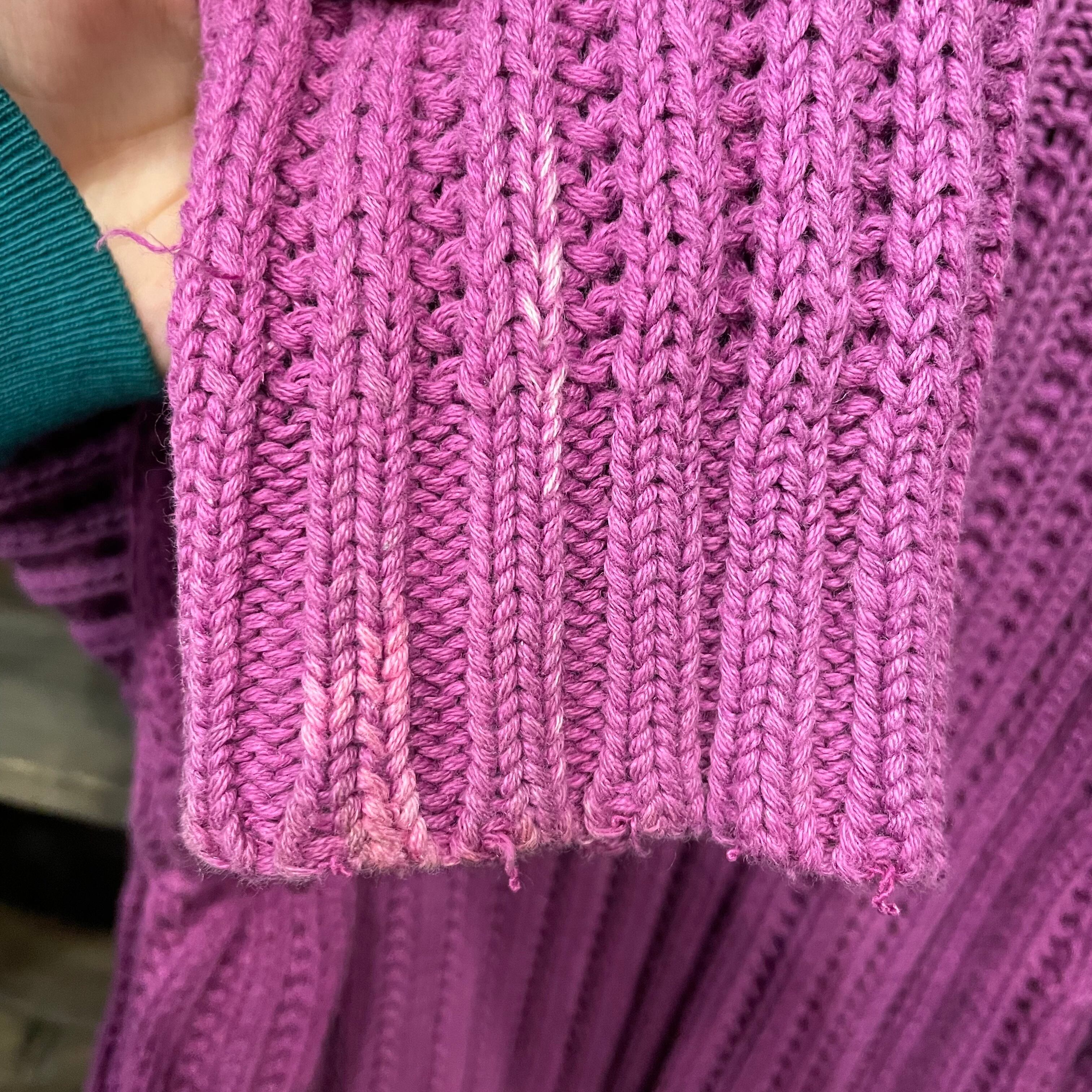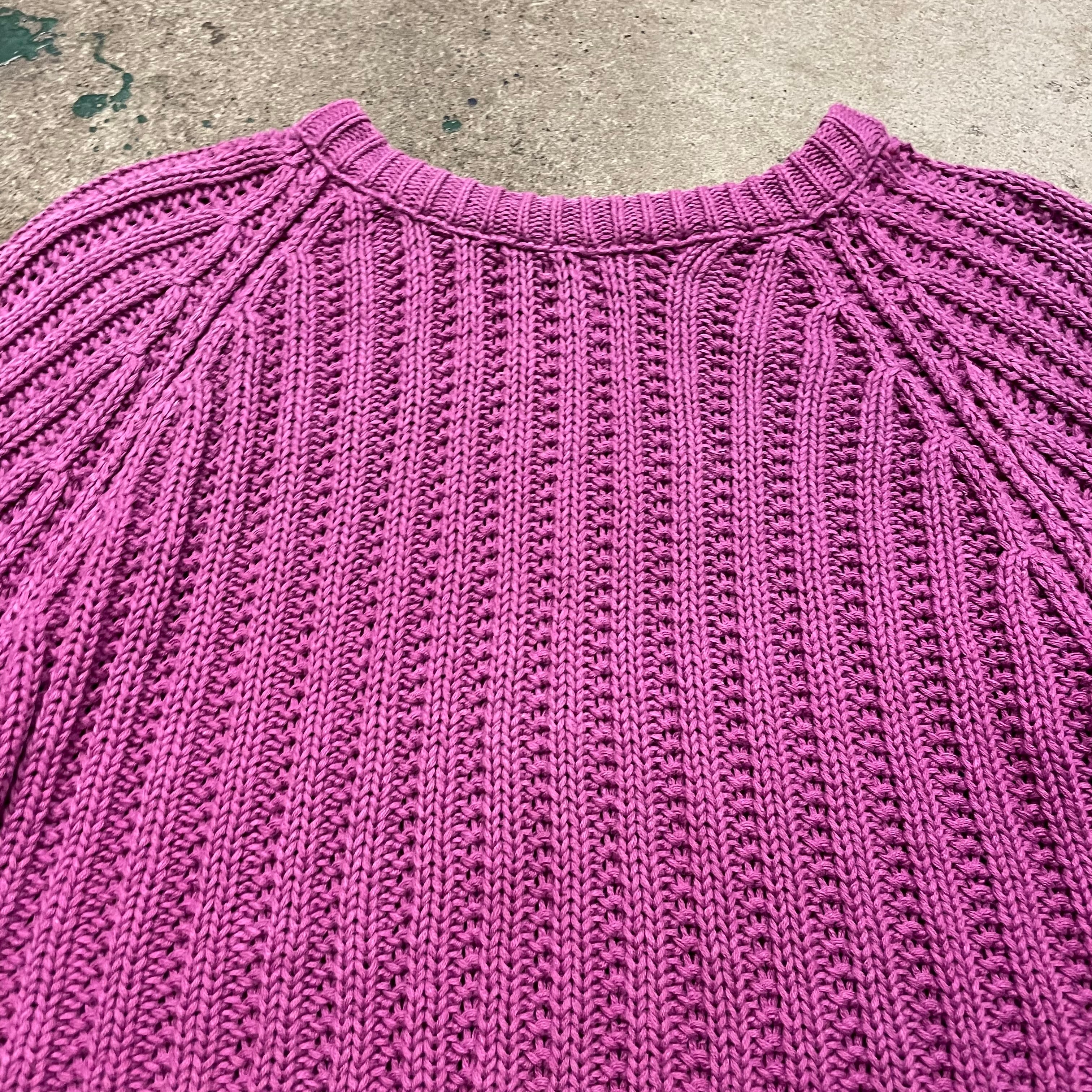 明るい紫がかわいいコットンニットセーターです。太めの糸でざくざく編まれている感じで、短めの丈感も合わせやすくて良いですね。