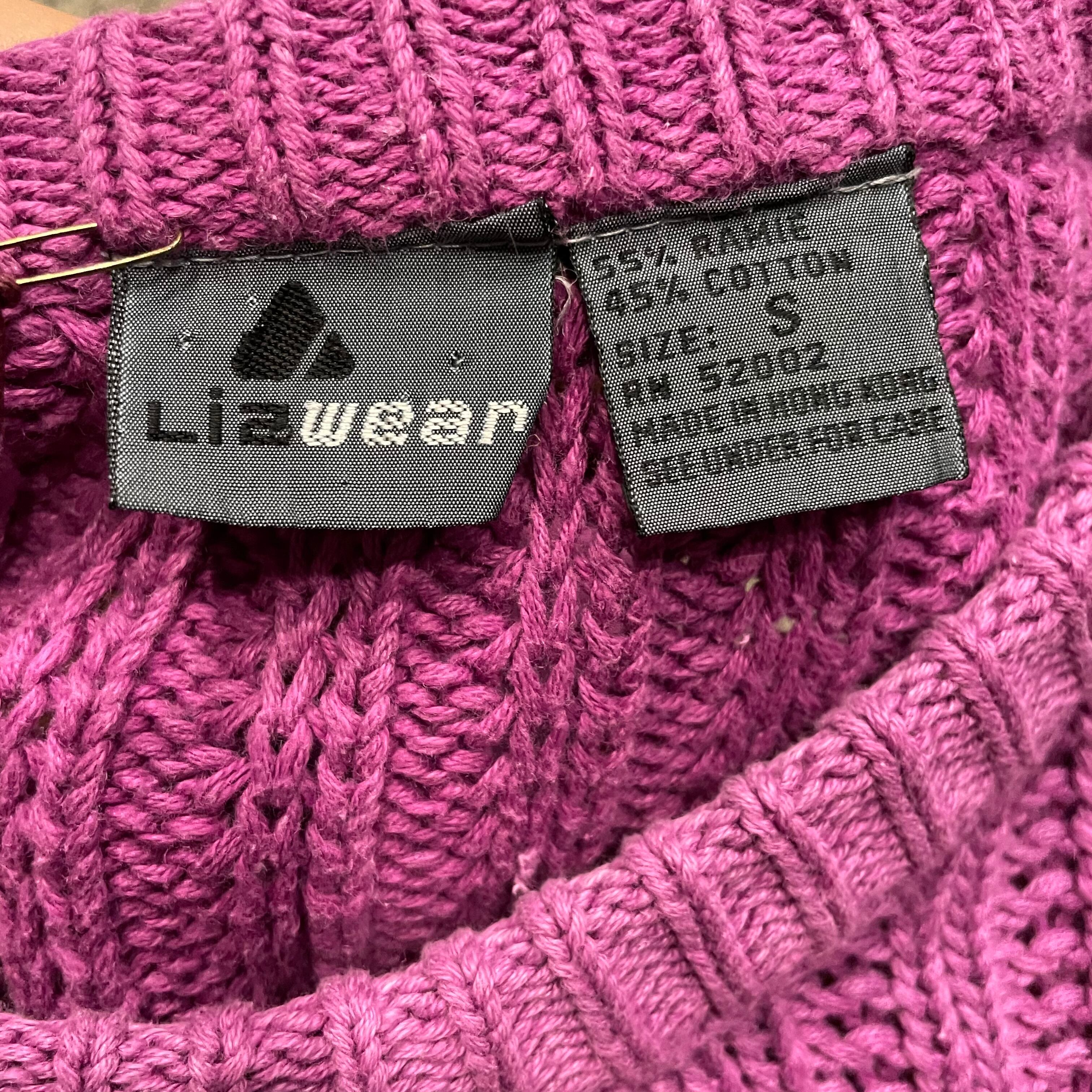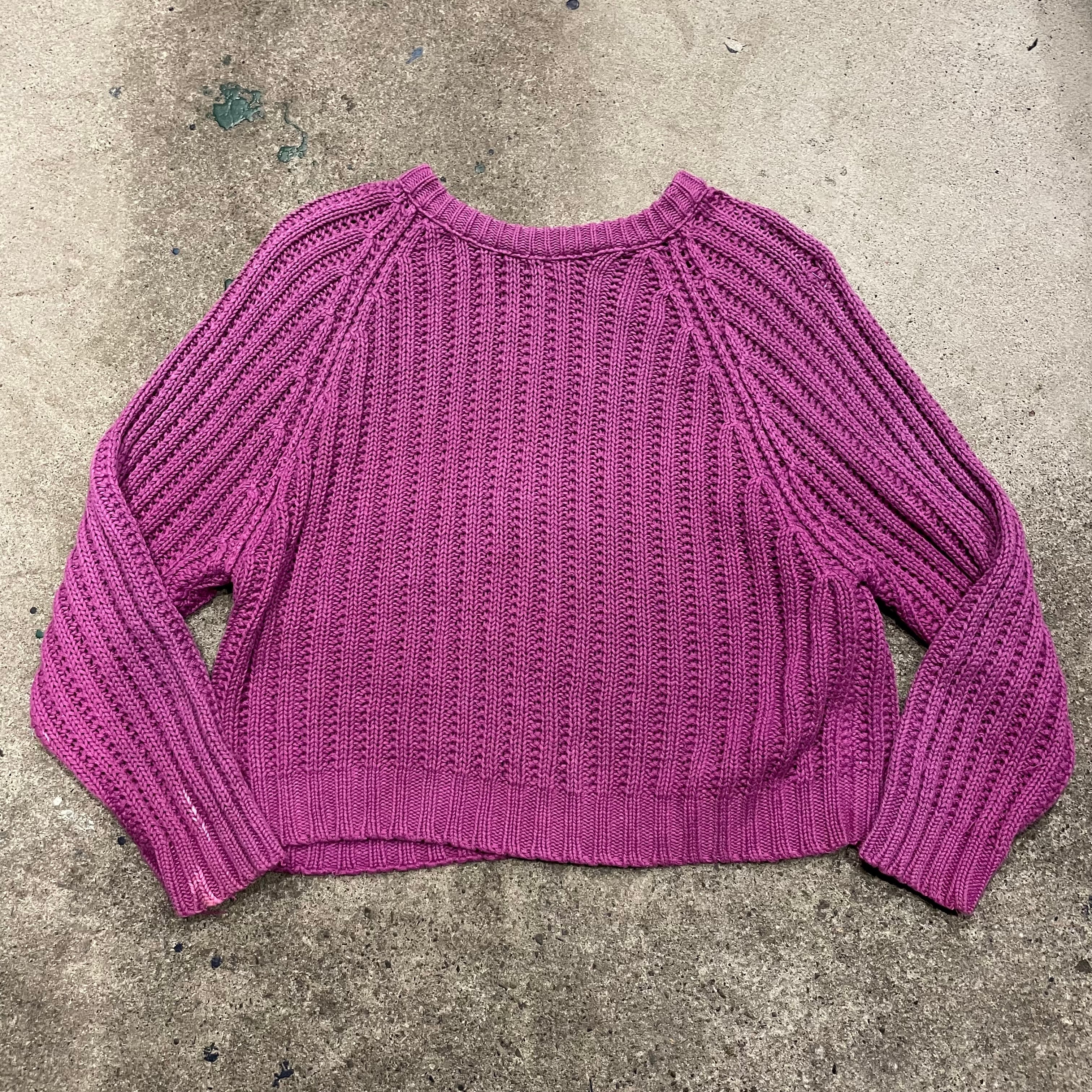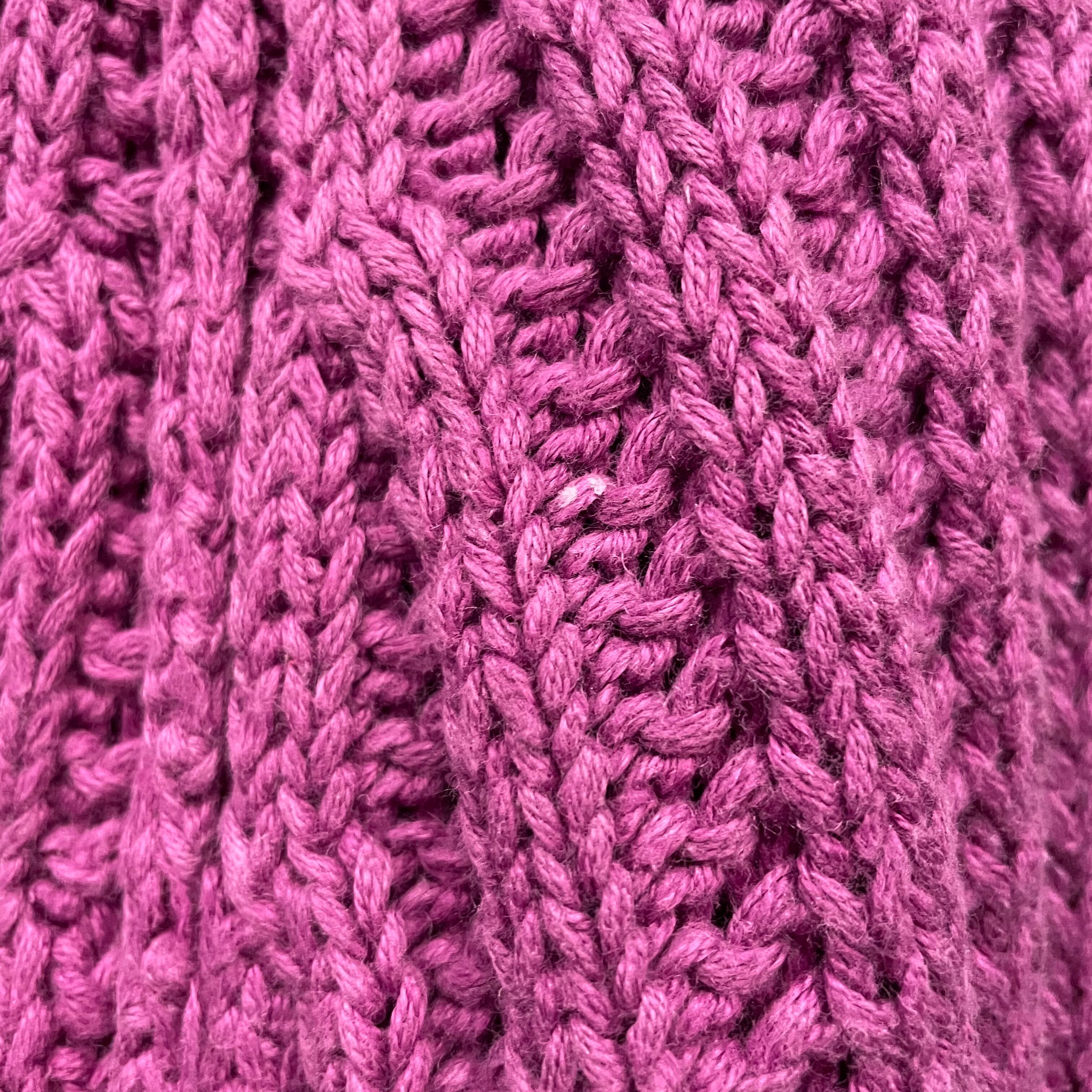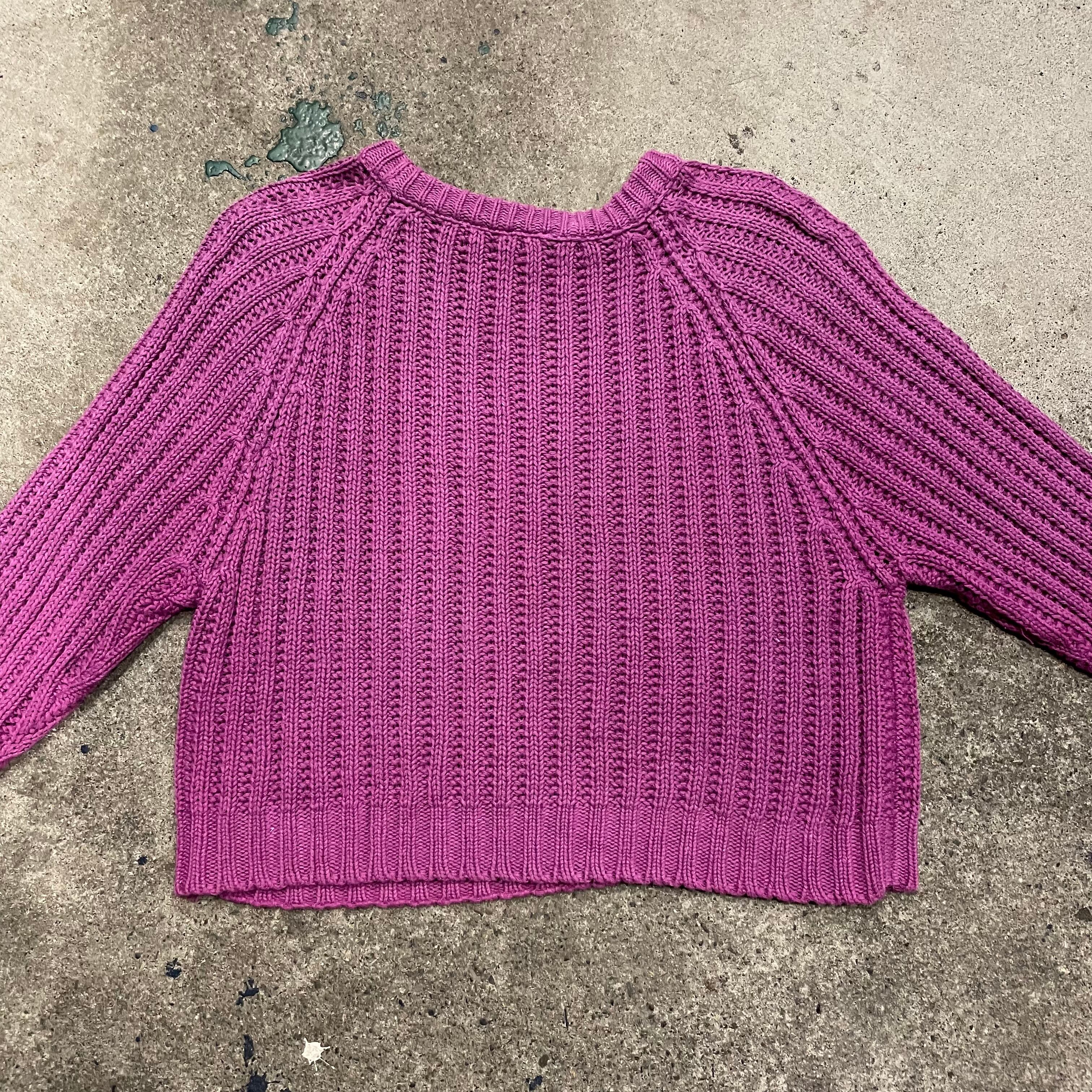 明るい紫がかわいいコットンニットセーターです。太めの糸でざくざく編まれている感じで、短めの丈感も合わせやすくて良いですね。