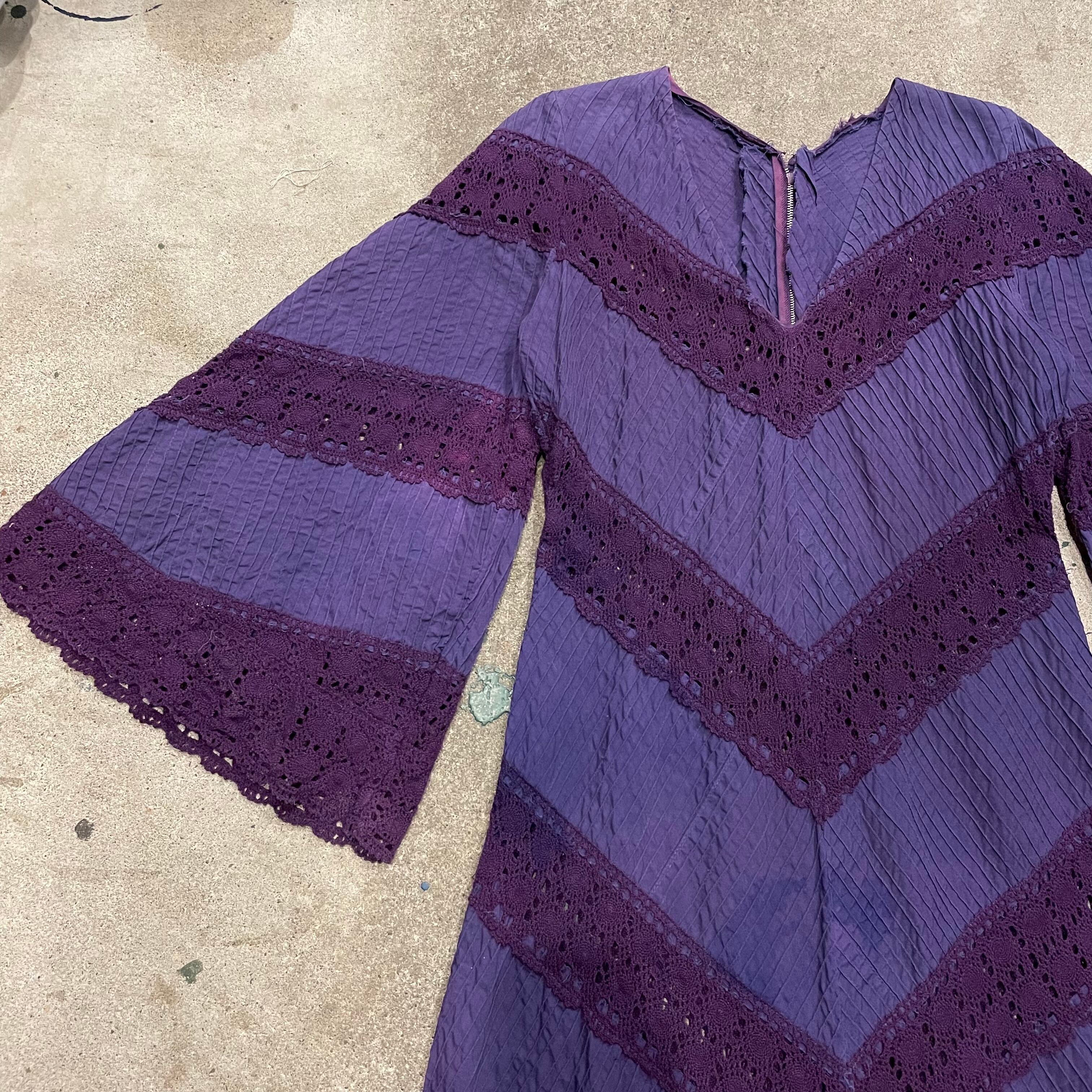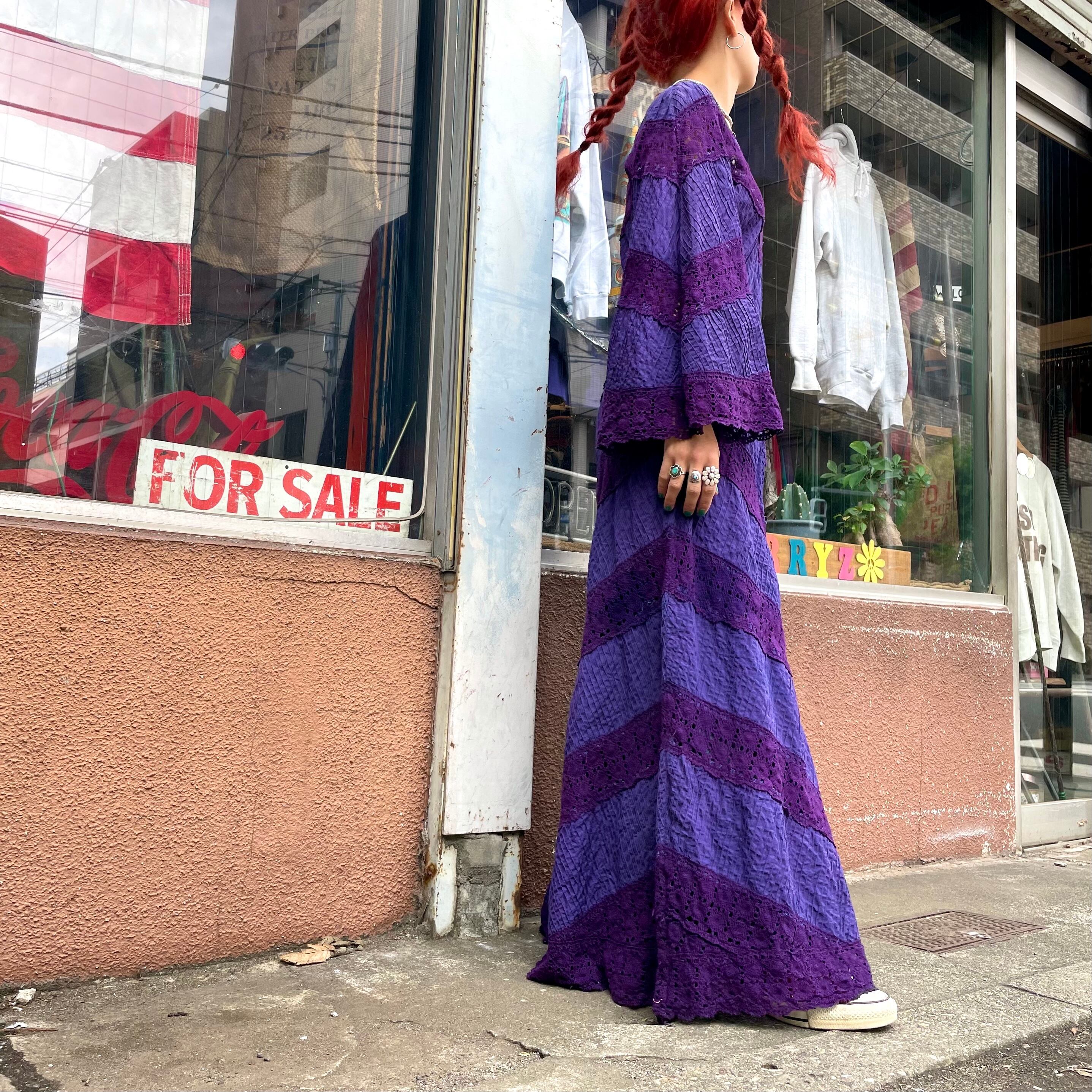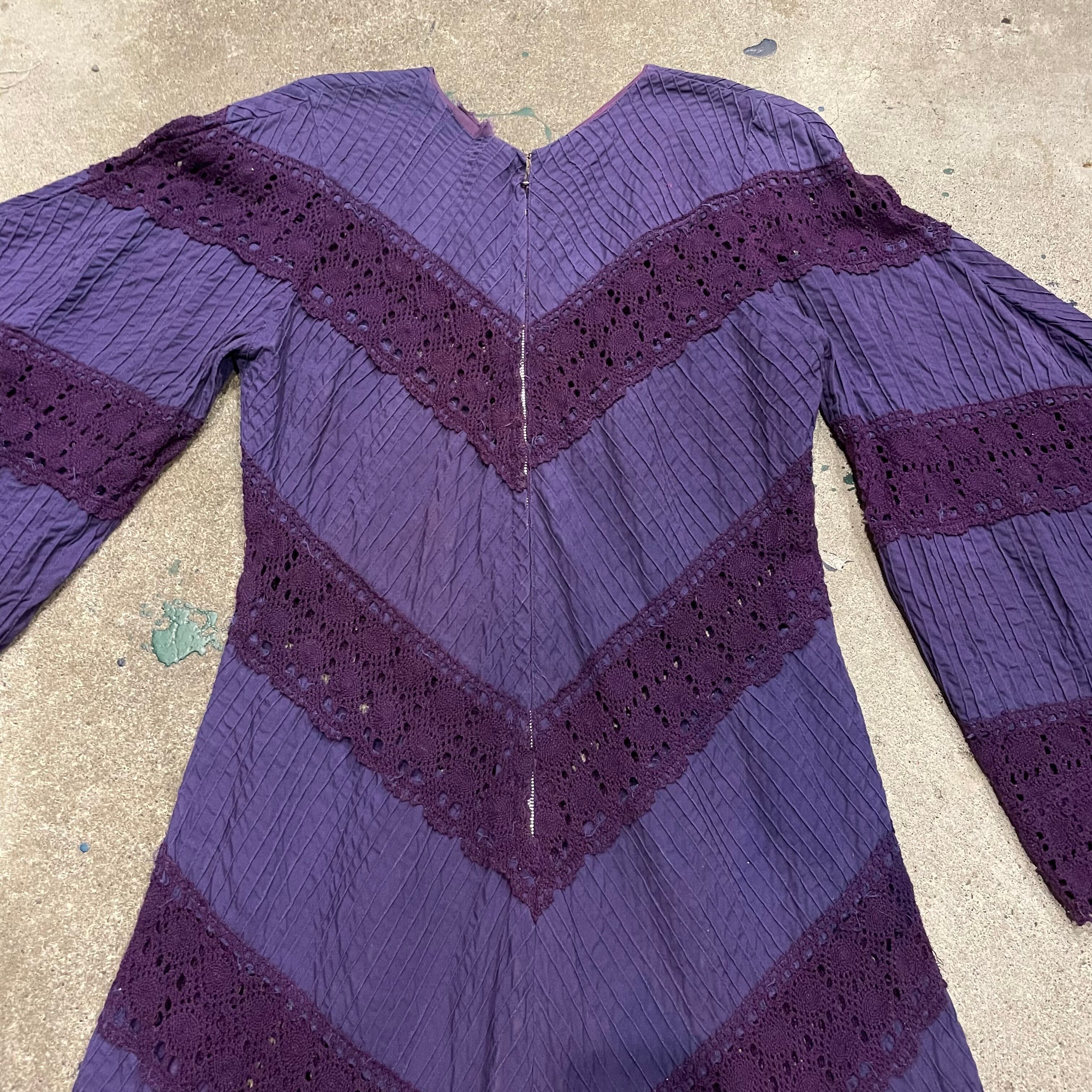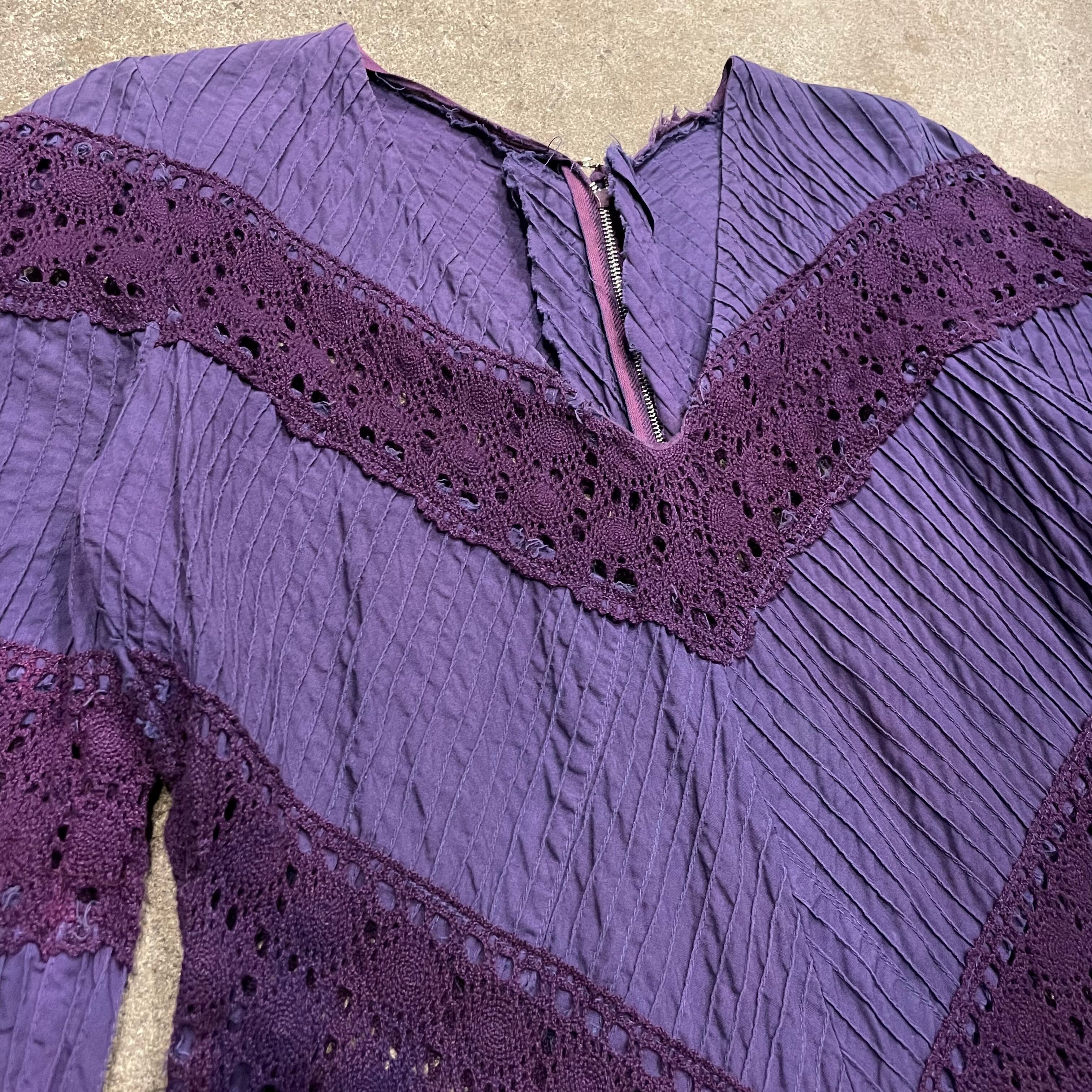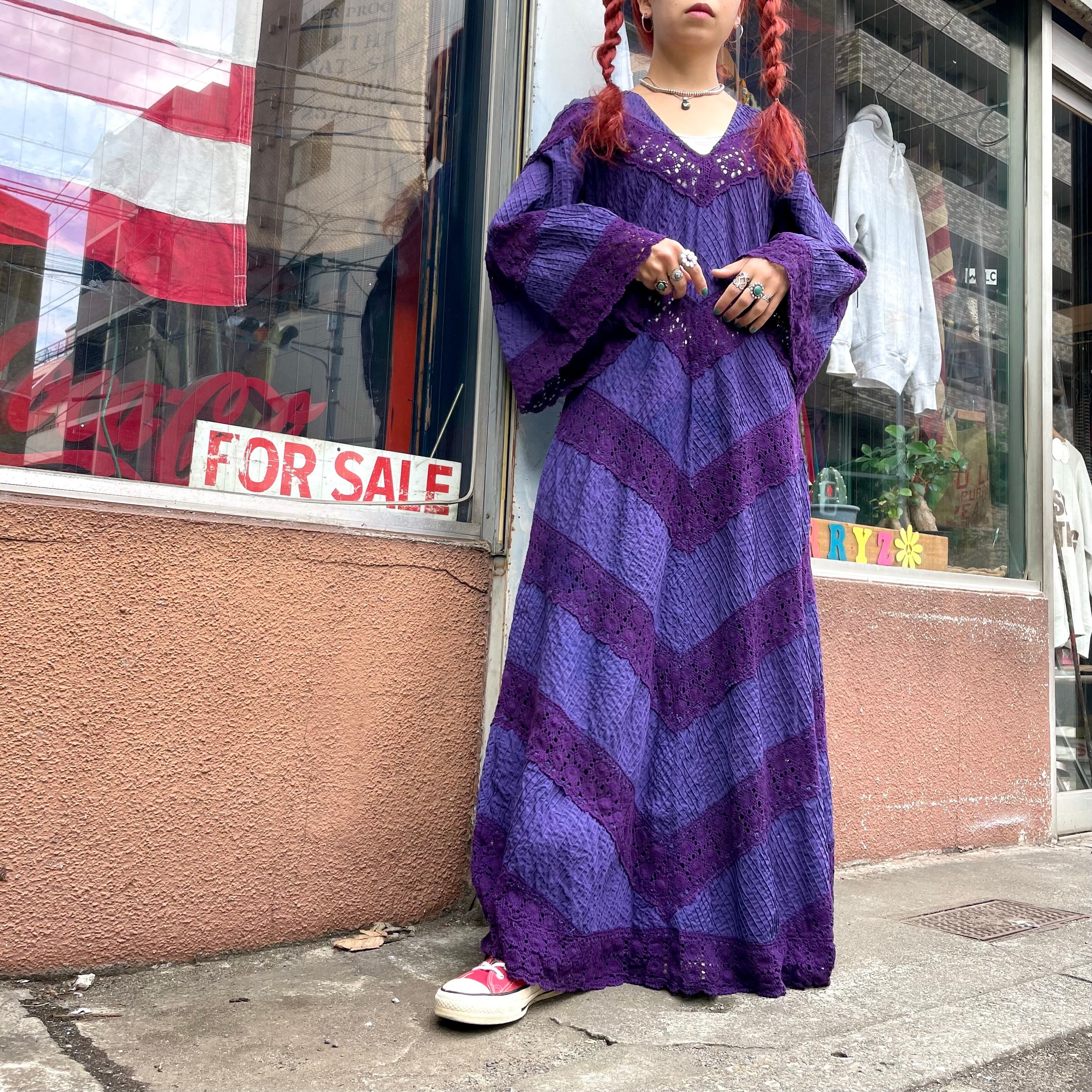 おそらく60〜70年代頃のメキシコのワンピースです。フレアスリーブできれいなAラインのシルエットはとても美しいですし、コットンレースと細かいピンタックの装飾は手が込んでいてとても素敵なデザインです。