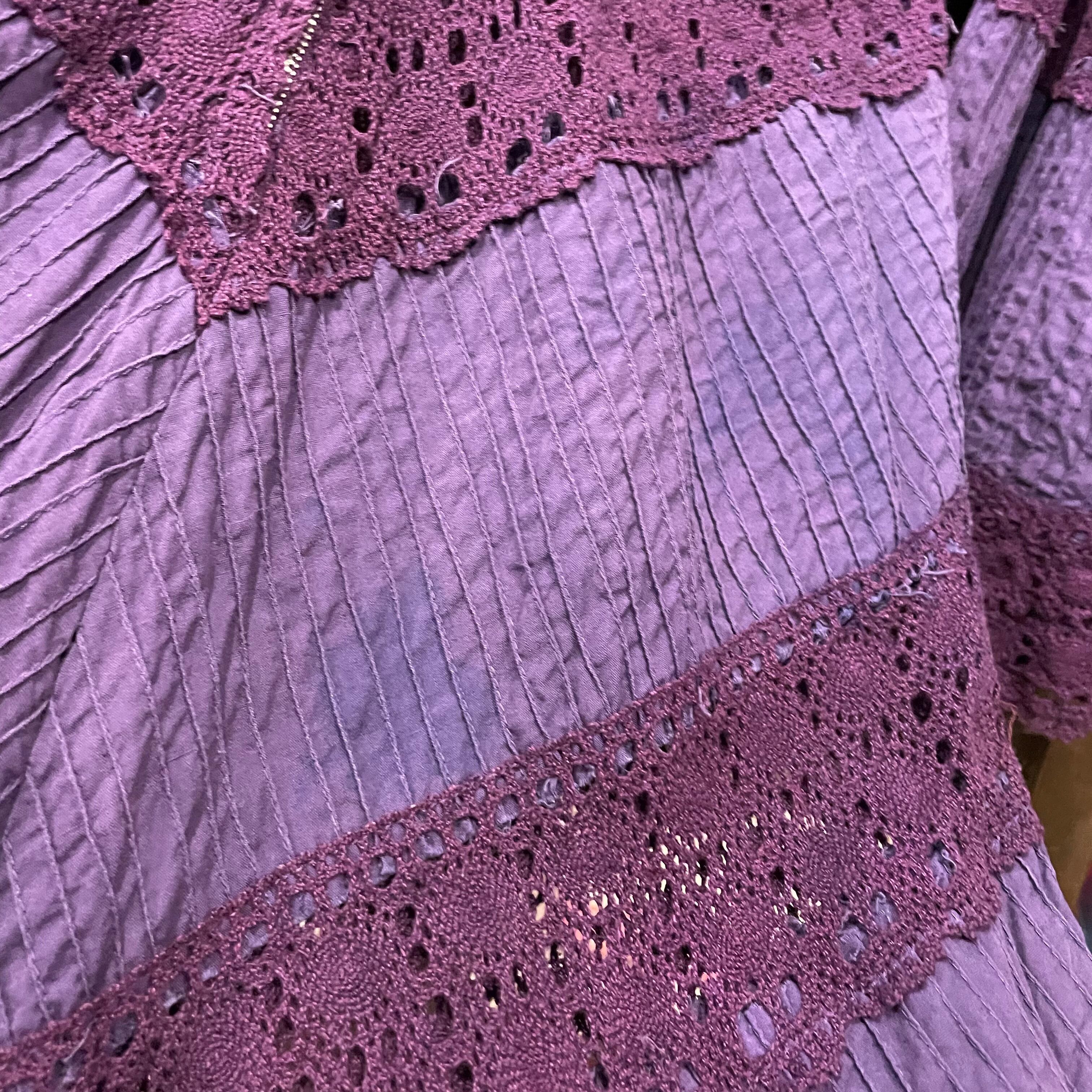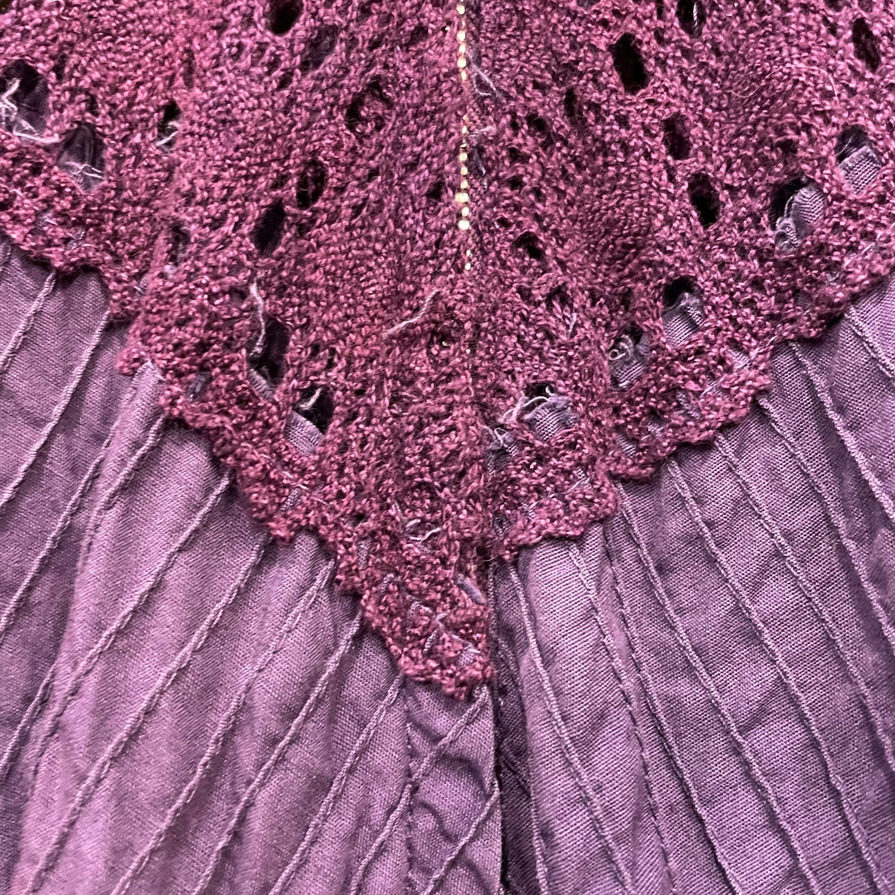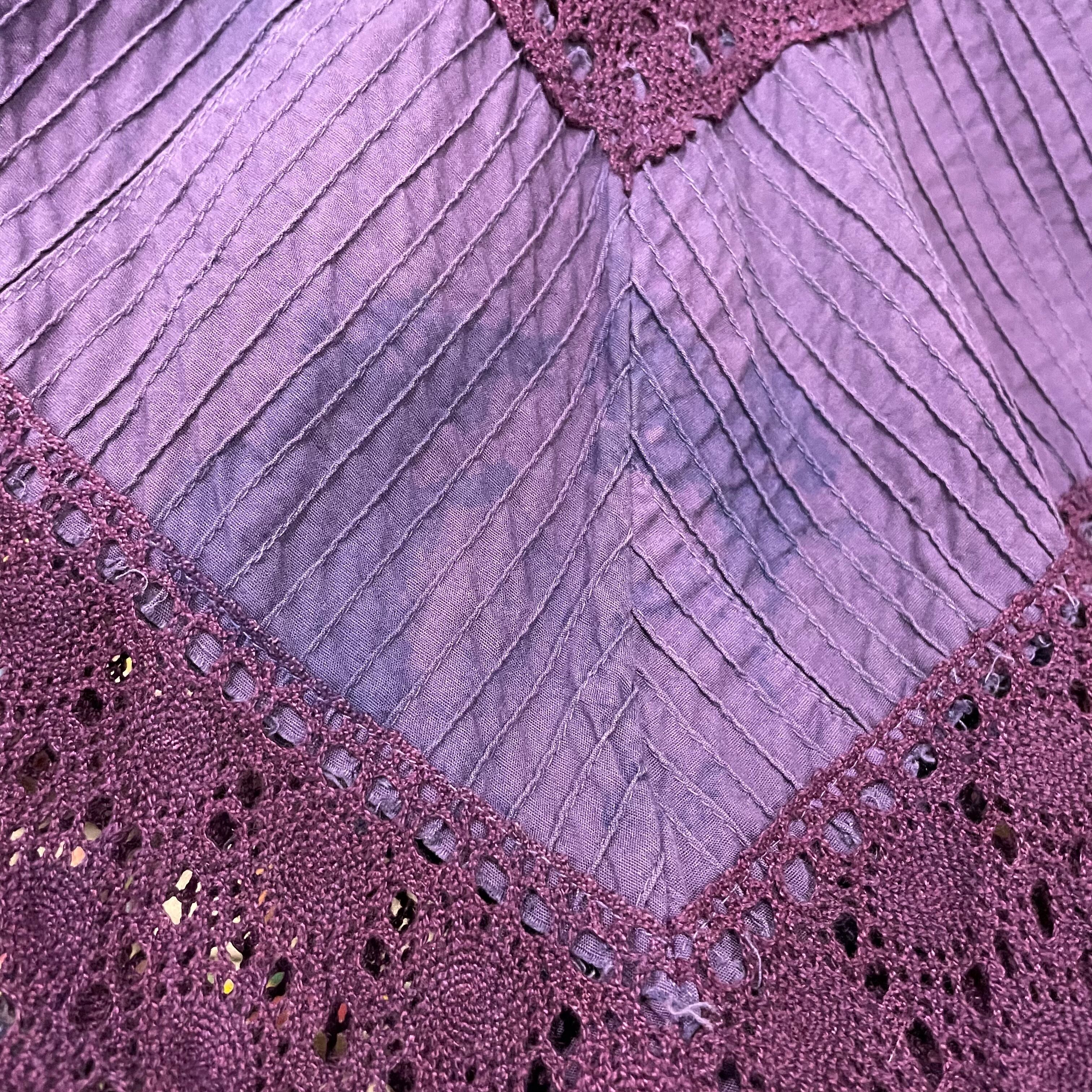 色褪せや、紫の色移りのようなシミ等色のムラがあります。レースと生地の切り替え部分の縫い代が切りっぱなしになっているのでほつれてレースの隙間から出てきてしまいます。