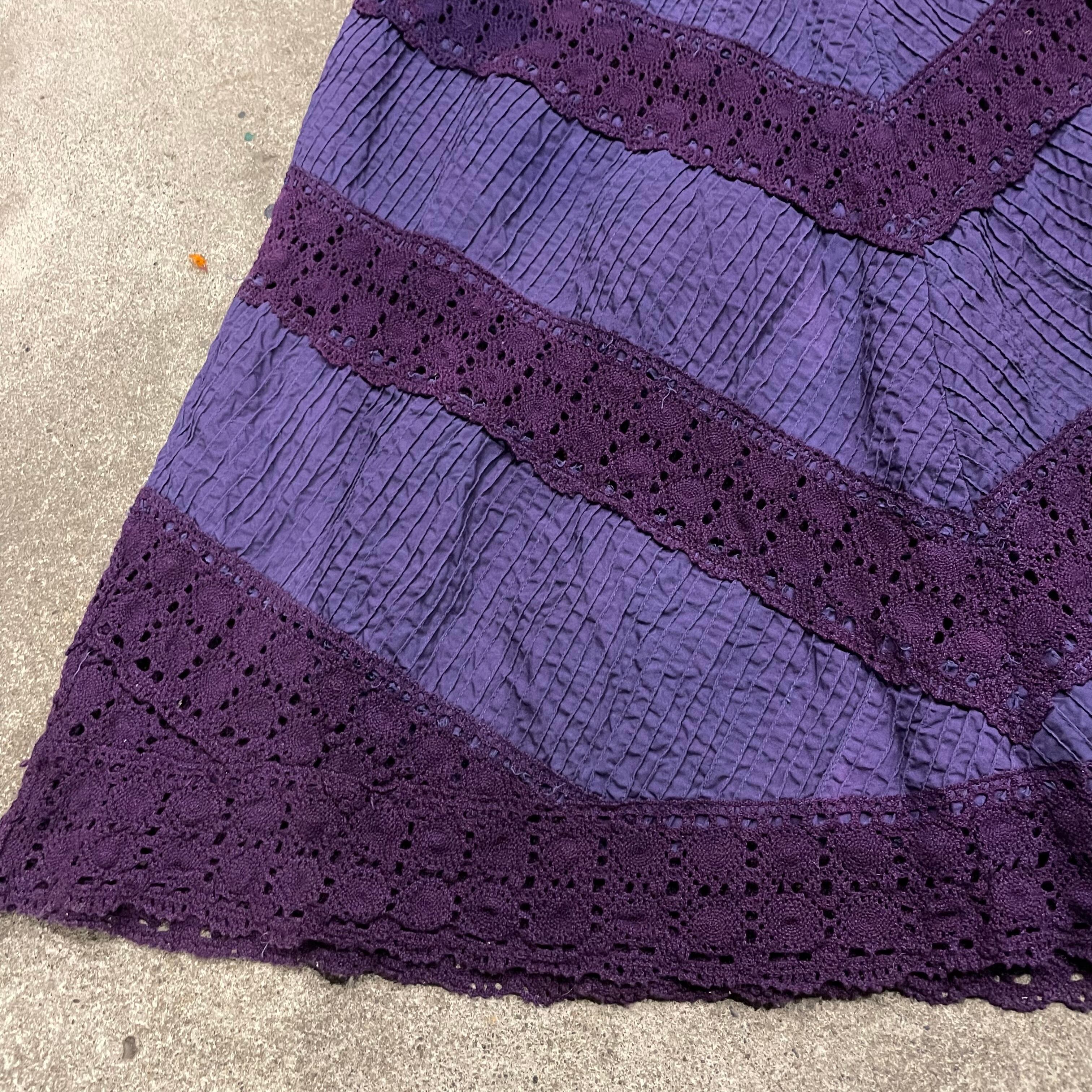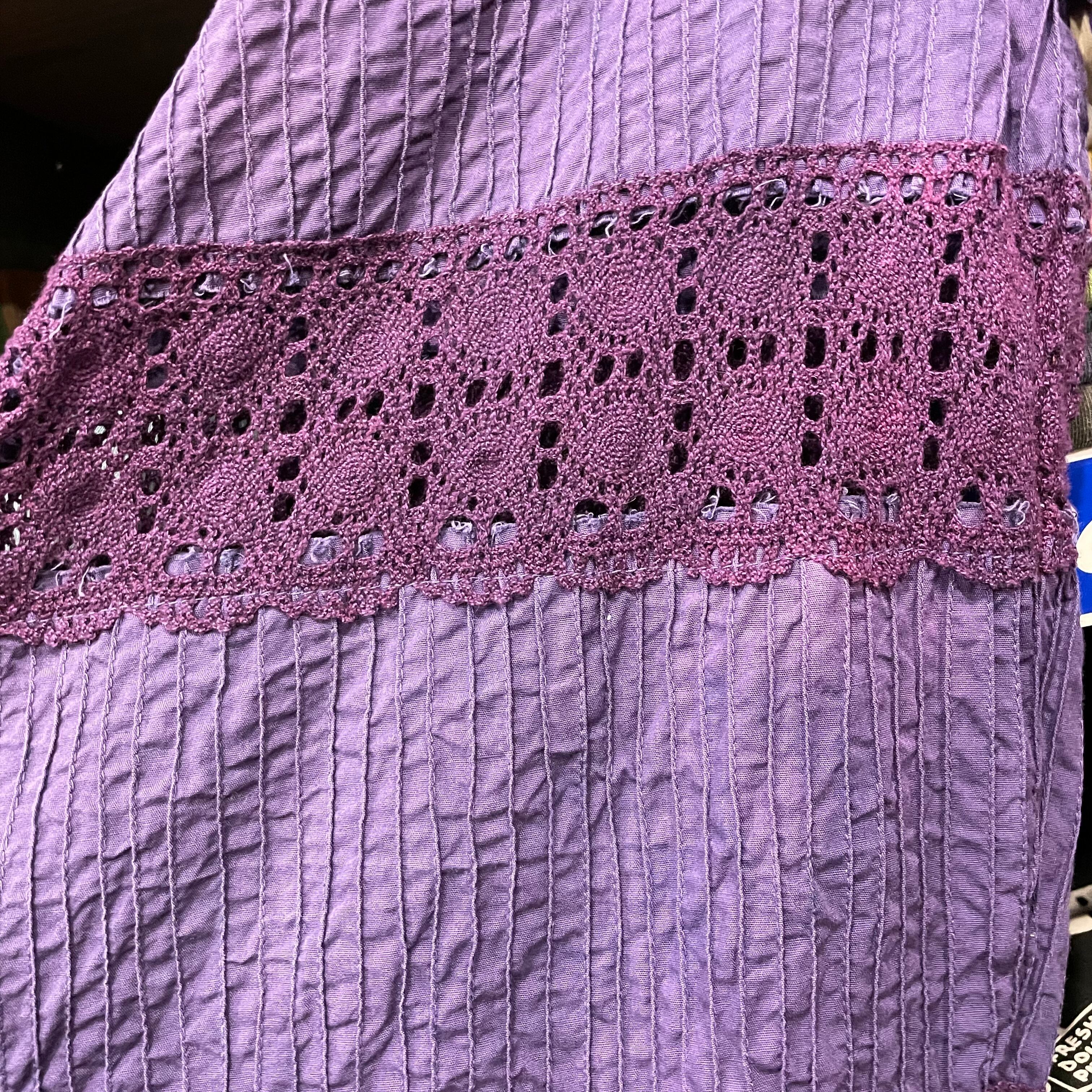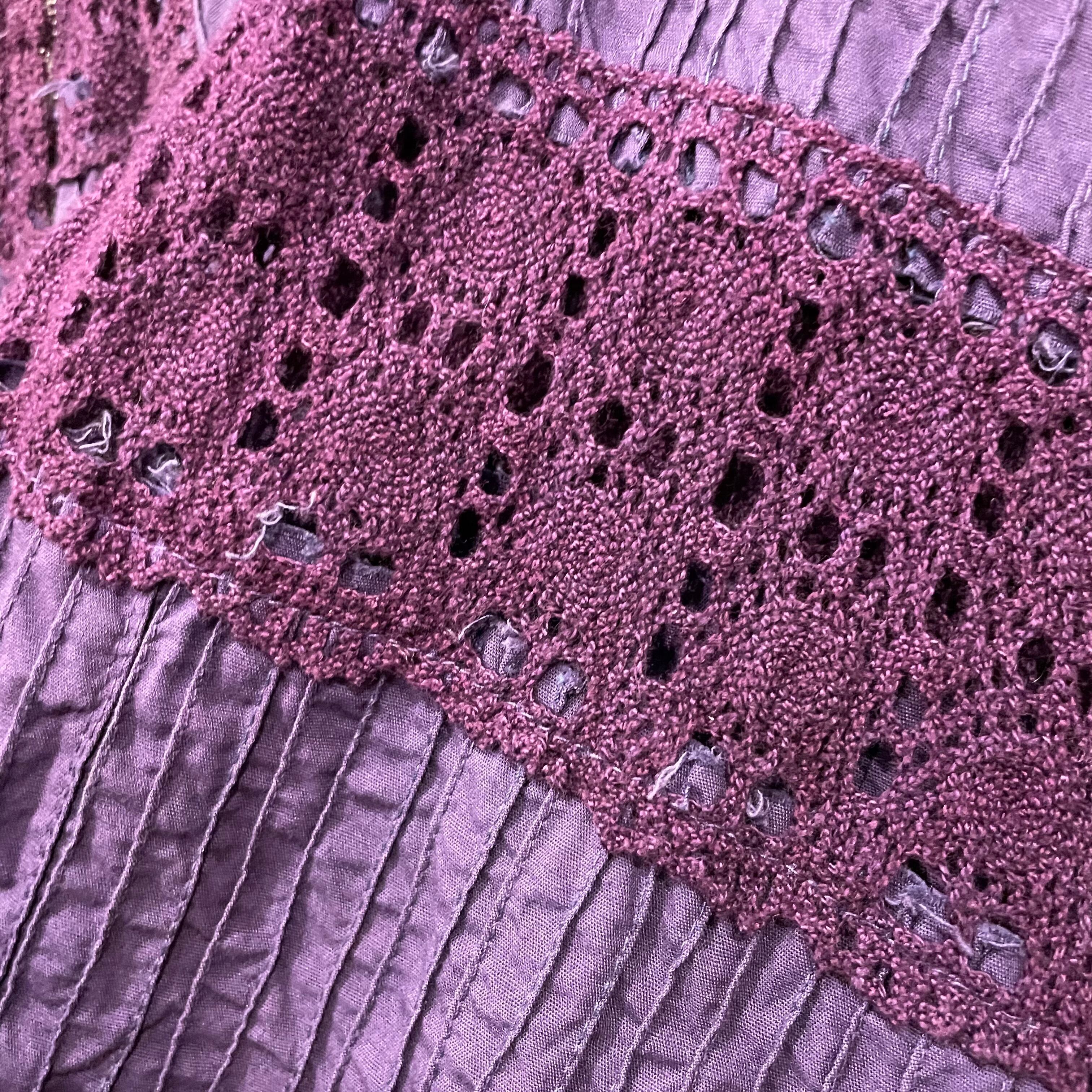 色褪せや、紫の色移りのようなシミ等色のムラがあります。レースと生地の切り替え部分の縫い代が切りっぱなしになっているのでほつれてレースの隙間から出てきてしまいます。