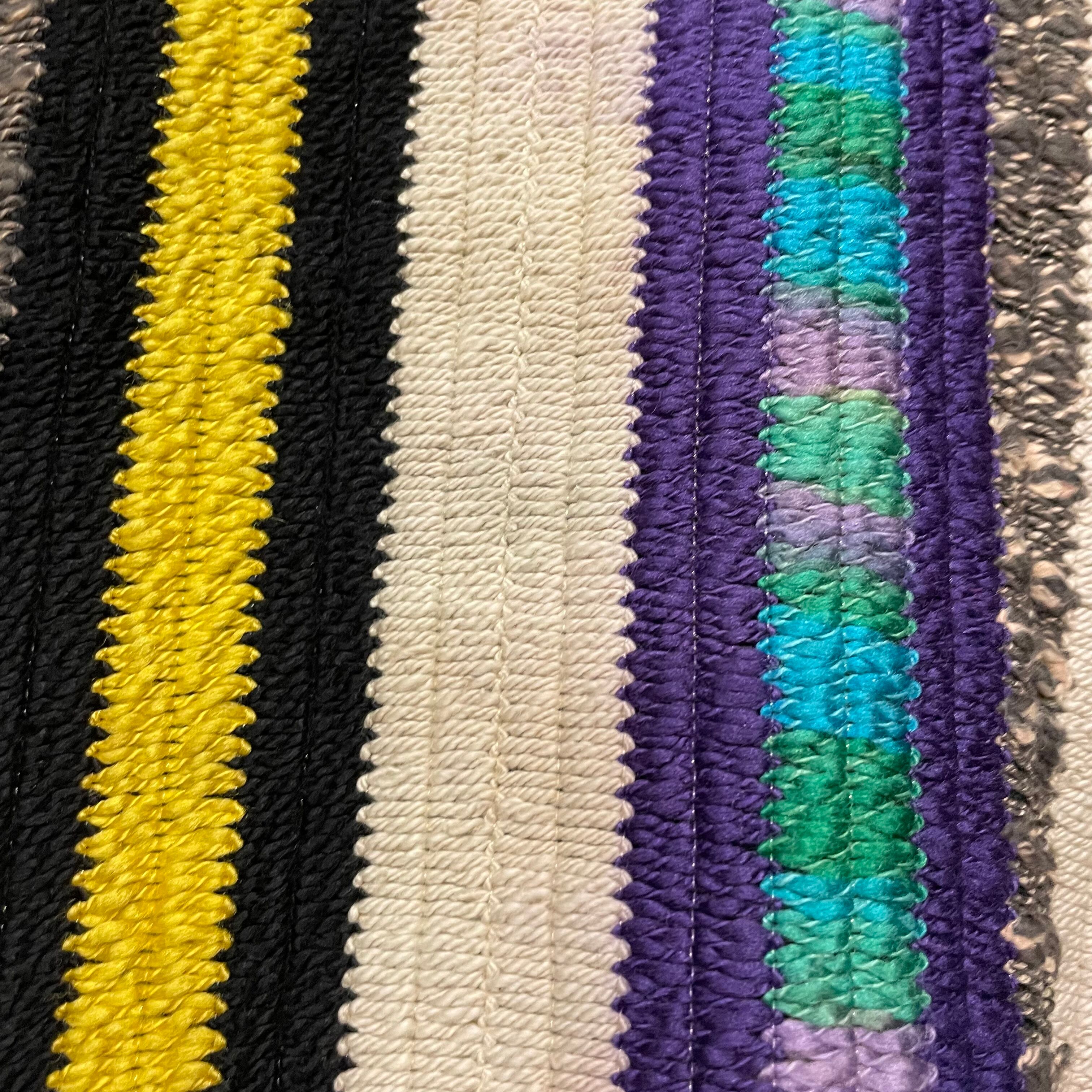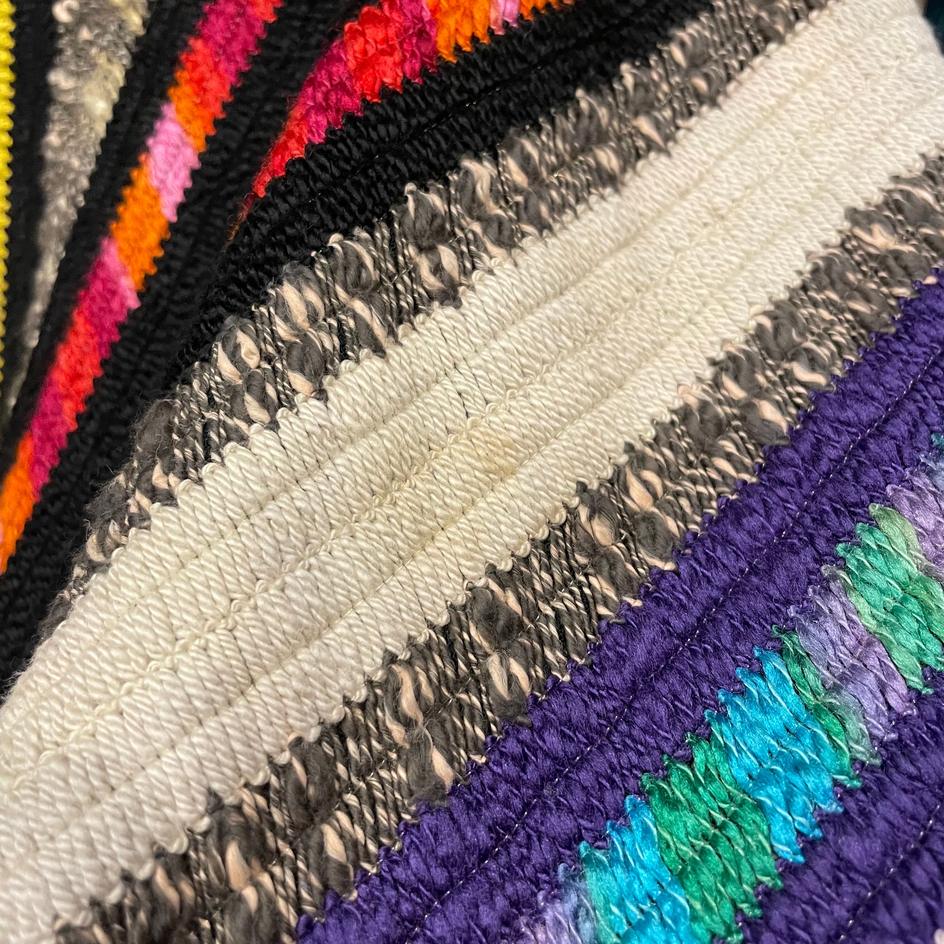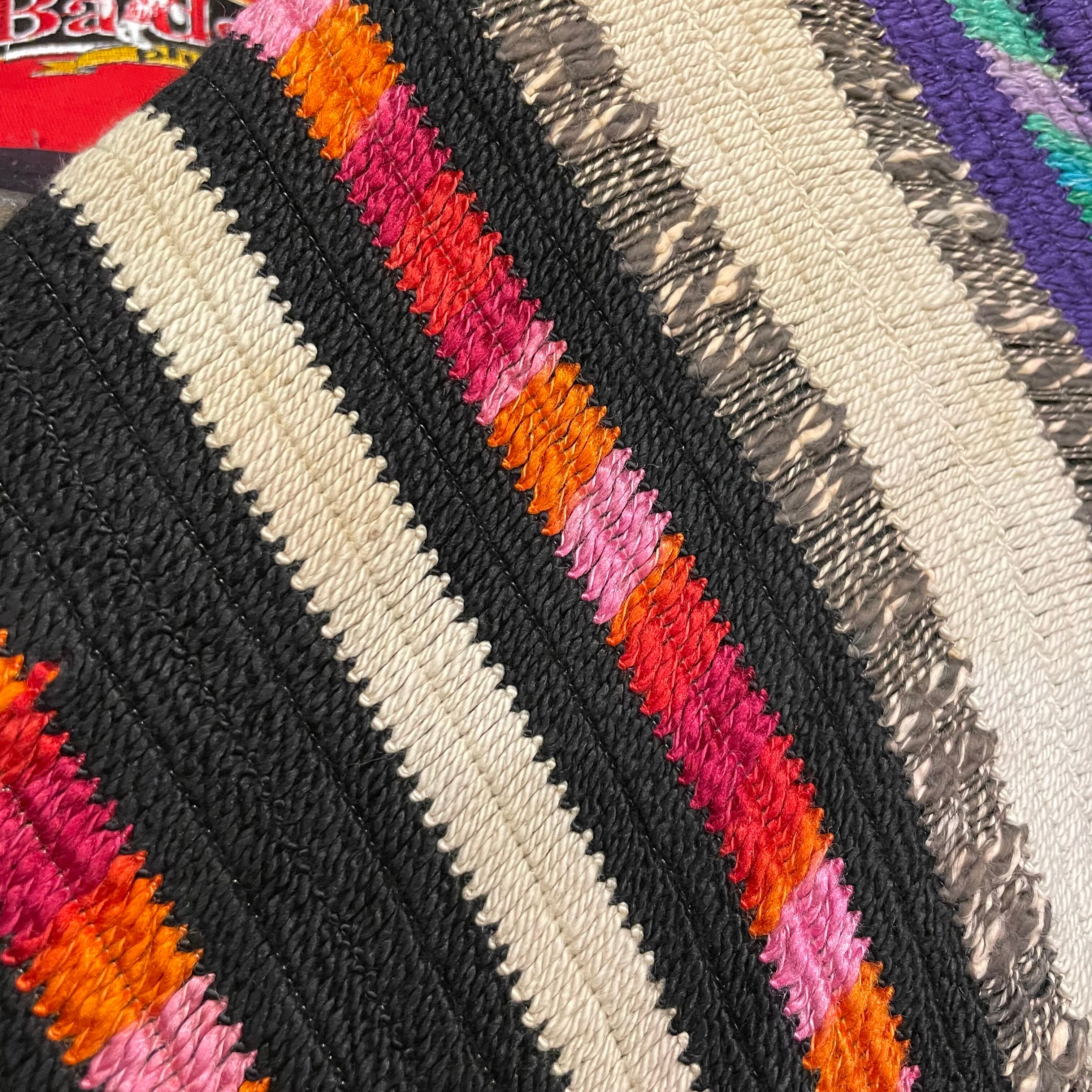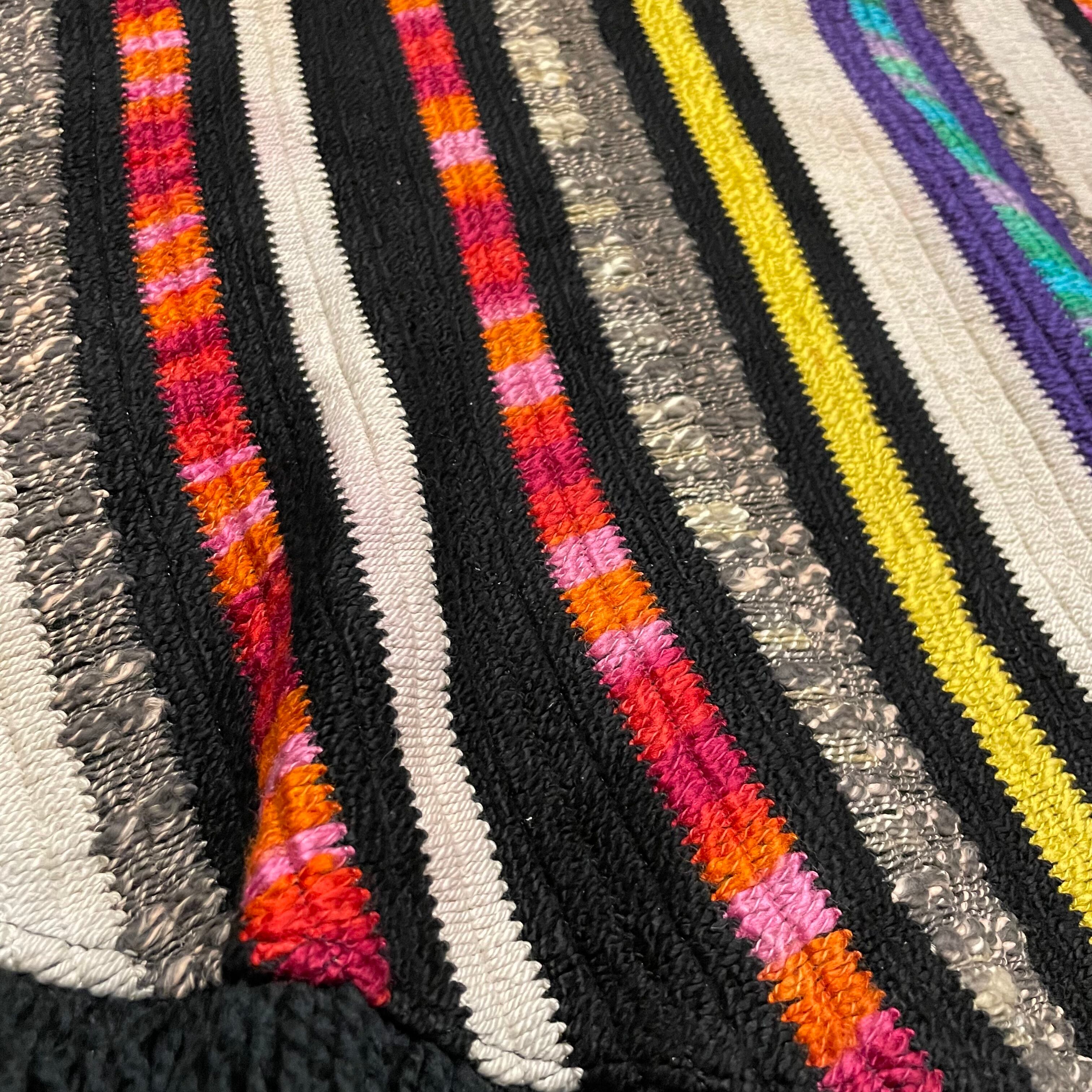 カラフルなストライプのようになっていて、アーティスティックなオーラが出ていてとてもかわいいです。無地のワンピースに合わせたり、パーカーとデニムに一癖アイテムをプラスして楽しむのも良いですね!柄物にも意外と合わせやすいと思います。触り心地もつるっとしていて重くなく気軽に着られておすすめです。