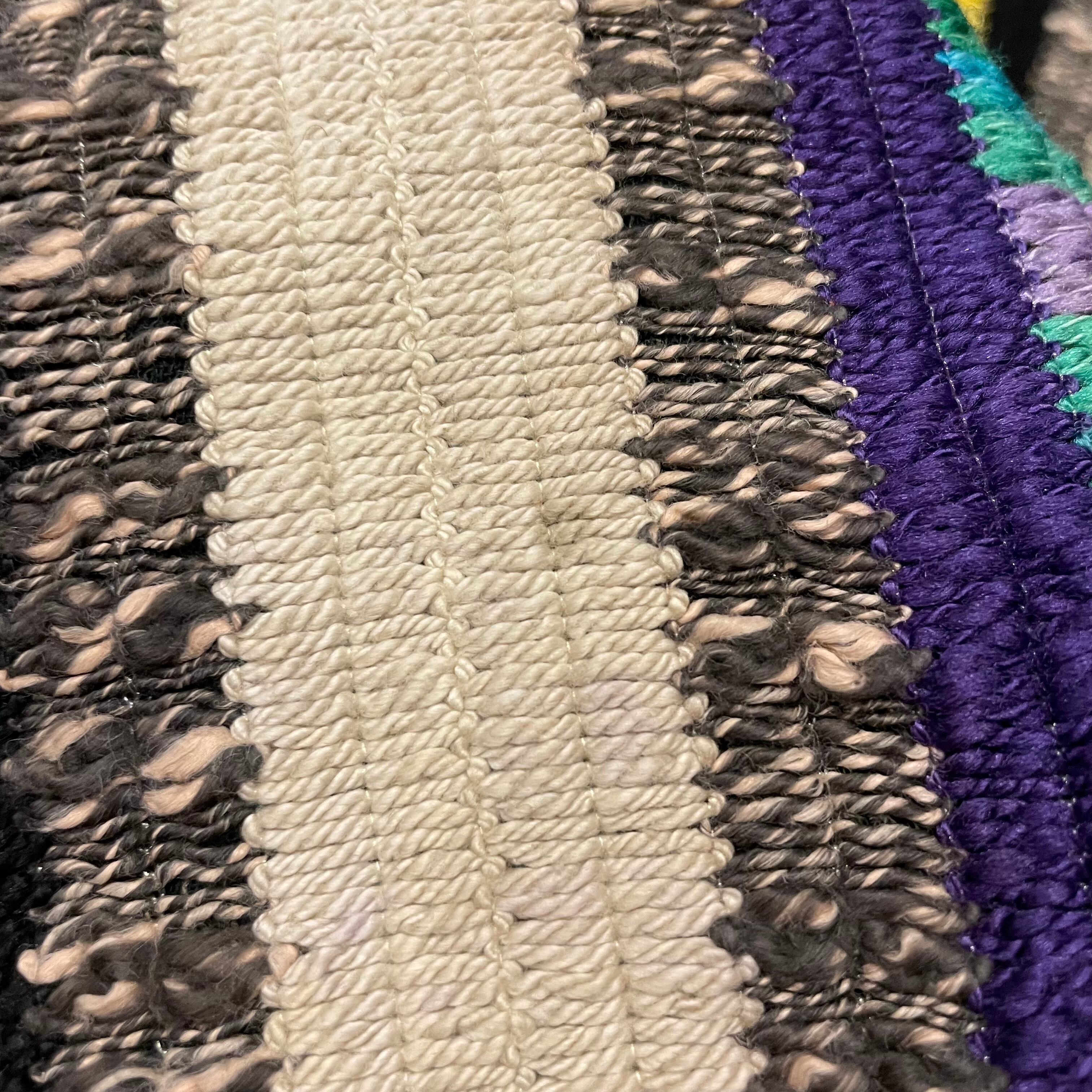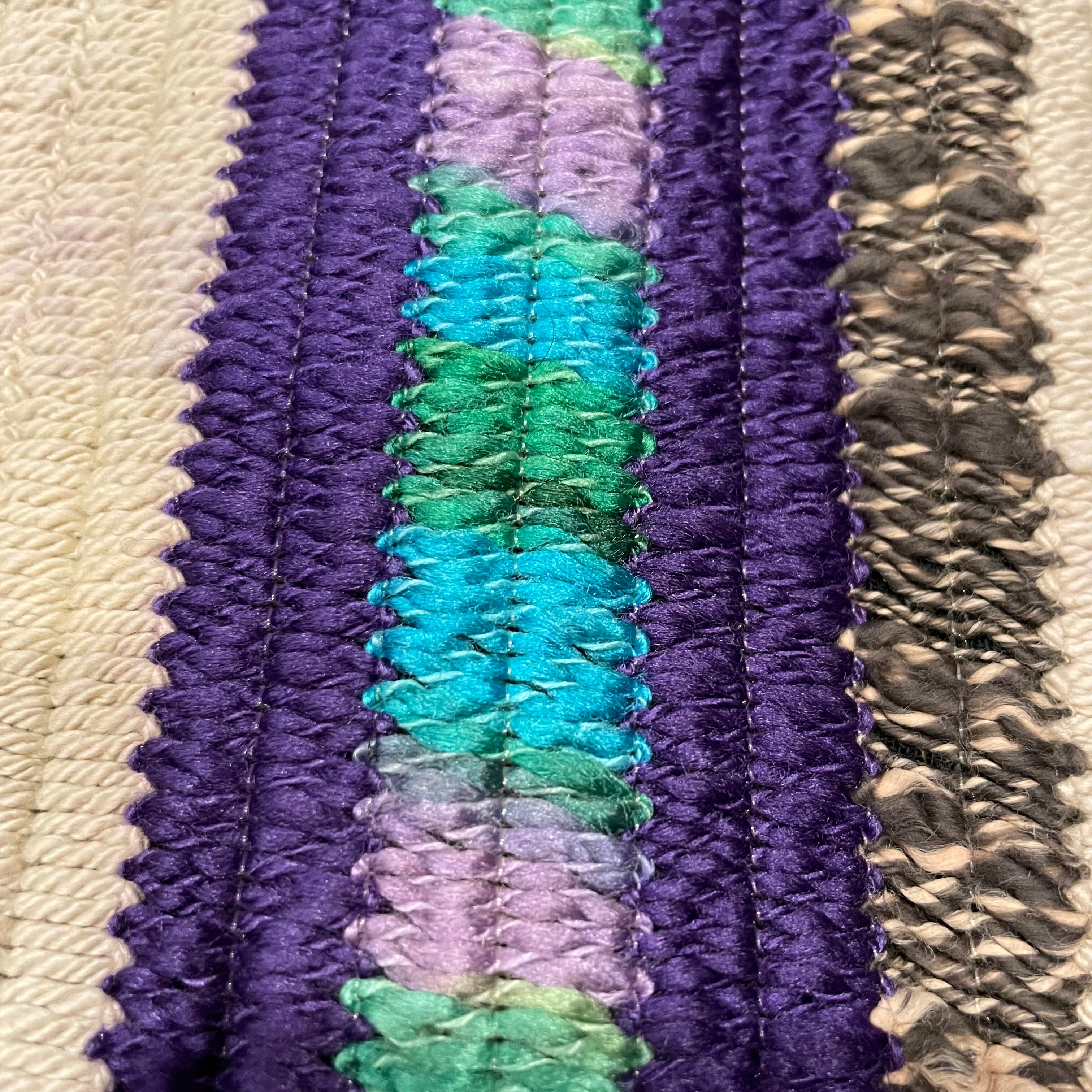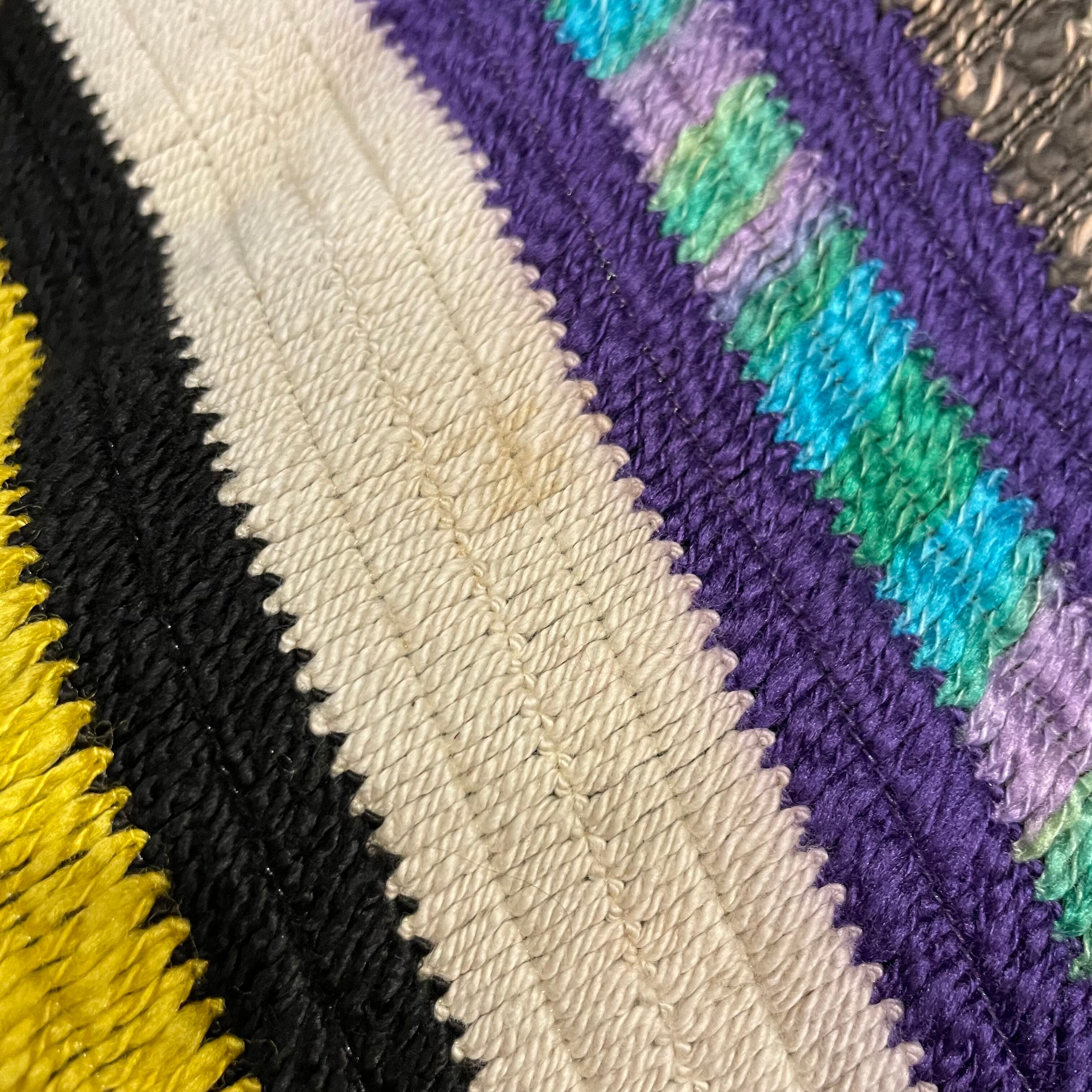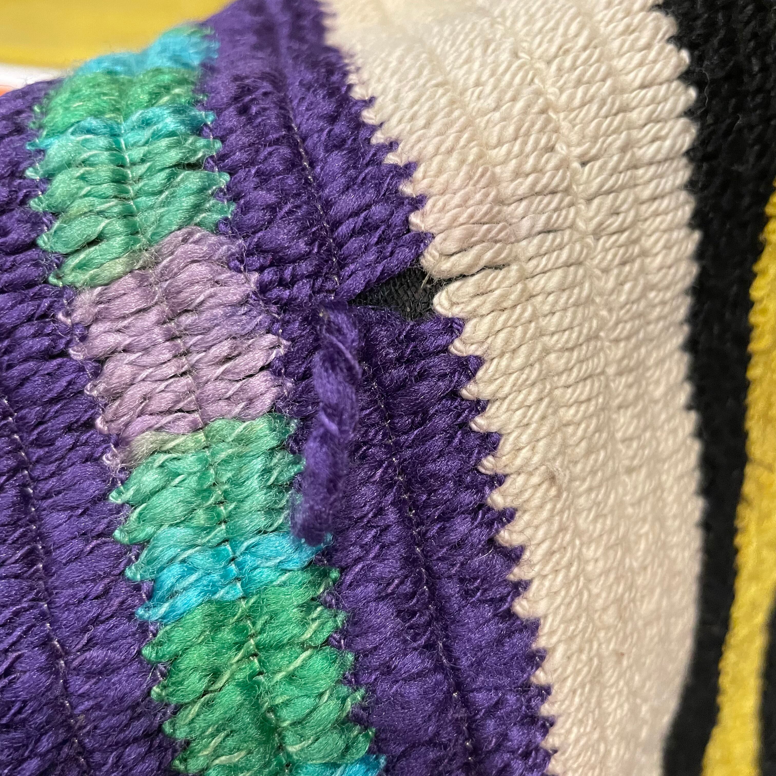 カラフルなストライプのようになっていて、アーティスティックなオーラが出ていてとてもかわいいです。無地のワンピースに合わせたり、パーカーとデニムに一癖アイテムをプラスして楽しむのも良いですね!柄物にも意外と合わせやすいと思います。触り心地もつるっとしていて重くなく気軽に着られておすすめです。
