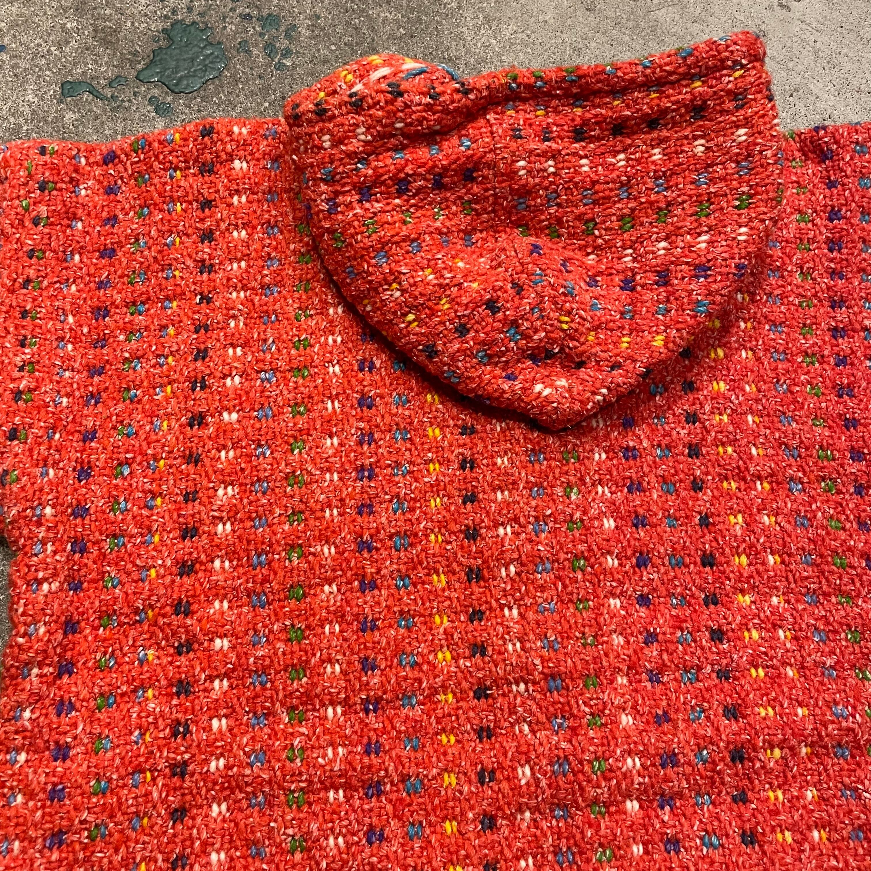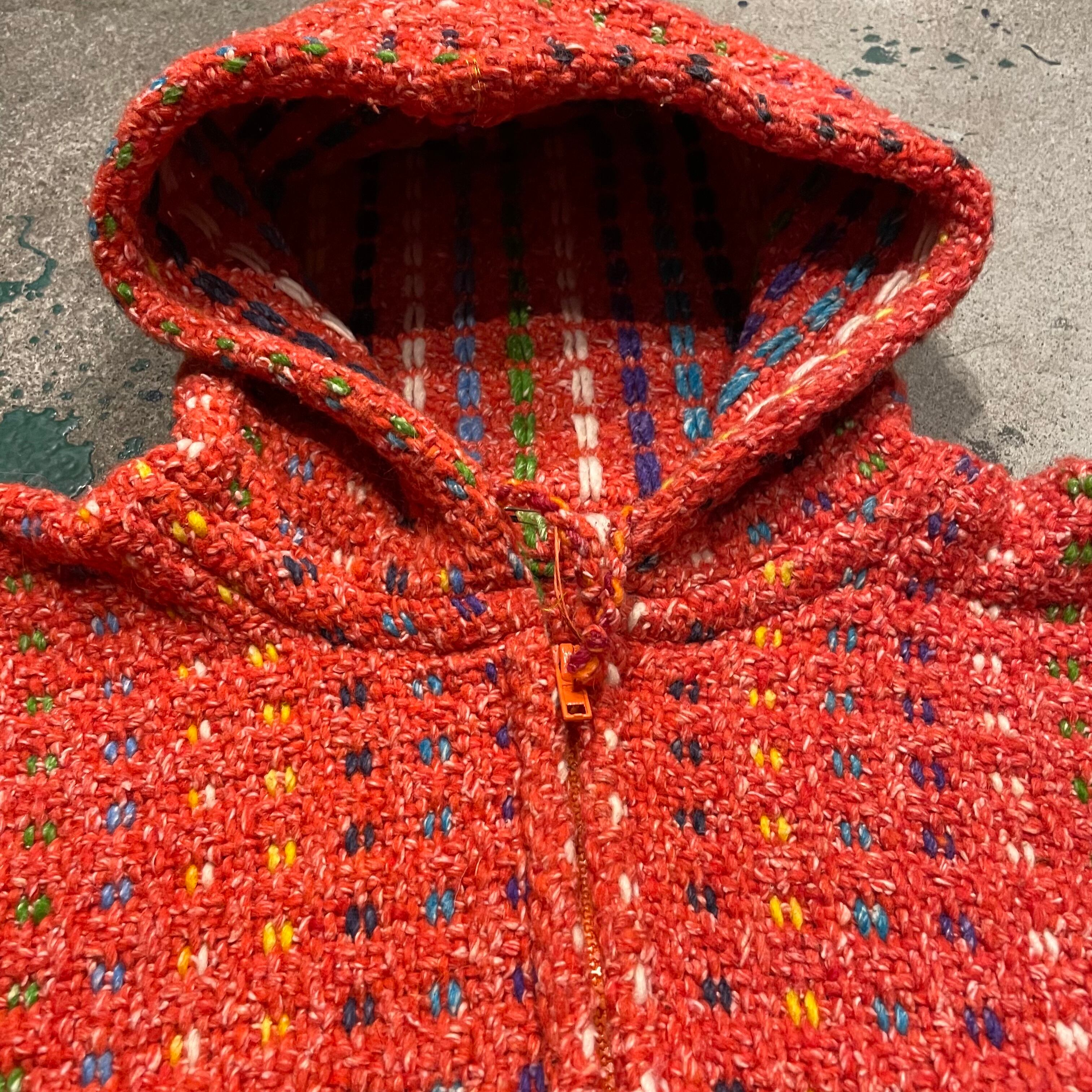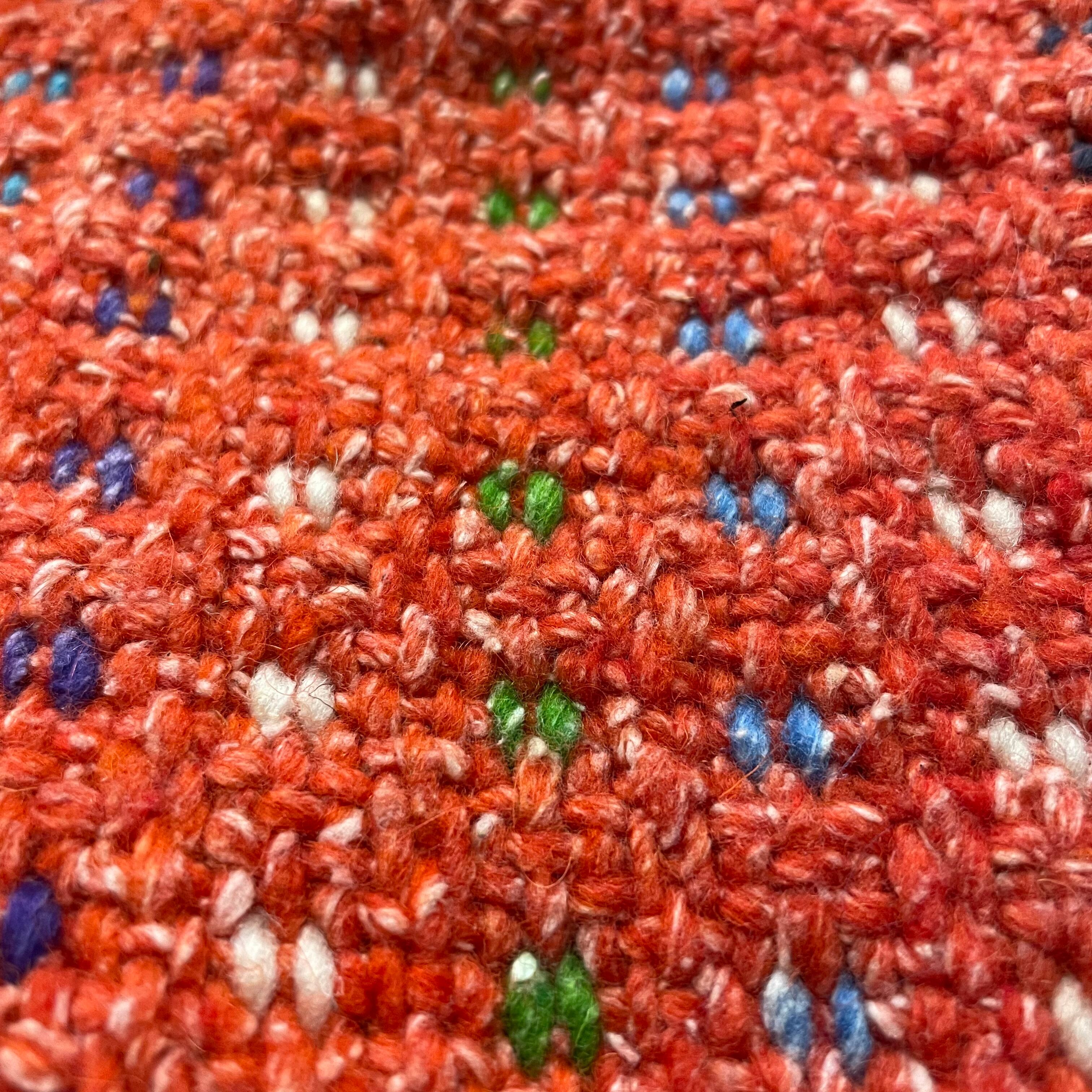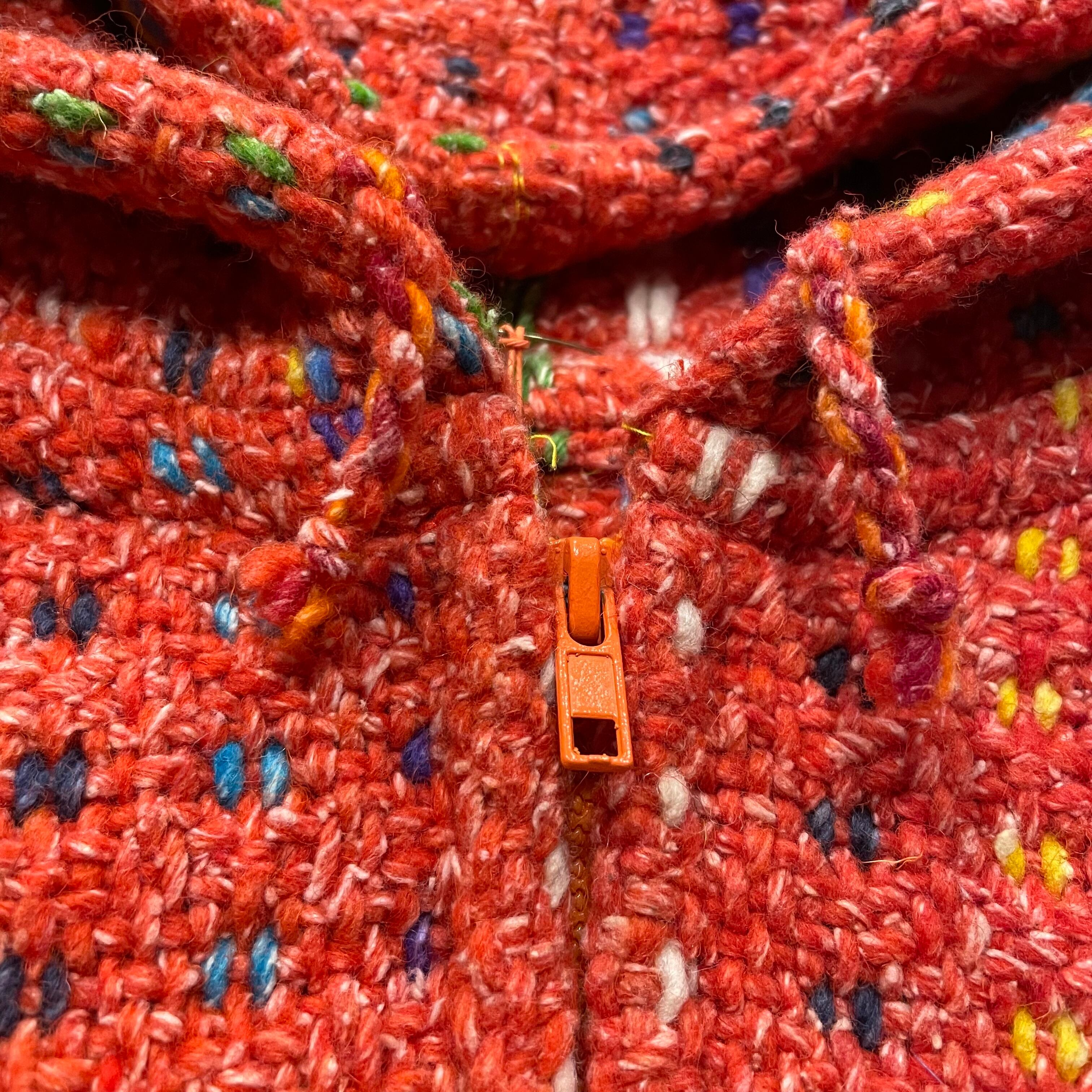 真っ赤でもオレンジでもなく絶妙な色味もかわいいですし、もこもこで暖かいです。いろんな色の毛糸で模様が付けてあるところもポップで良いですね!