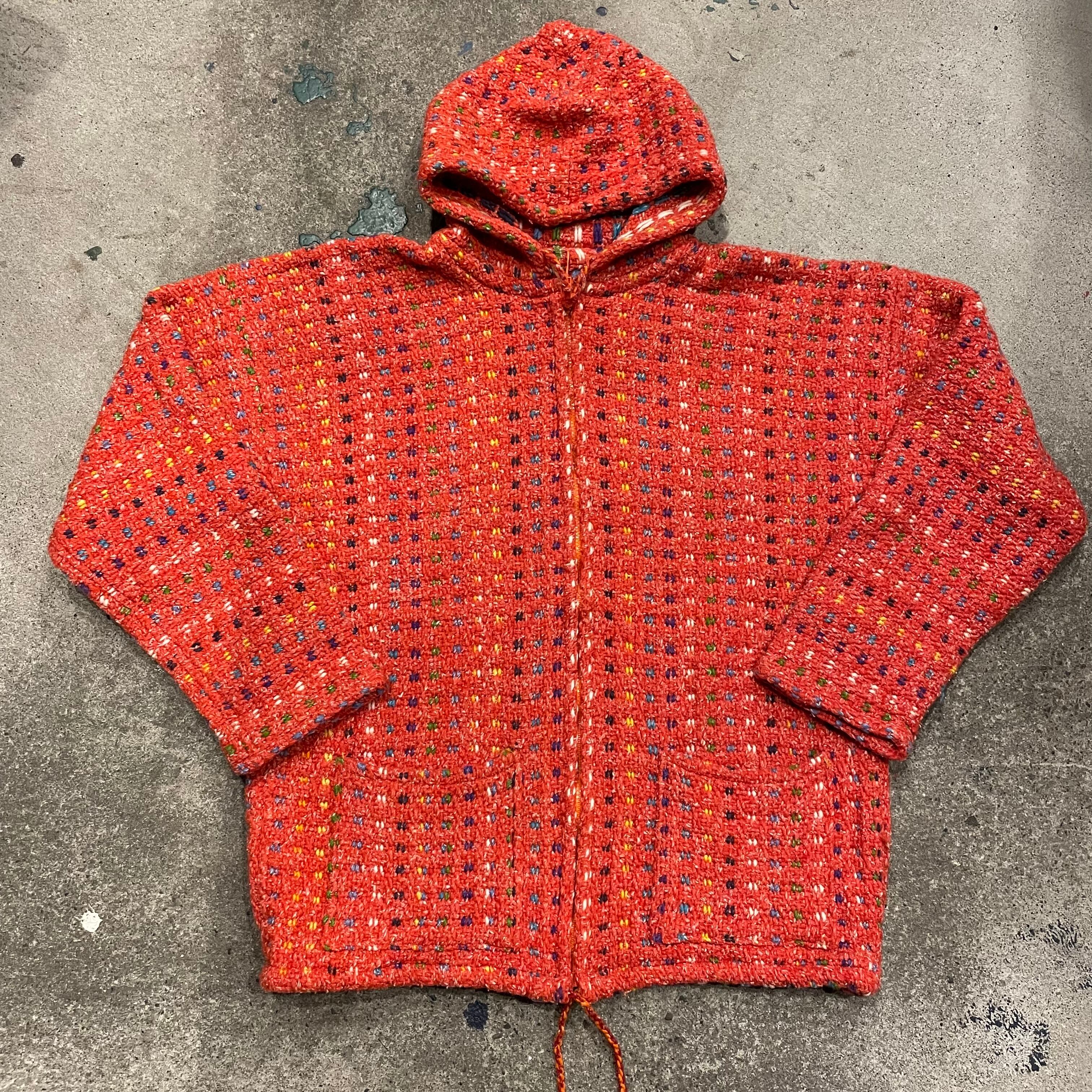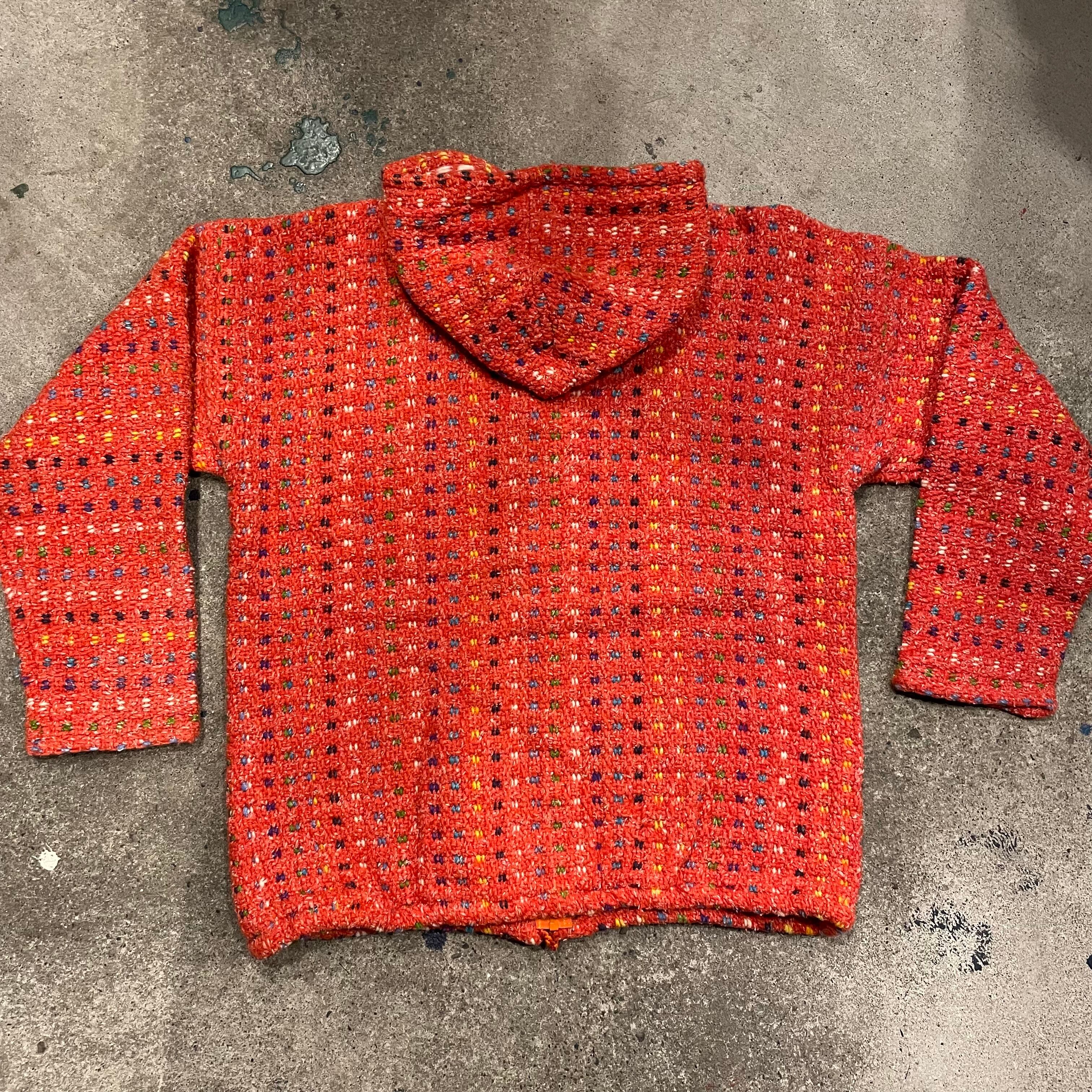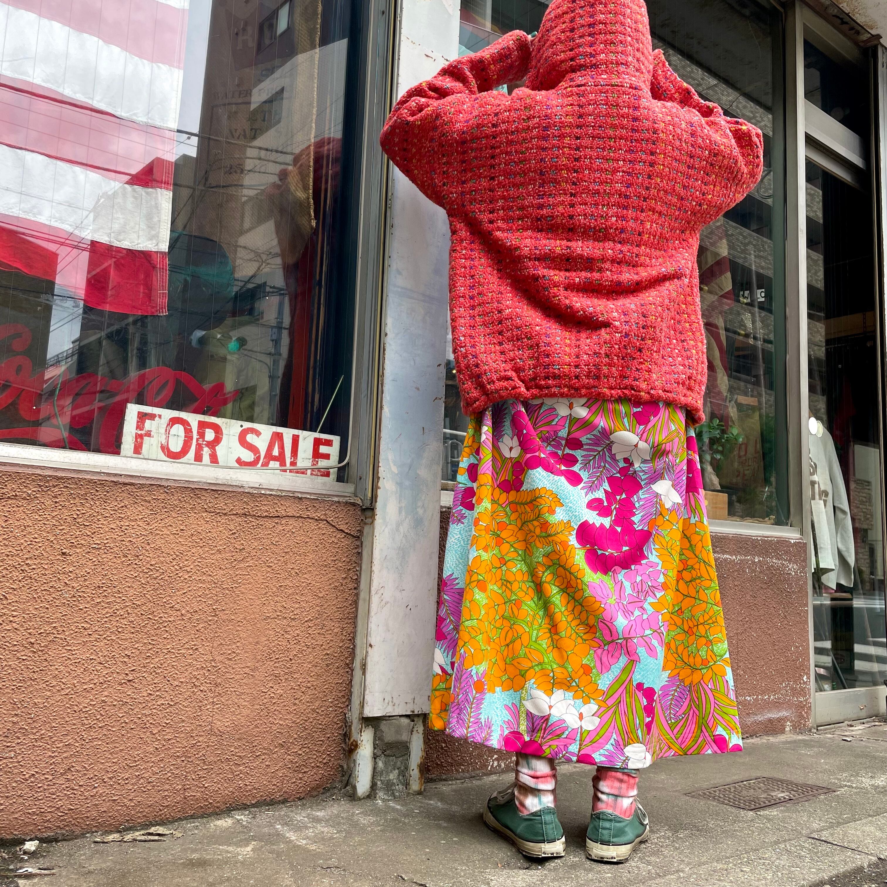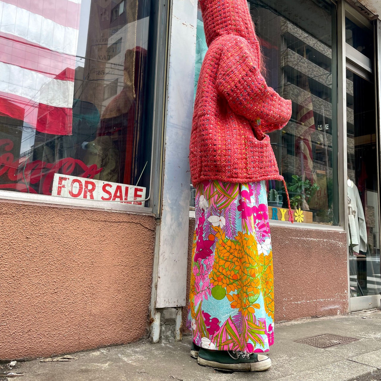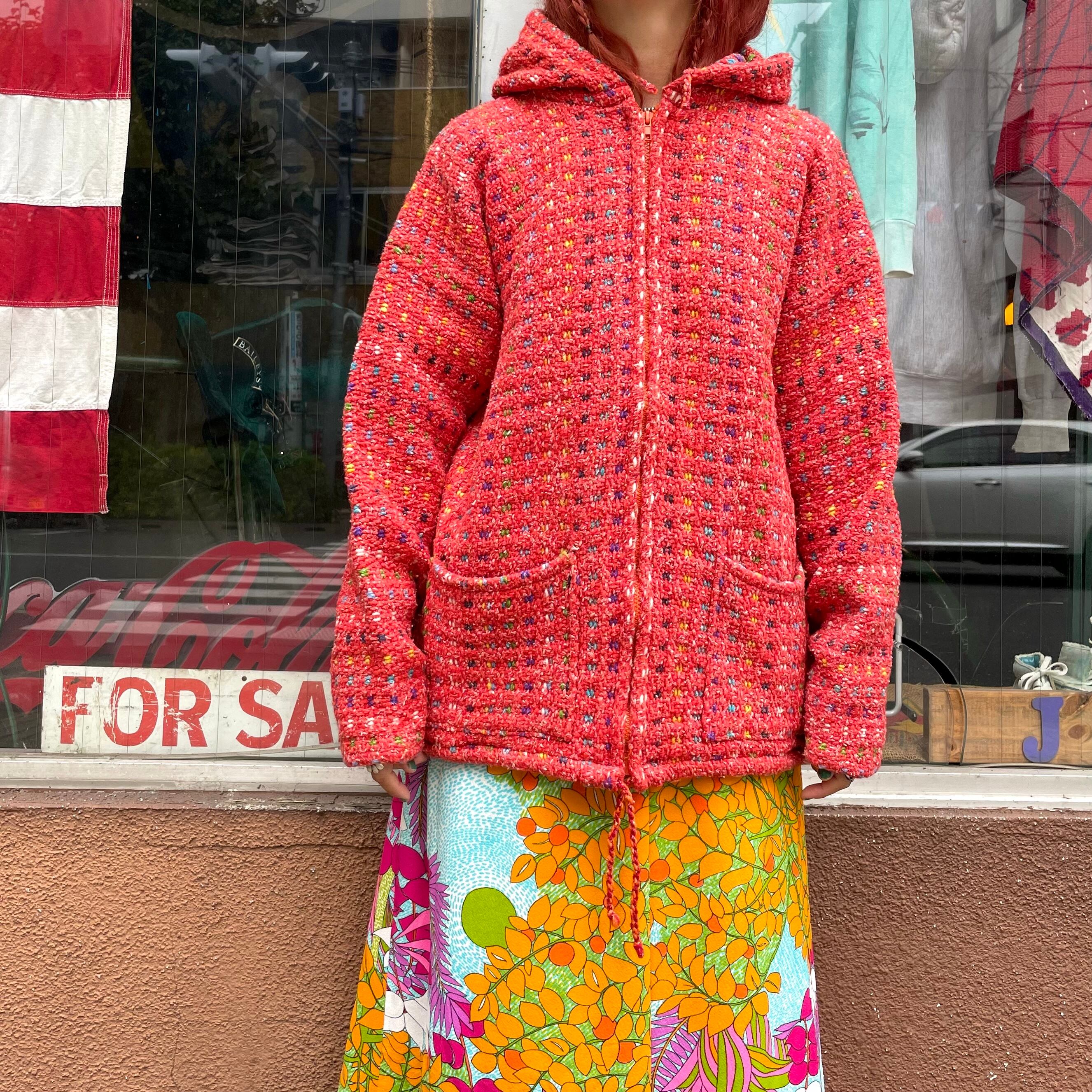 真っ赤でもオレンジでもなく絶妙な色味もかわいいですし、もこもこで暖かいです。いろんな色の毛糸で模様が付けてあるところもポップで良いですね!