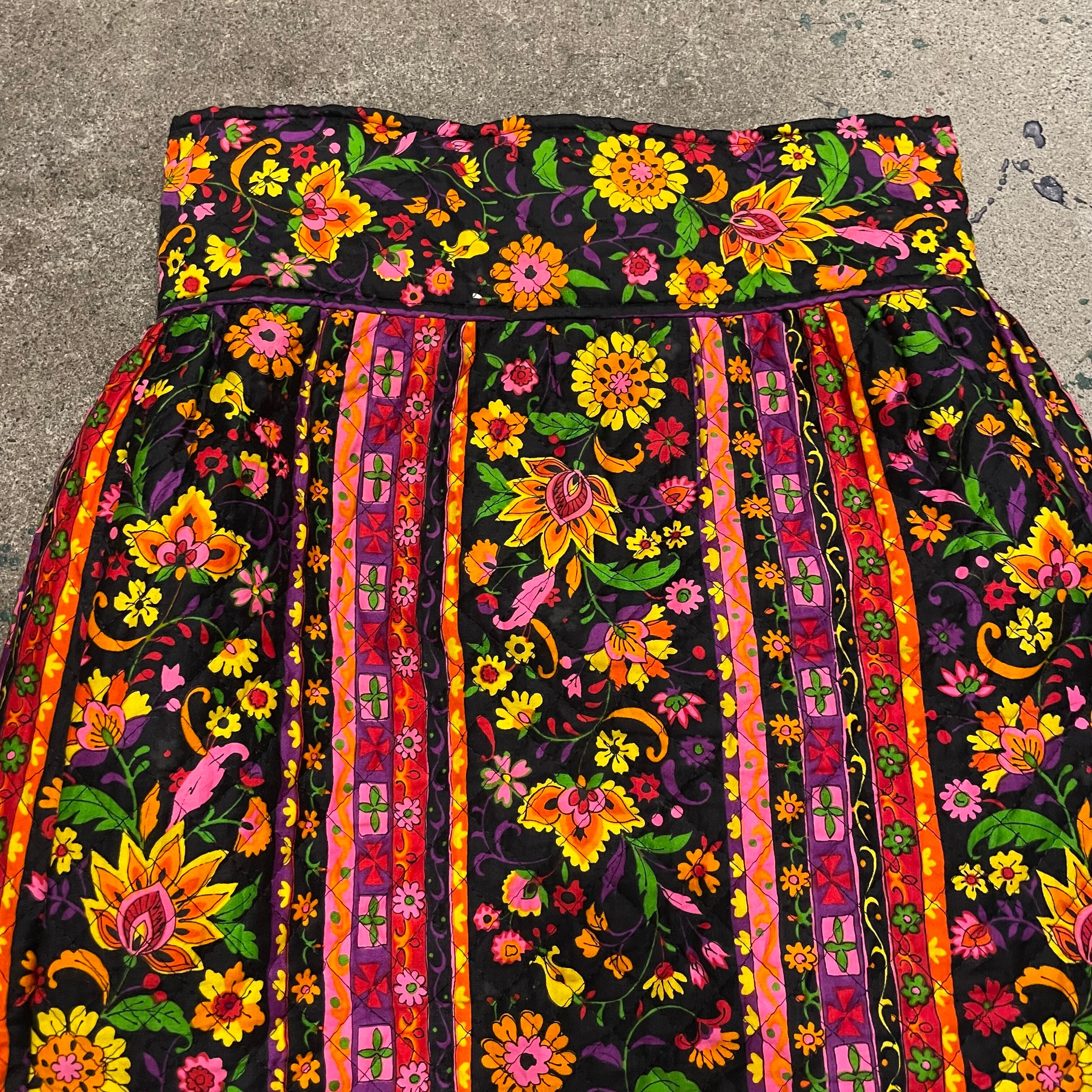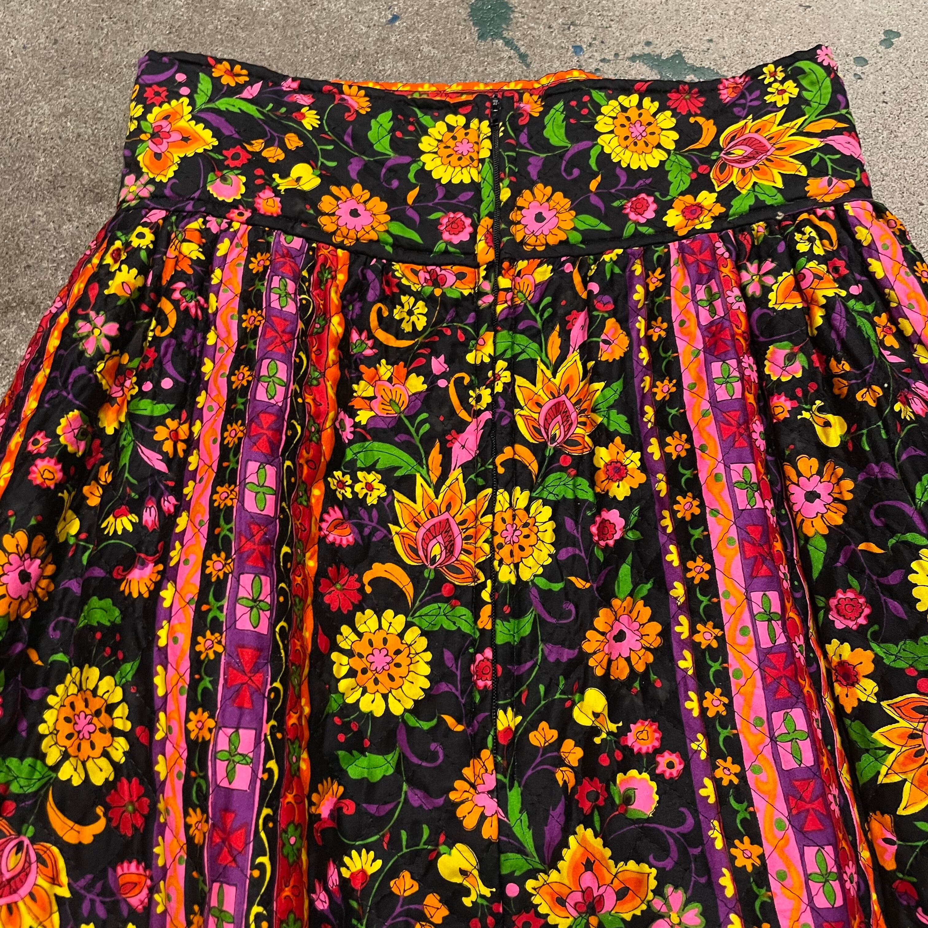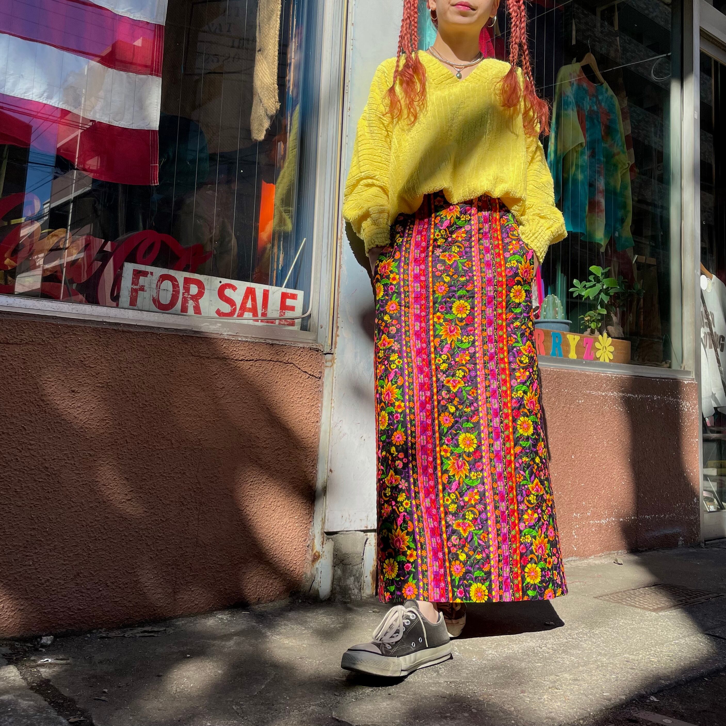 黒地にカラフルなかわいい花柄が魅力的なキルティングスカートです。