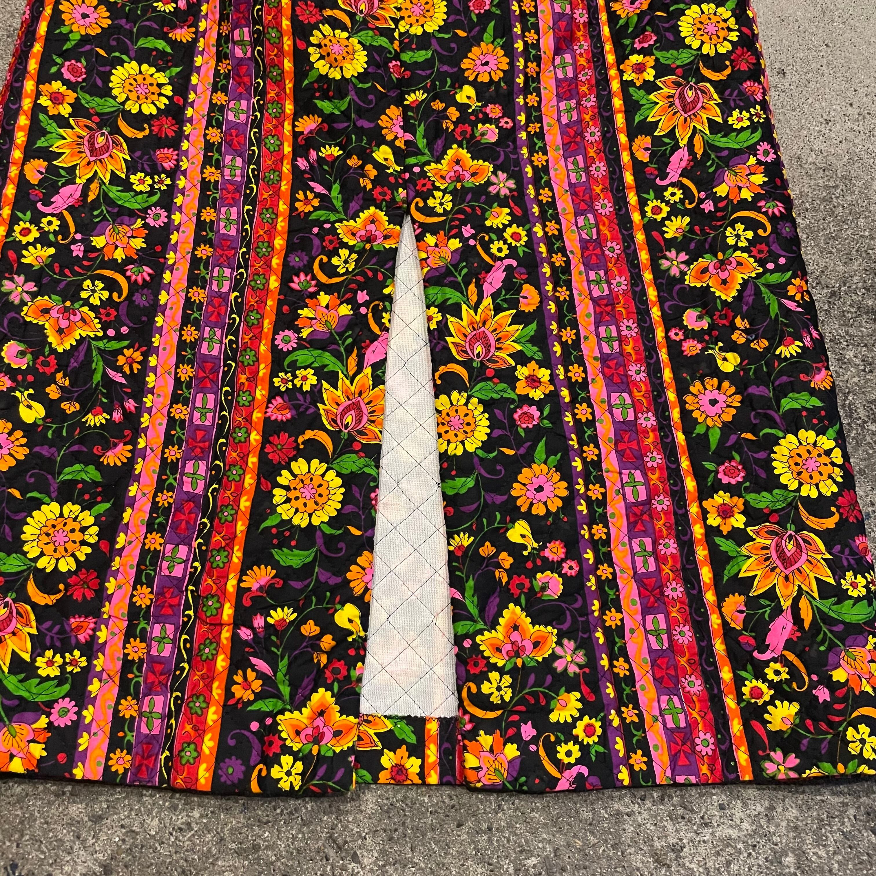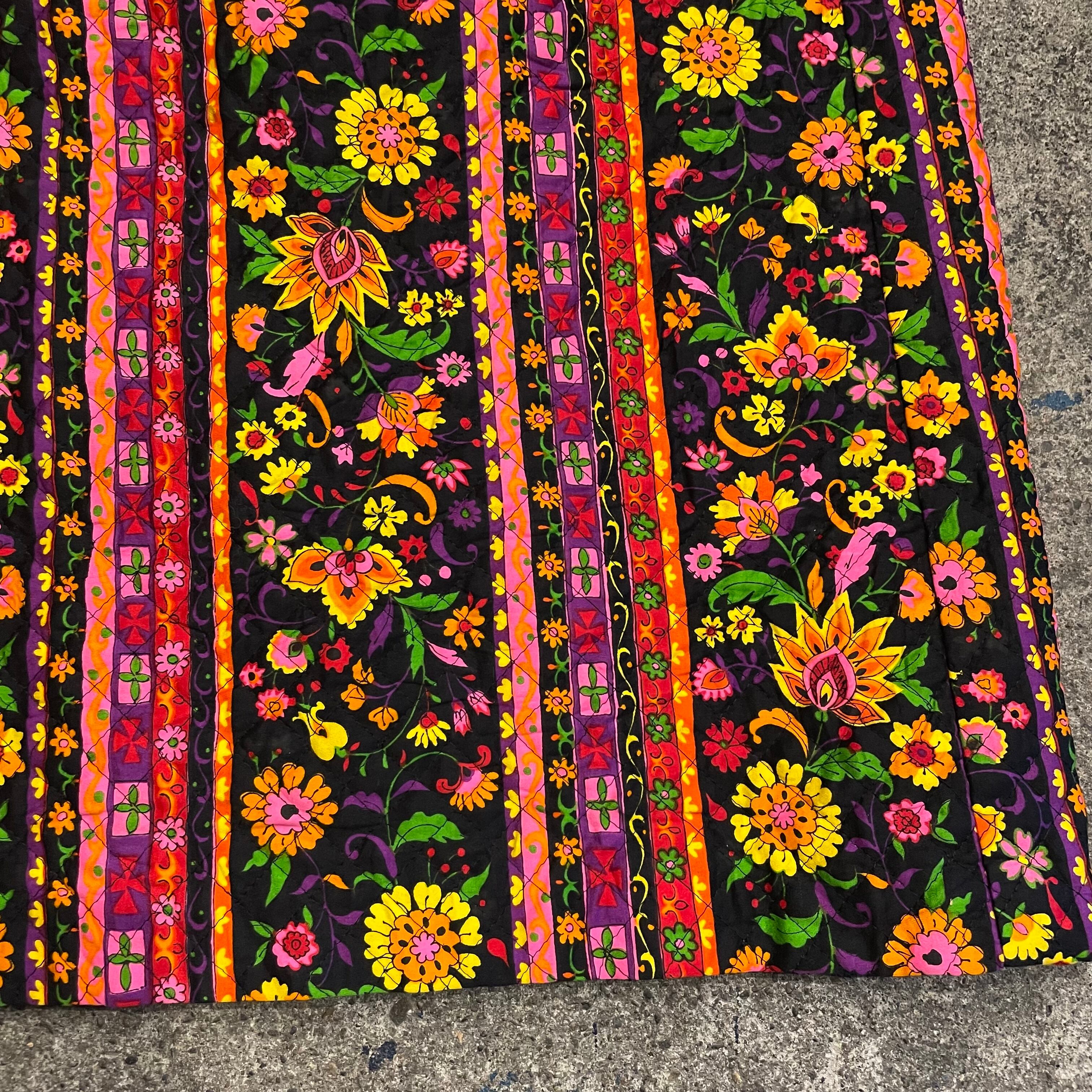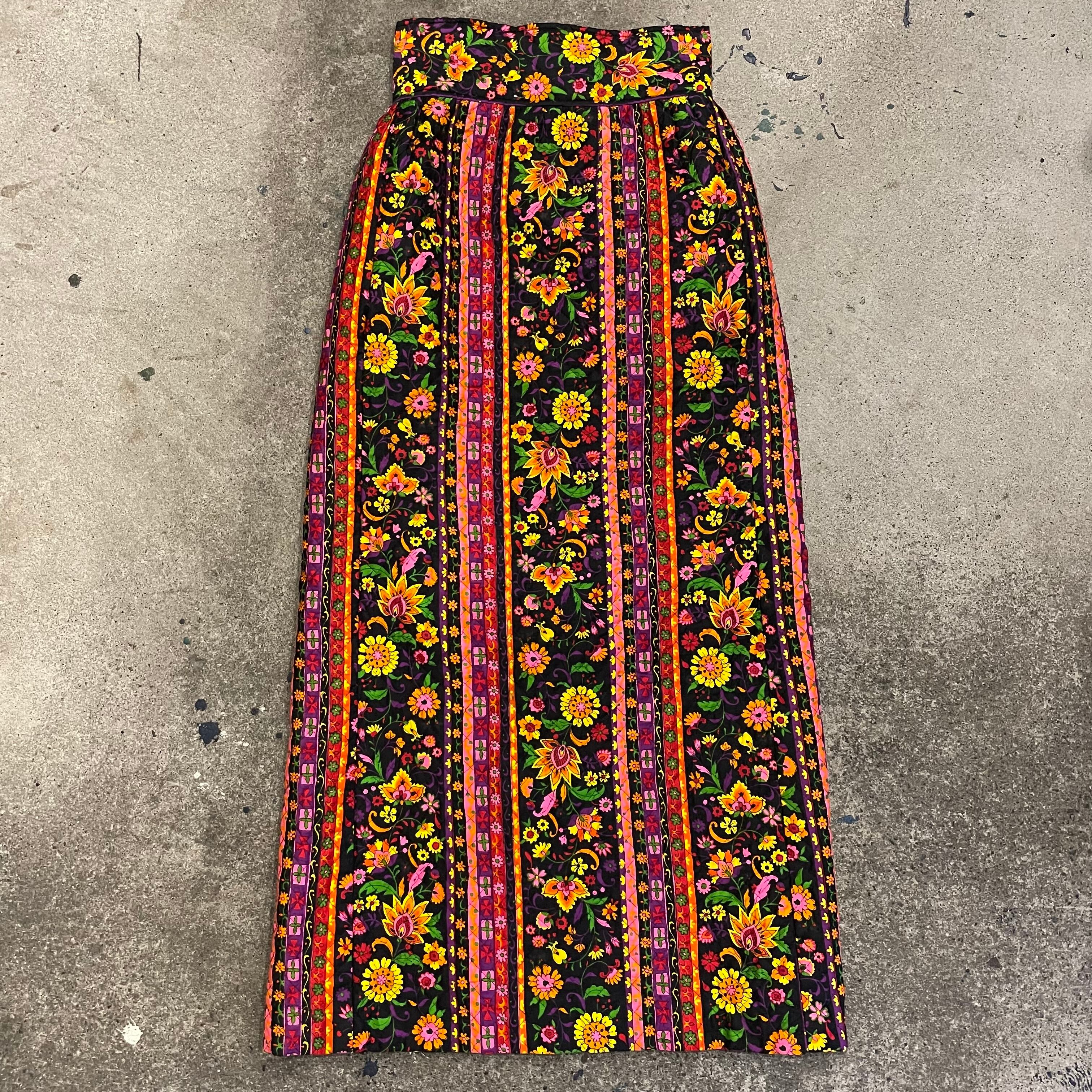 黒地にカラフルなかわいい花柄が魅力的なキルティングスカートです。