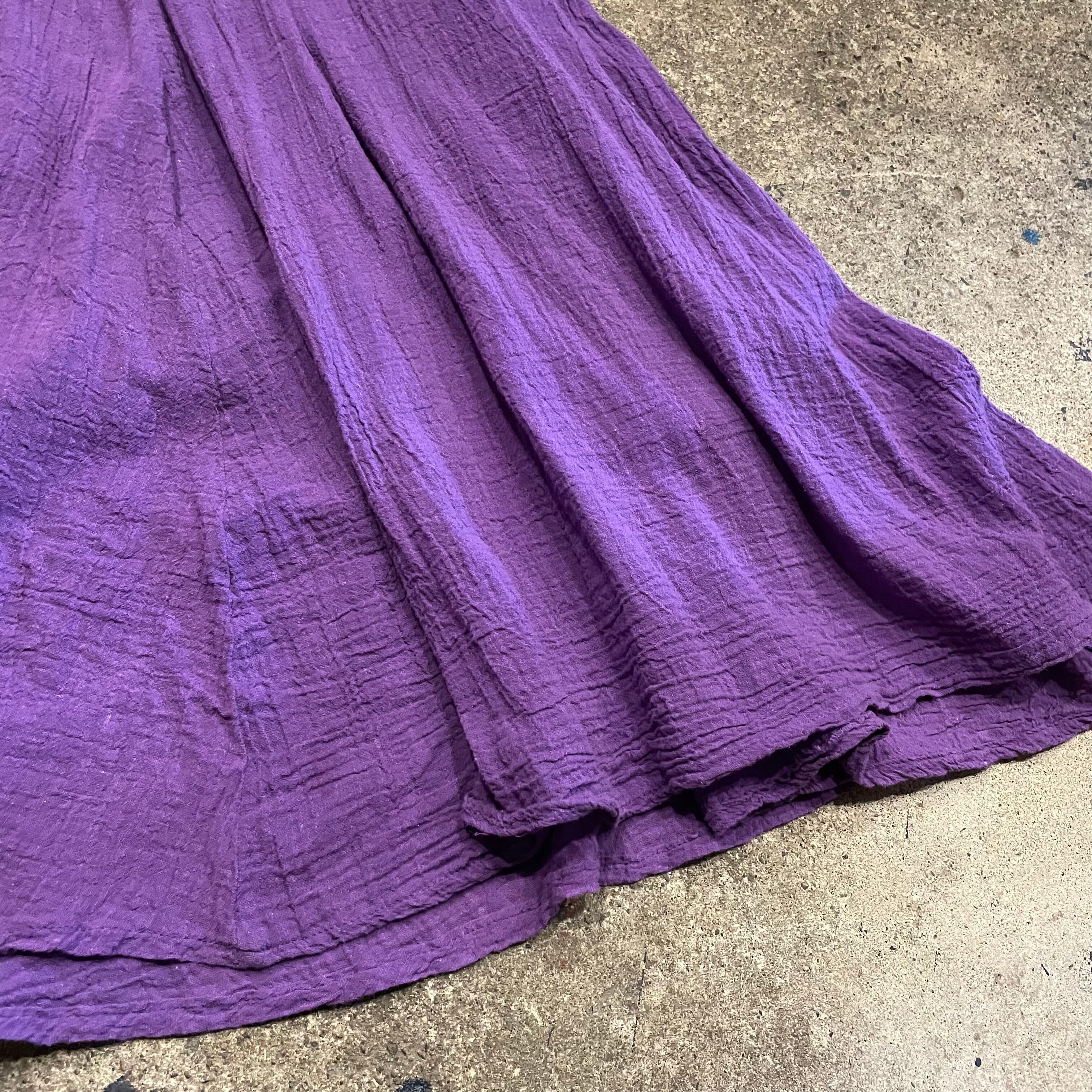 薄いガーゼのような柔らかくて軽い素材のワンピースです。身頃部分は前も後ろもシャーリングになっていてそこからの布量のあるスカート部分のひらひら具合がとてもかわいいシルエットです。