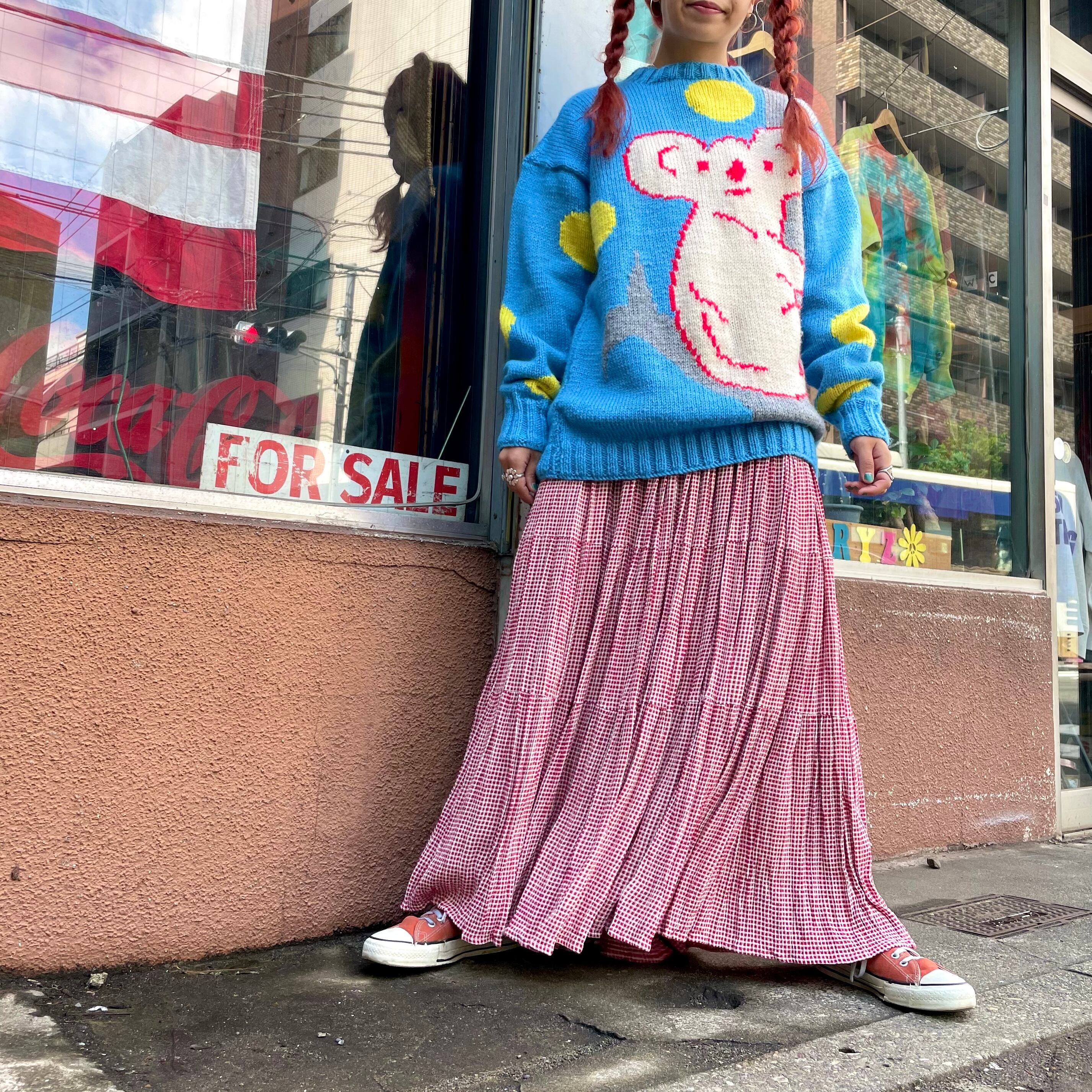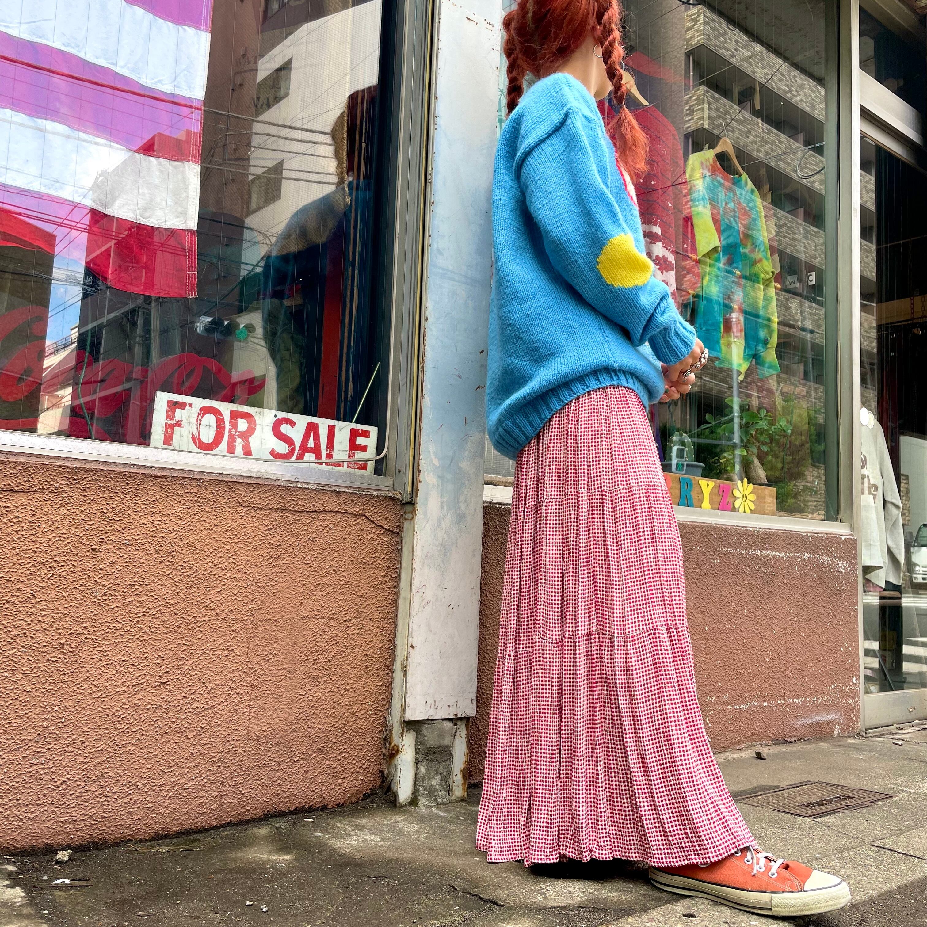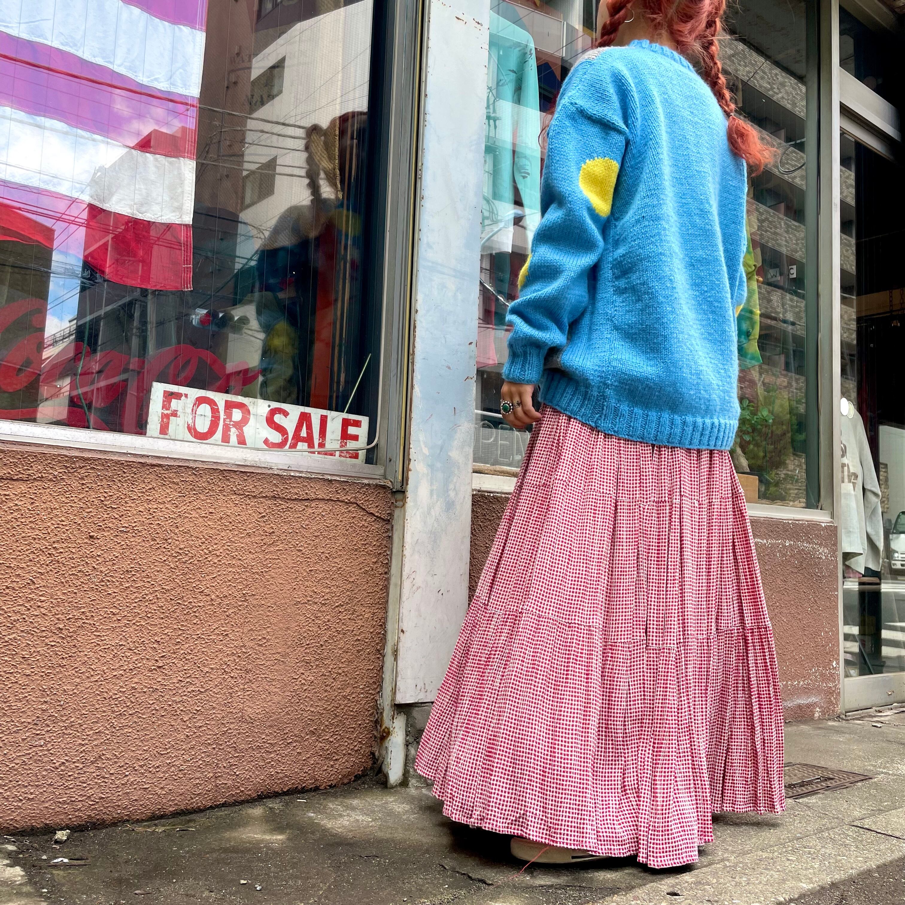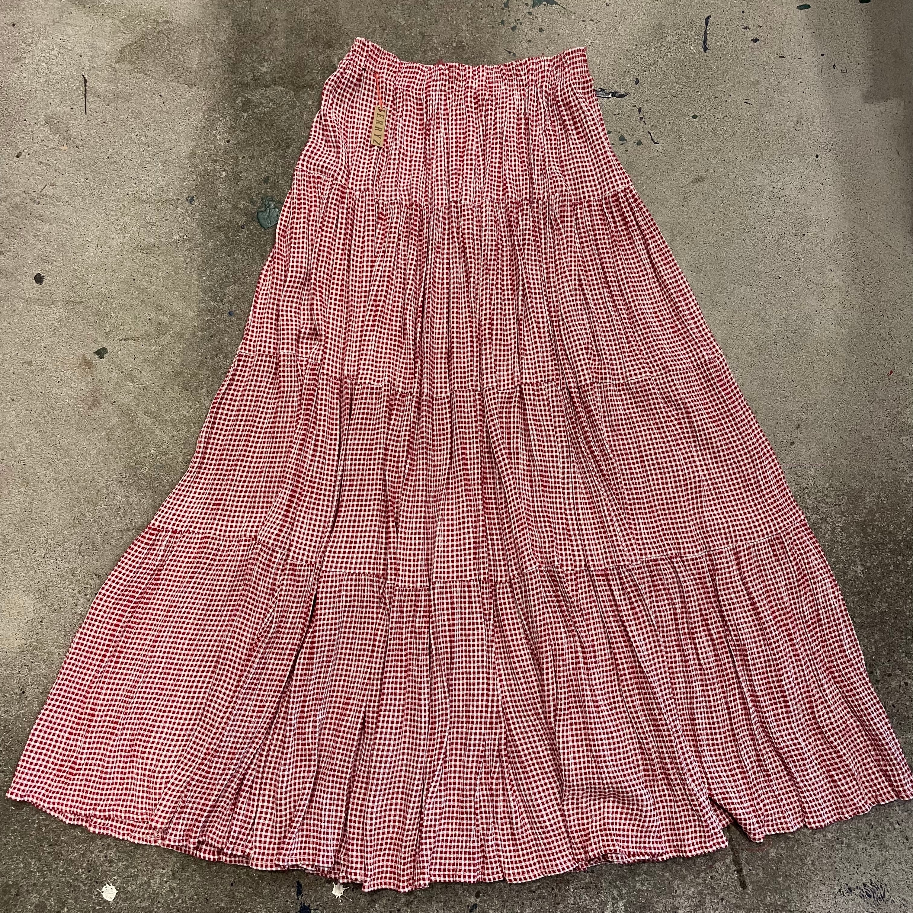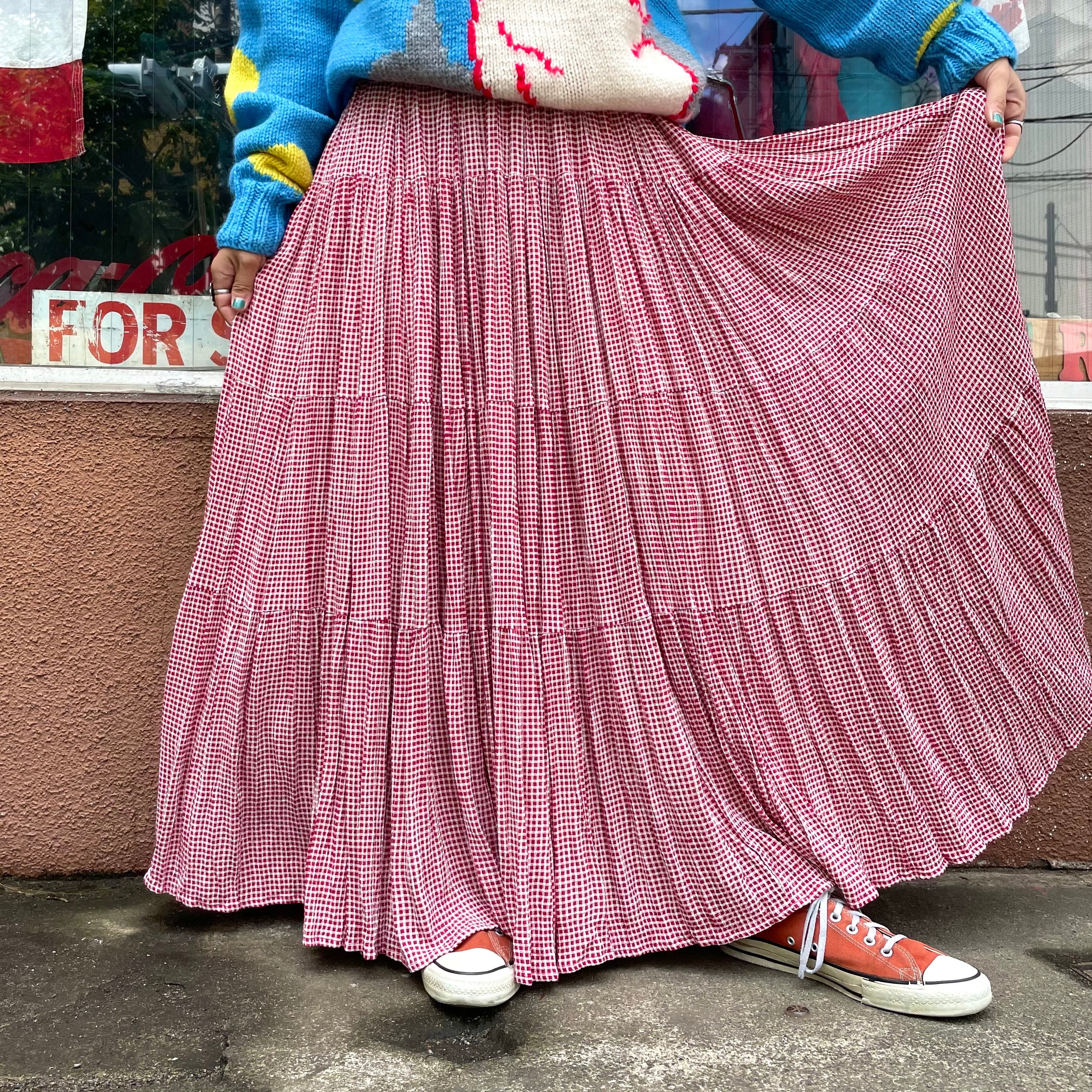 赤白の細かいギンガムチェックがかわいいロングスカートです。4段のティアードになっていてかなりのボリュームがあります。すごい布の量ですので、それなりの重みがありますが歩くたび揺れたり風になびく感じがとてもかわいいです。