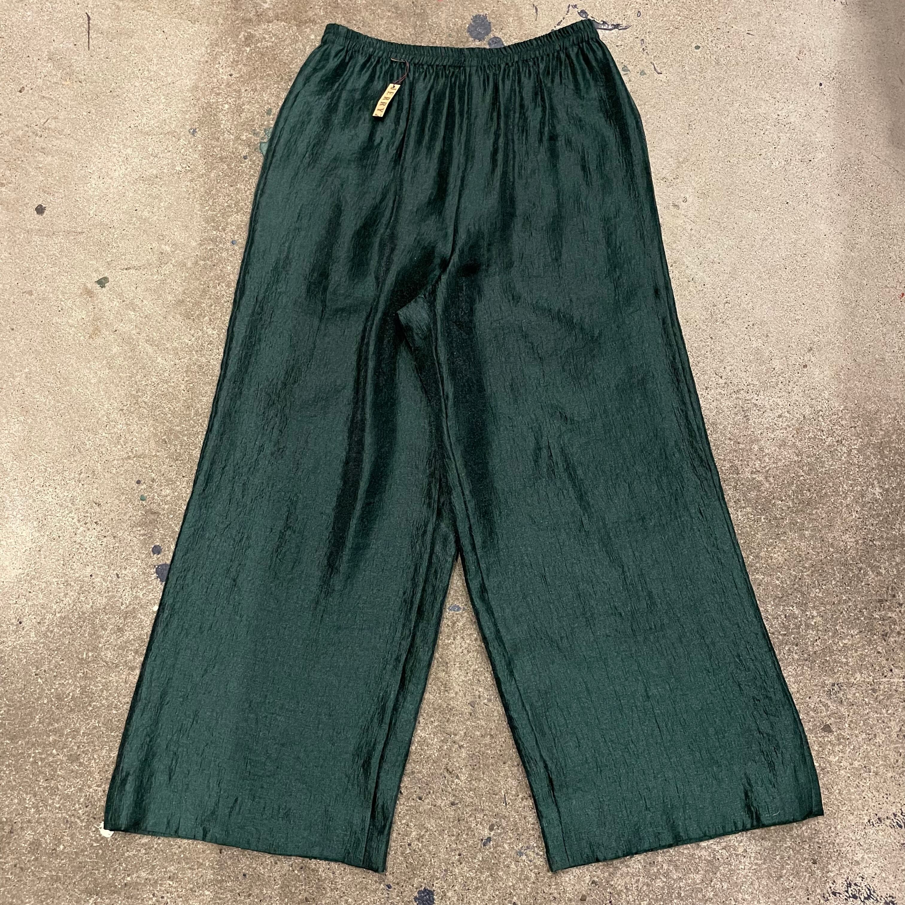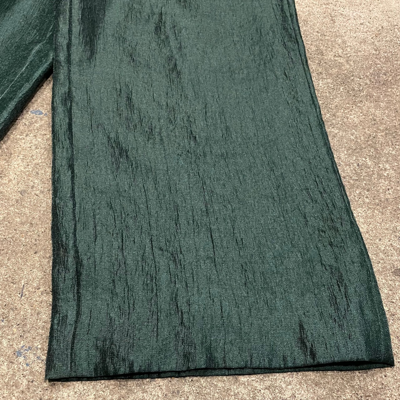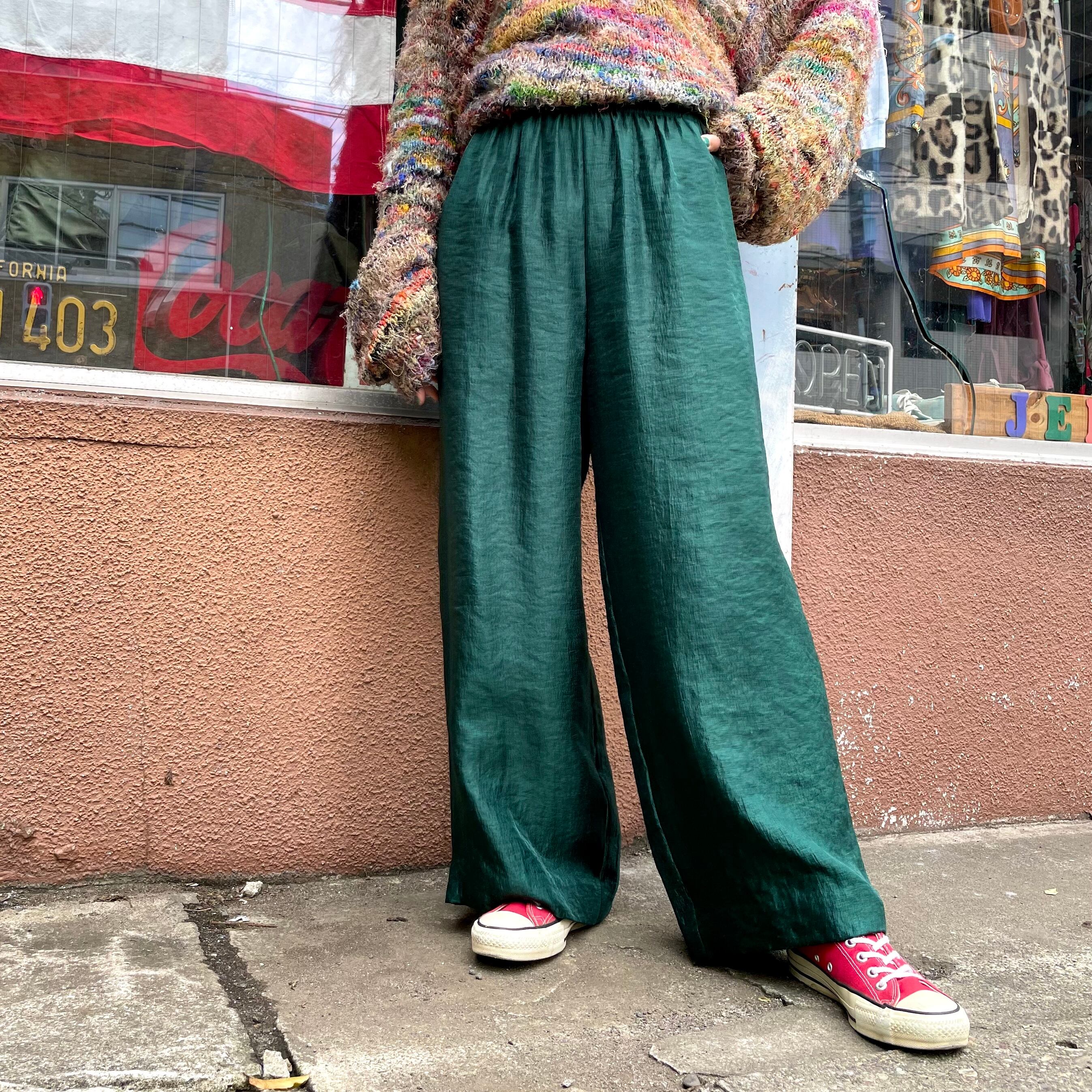 深い緑のキラッと光る素材がかわいいイージーパンツです。
