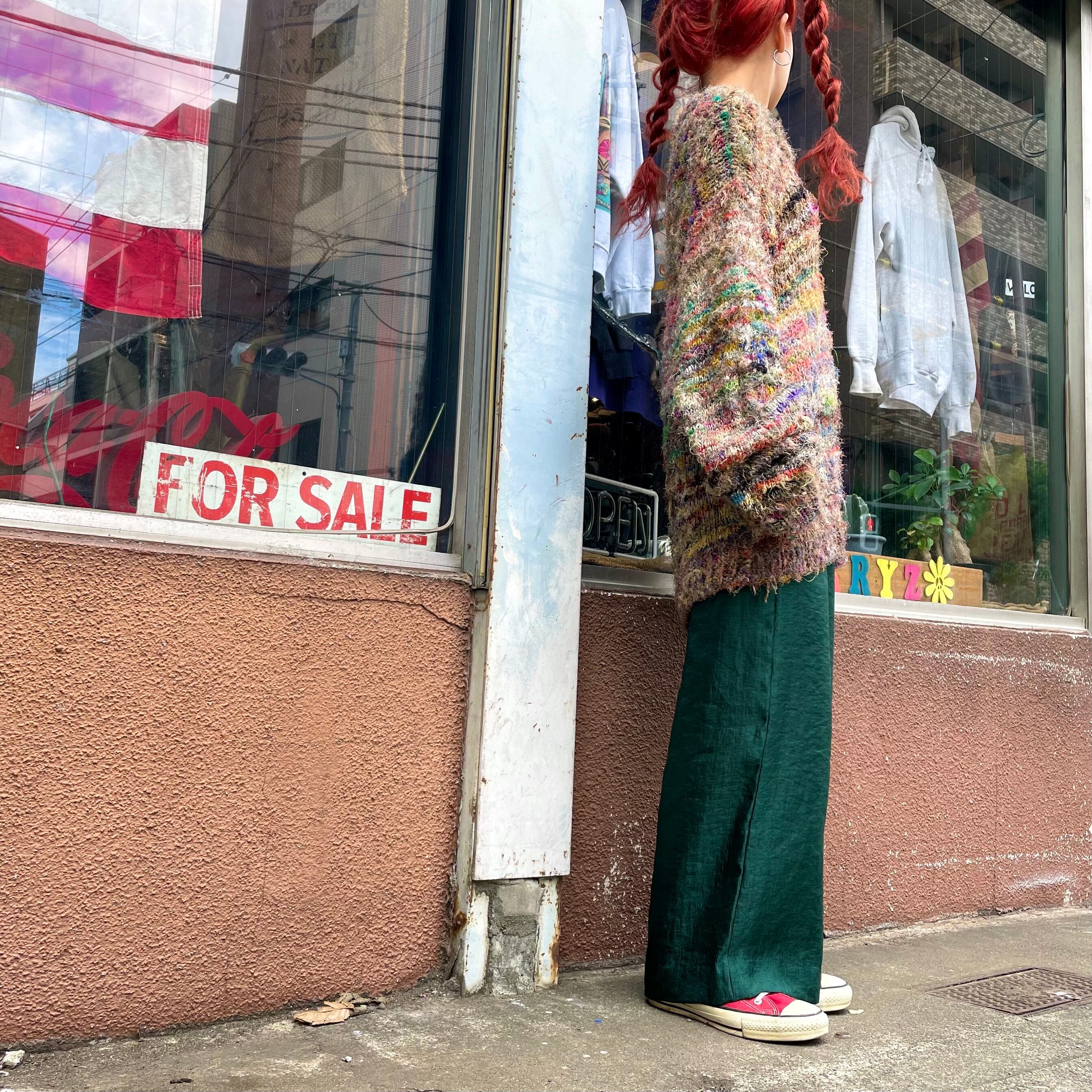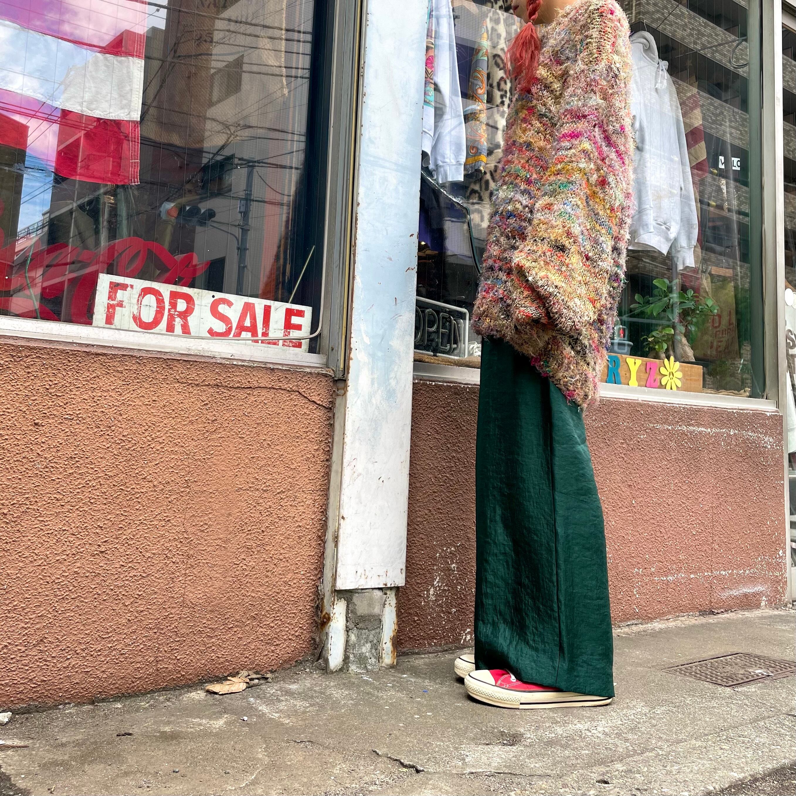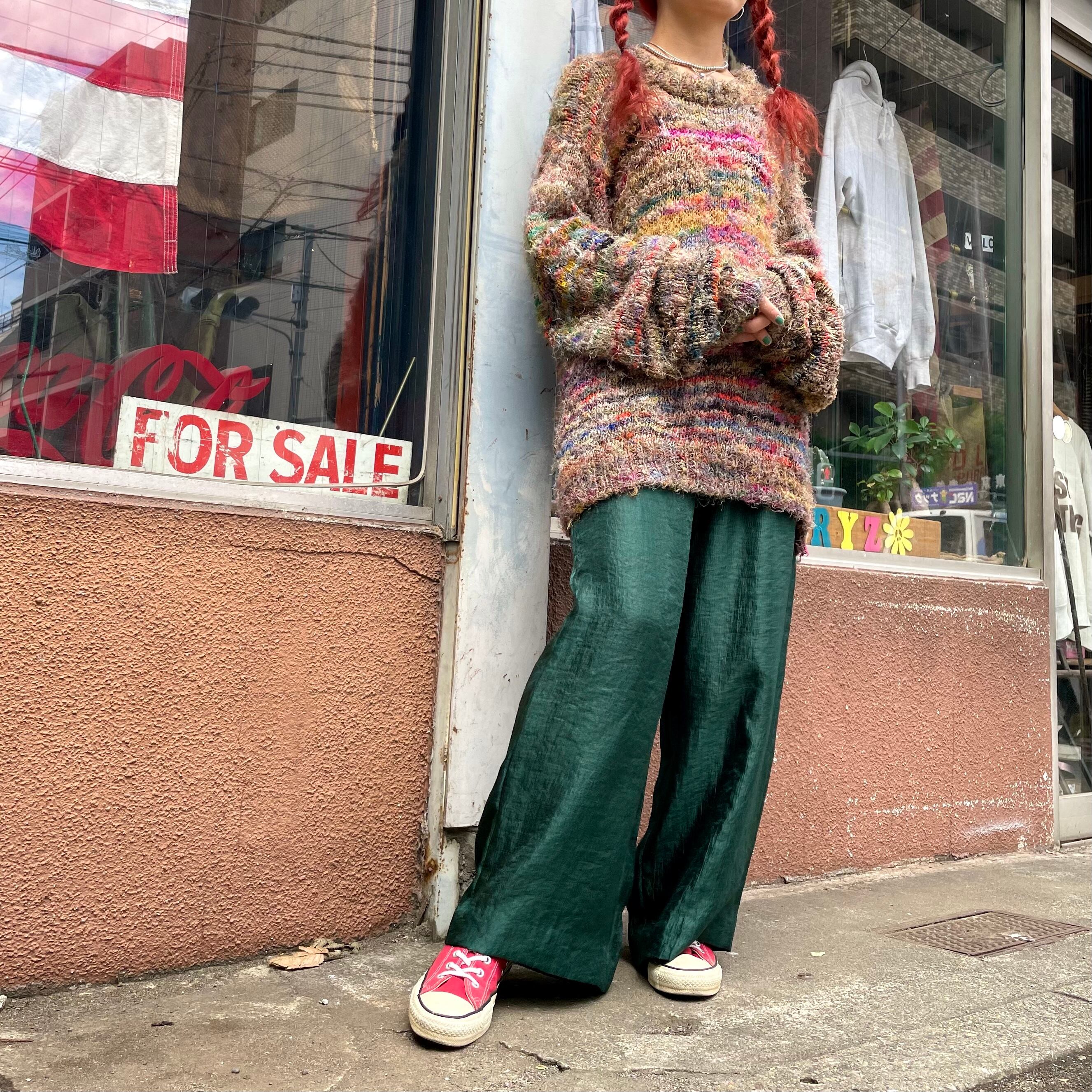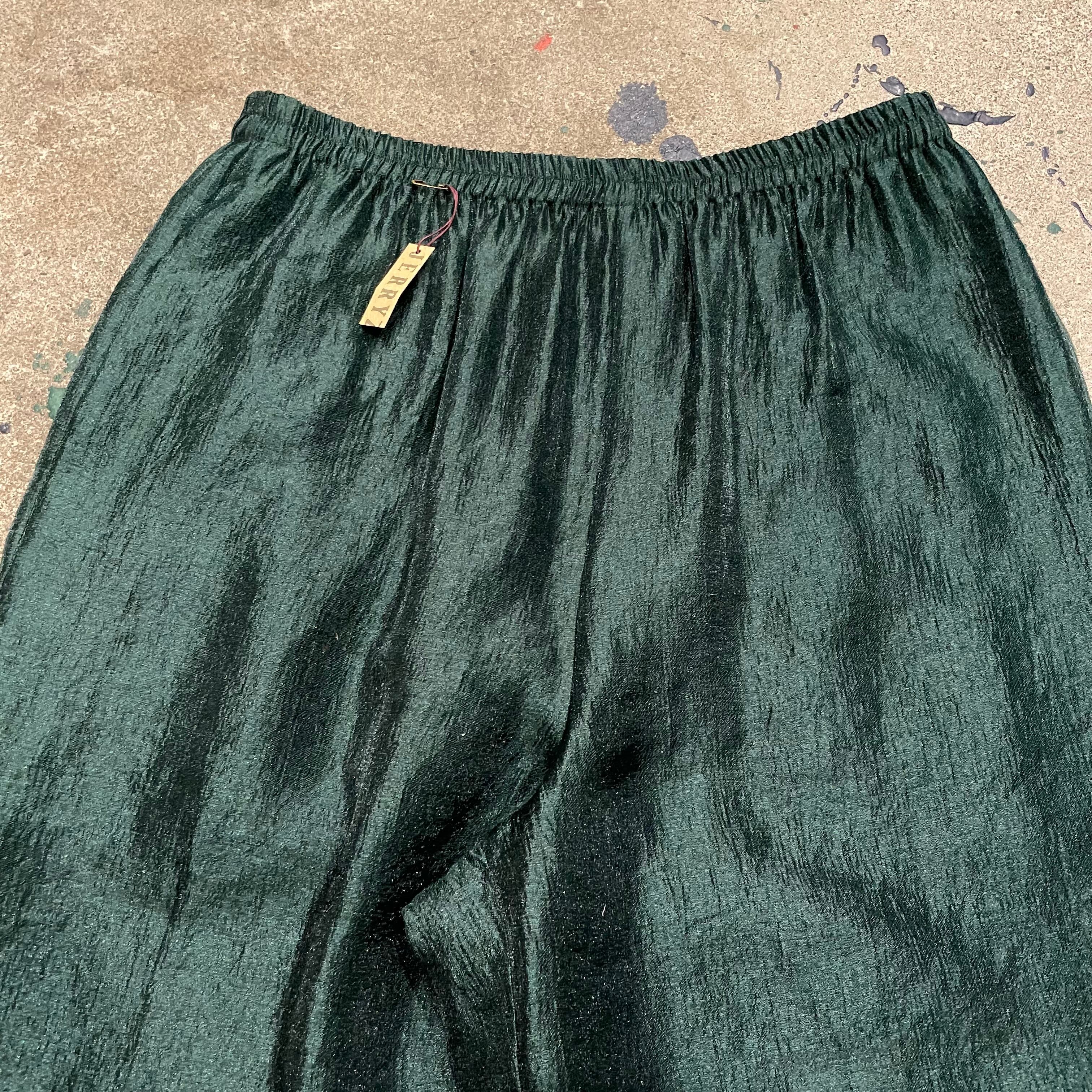 深い緑のキラッと光る素材がかわいいイージーパンツです。