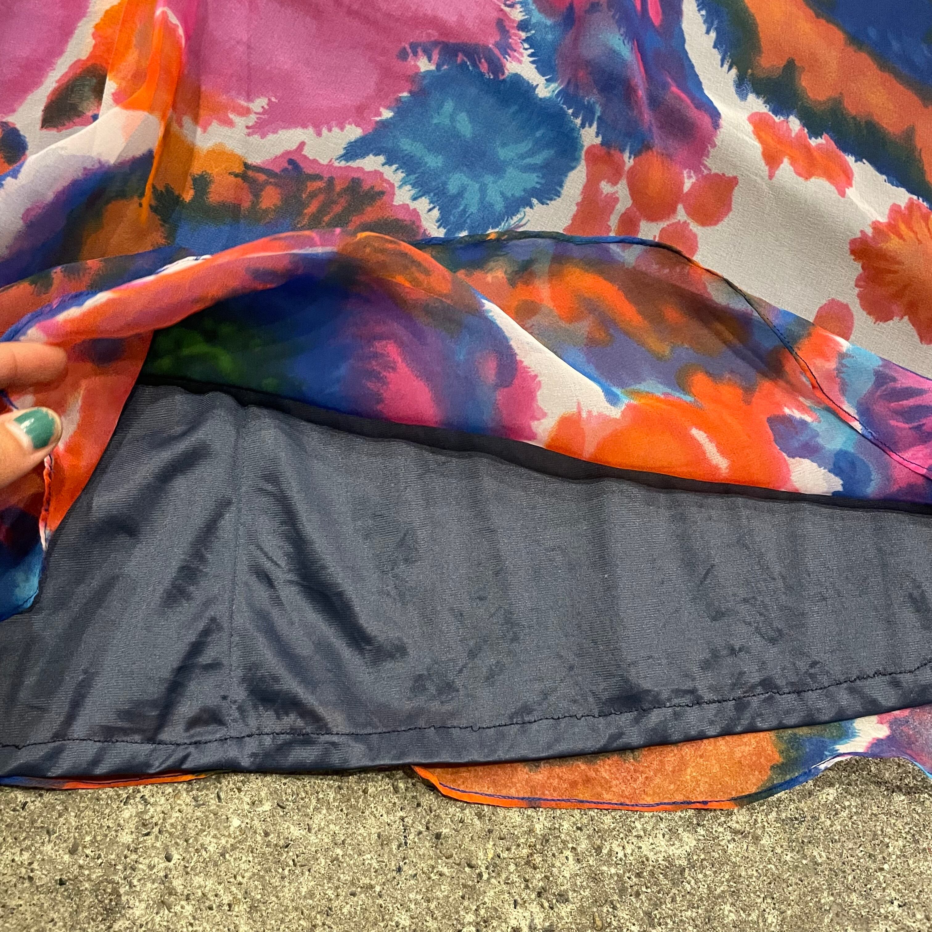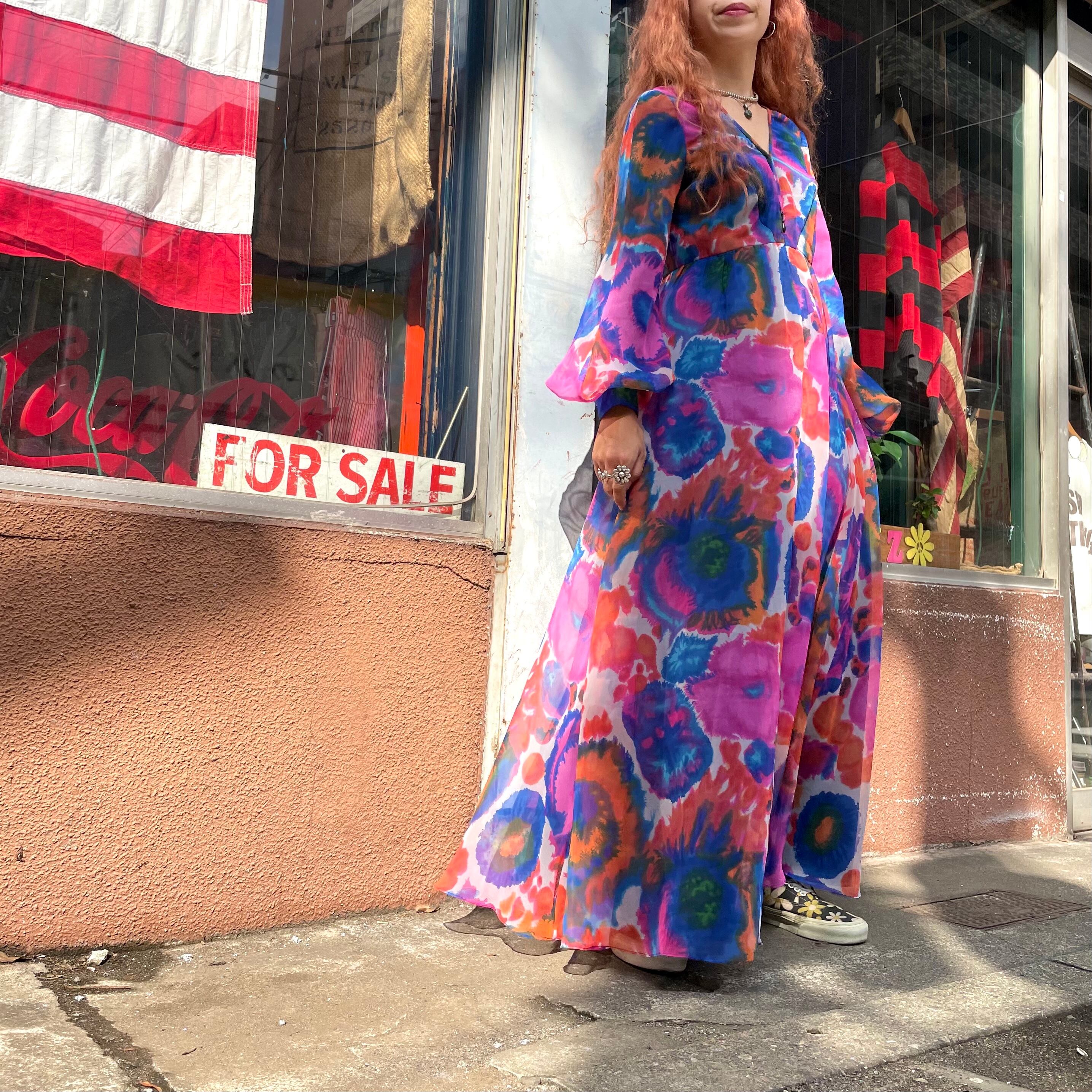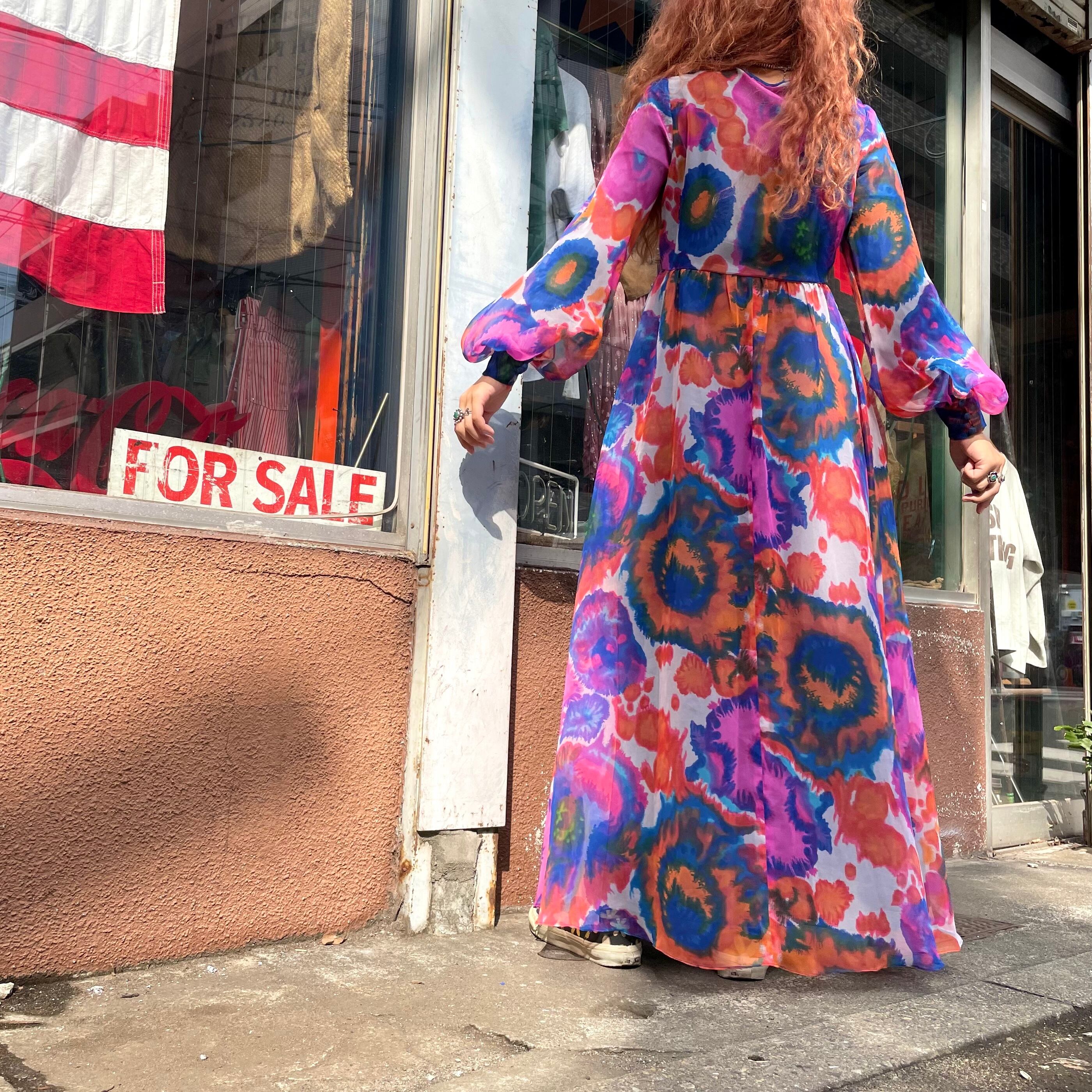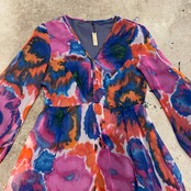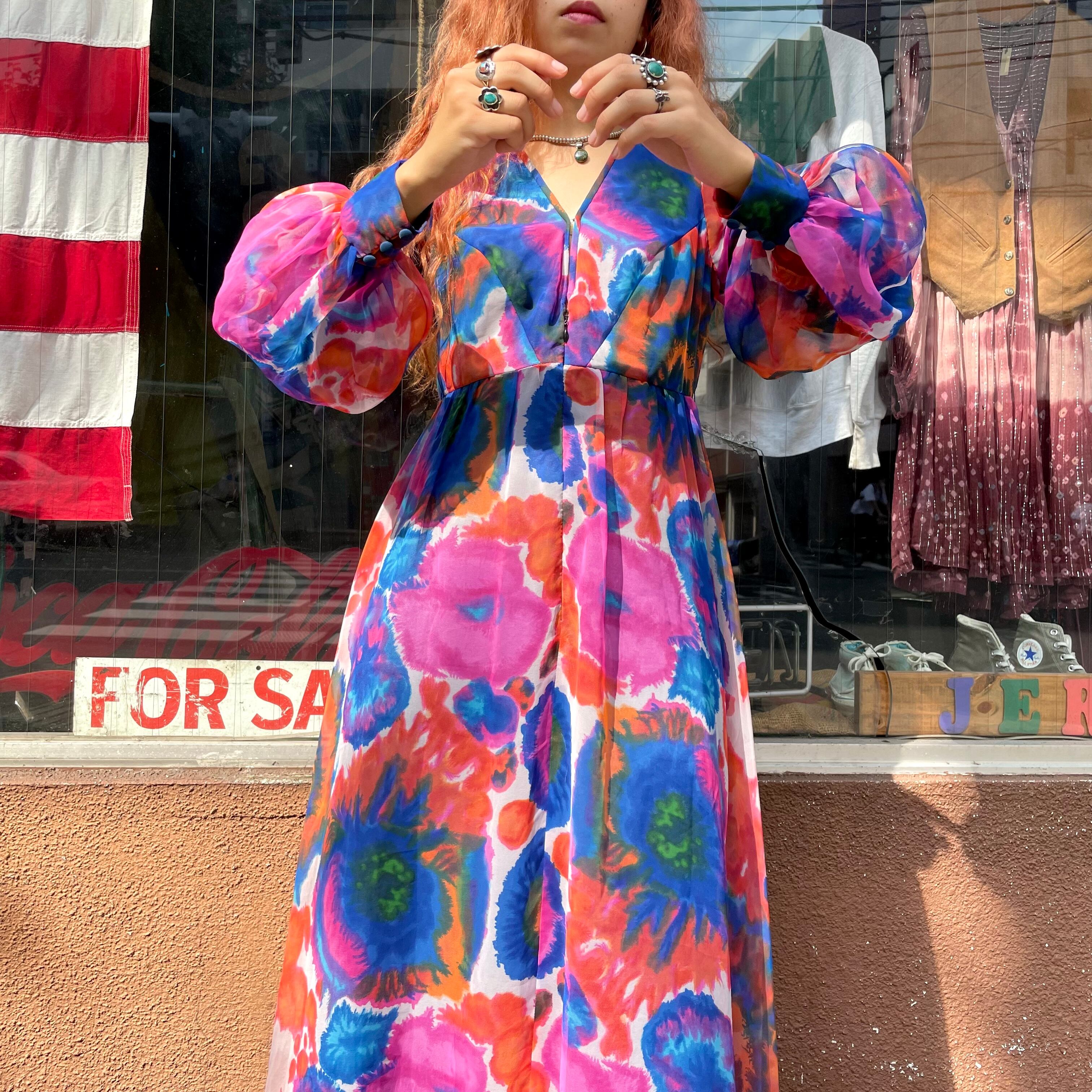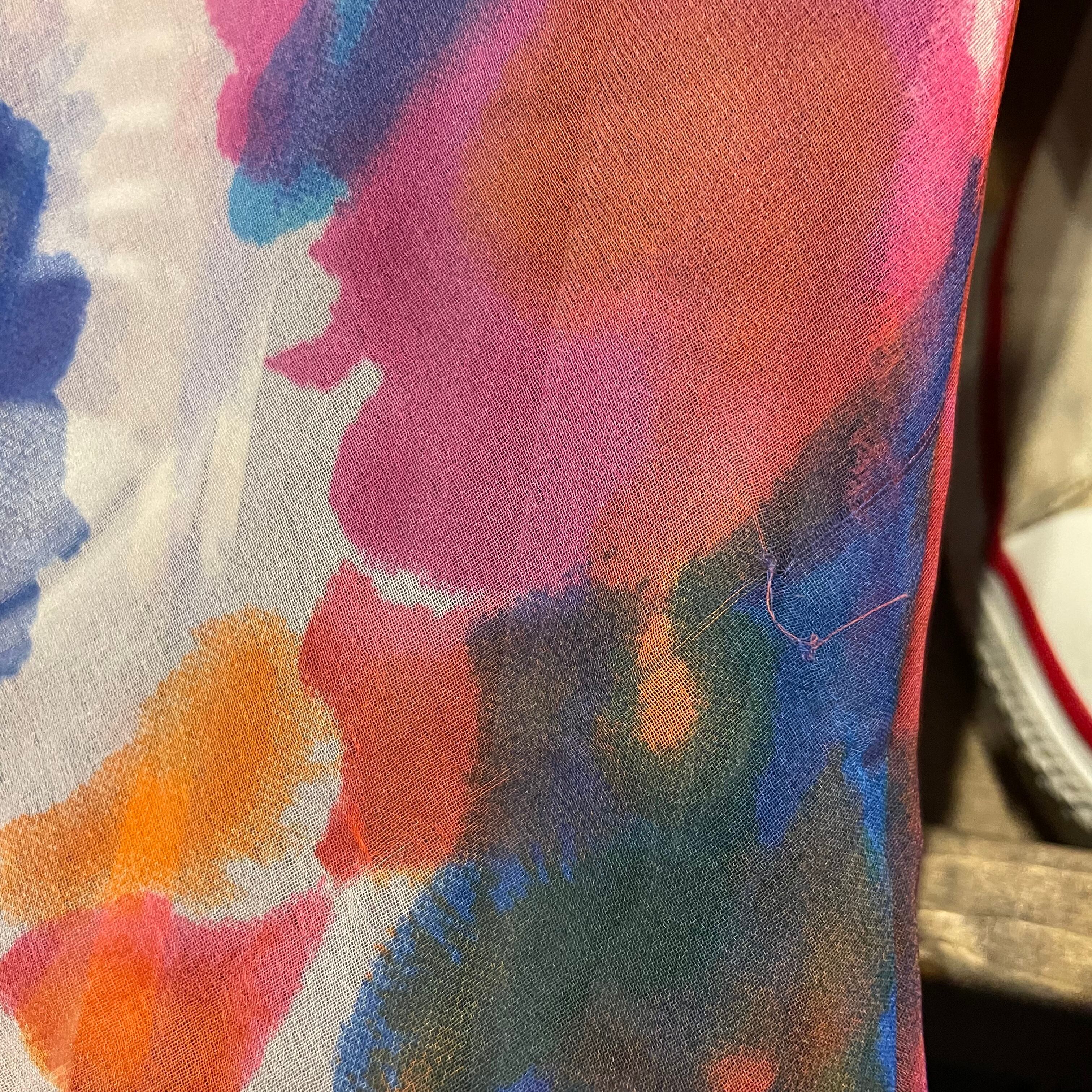 柄も色もシルエットもすごく素敵なワンピースです。絵の具を飛ばしたような激しめの感じもありつつ、白地で柔らかい雰囲気にも見えるとっておきの一着です。袖口のポワっと膨らんできゅっと縛られる感じ、胸下から綺麗に広がる感じもかわいいです。裏地が付いていますので一枚で着て頂けます。