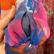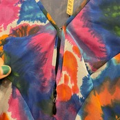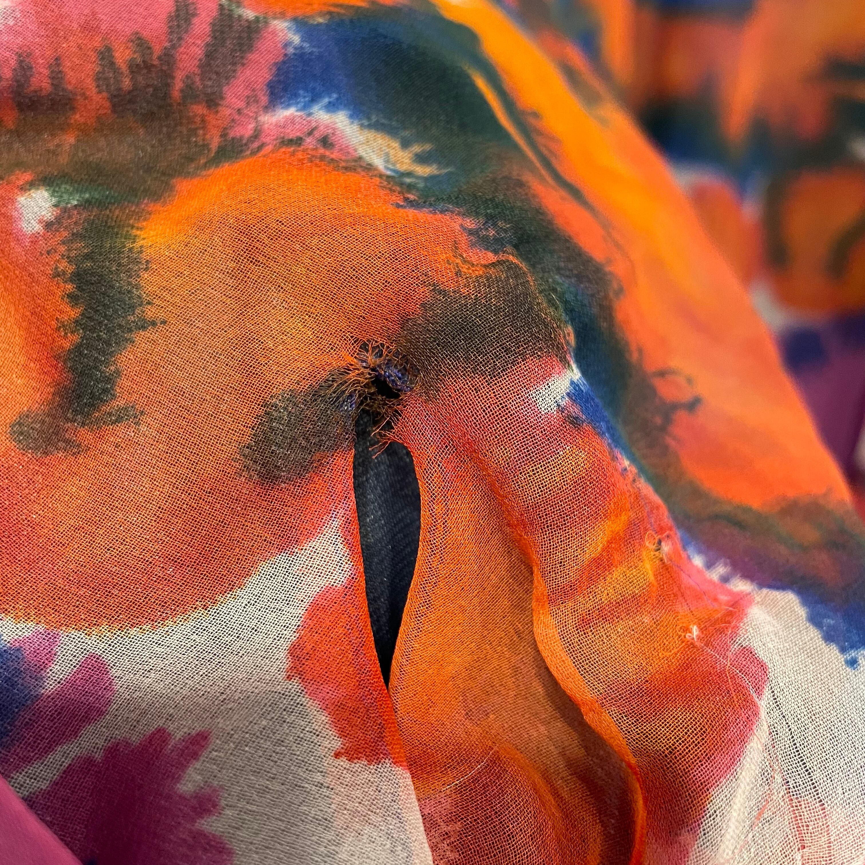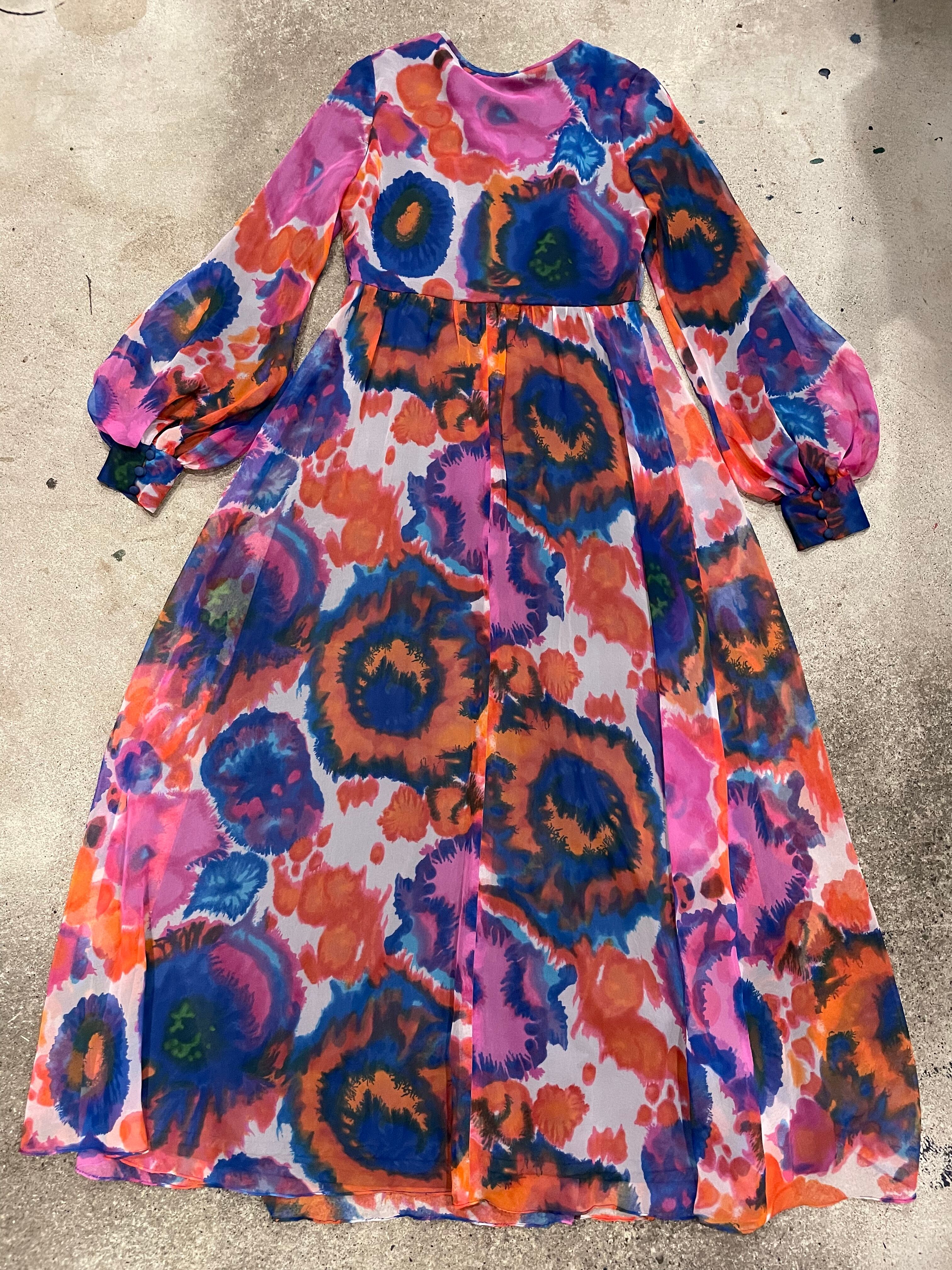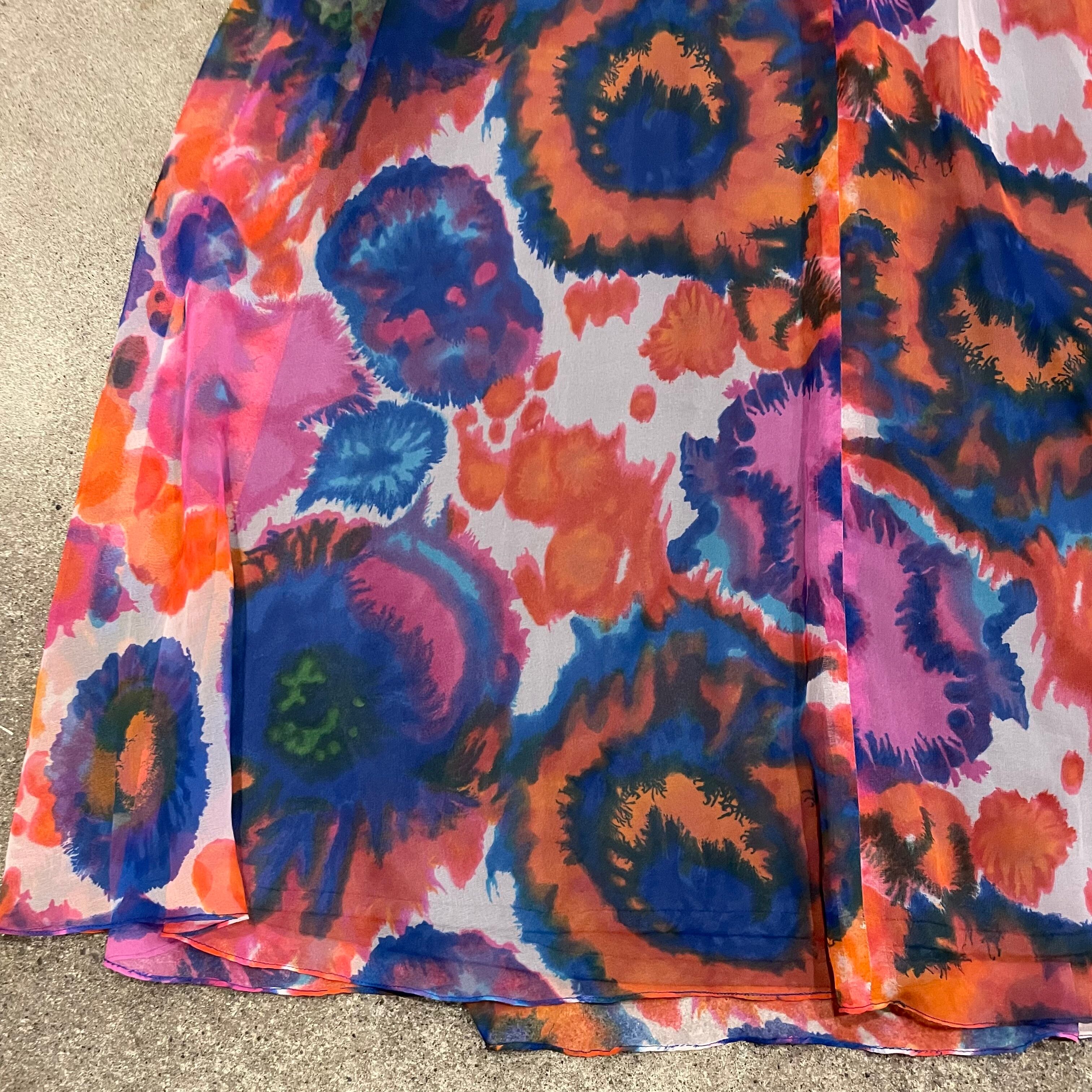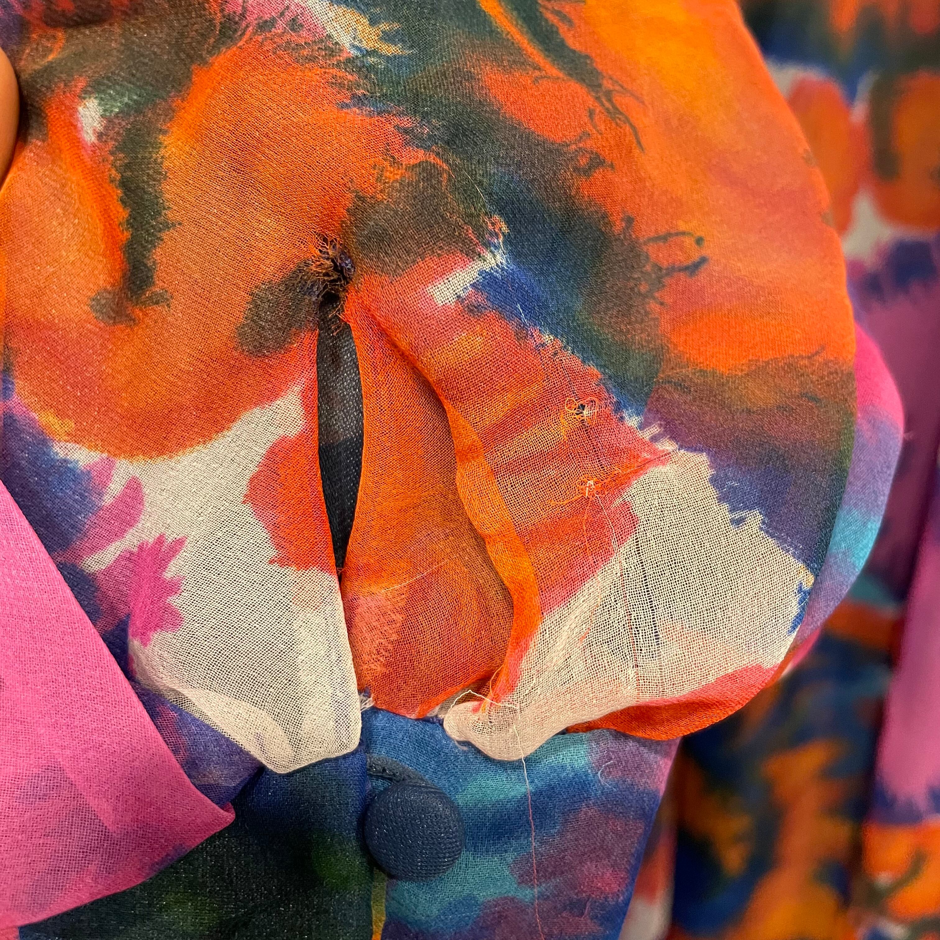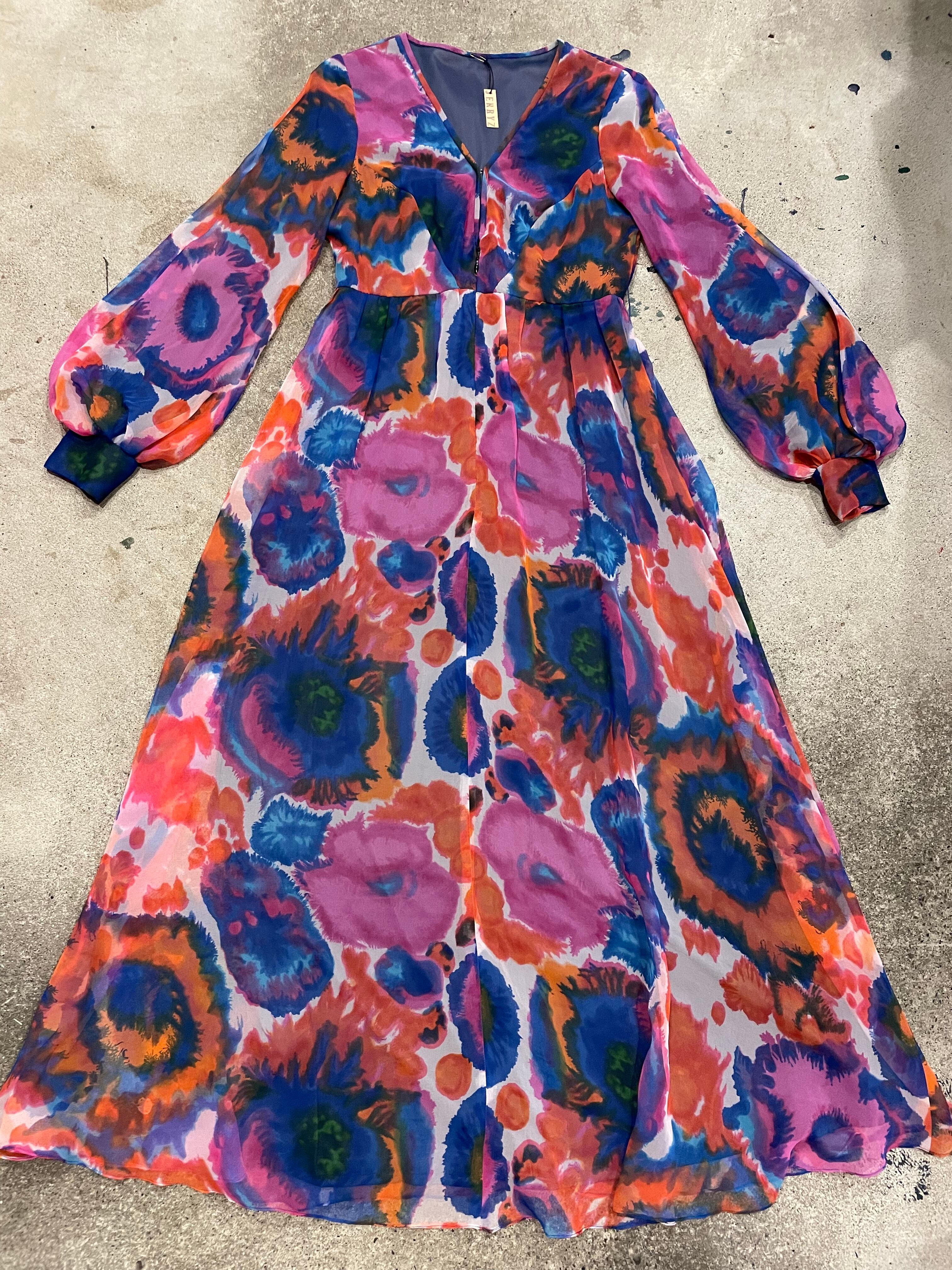柄も色もシルエットもすごく素敵なワンピースです。絵の具を飛ばしたような激しめの感じもありつつ、白地で柔らかい雰囲気にも見えるとっておきの一着です。袖口のポワっと膨らんできゅっと縛られる感じ、胸下から綺麗に広がる感じもかわいいです。裏地が付いていますので一枚で着て頂けます。