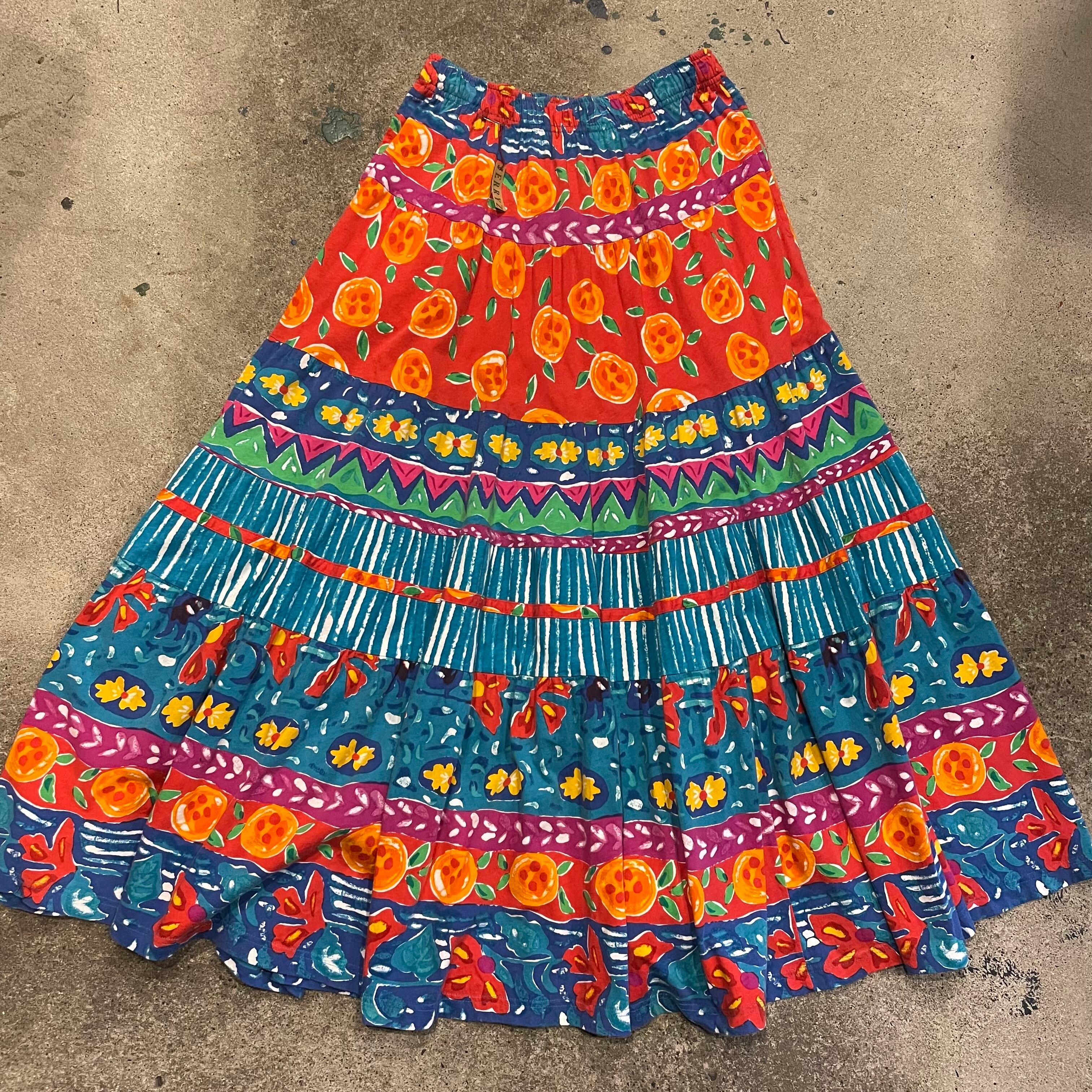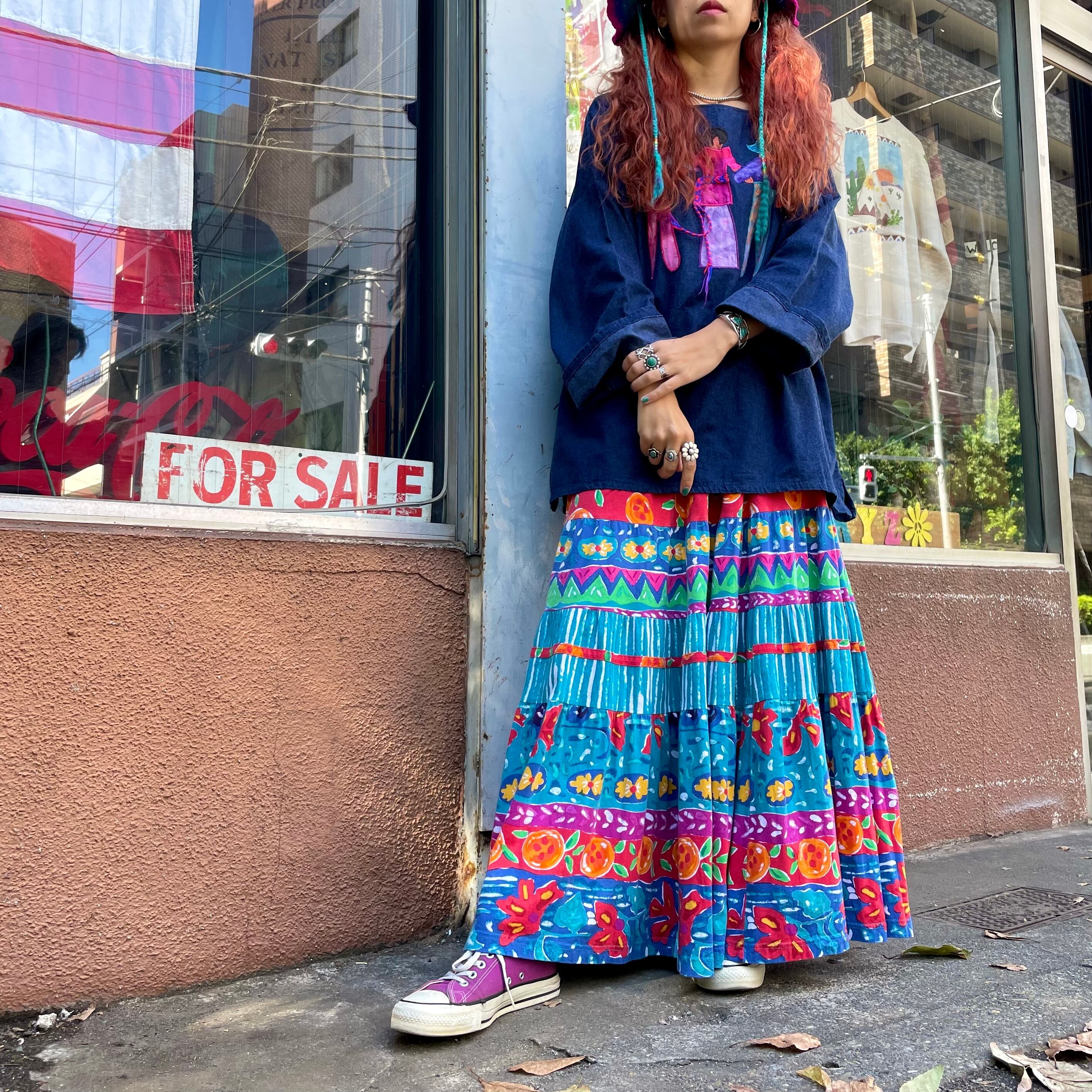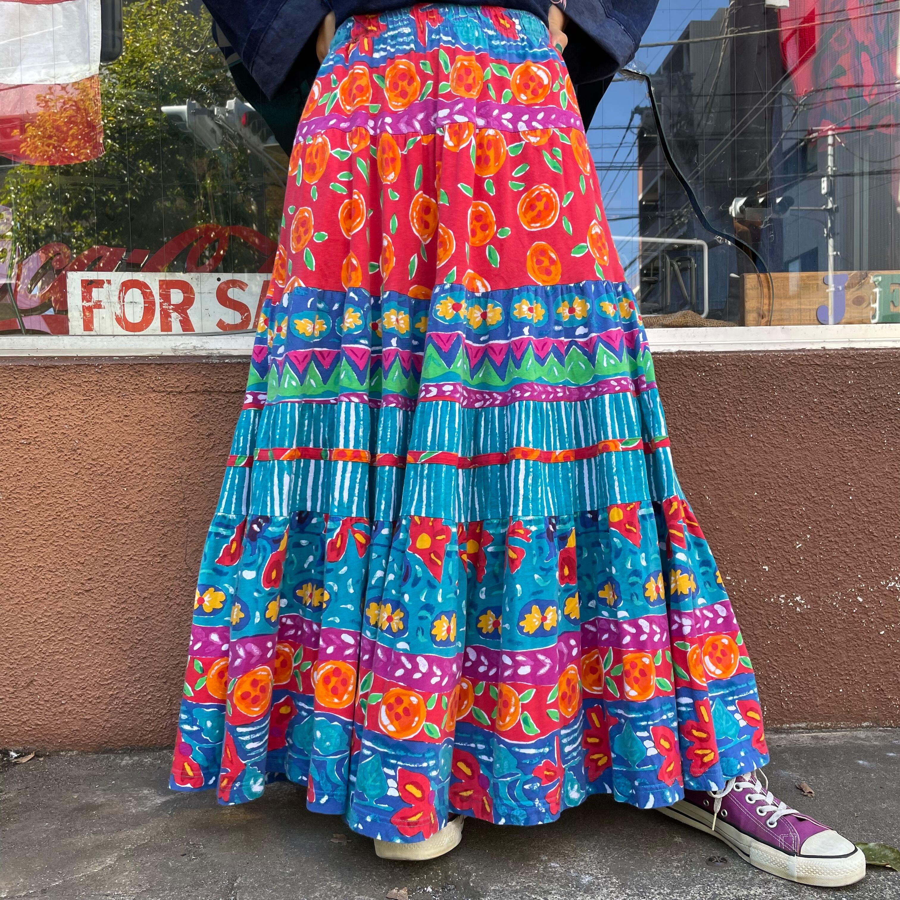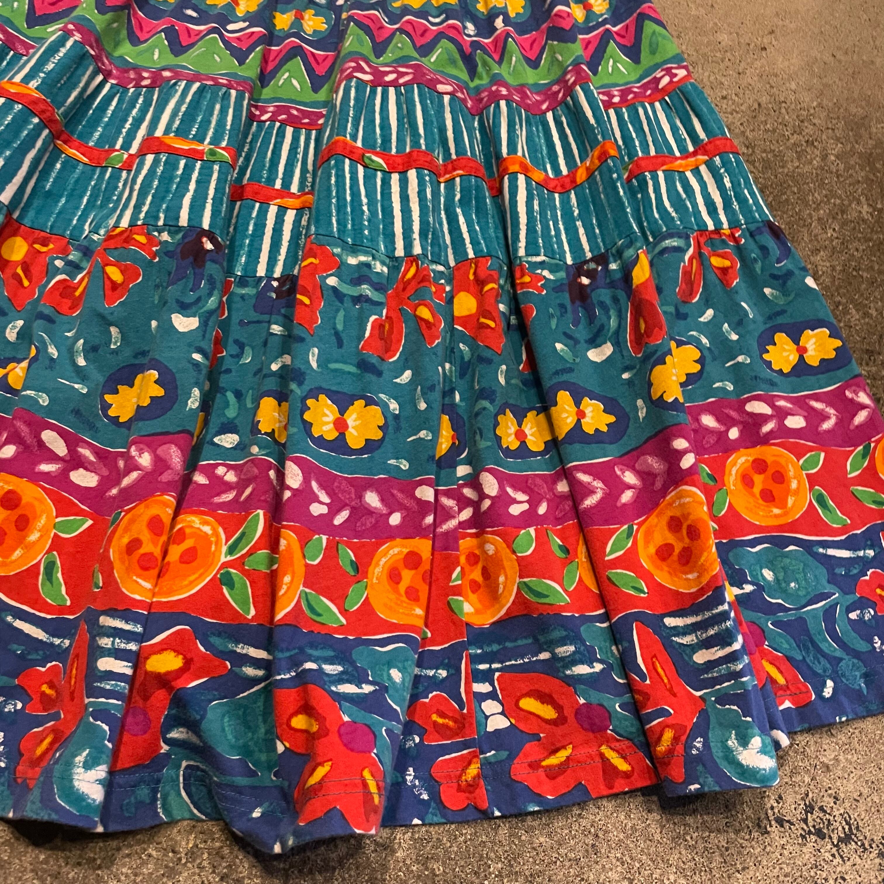 絵の具で描いたようなゆるい花柄などが良いバランスでティアードになっていてボリューム感もかわいい一着です。