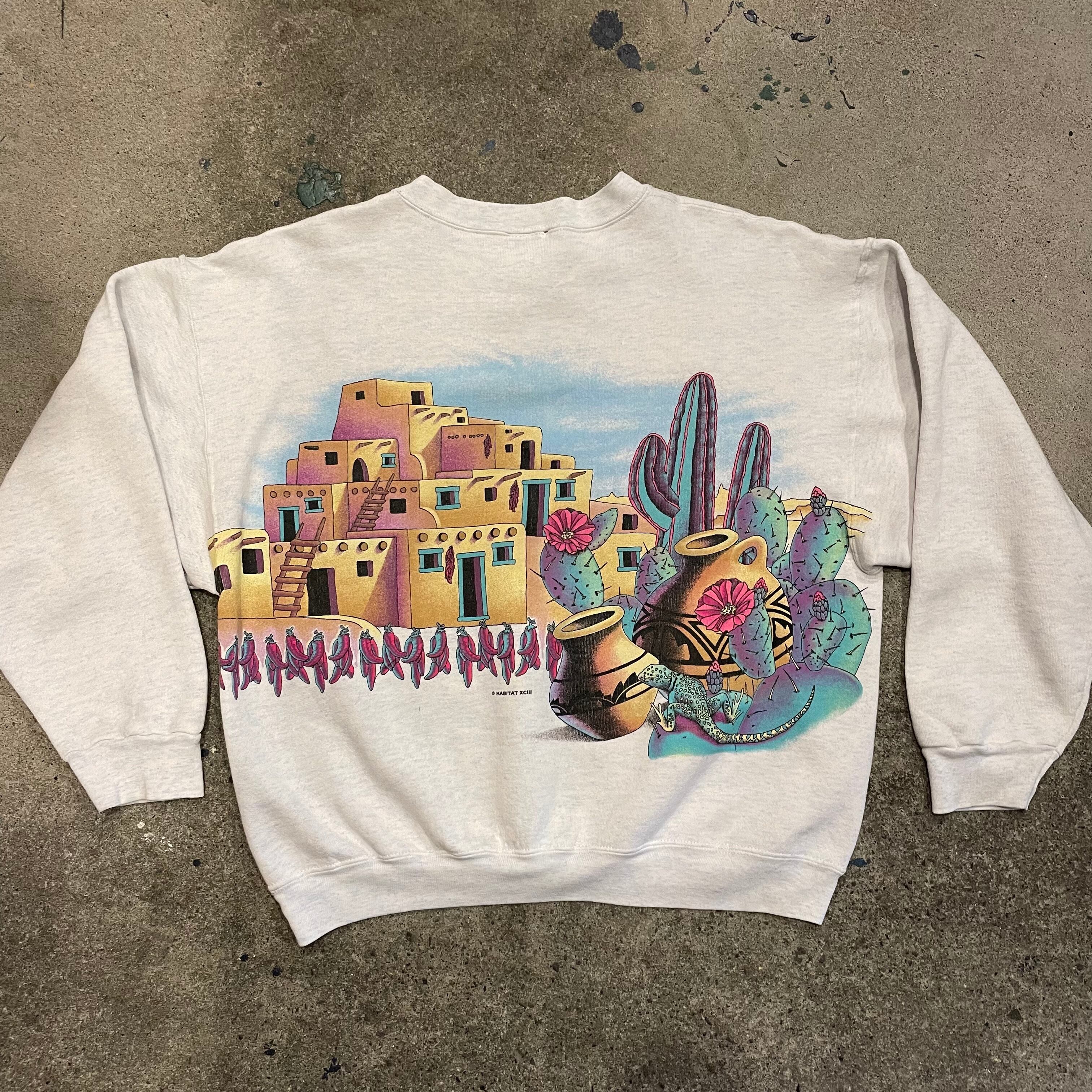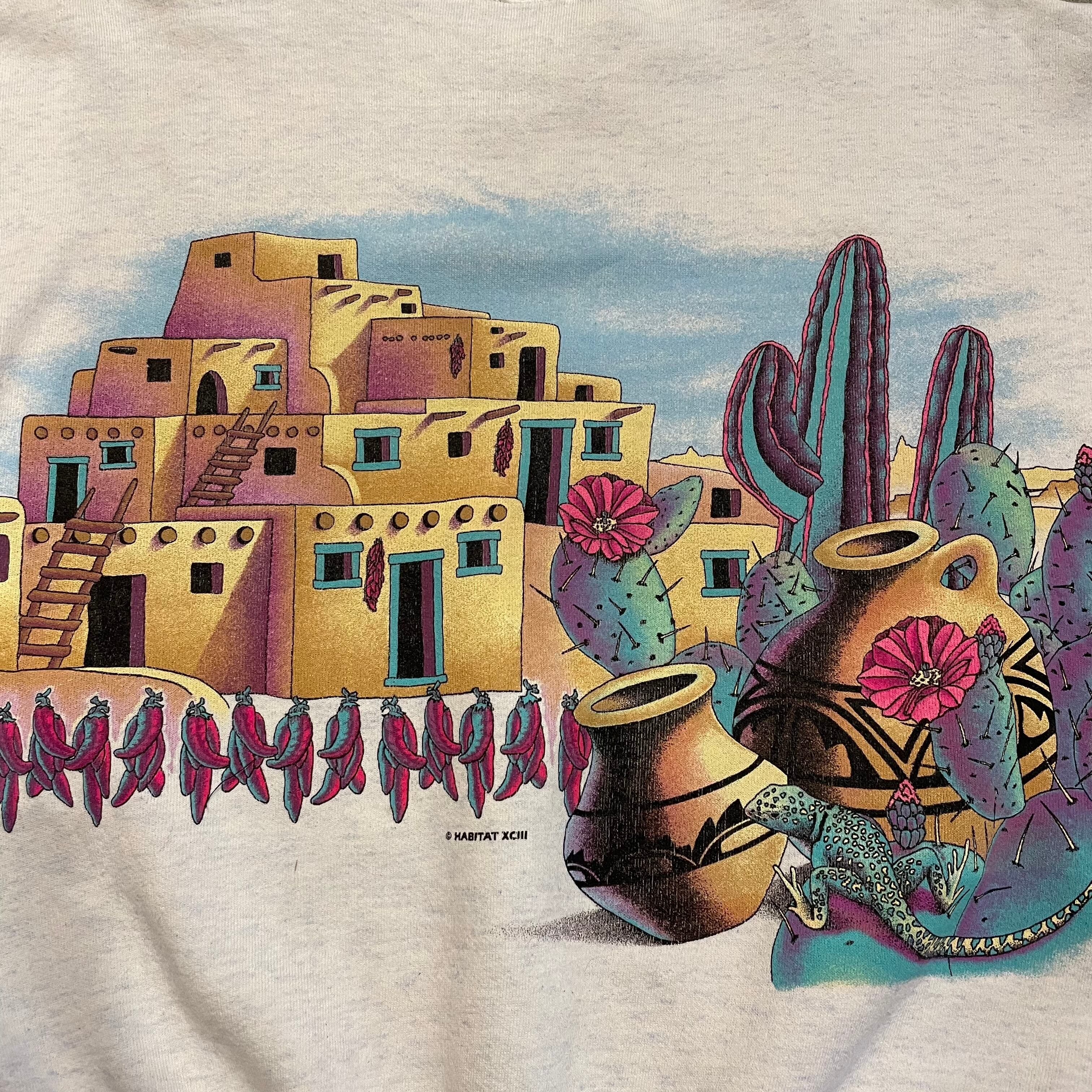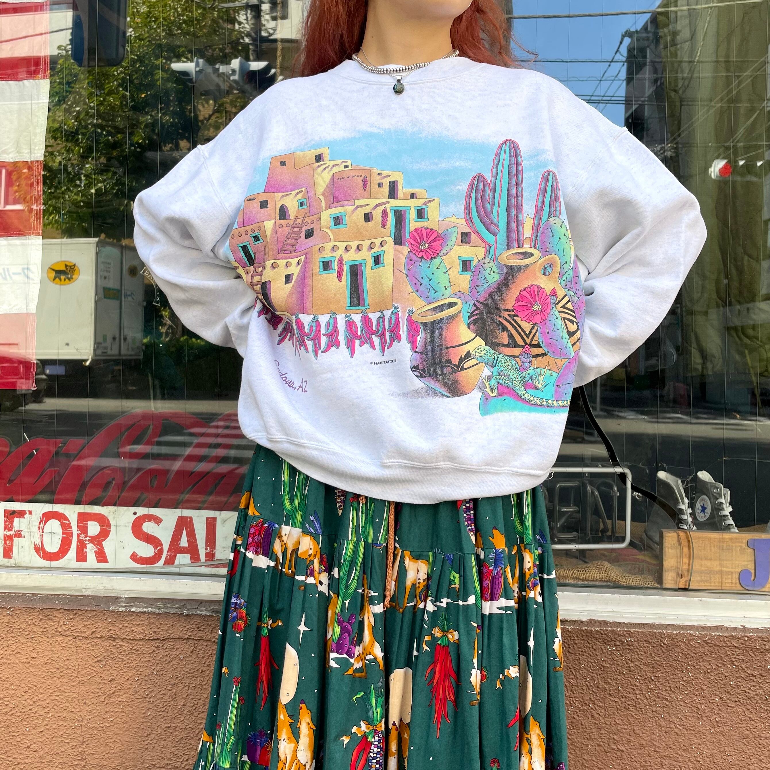 サボテンとアドビ建築、唐辛子のプリントがとてもかわいいスウェットです。