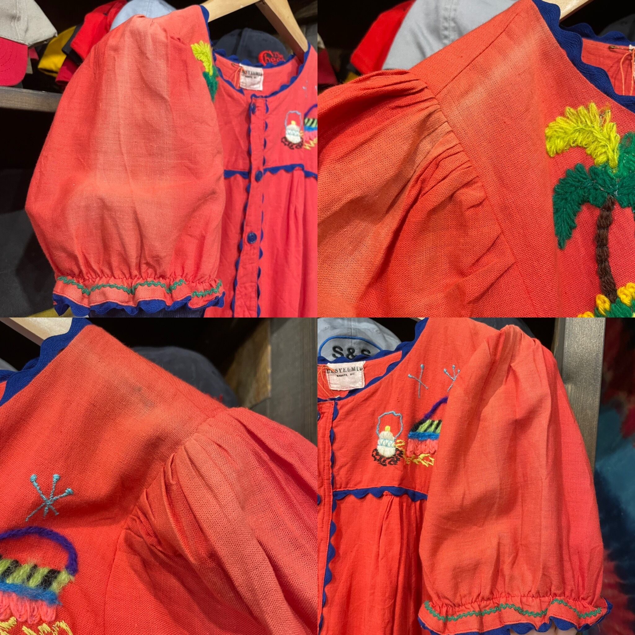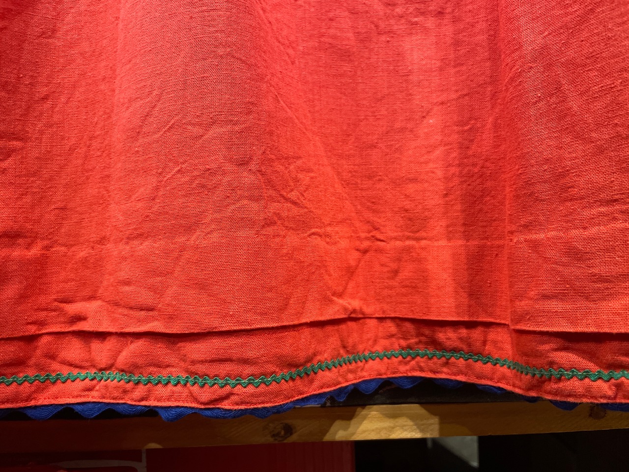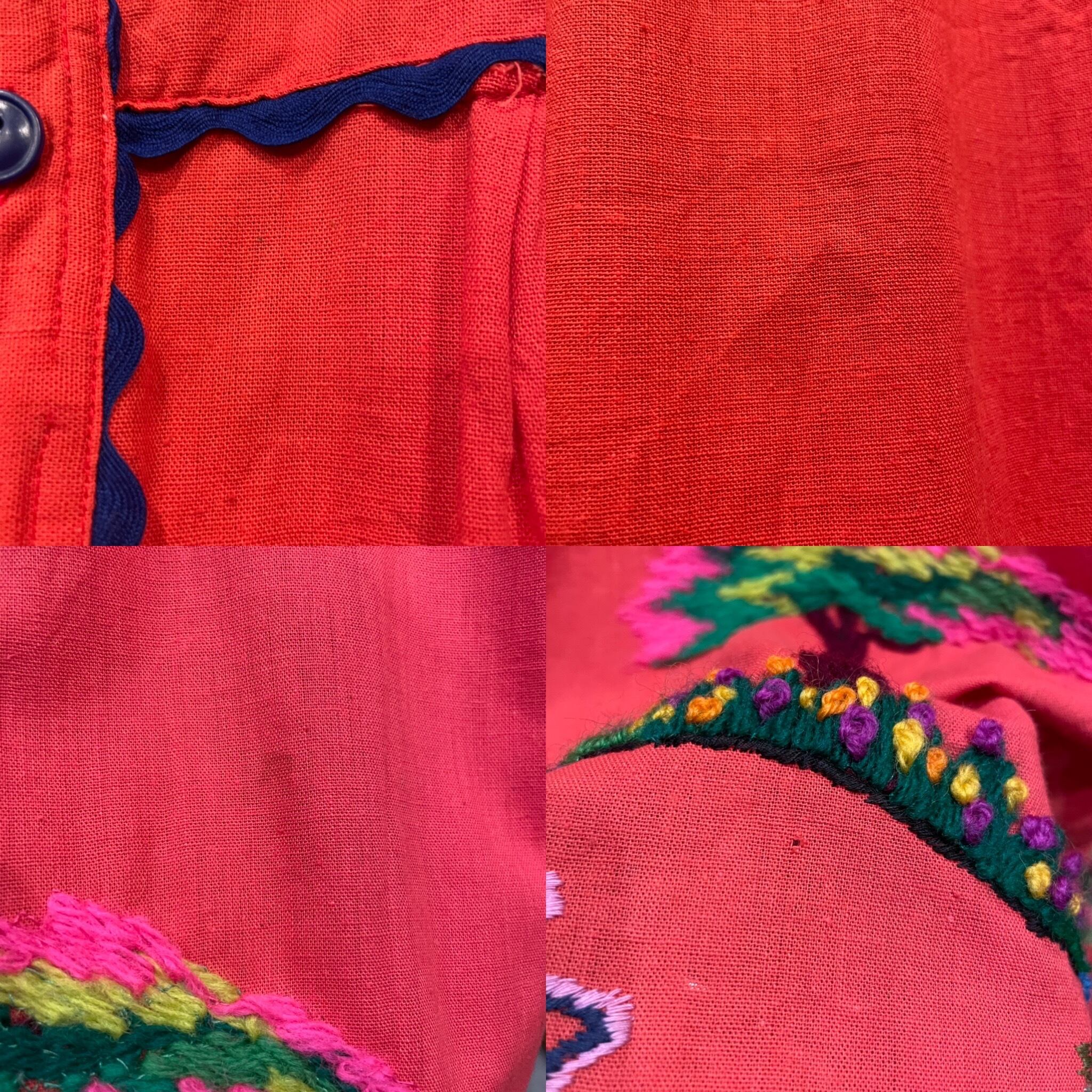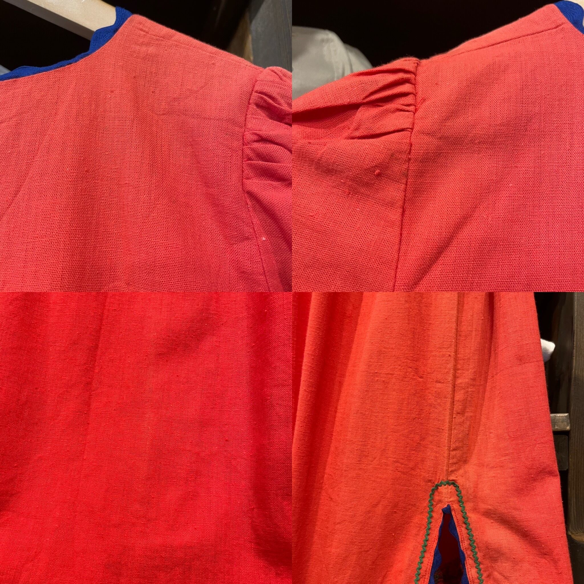 赤の色褪せたような絶妙な色合いも良い雰囲気です。毛糸をミシンでたたいた立体的な刺繍と、普通の糸で手刺繍された2種類の組み合わせで裾と胸上のみの主張の激しくない感じも良いですね!