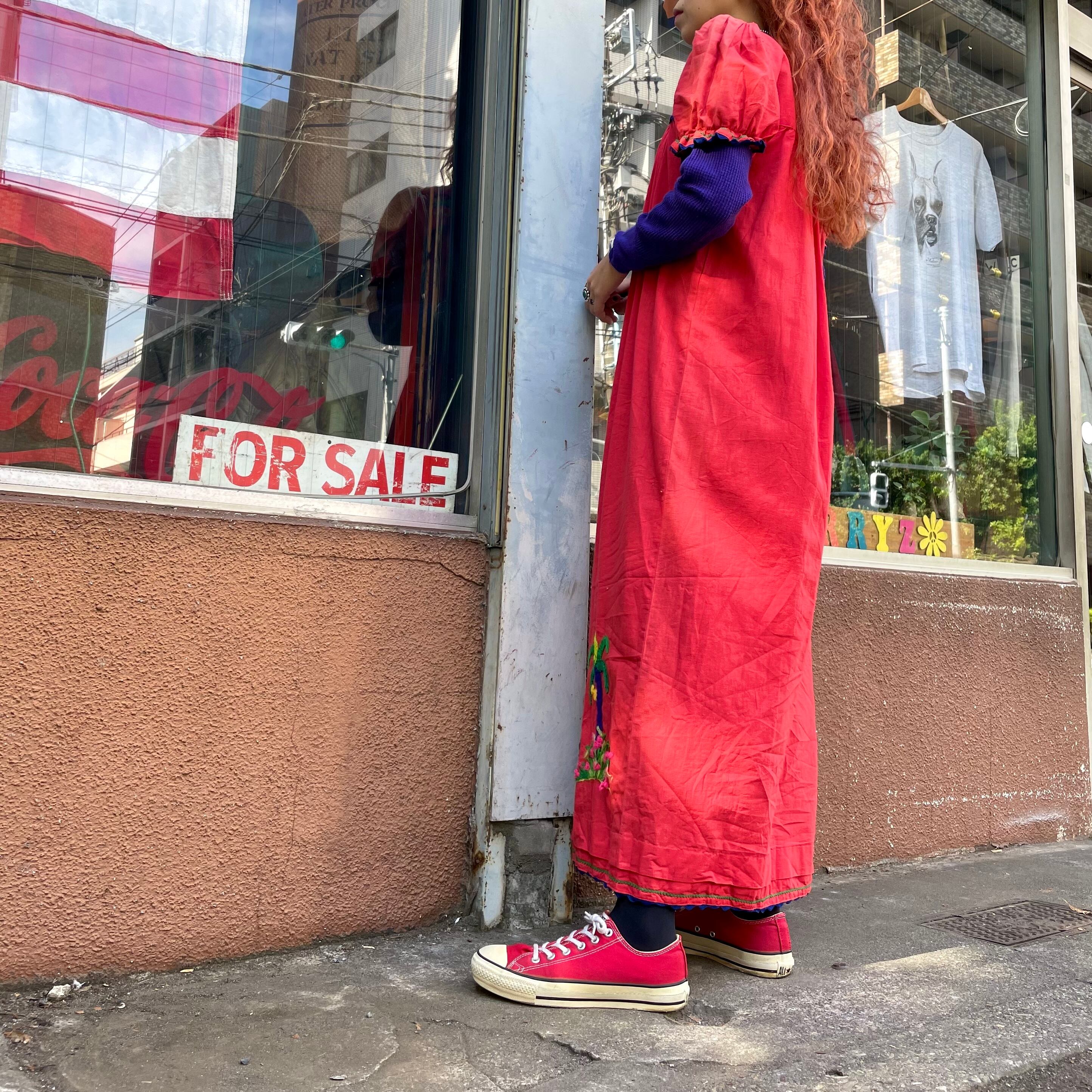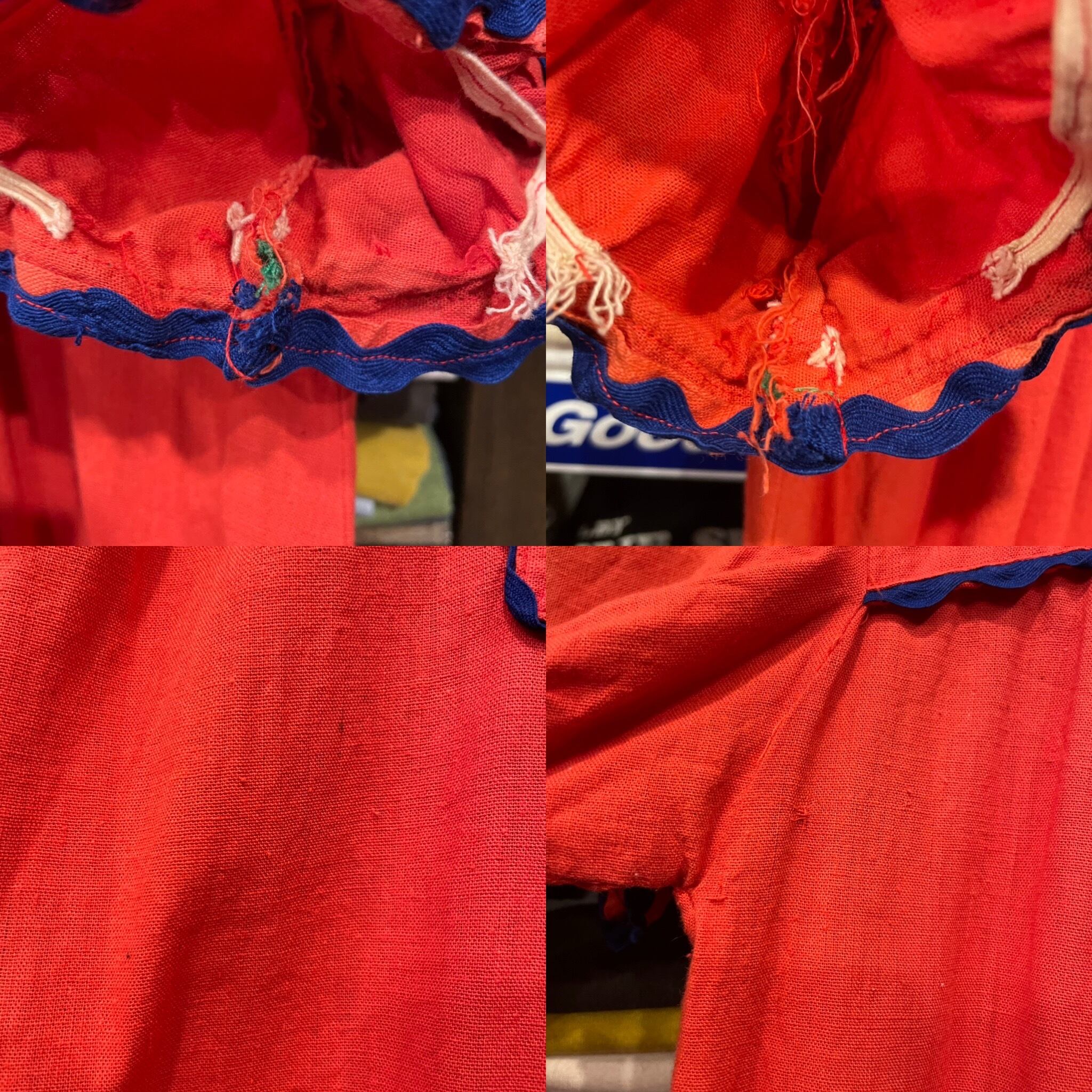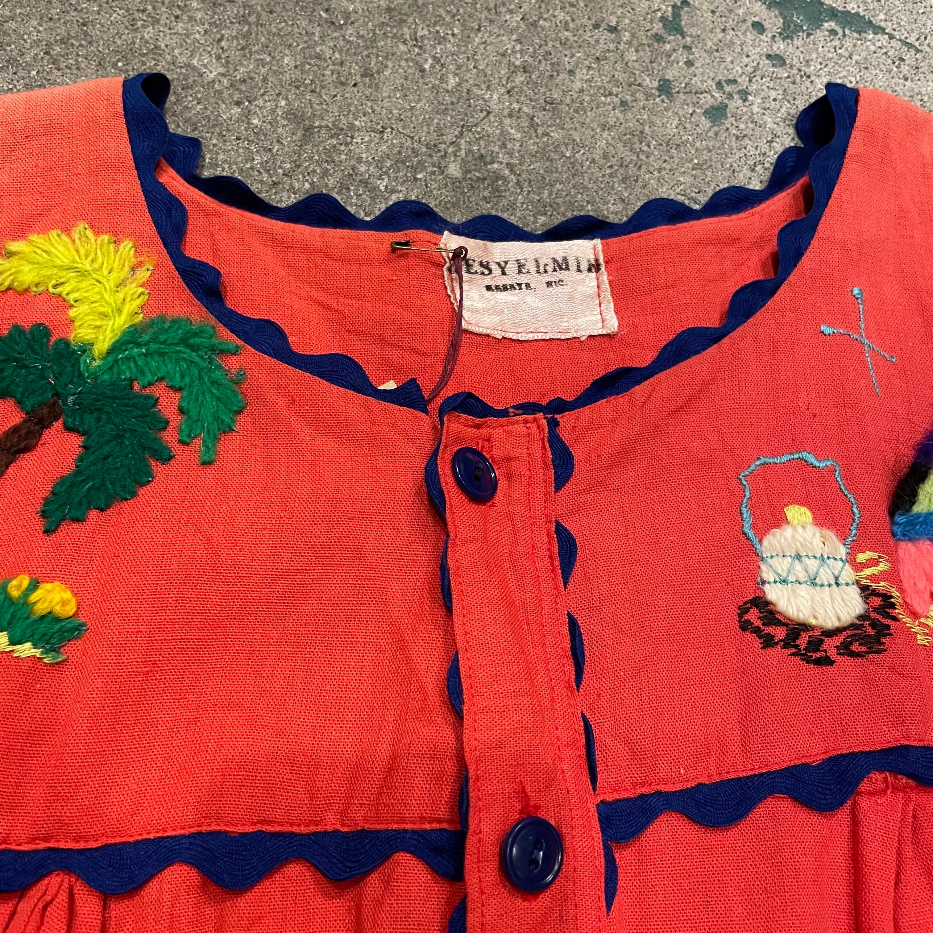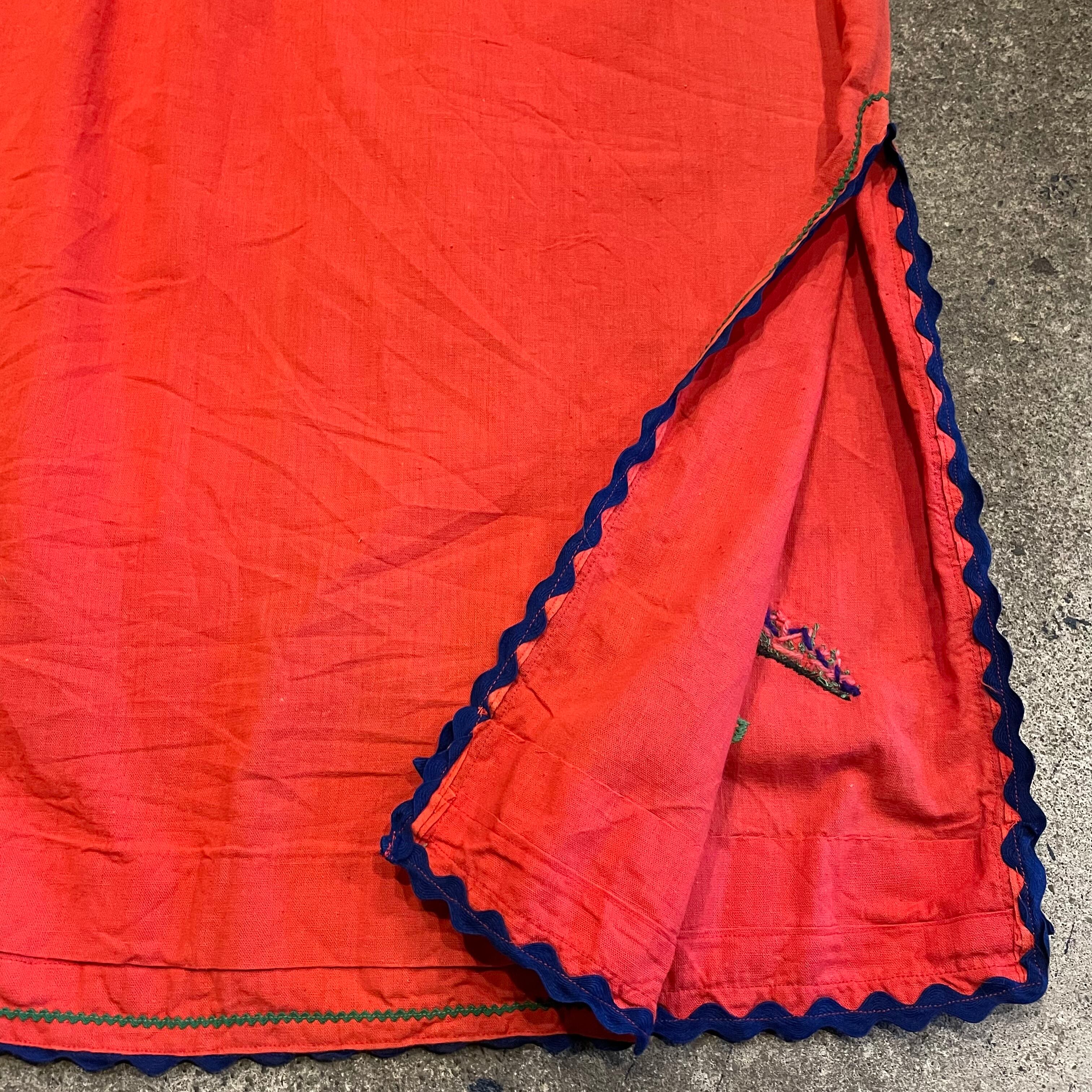 赤の色褪せたような絶妙な色合いも良い雰囲気です。毛糸をミシンでたたいた立体的な刺繍と、普通の糸で手刺繍された2種類の組み合わせで裾と胸上のみの主張の激しくない感じも良いですね!