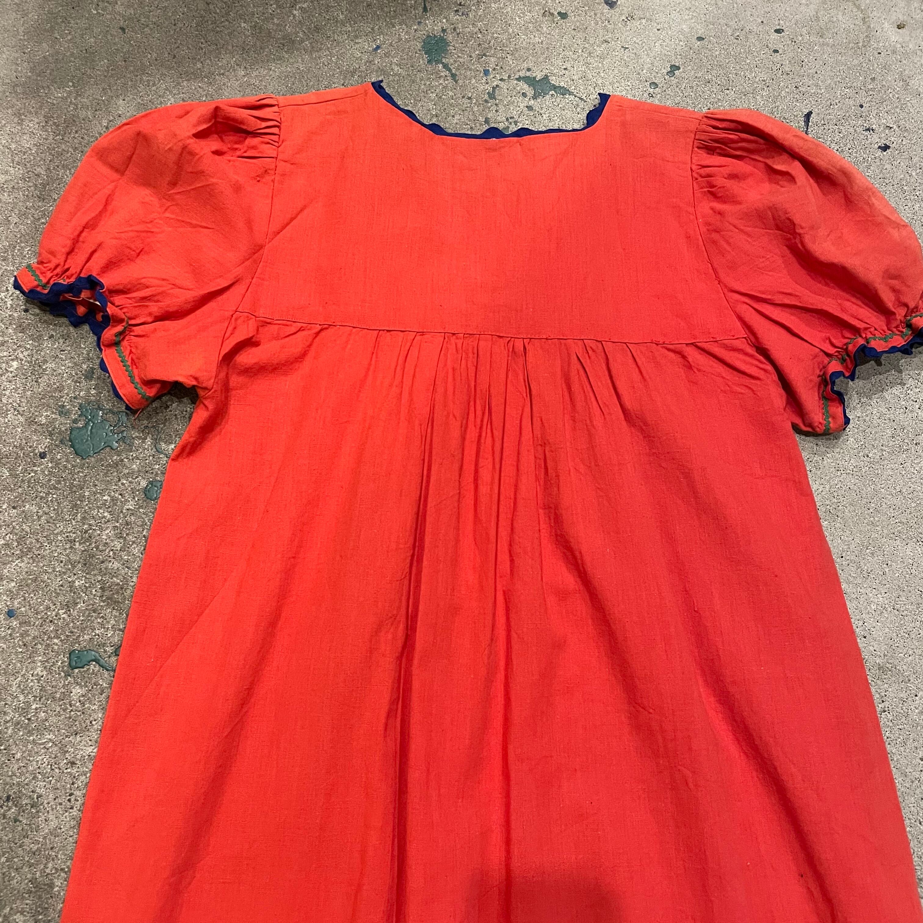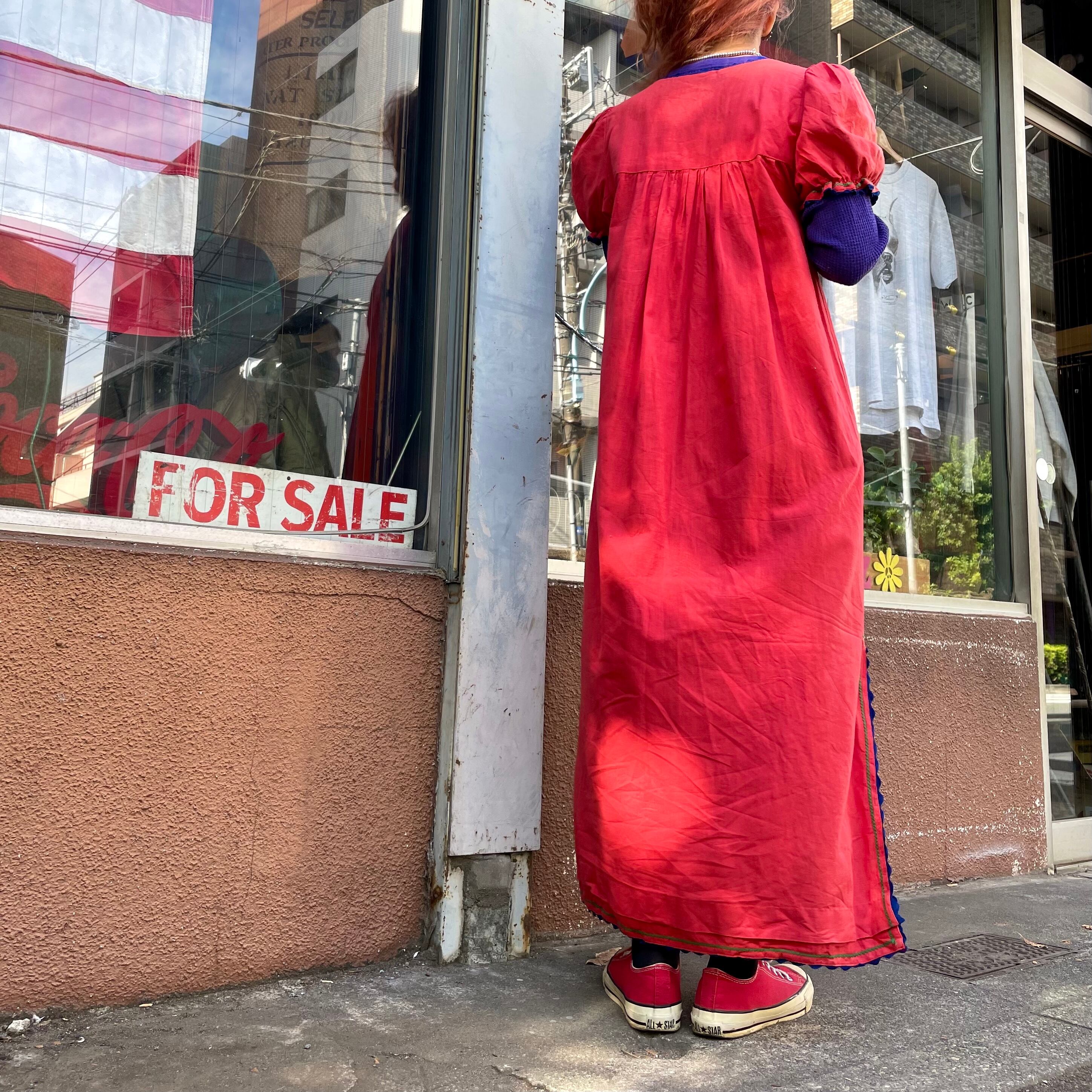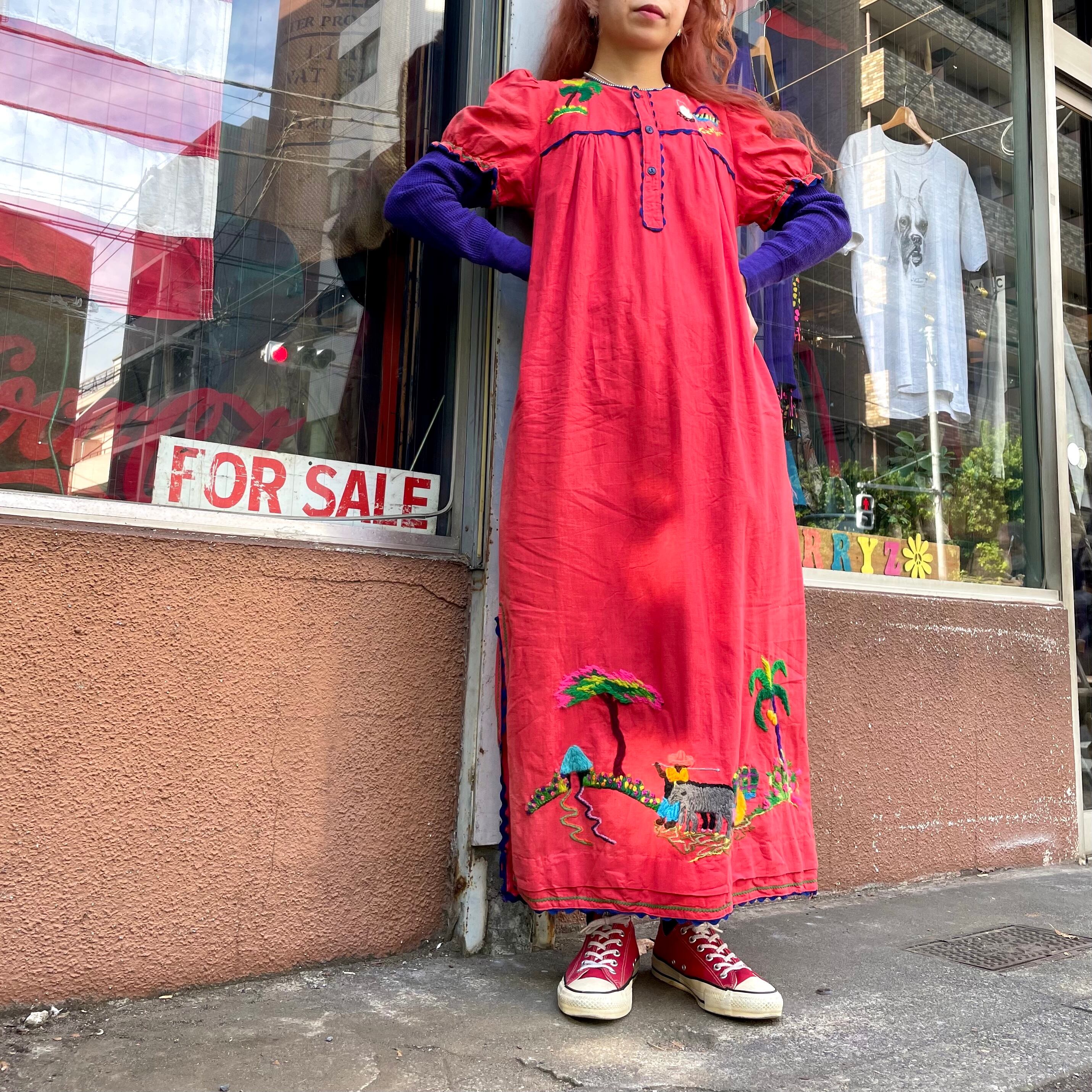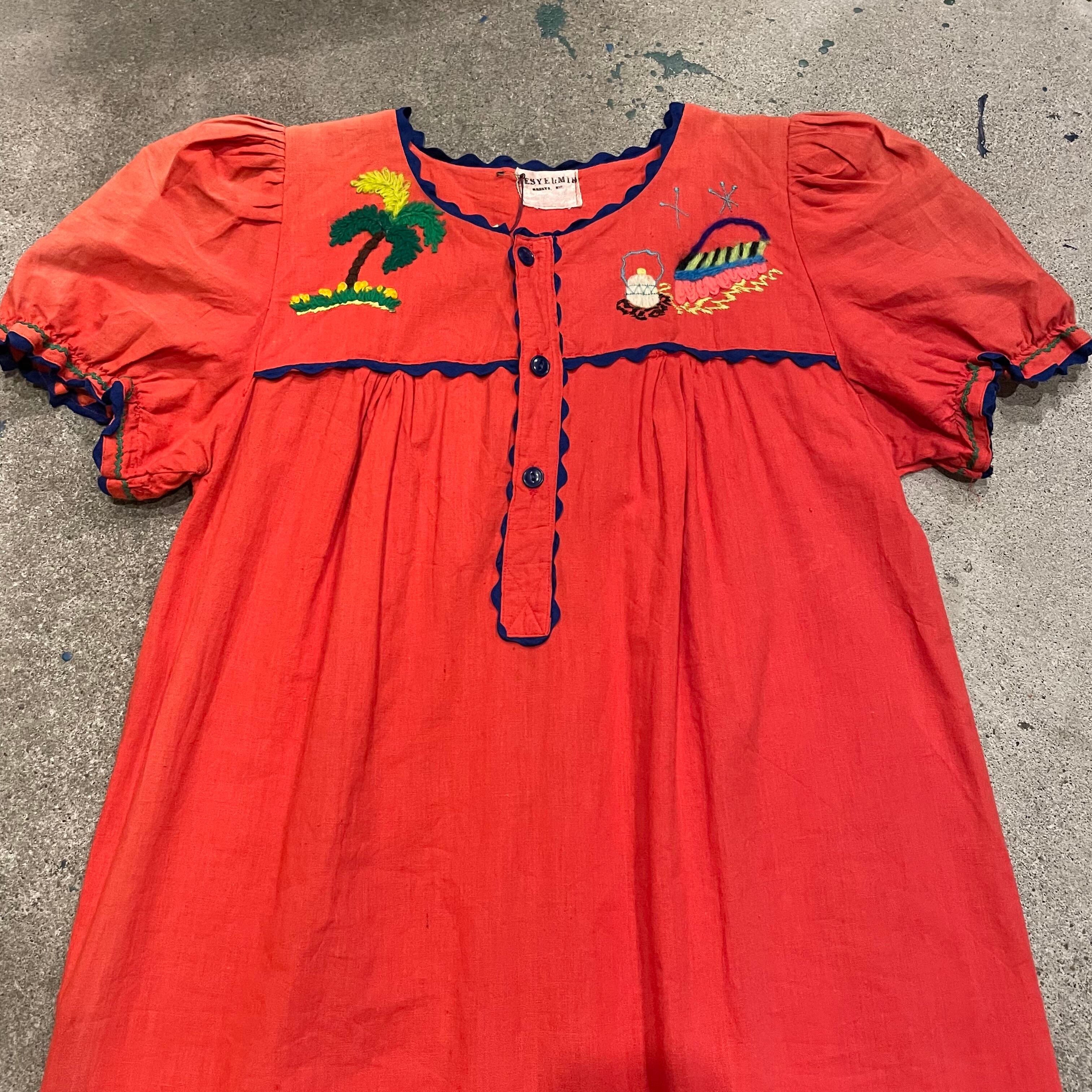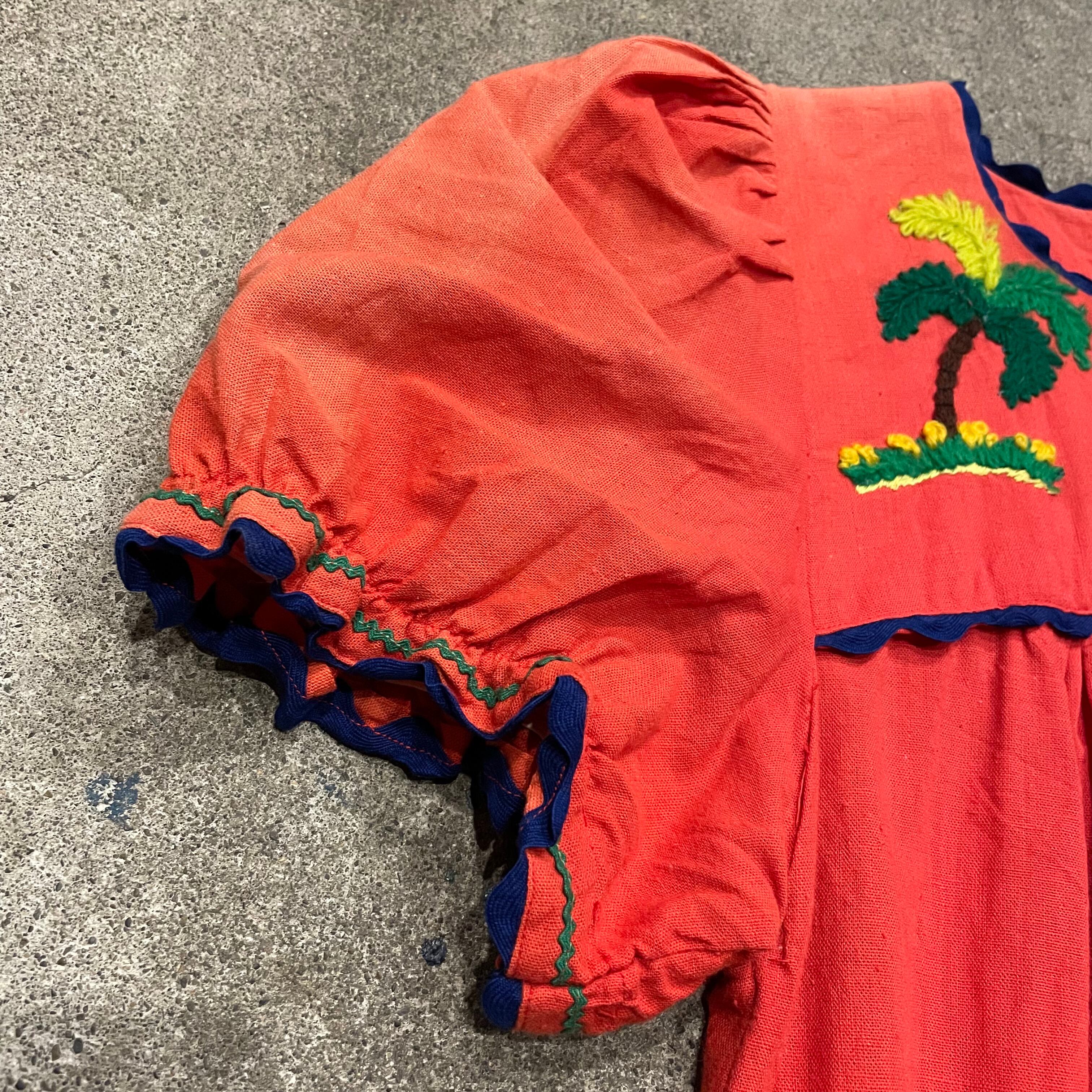 赤の色褪せたような絶妙な色合いも良い雰囲気です。毛糸をミシンでたたいた立体的な刺繍と、普通の糸で手刺繍された2種類の組み合わせで裾と胸上のみの主張の激しくない感じも良いですね!