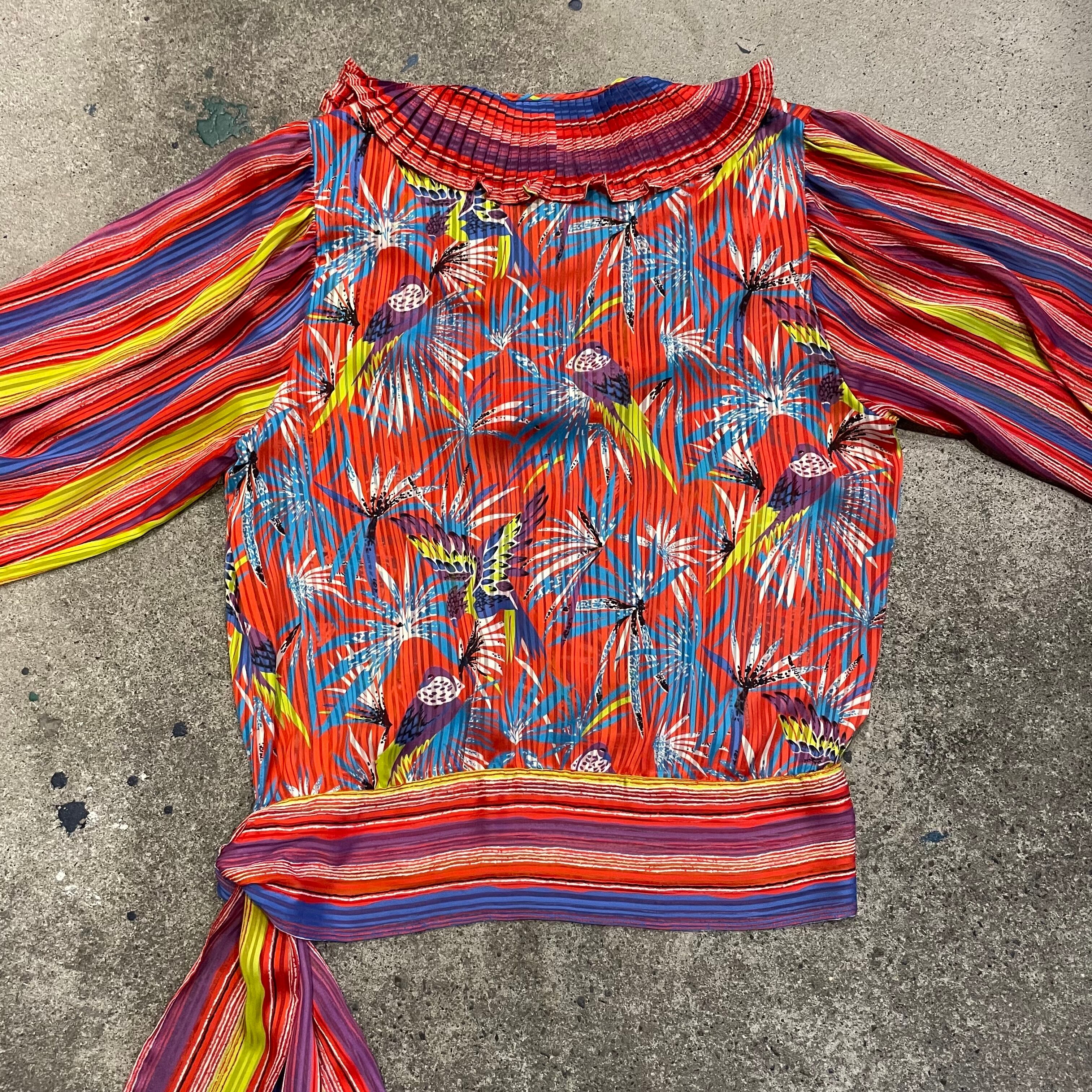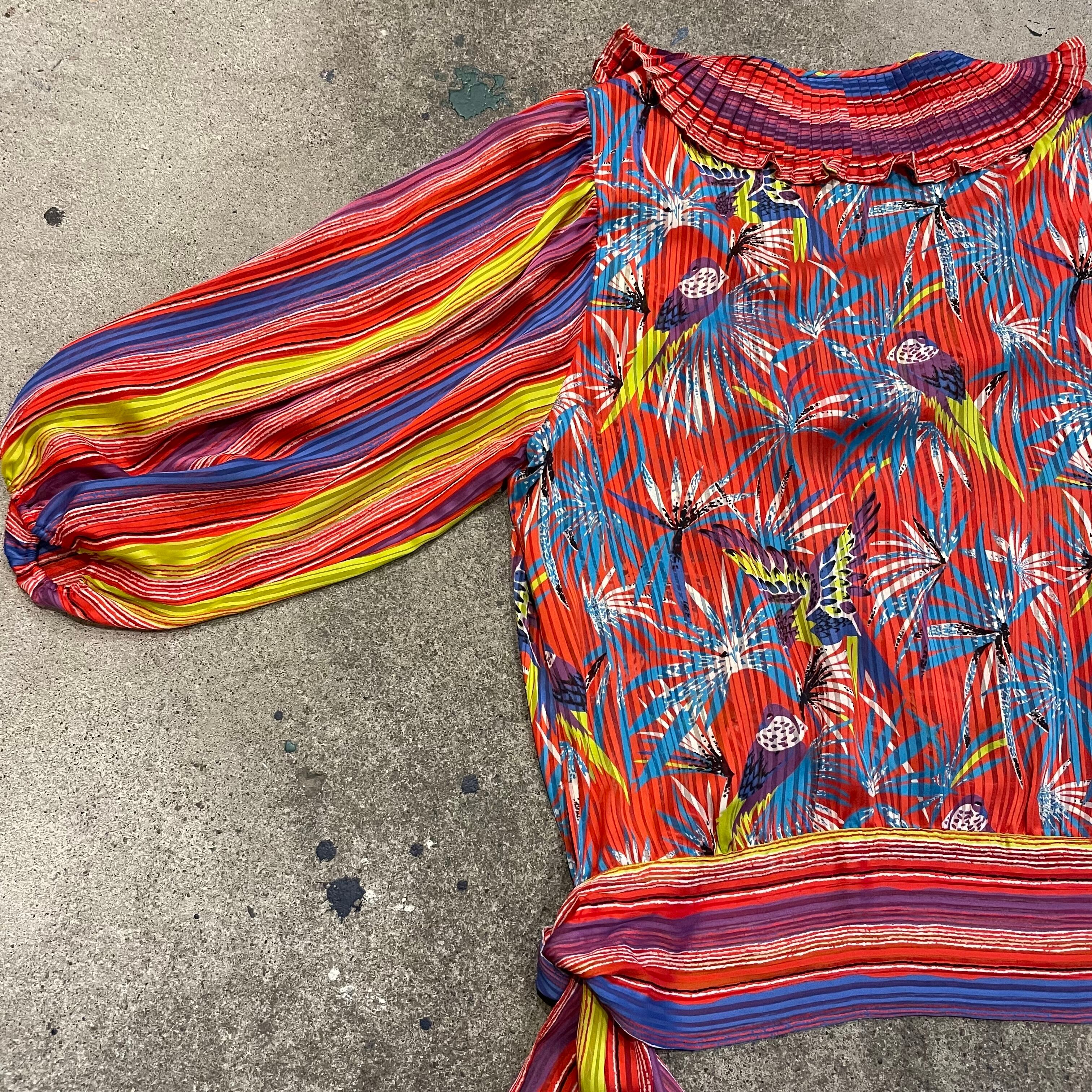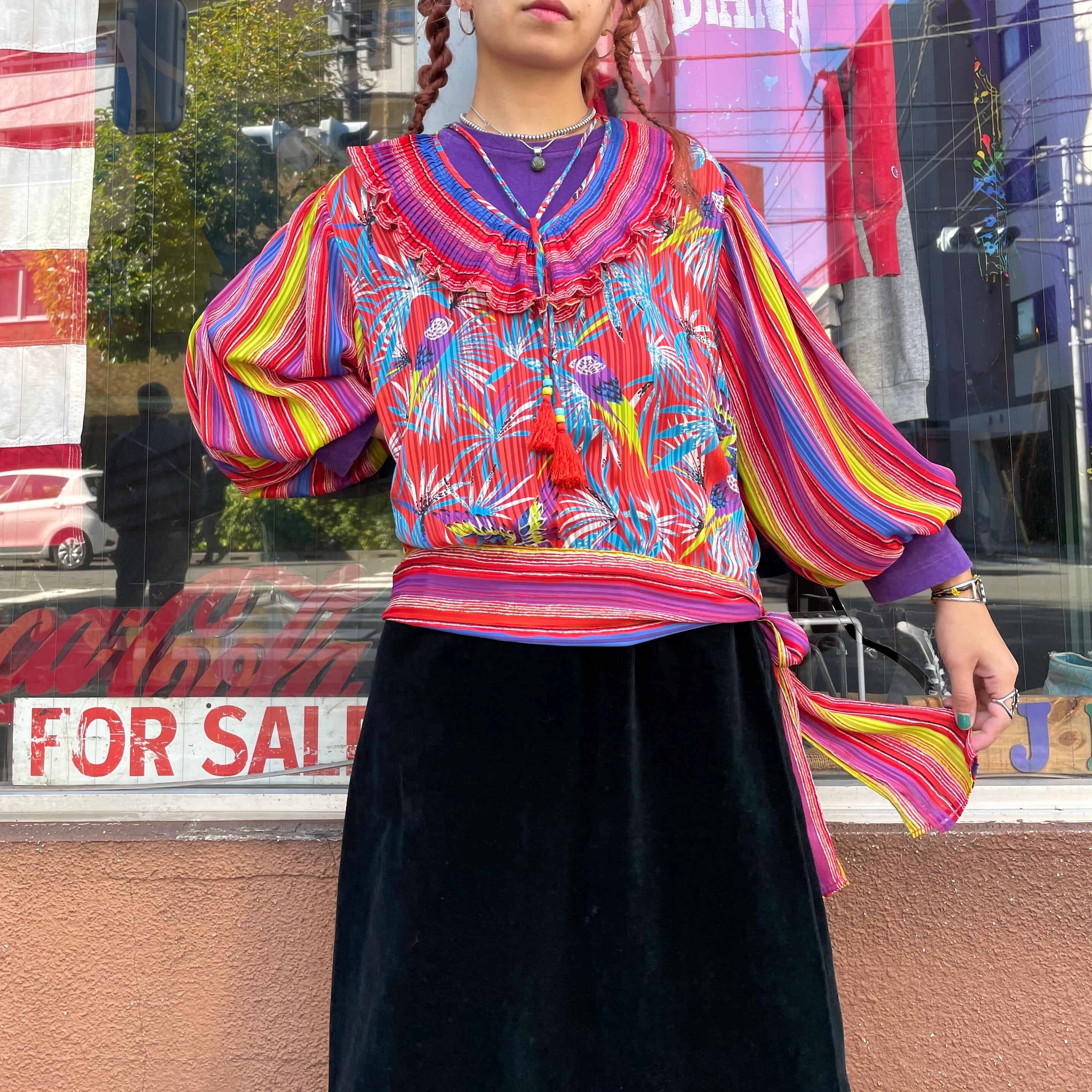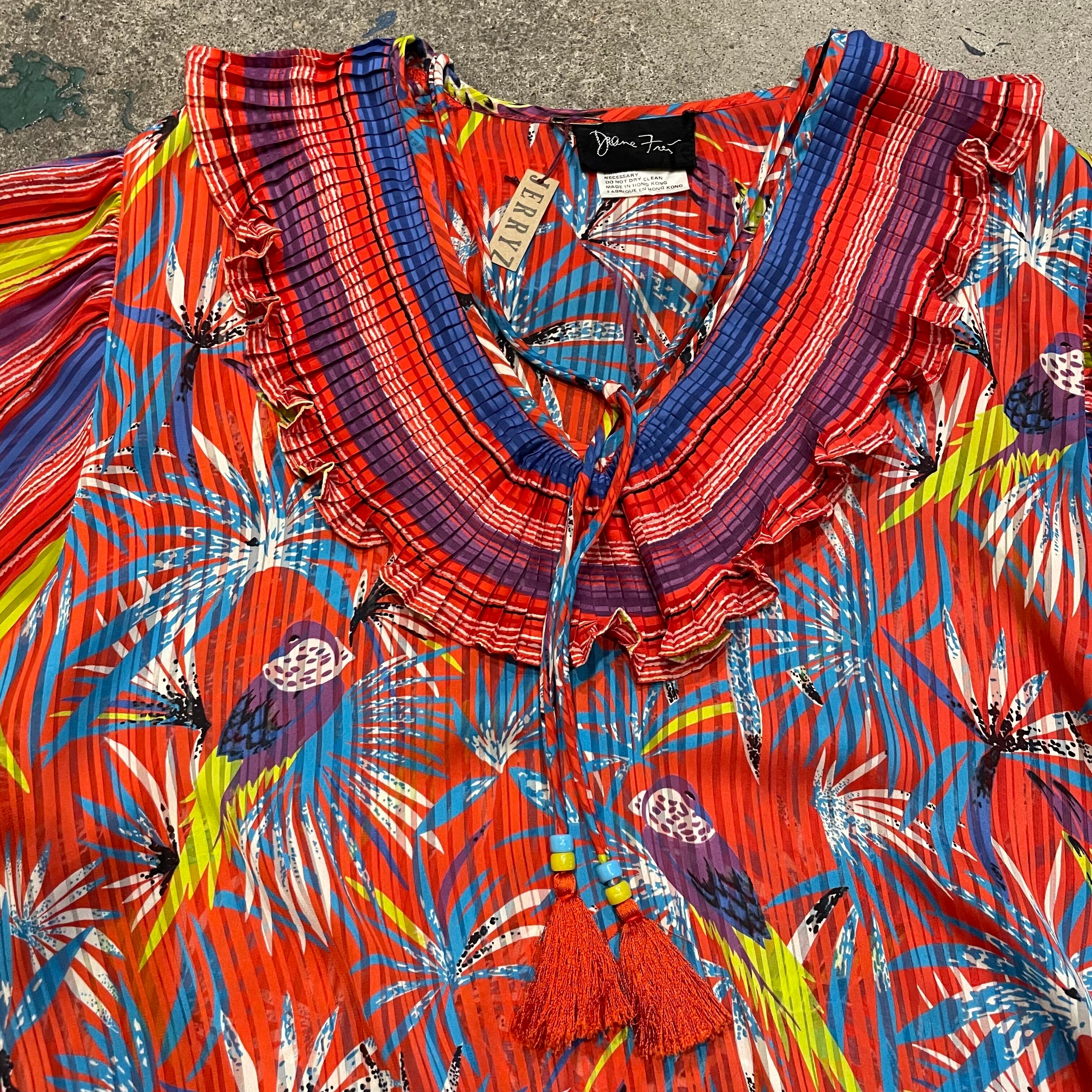派手な柄同士を合わせる柄使い、細かいプリーツ、タッセルのついた紐、シワになりにくい素材などDianeの魅力が詰まったブラウスです。