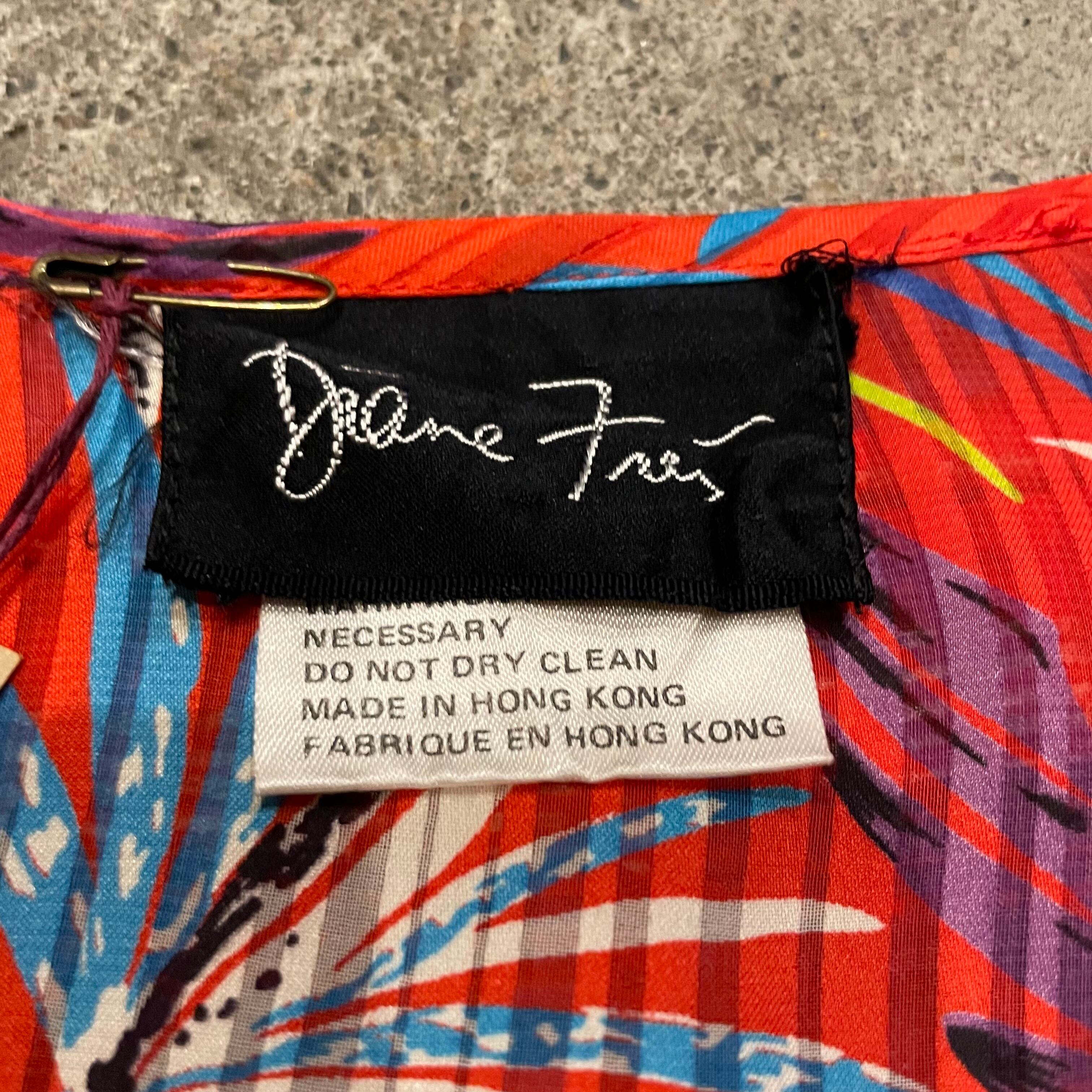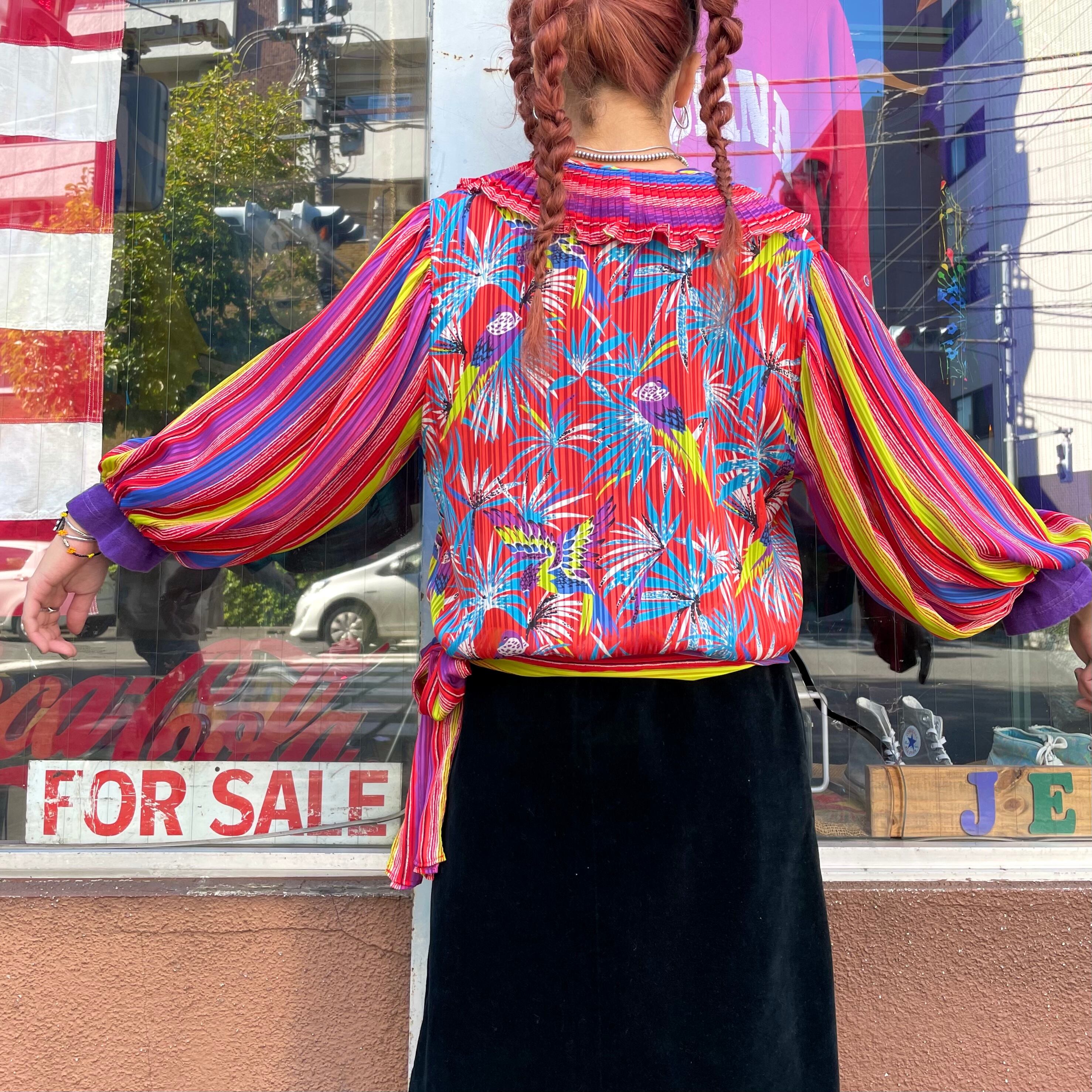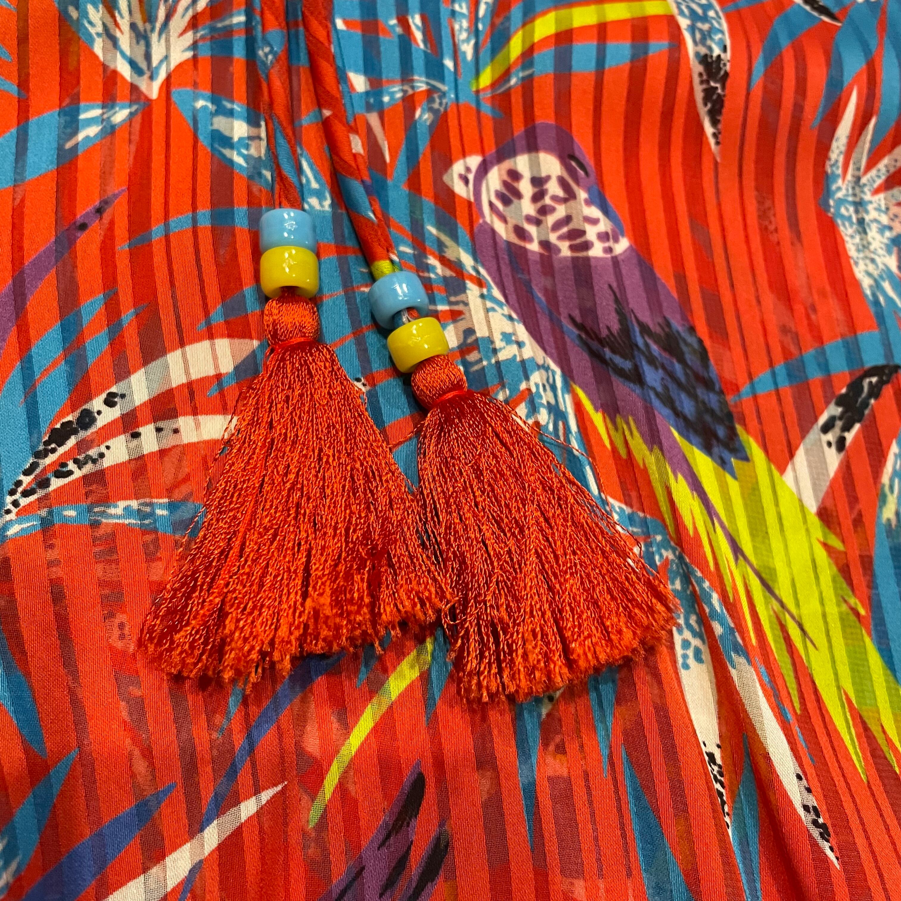 派手な柄同士を合わせる柄使い、細かいプリーツ、タッセルのついた紐、シワになりにくい素材などDianeの魅力が詰まったブラウスです。