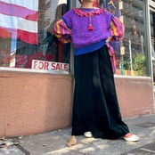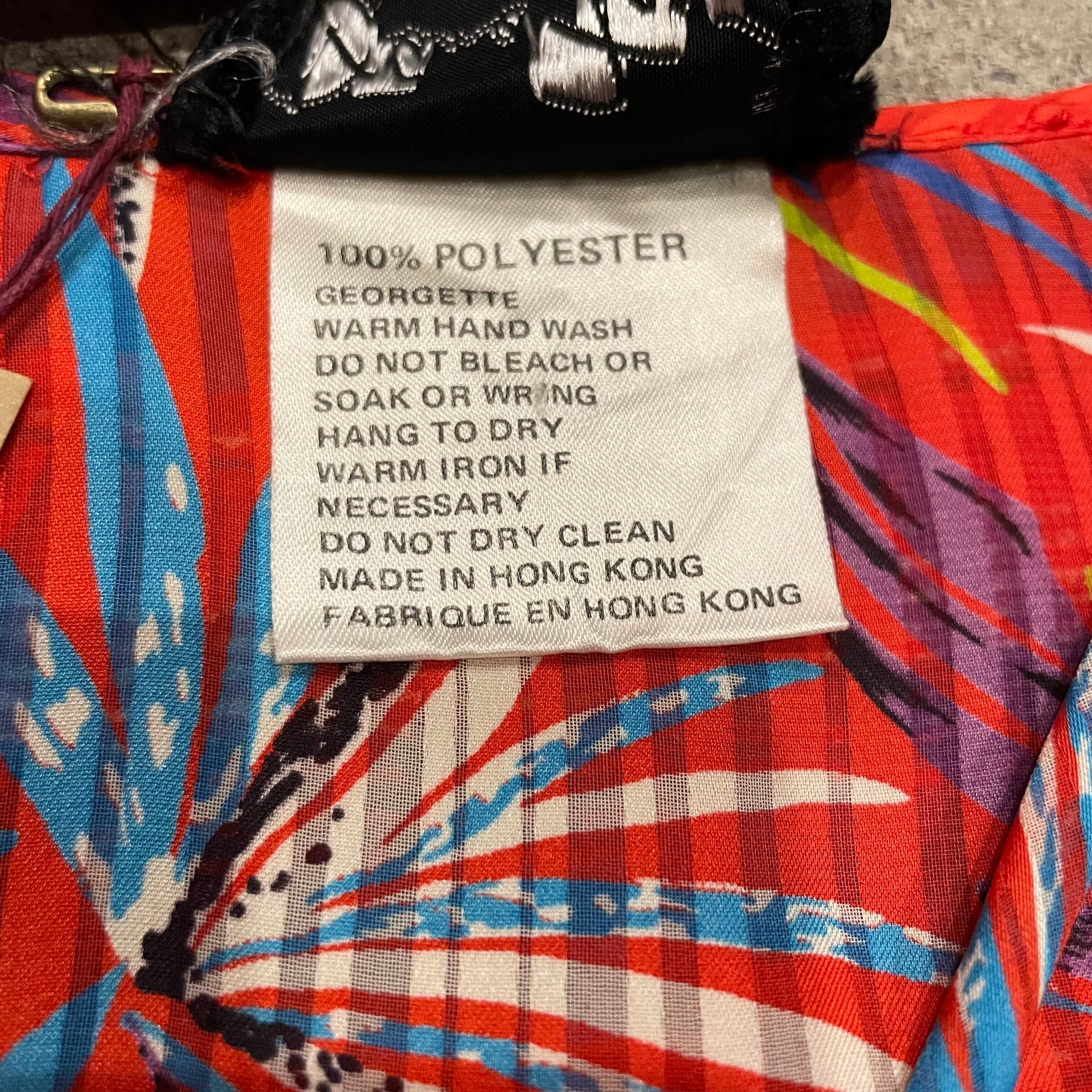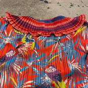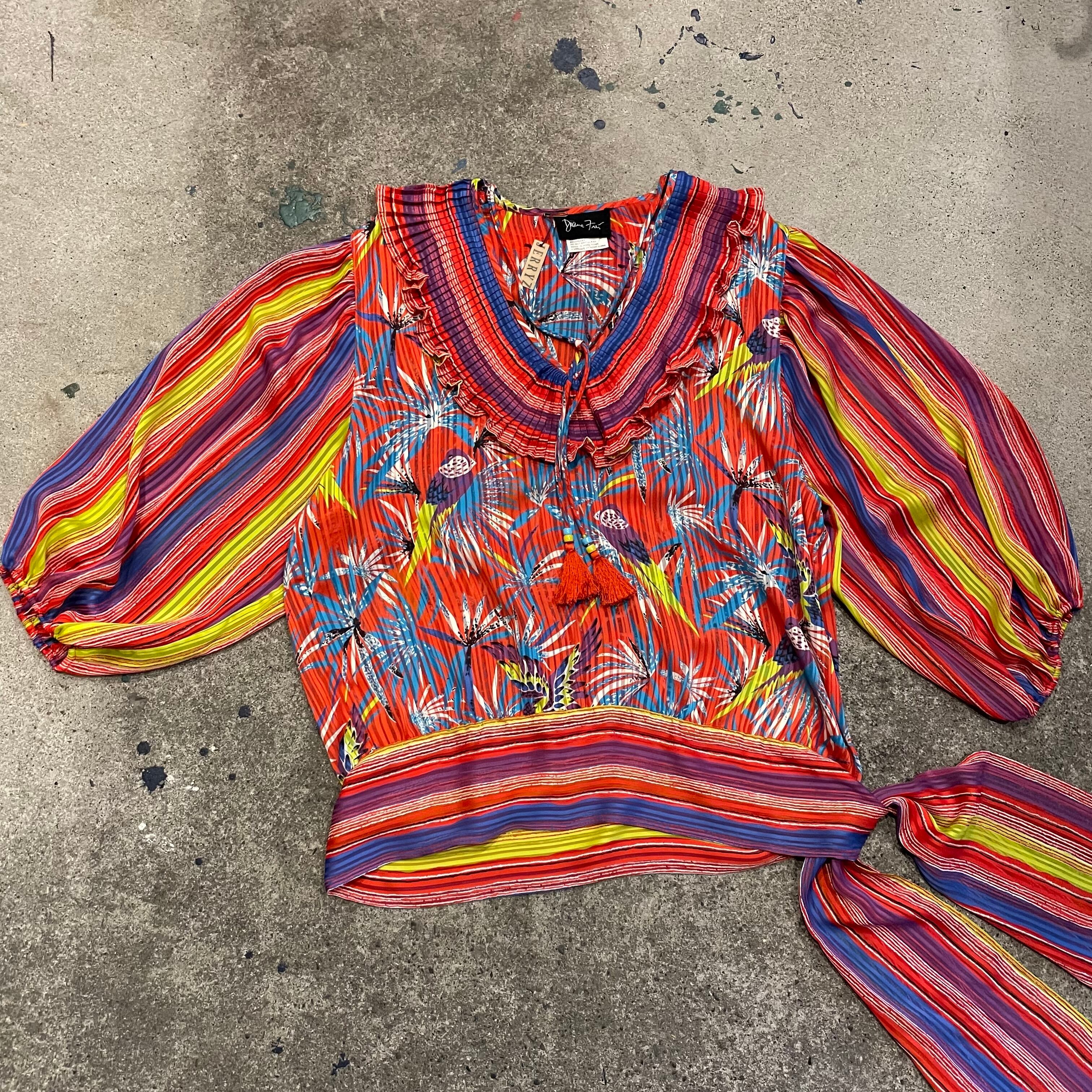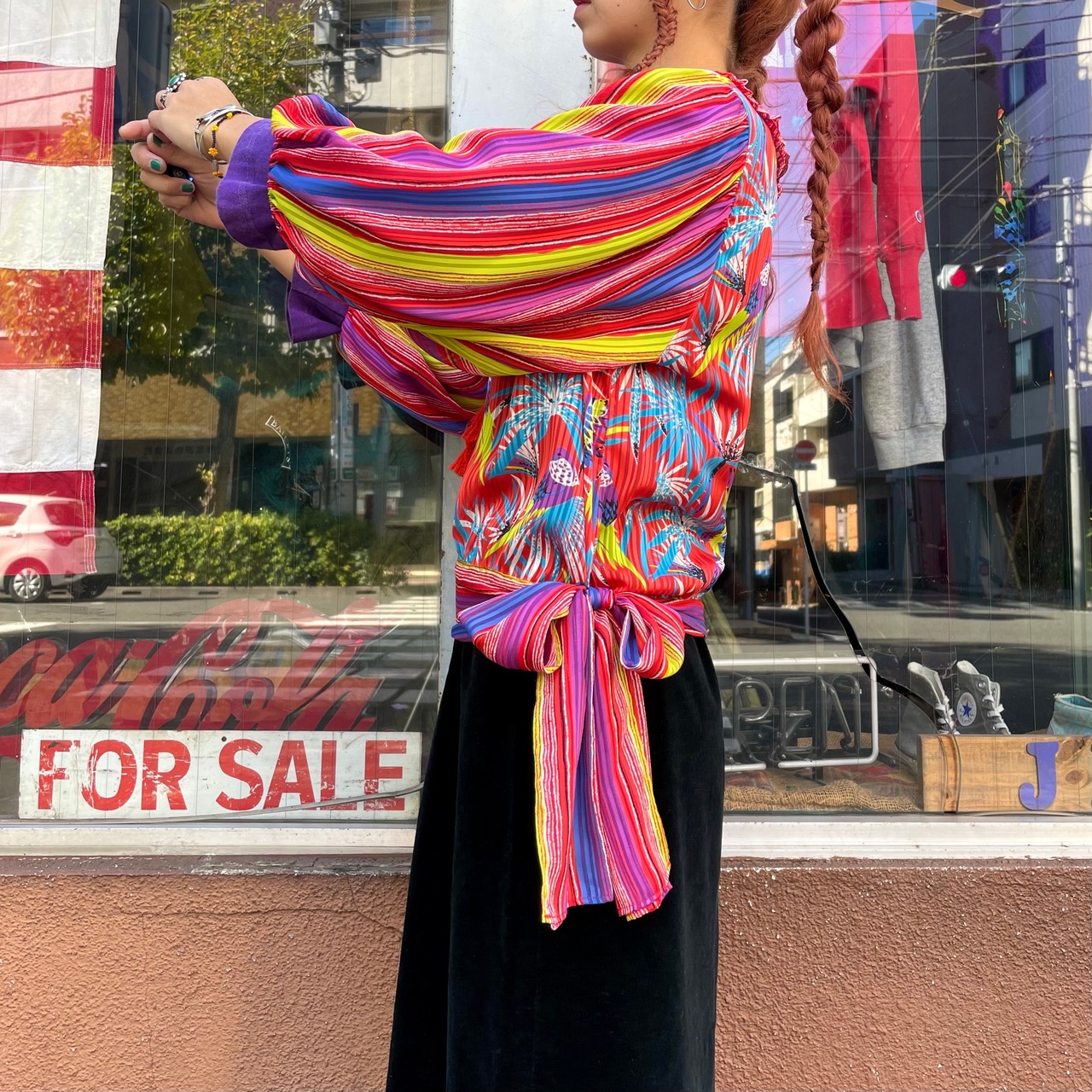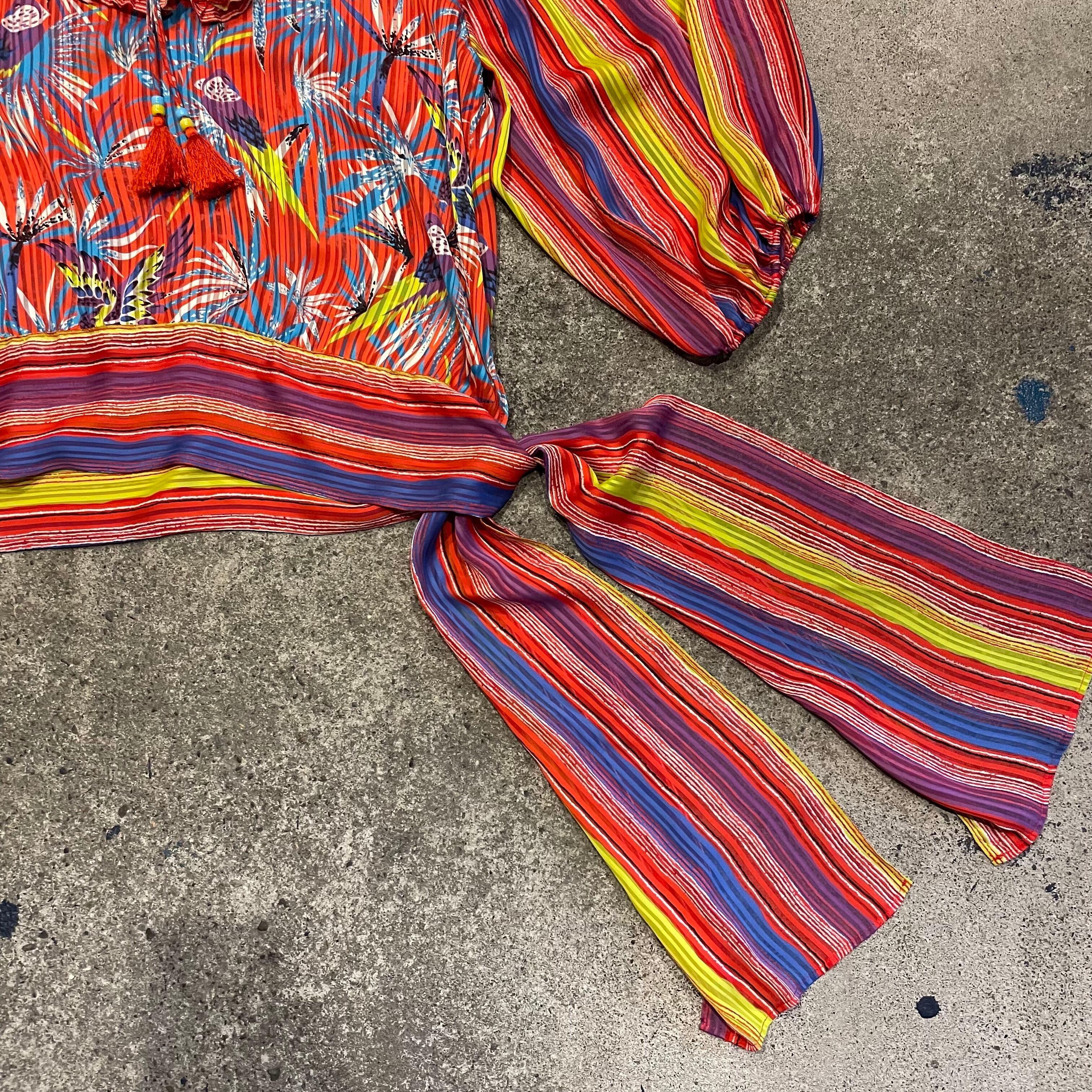 派手な柄同士を合わせる柄使い、細かいプリーツ、タッセルのついた紐、シワになりにくい素材などDianeの魅力が詰まったブラウスです。