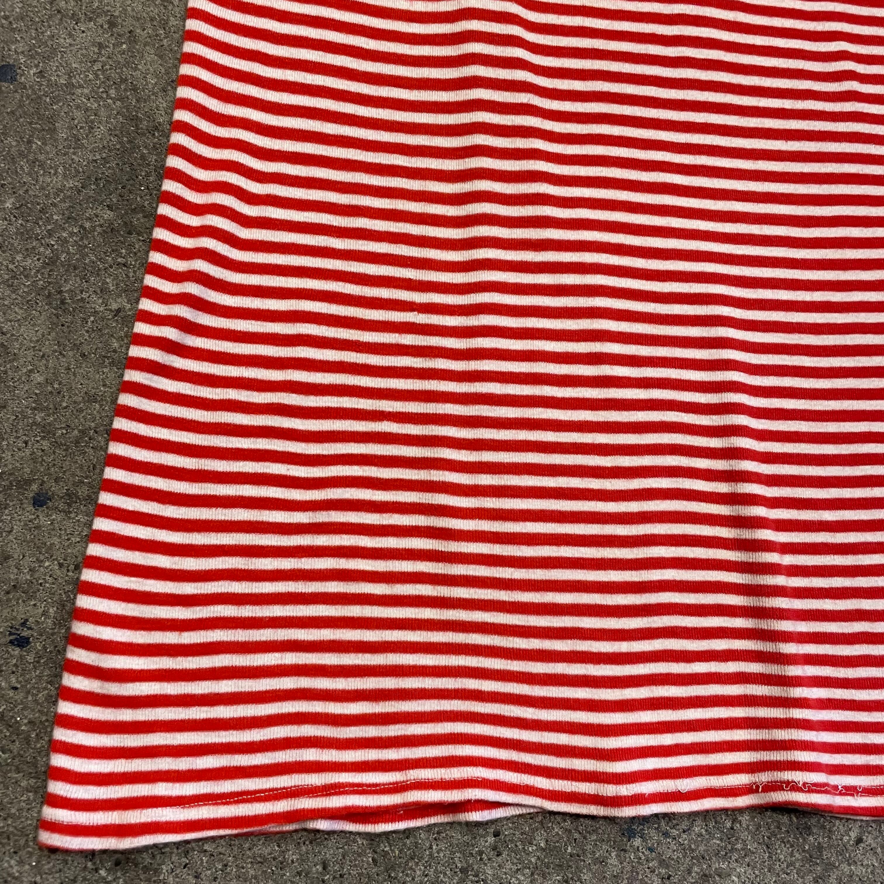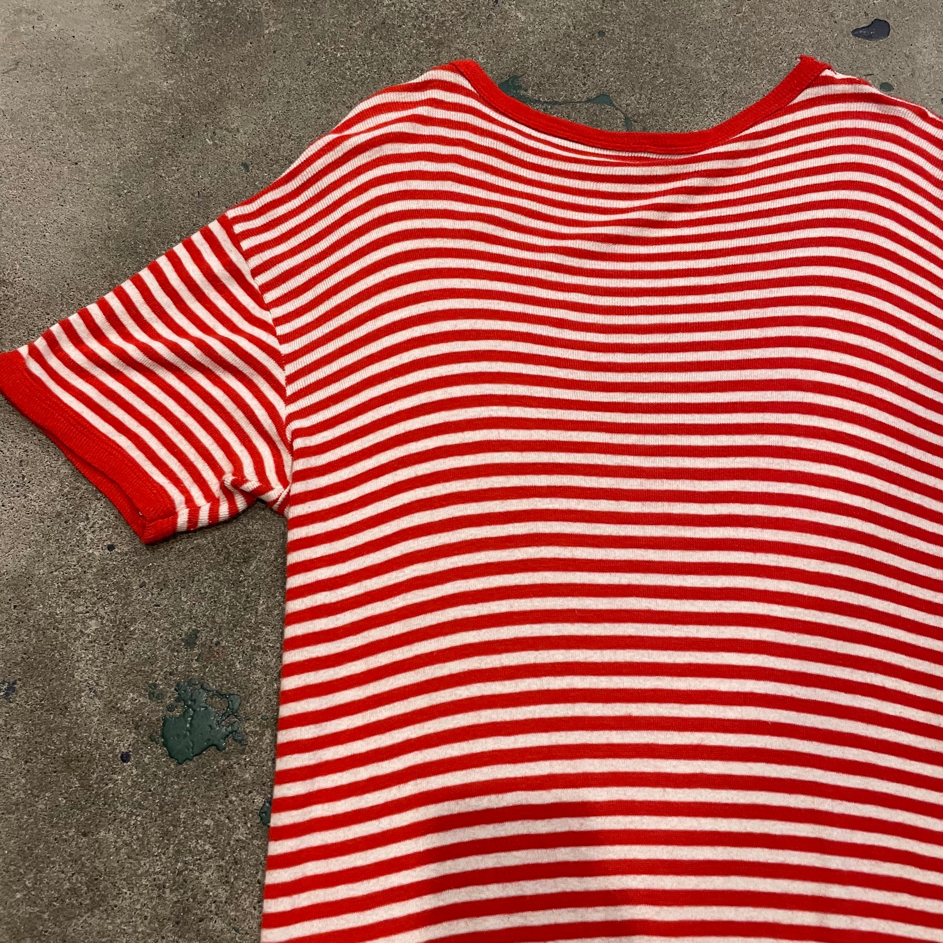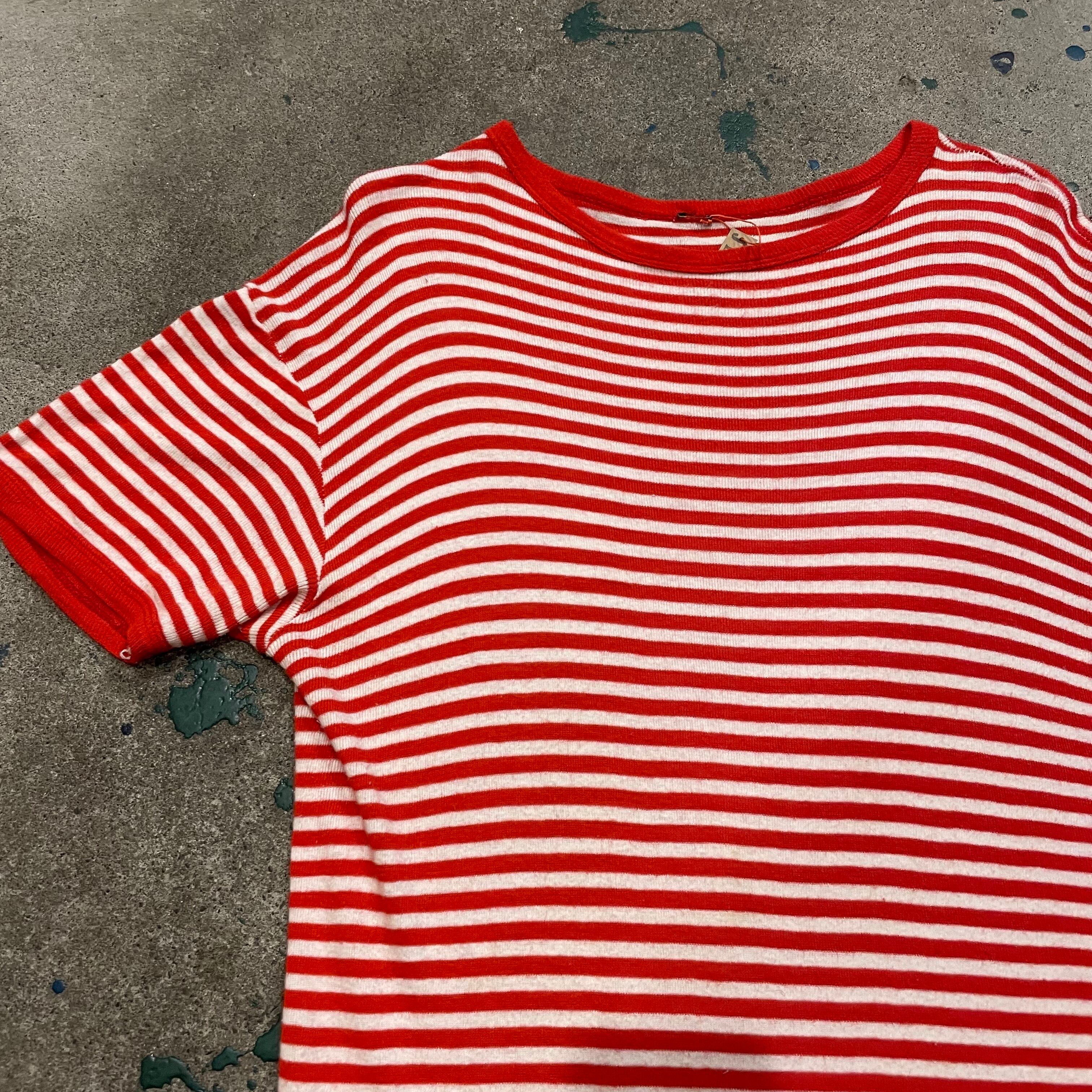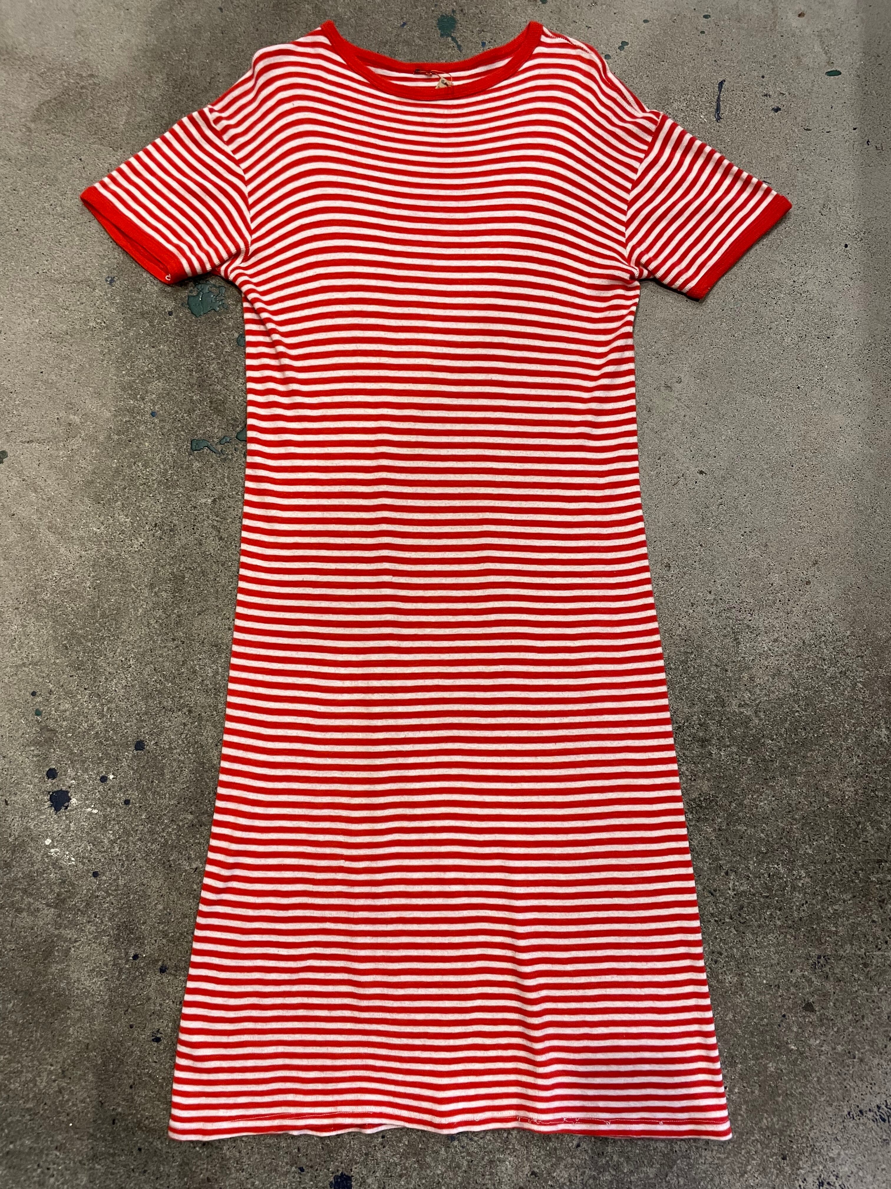 赤白の細かいボーダーがかわいいリンガーTシャツワンピースです。