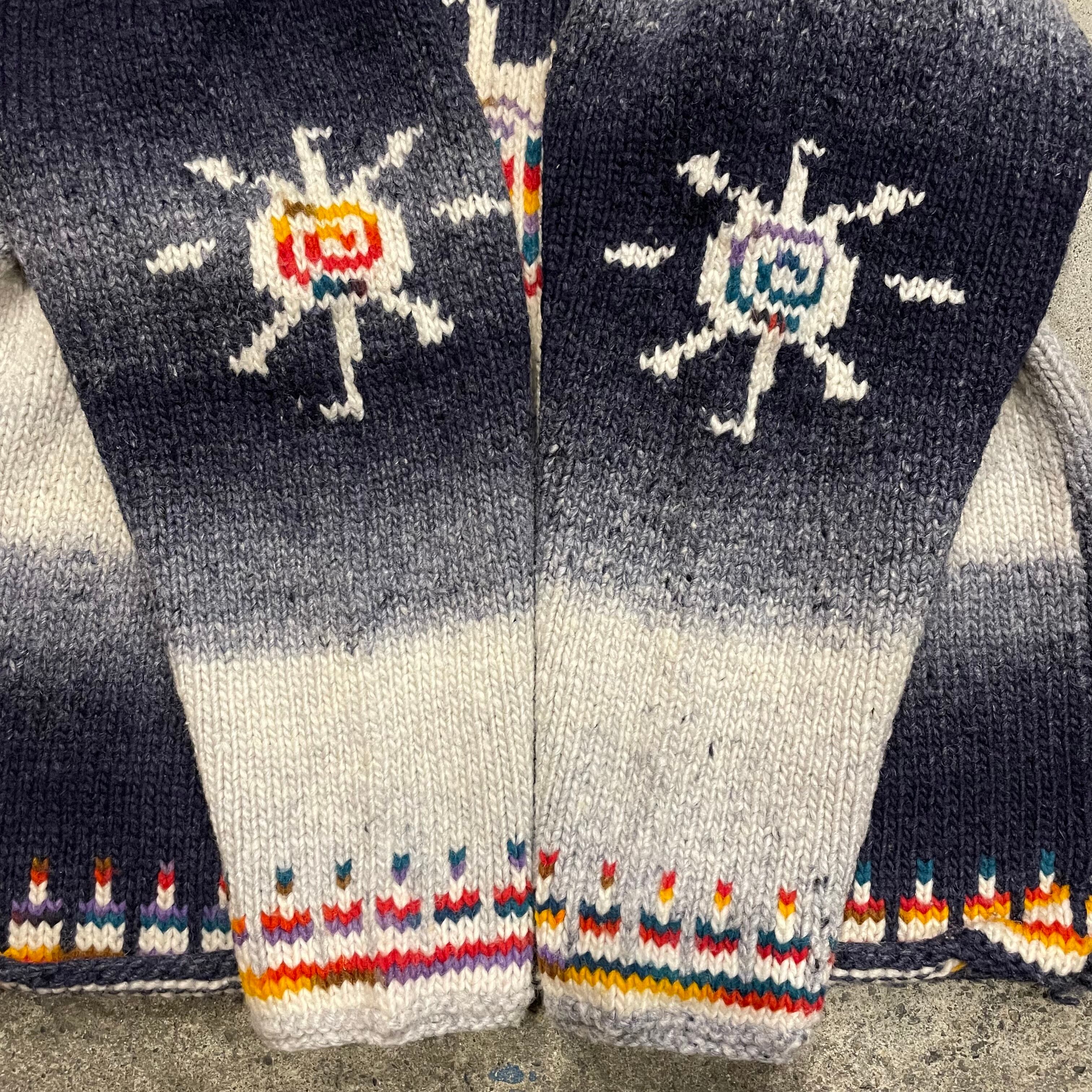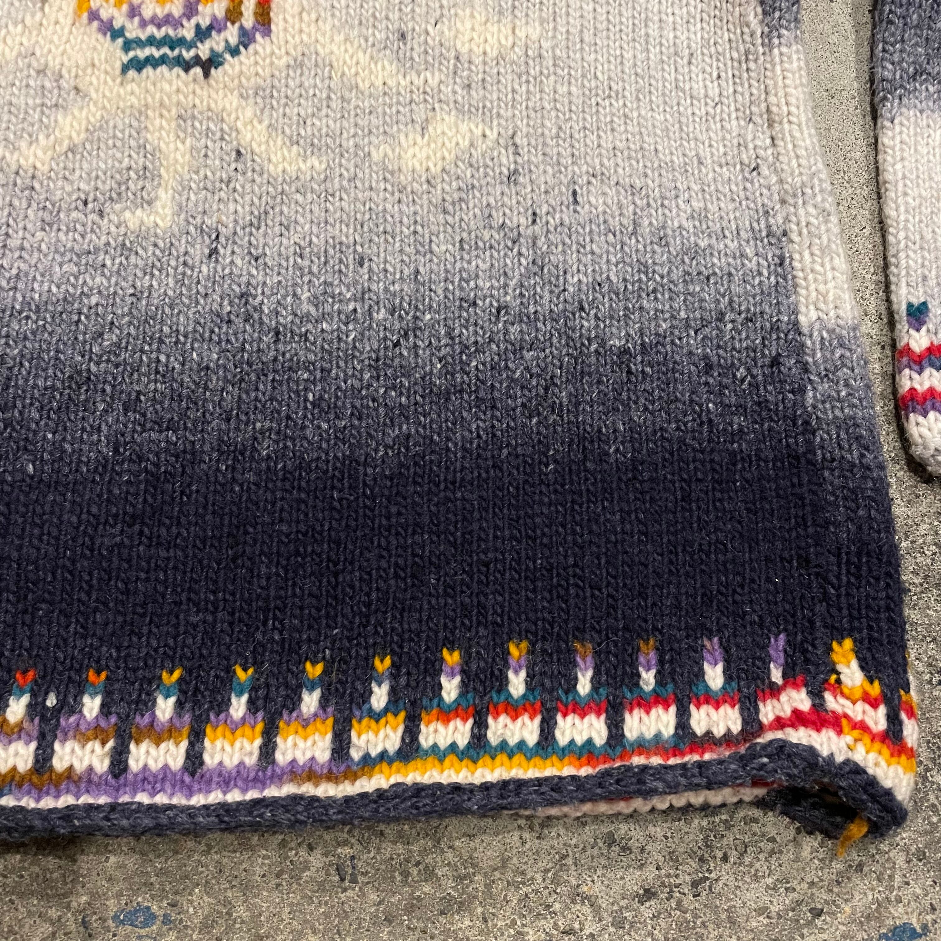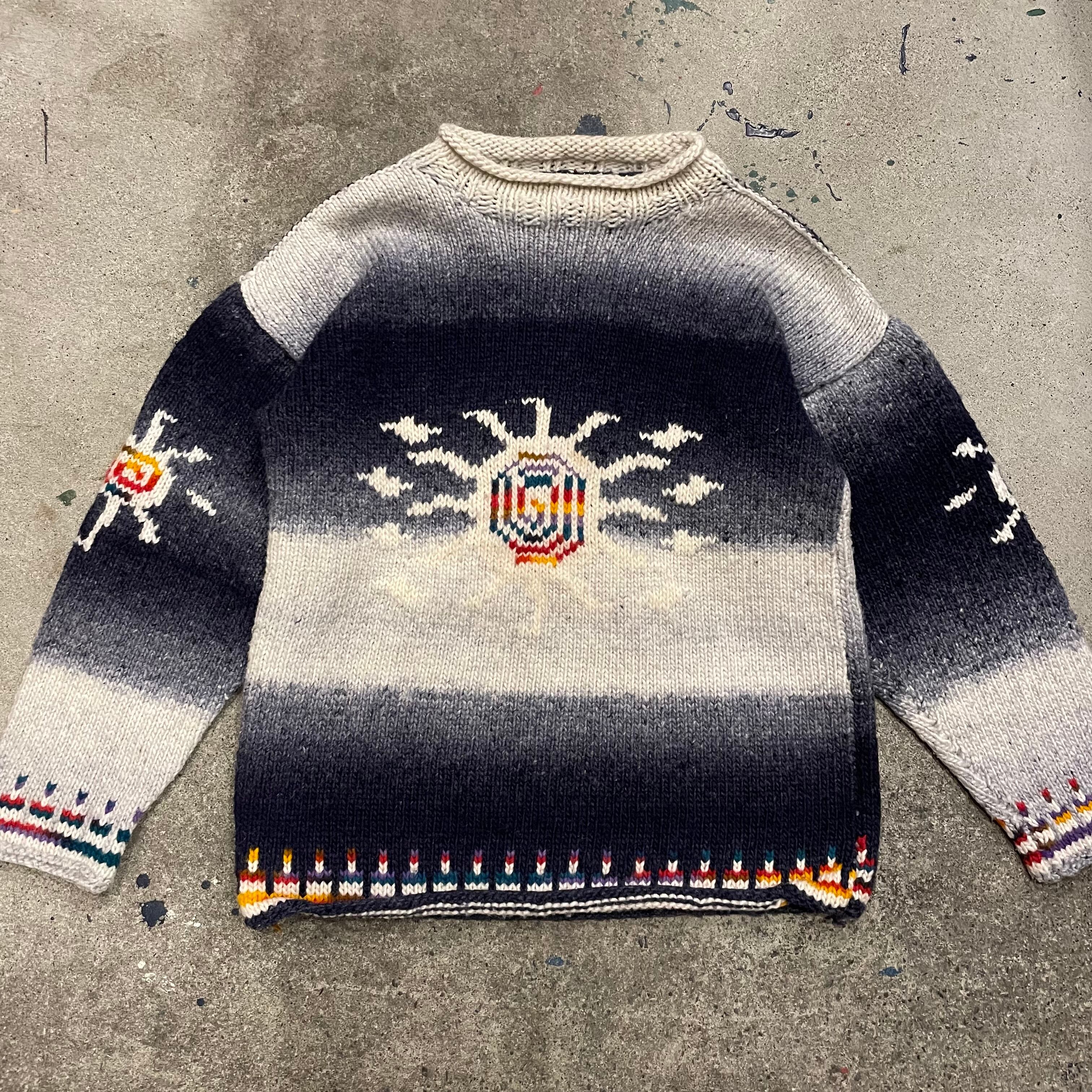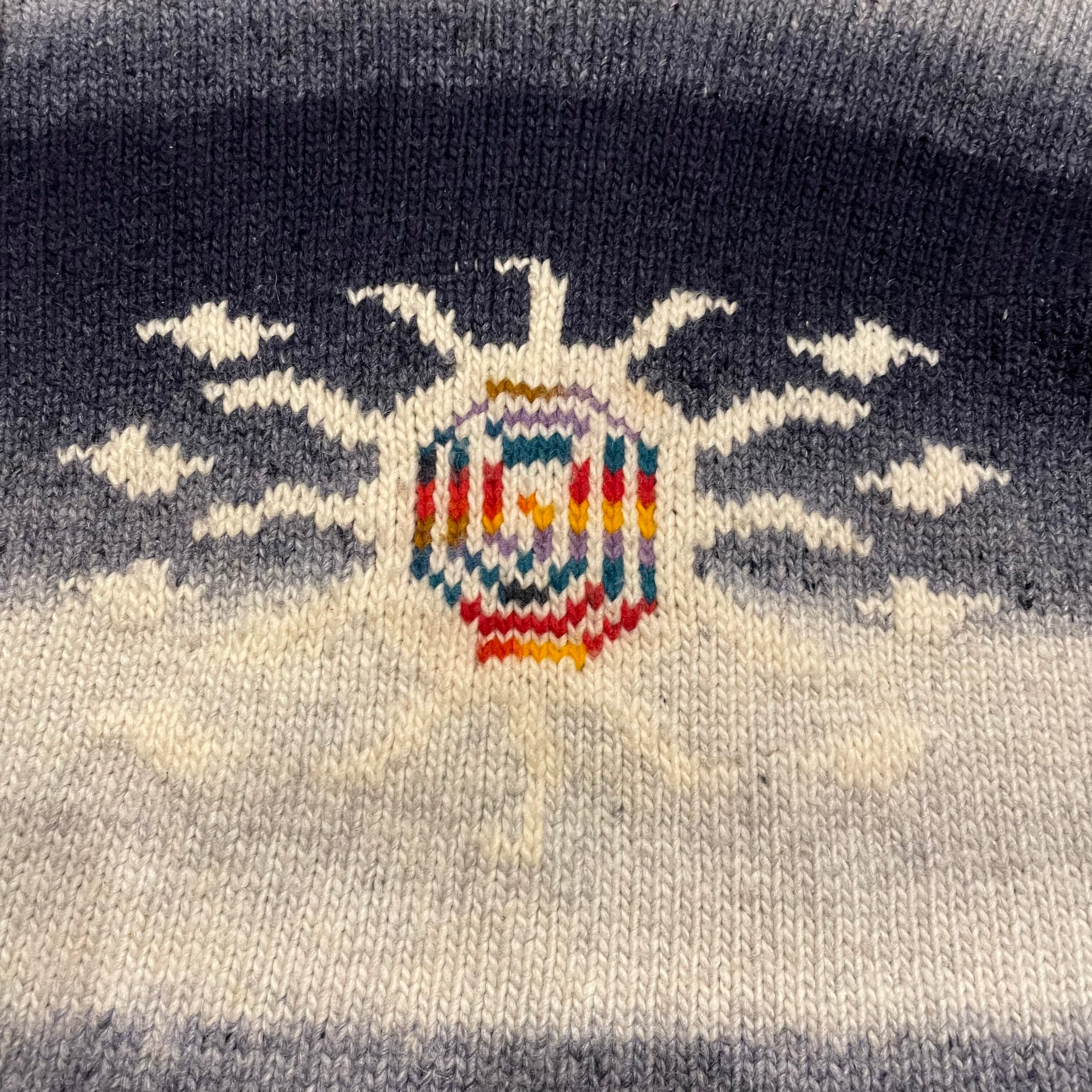 朝日か夕日かを表現しているのかとも思える色味とカラフルな糸の模様も素敵ですし、腕にも太陽が編まれていてかわいいです。