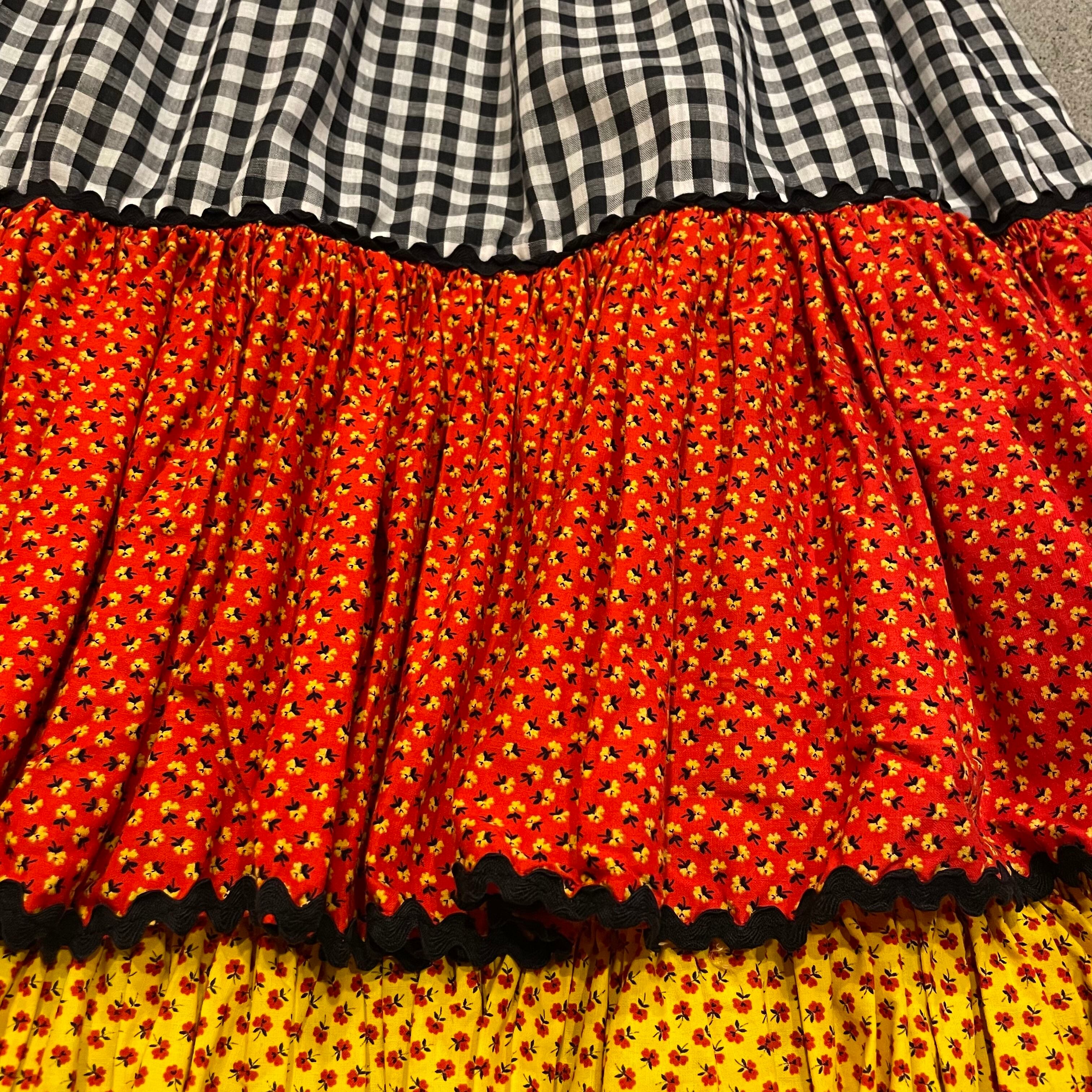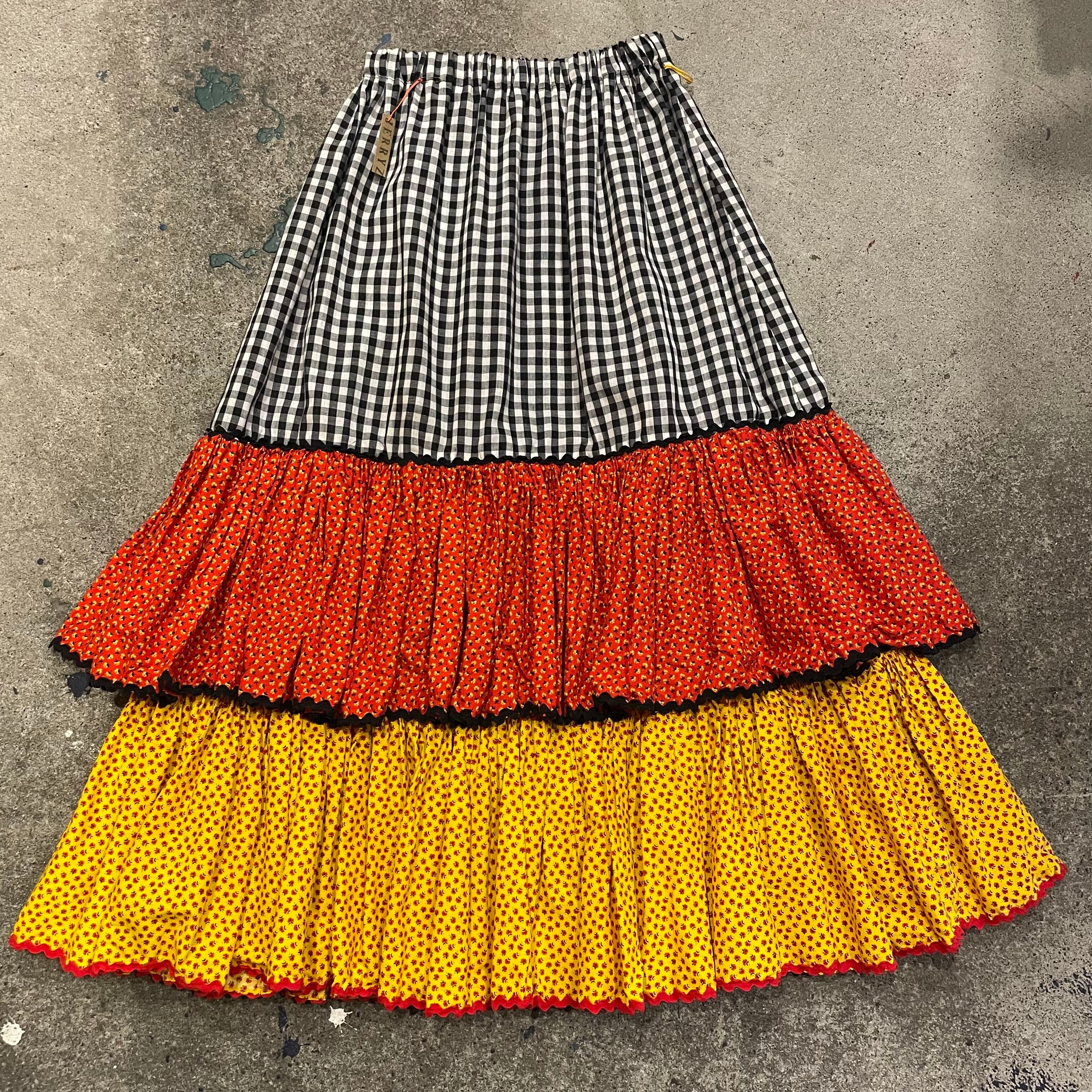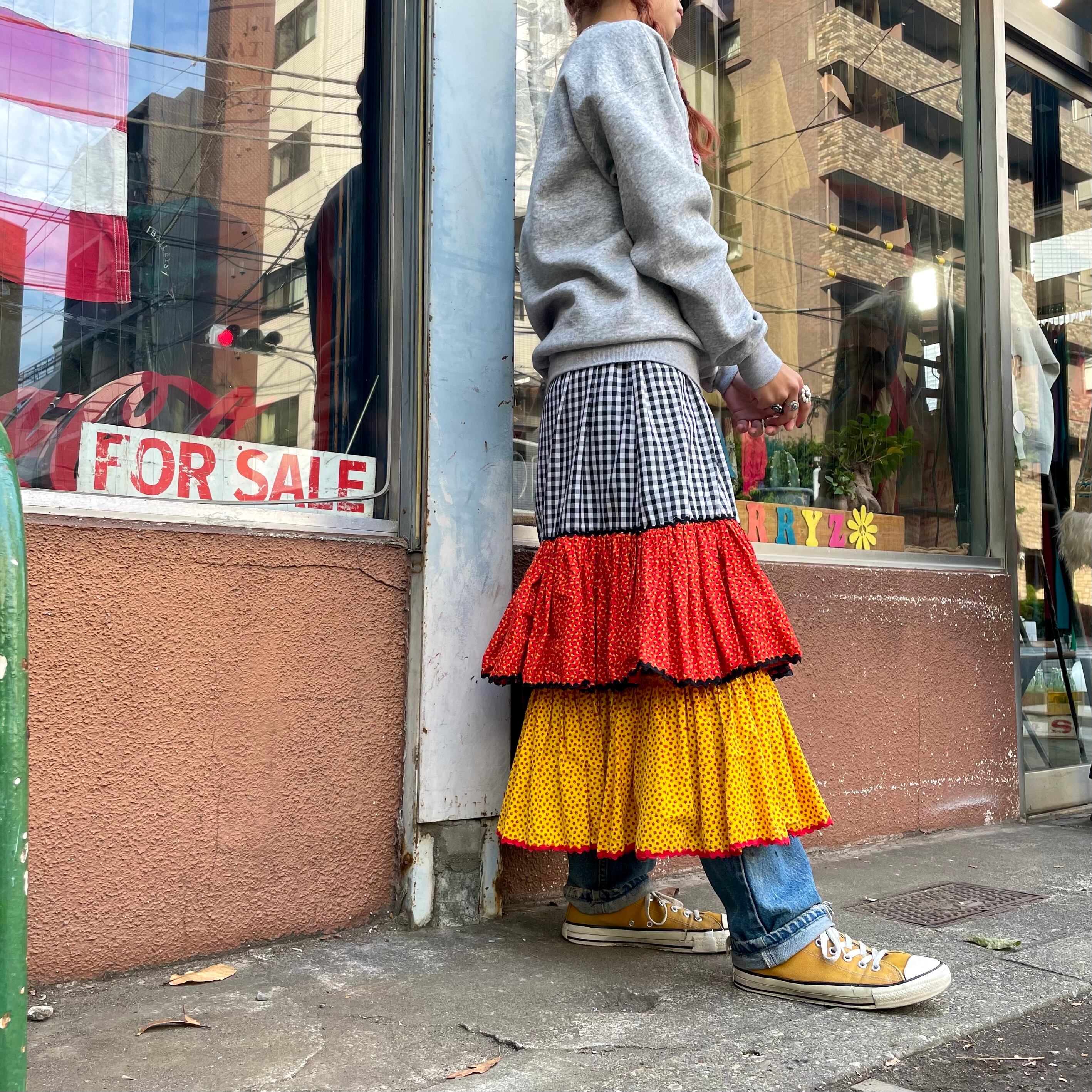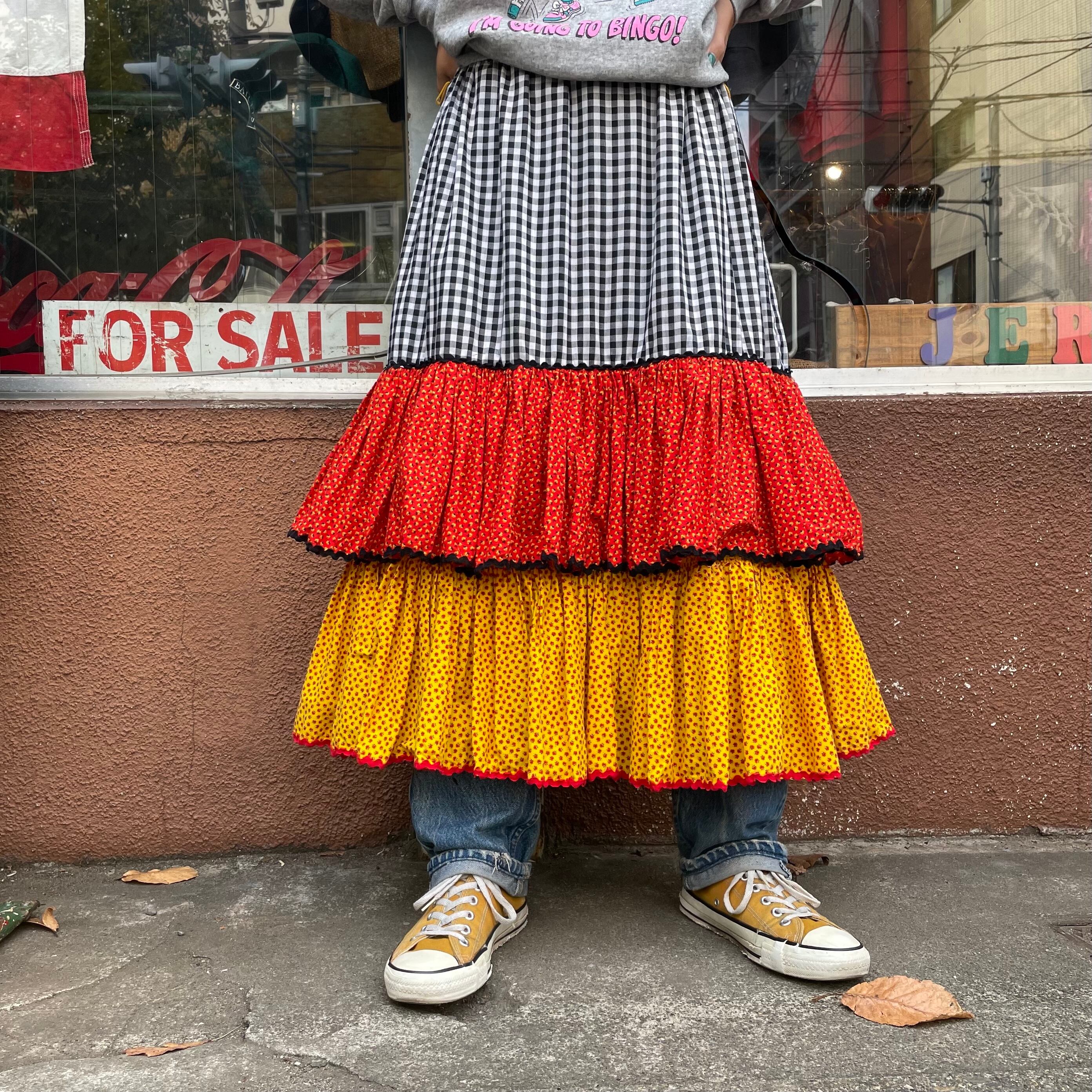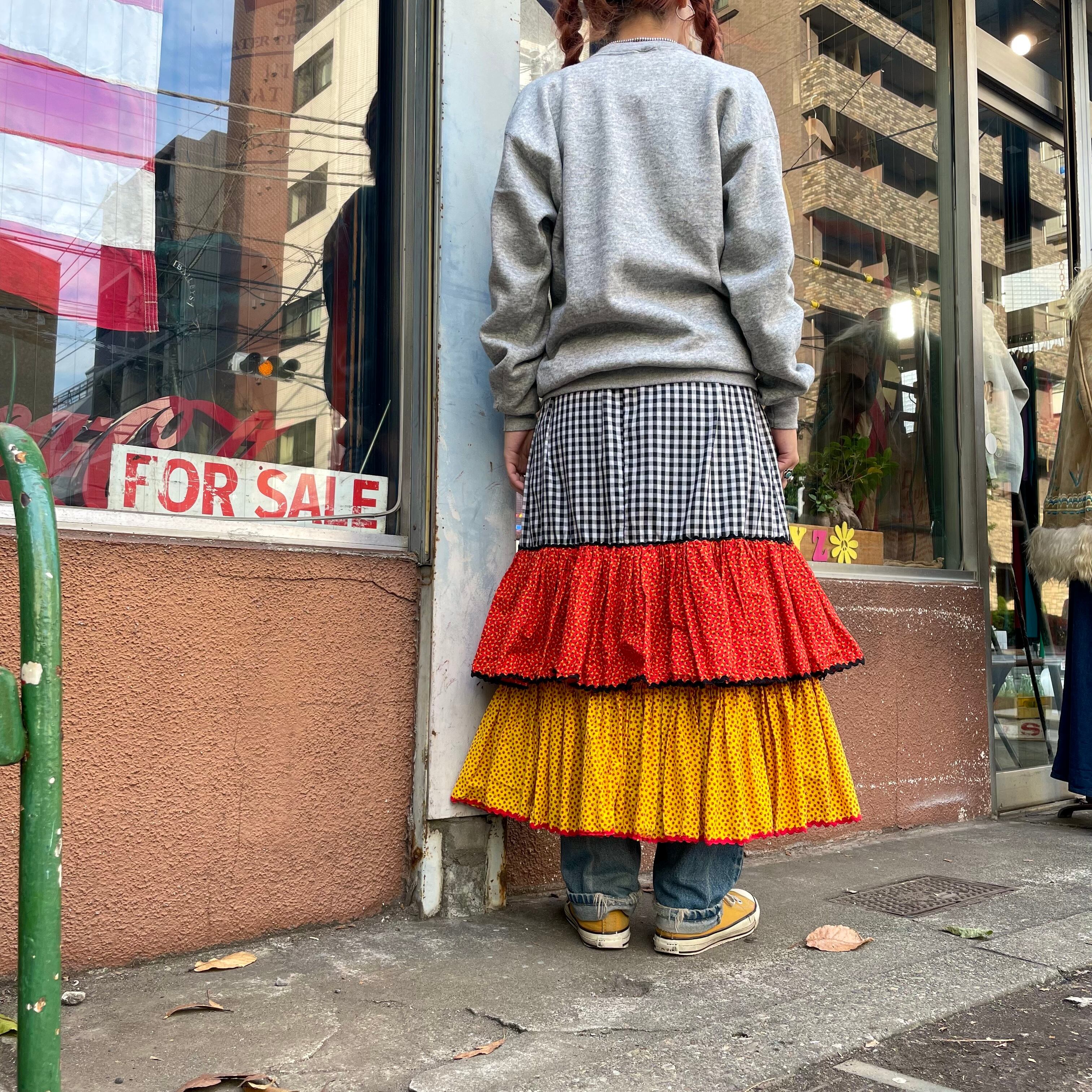 ギンガムチェックに小花柄の色違いの2段フリルのバランス感がとてもかわいいスカートです。