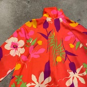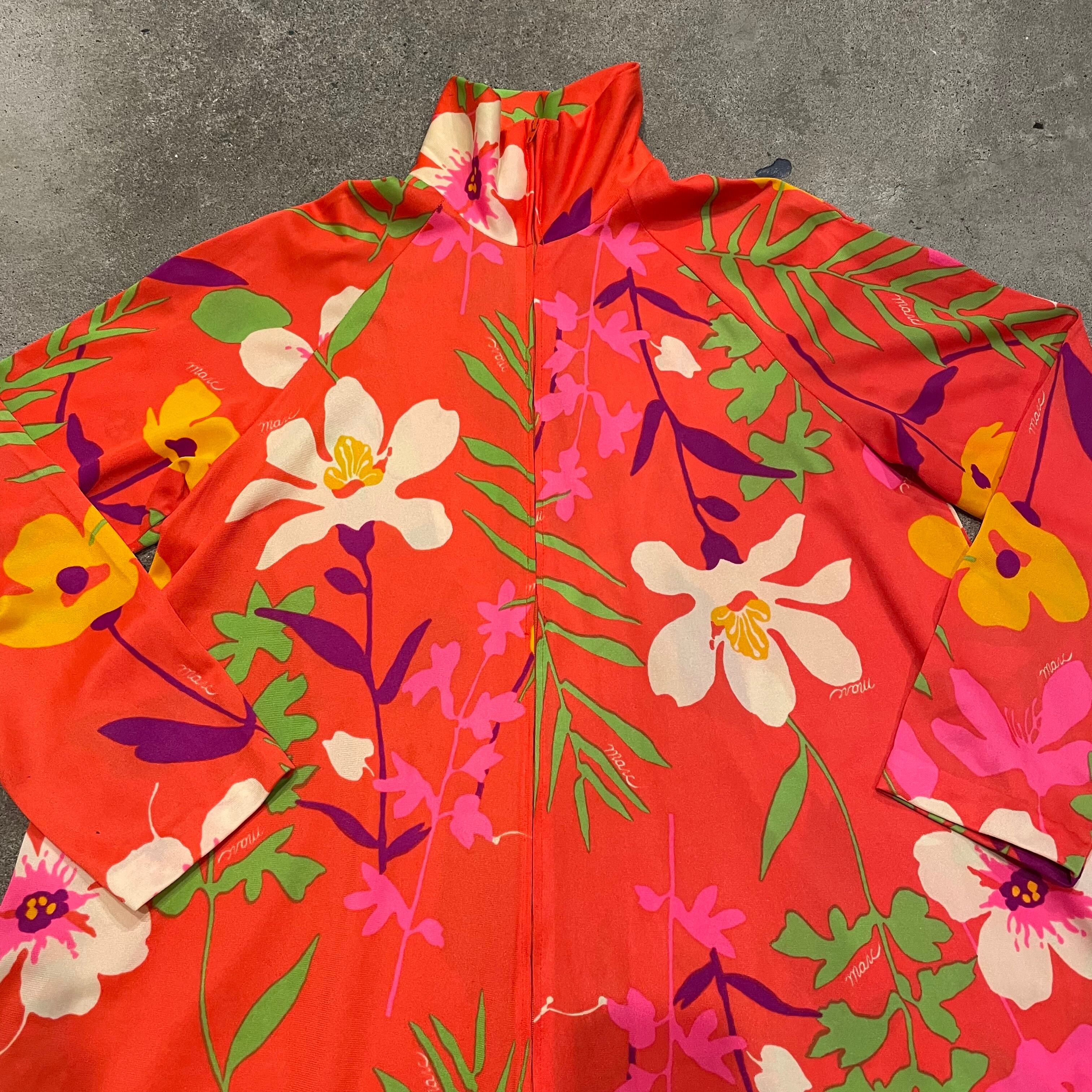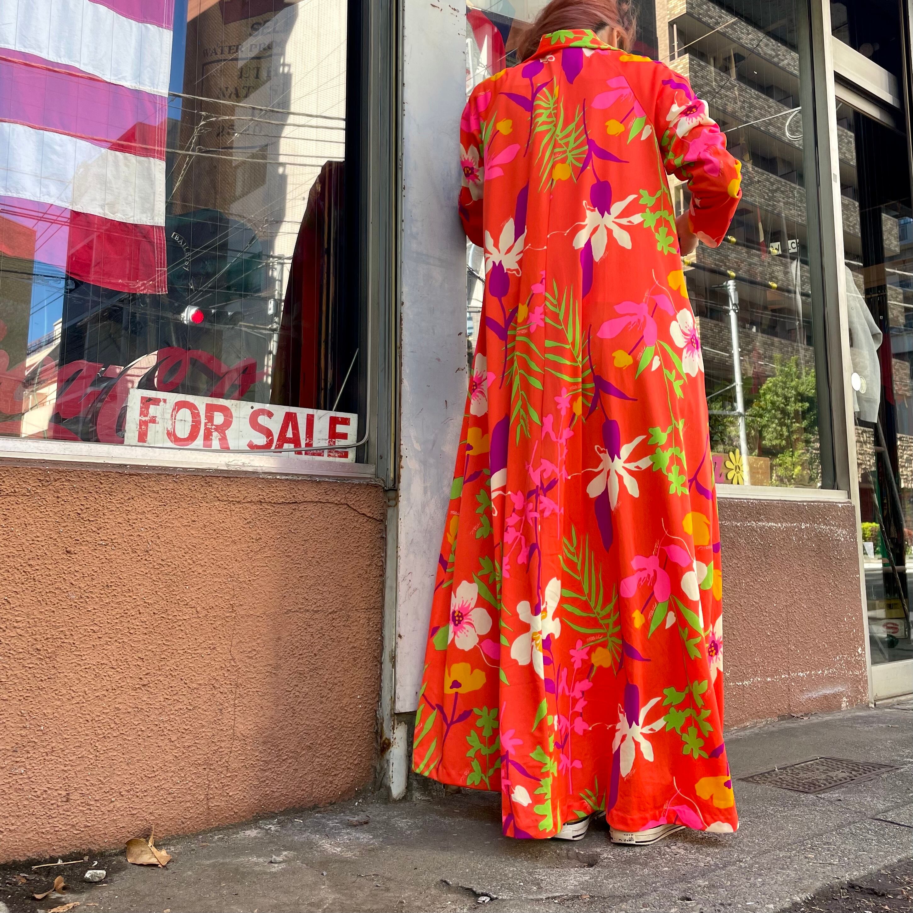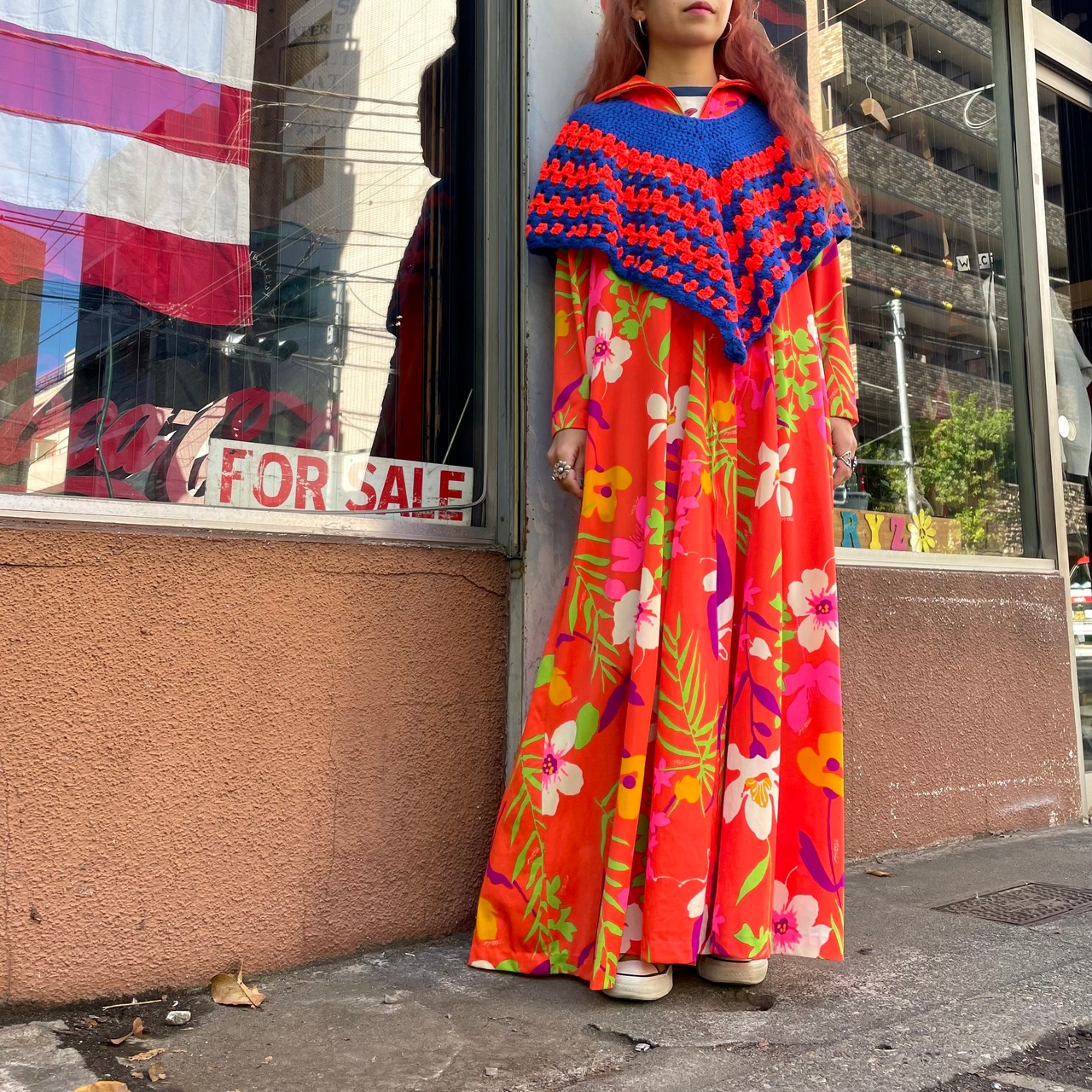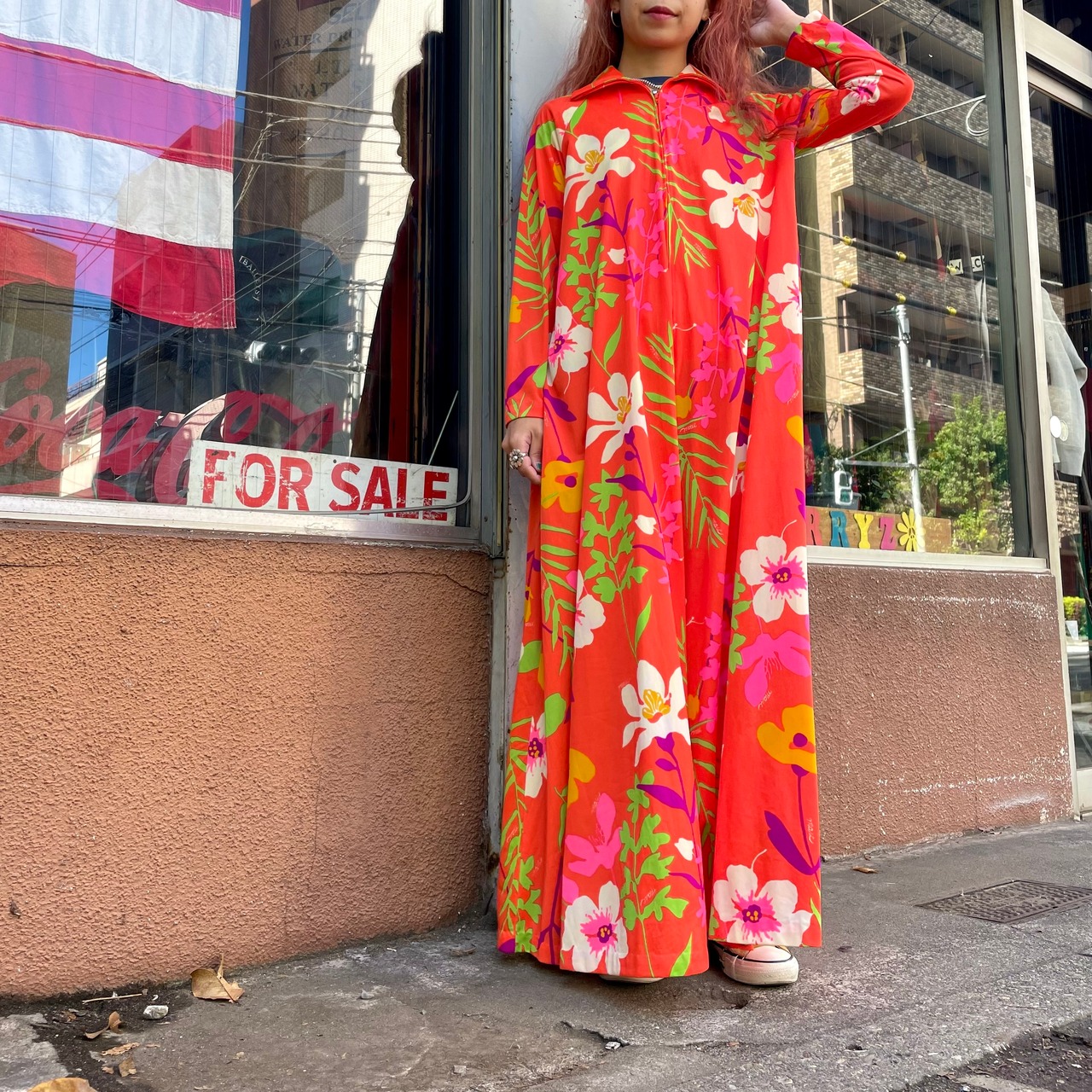 オレンジに大きな花柄がかわいいワンピースです。前がジップになっていてハイネックとしても、襟にしても、下まで開けてインナーを見せても、色々楽しめます。上にスウェットやニットを重ねて襟を出してもかわいいですね!身幅が広めでたっぷりボリュームのあるスカート部分にトキメキます。