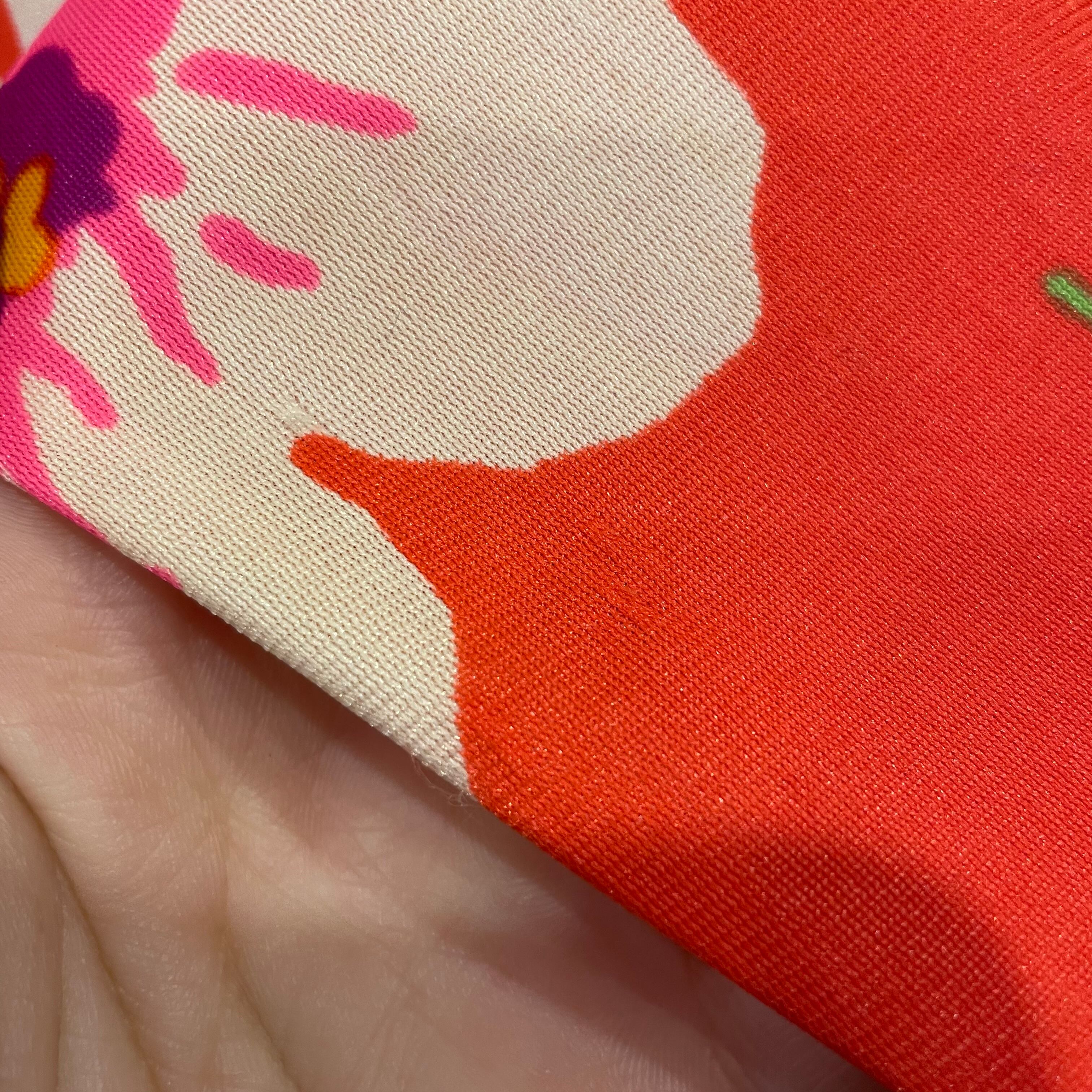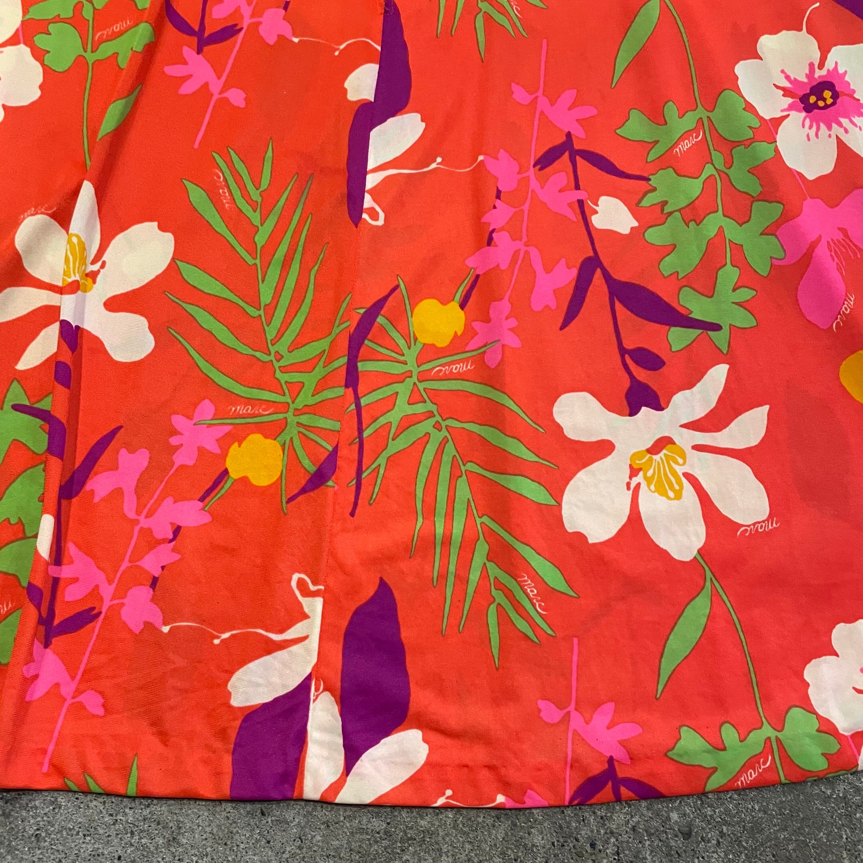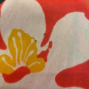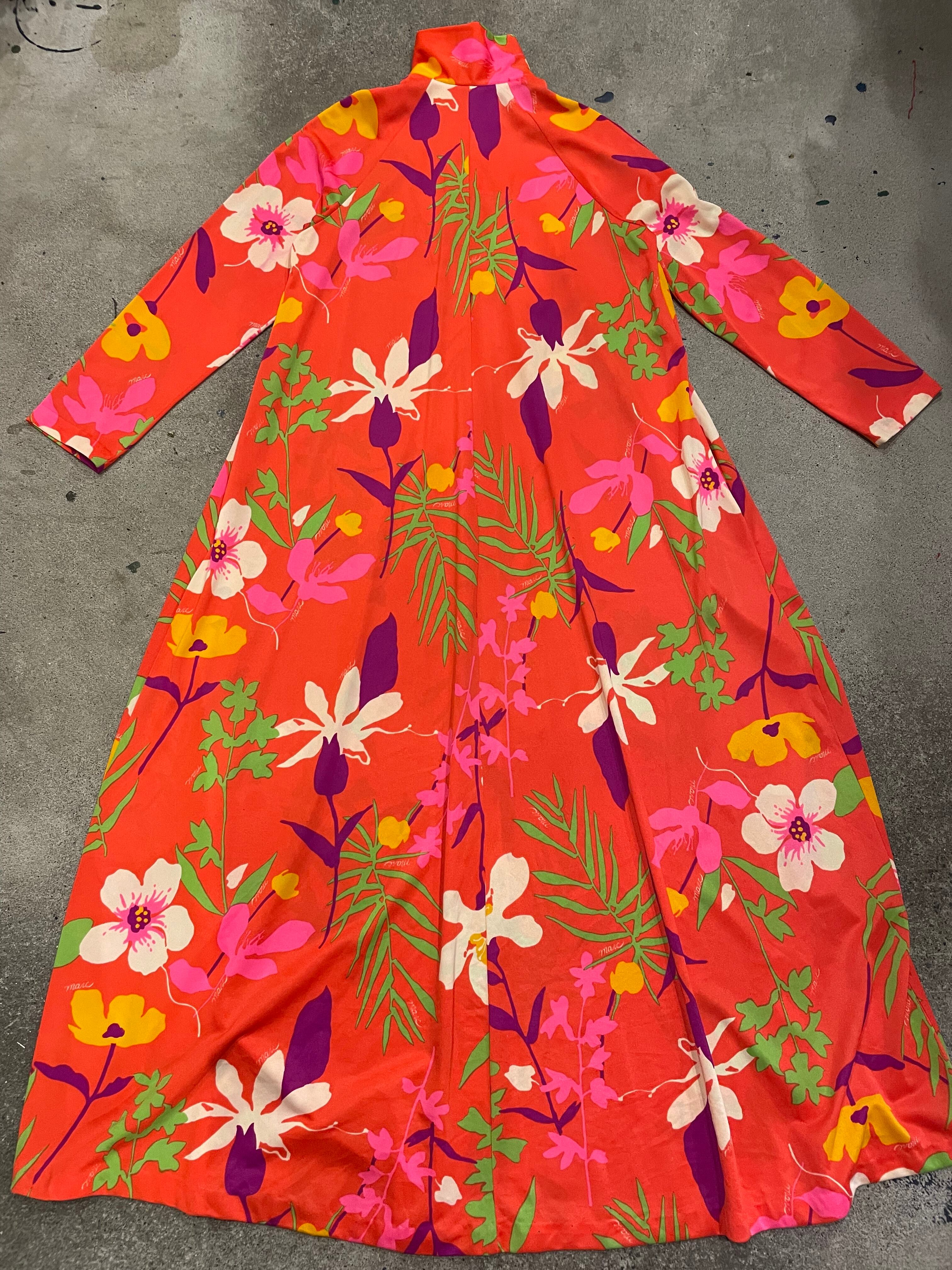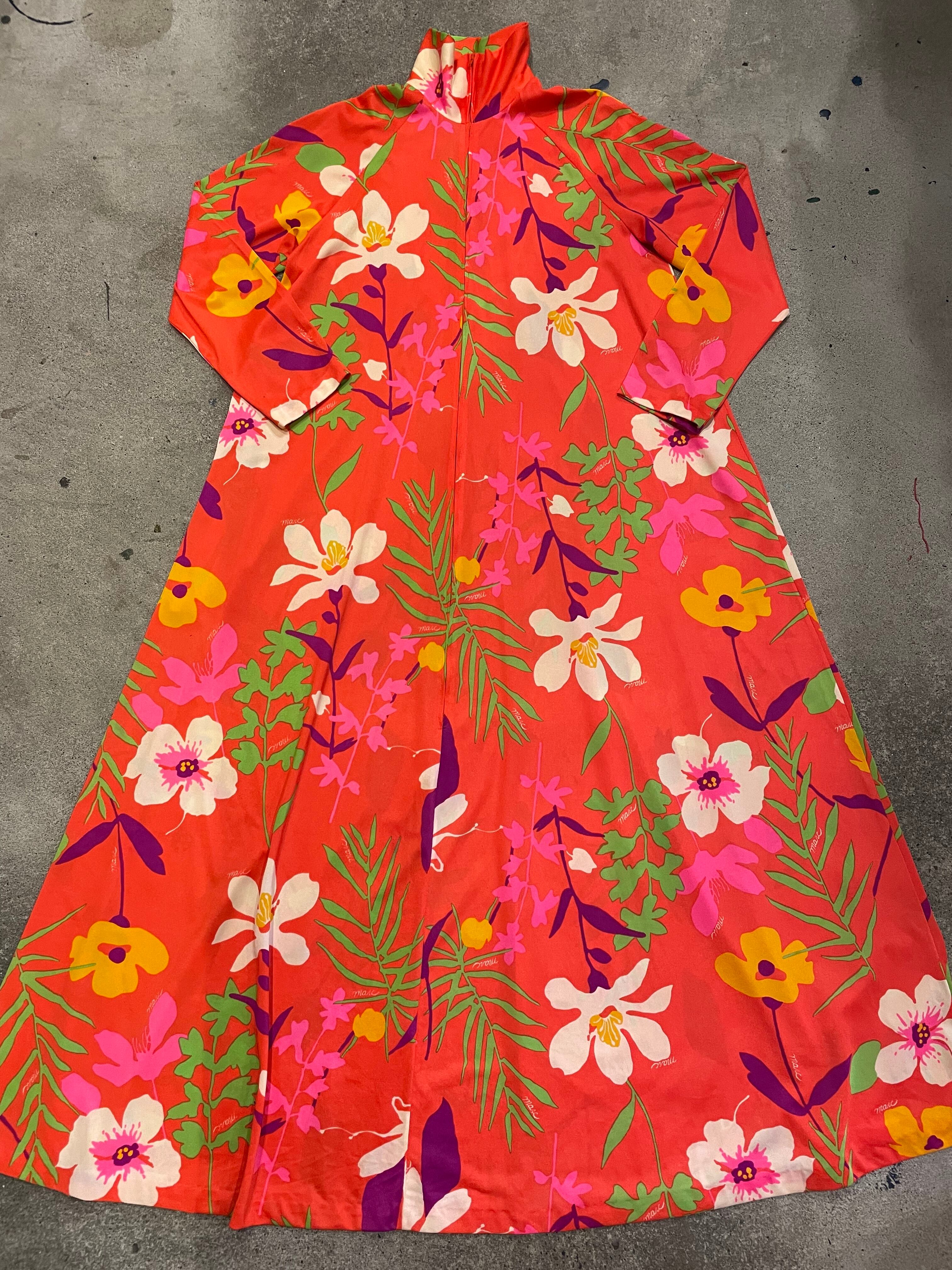 オレンジに大きな花柄がかわいいワンピースです。前がジップになっていてハイネックとしても、襟にしても、下まで開けてインナーを見せても、色々楽しめます。上にスウェットやニットを重ねて襟を出してもかわいいですね!身幅が広めでたっぷりボリュームのあるスカート部分にトキメキます。