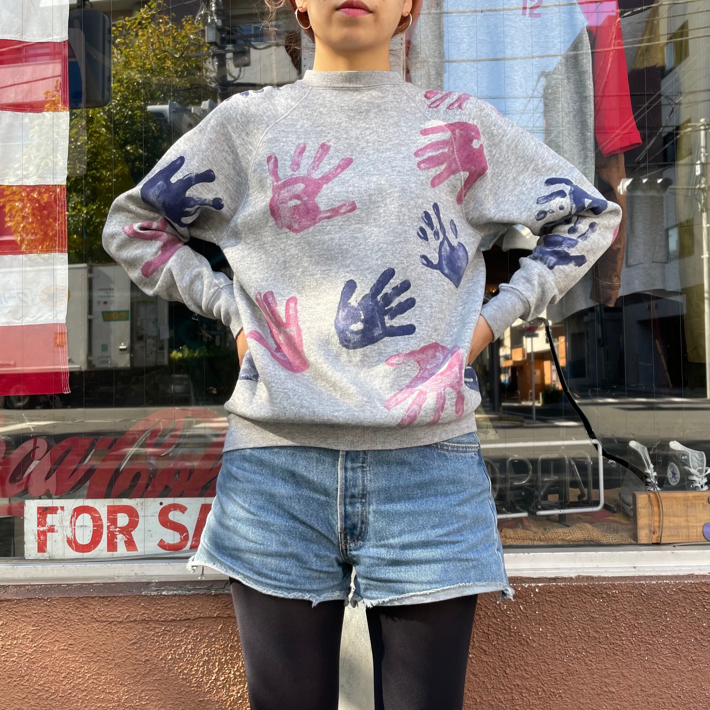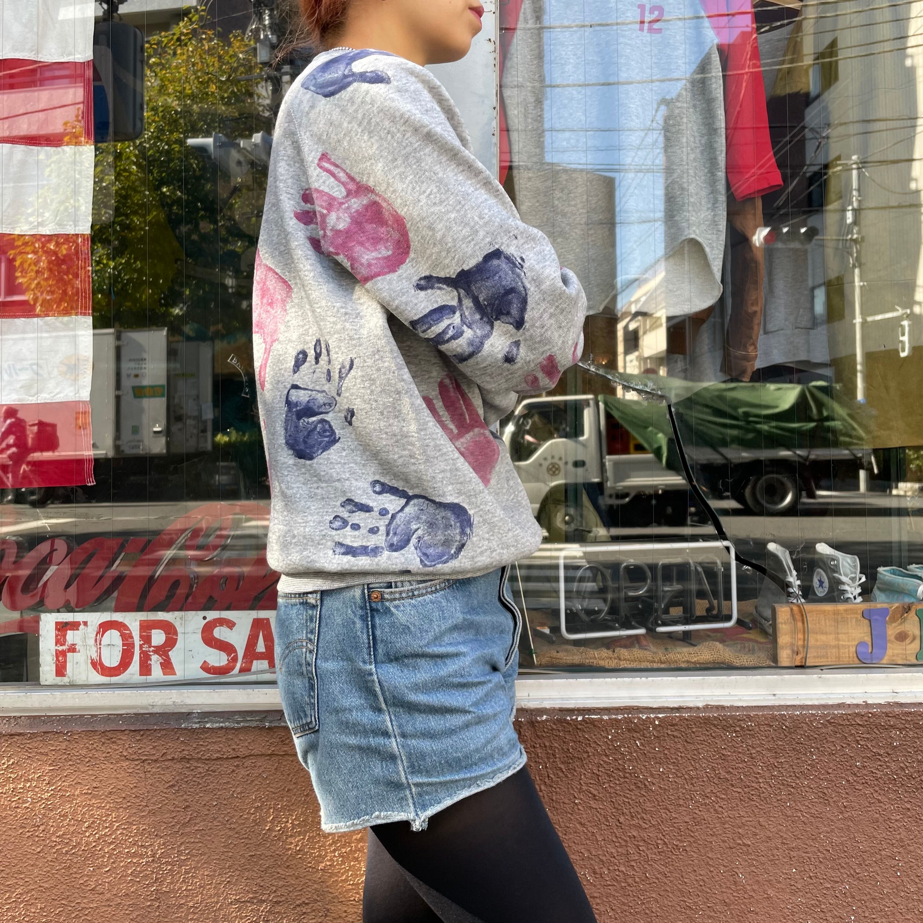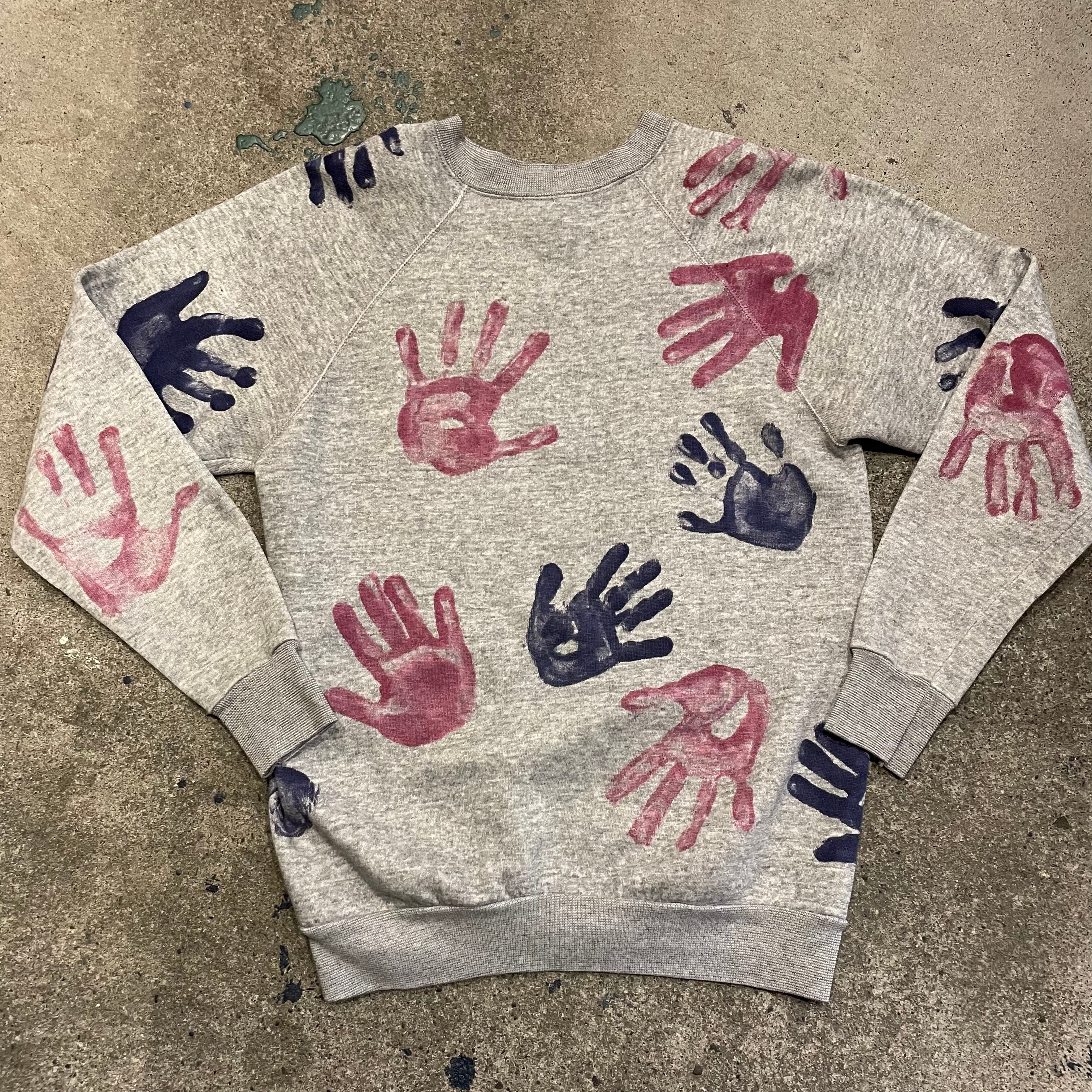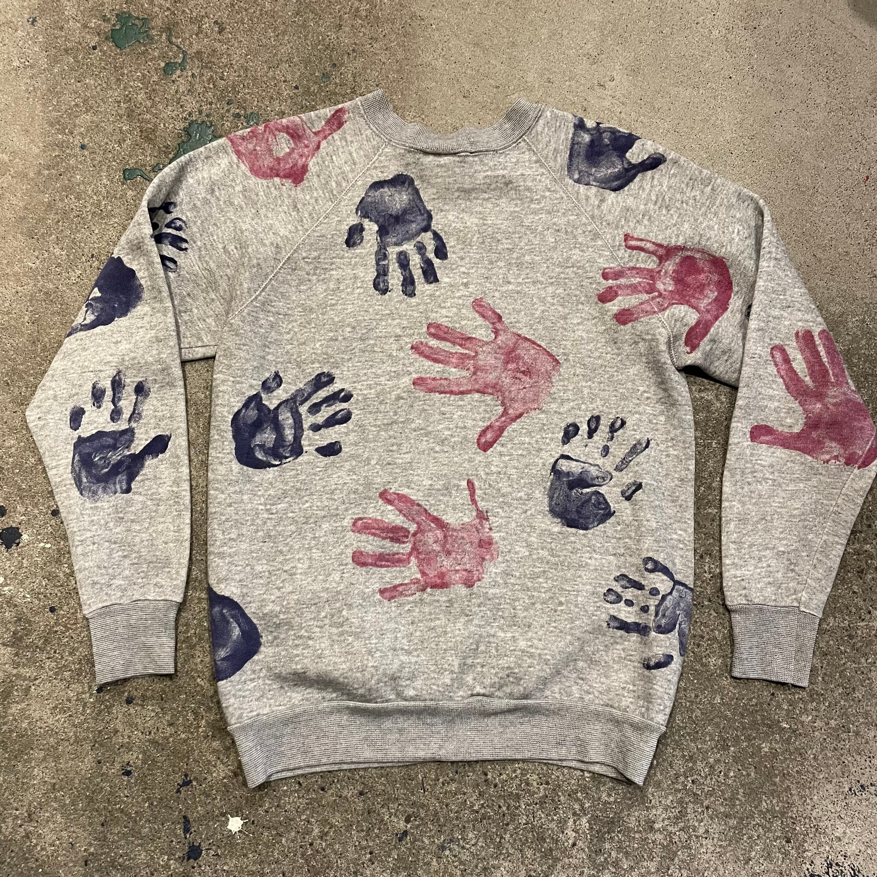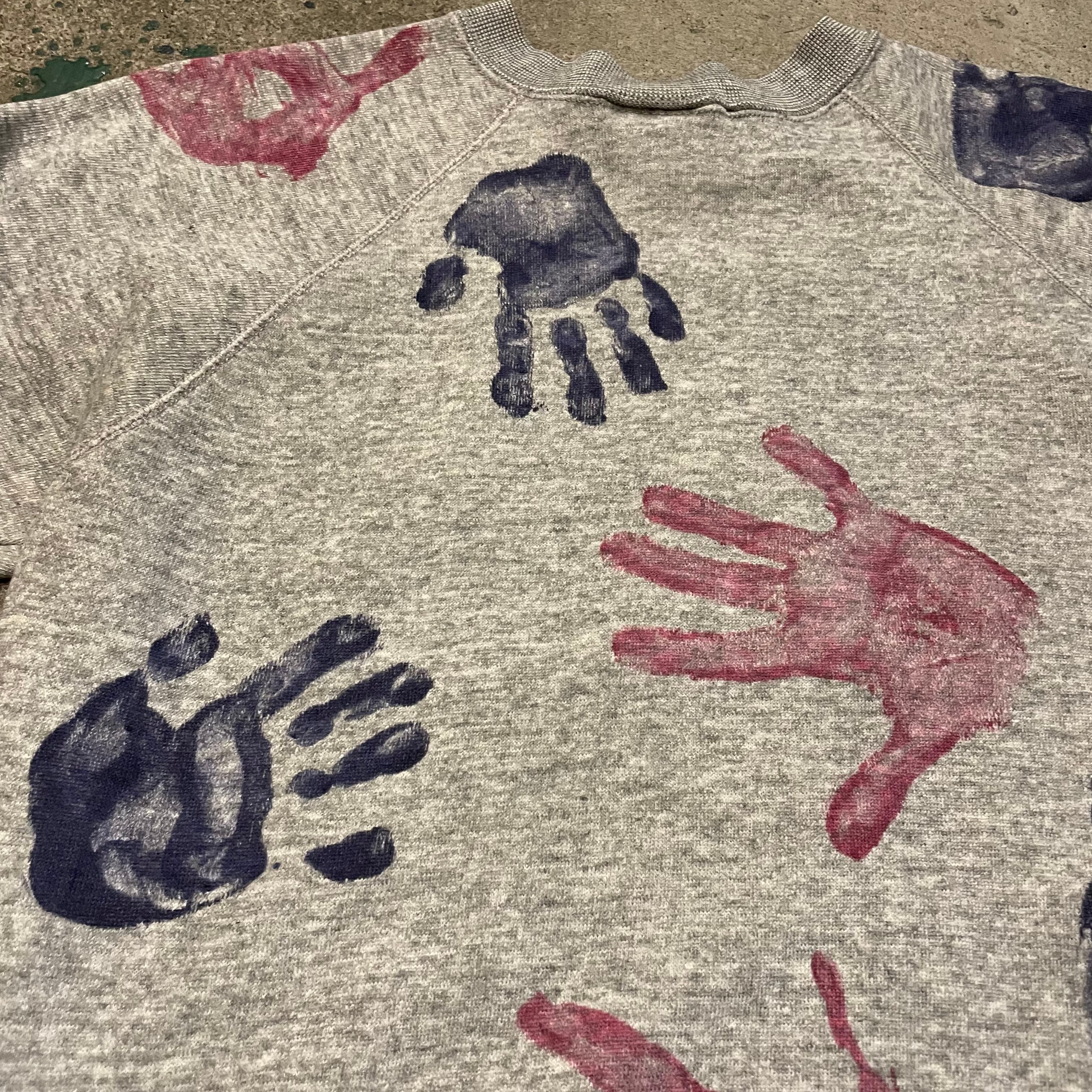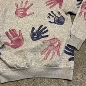 グレーのボディに手形がたくさん押されているスウェットです。