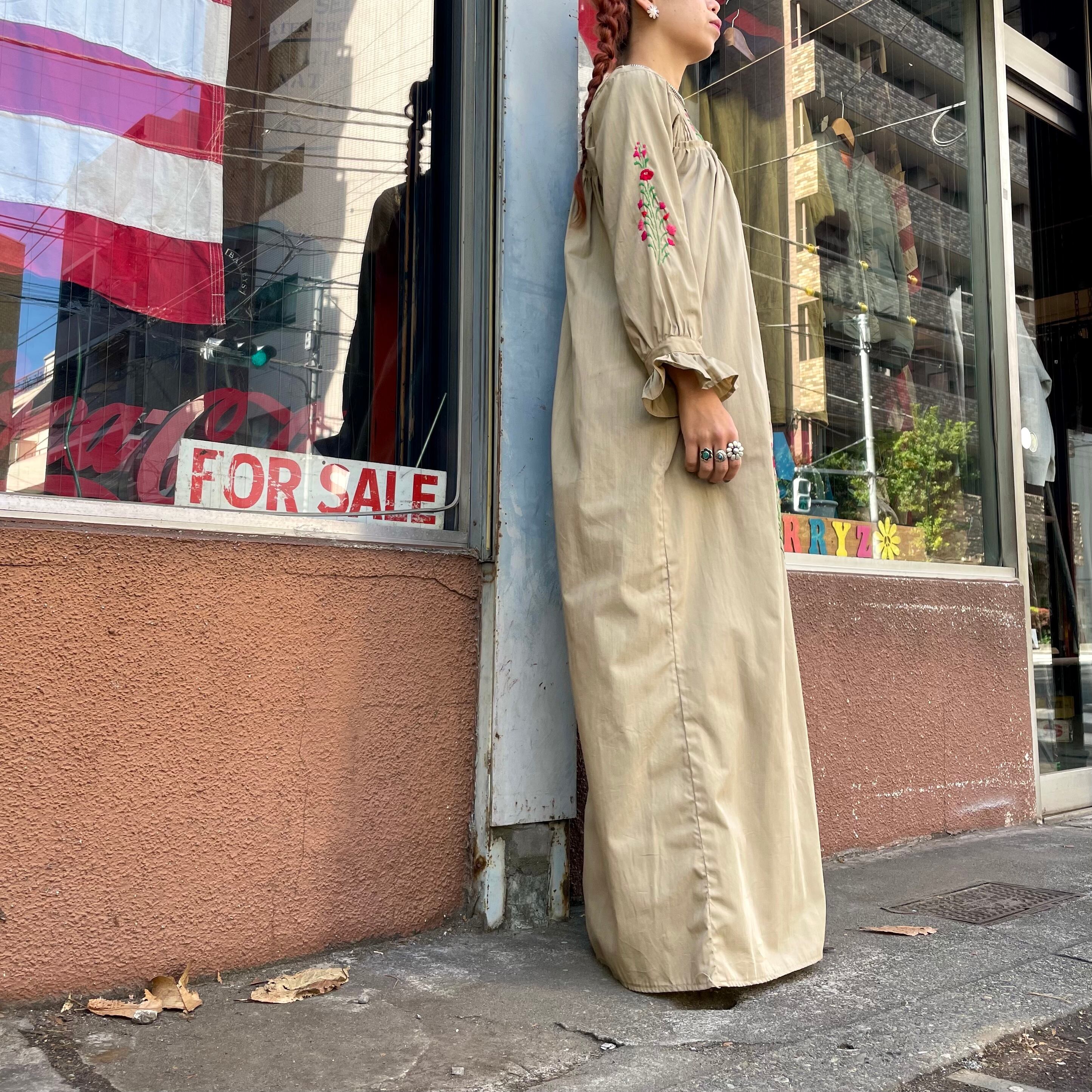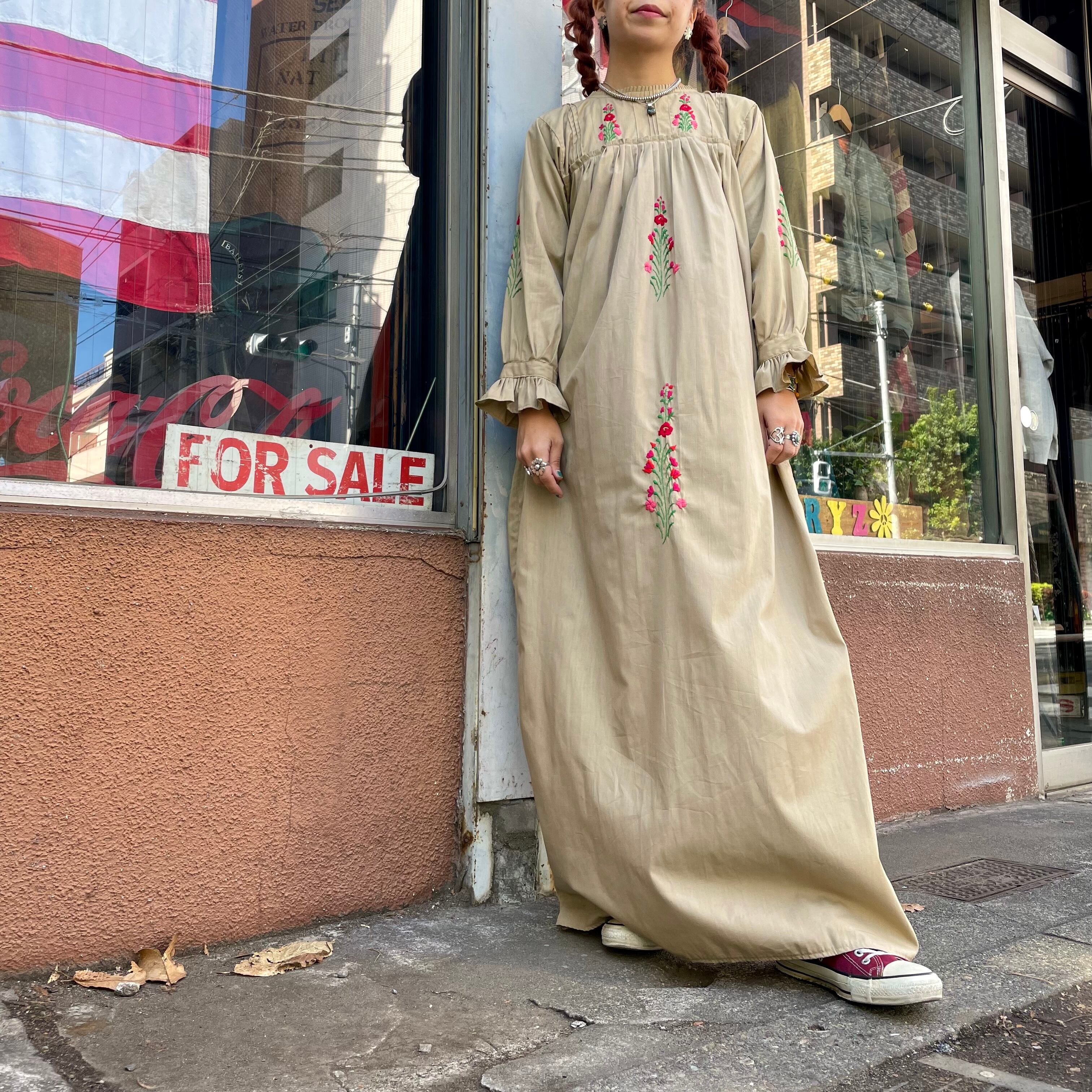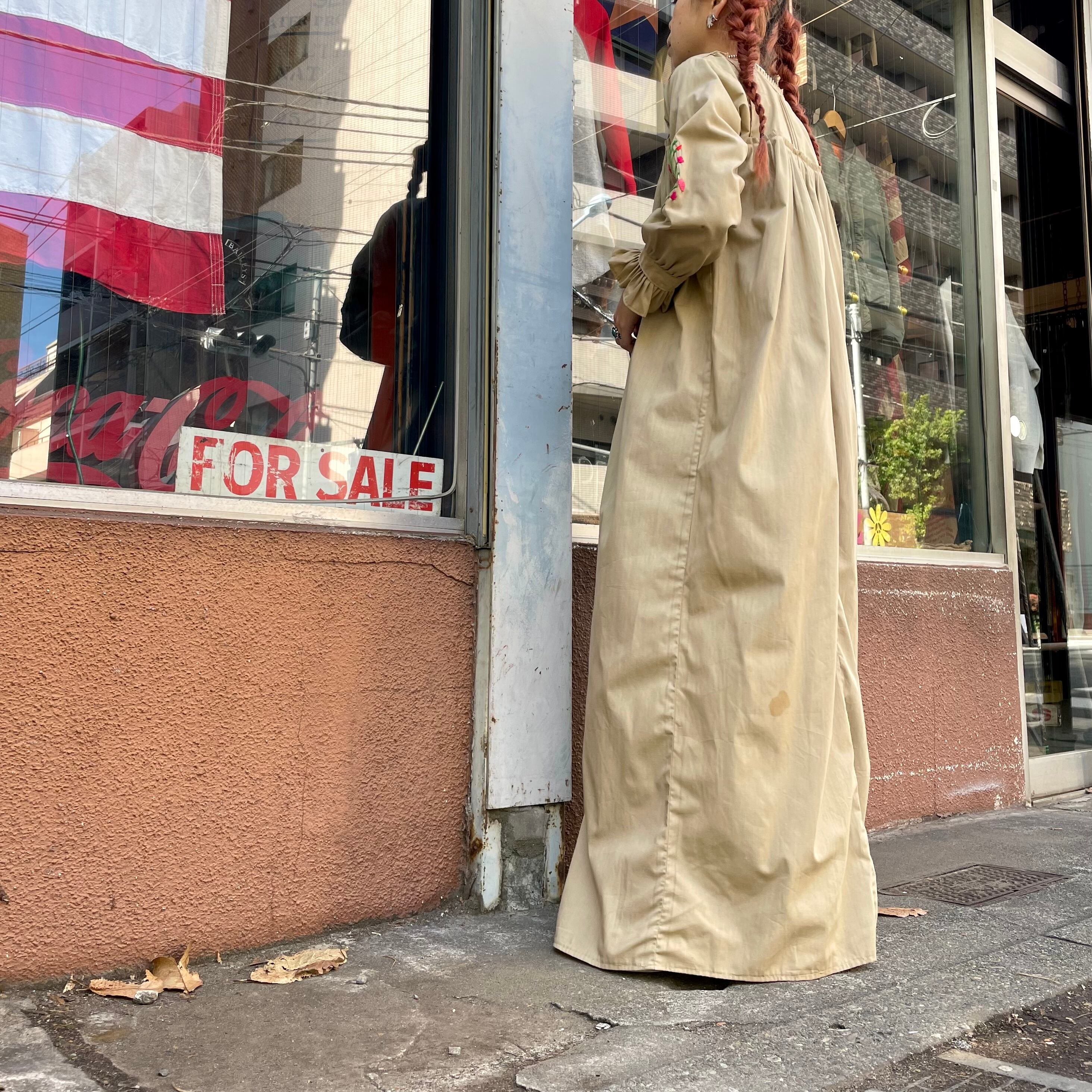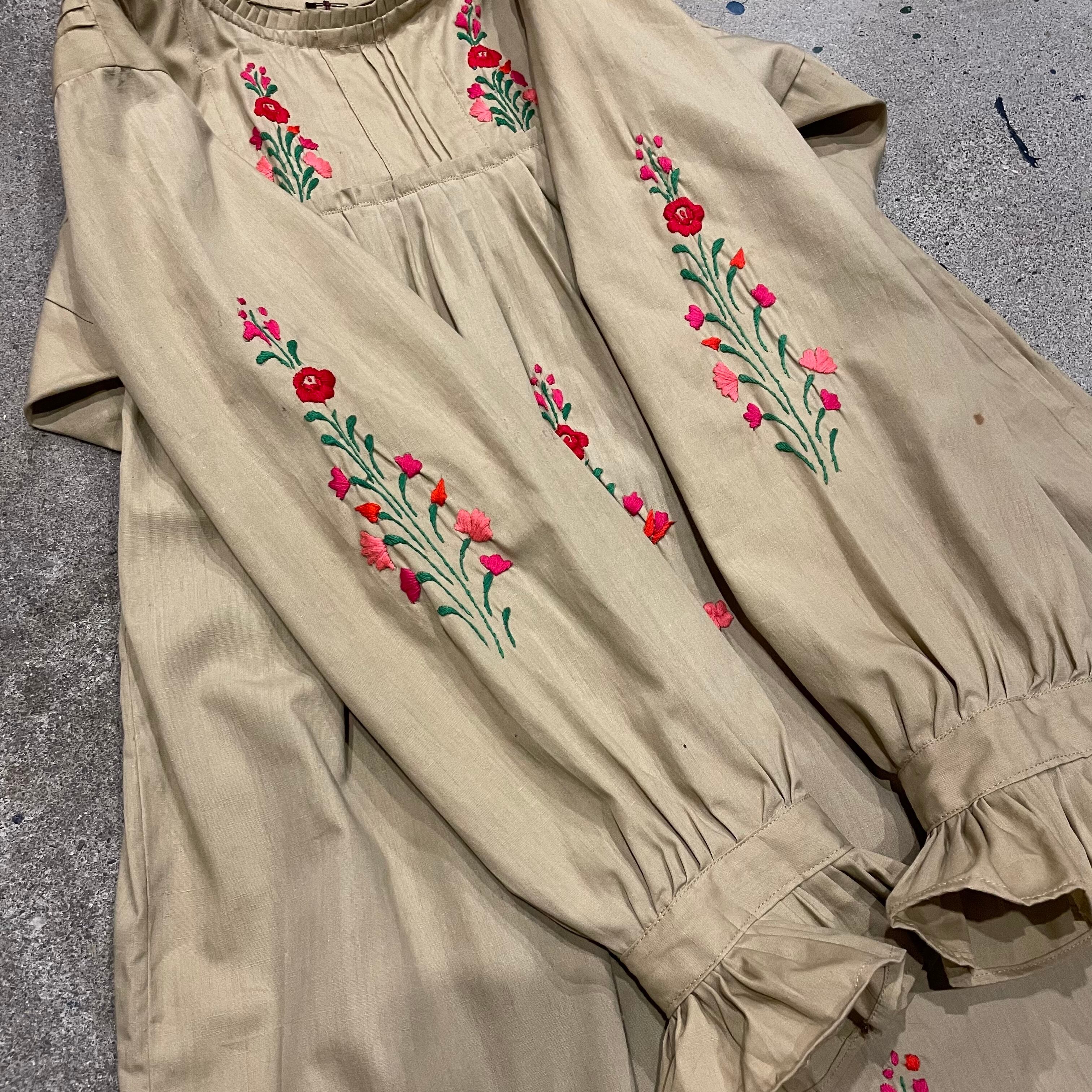 ベージュに赤とピンクのお花の手刺繍がかわいいワンピースです。