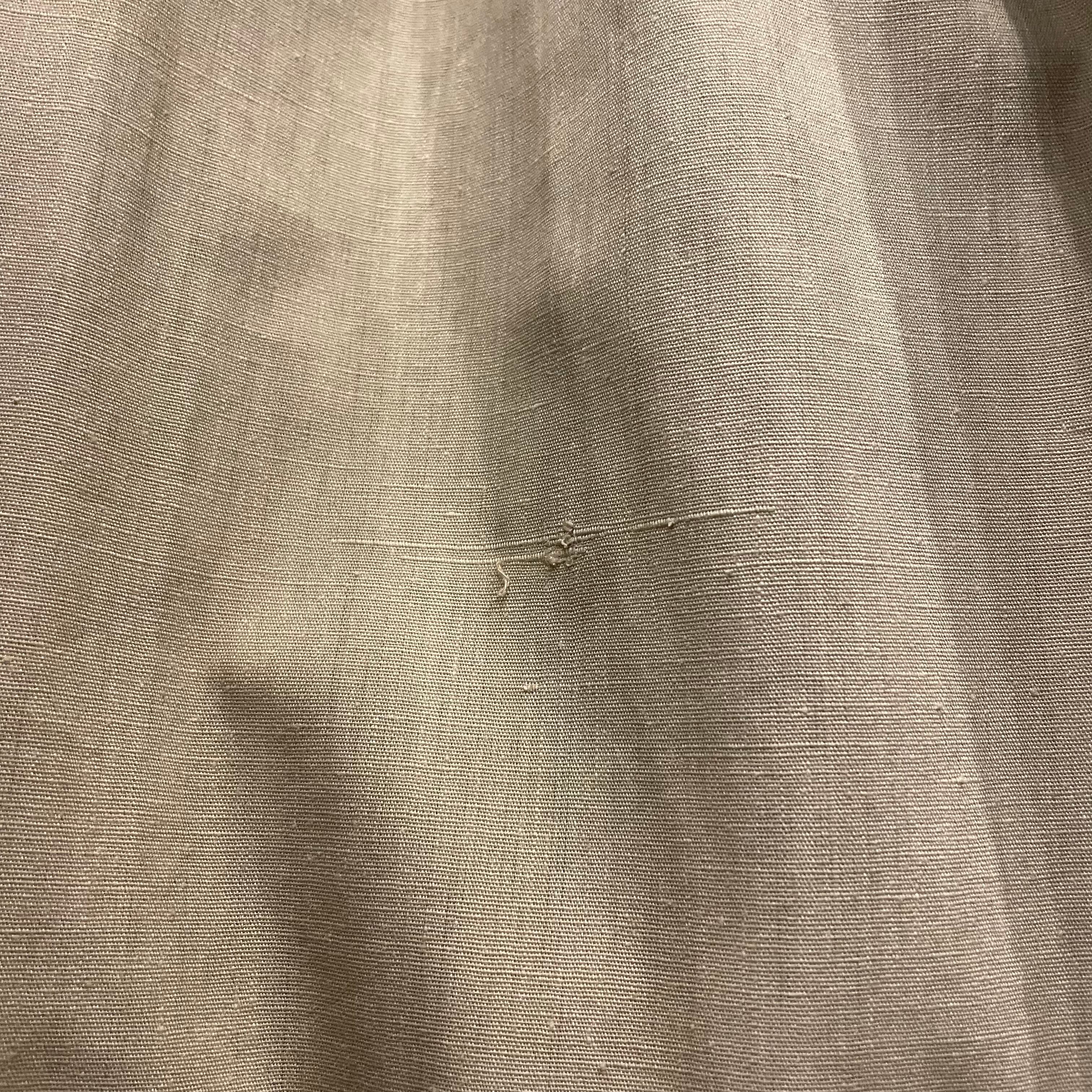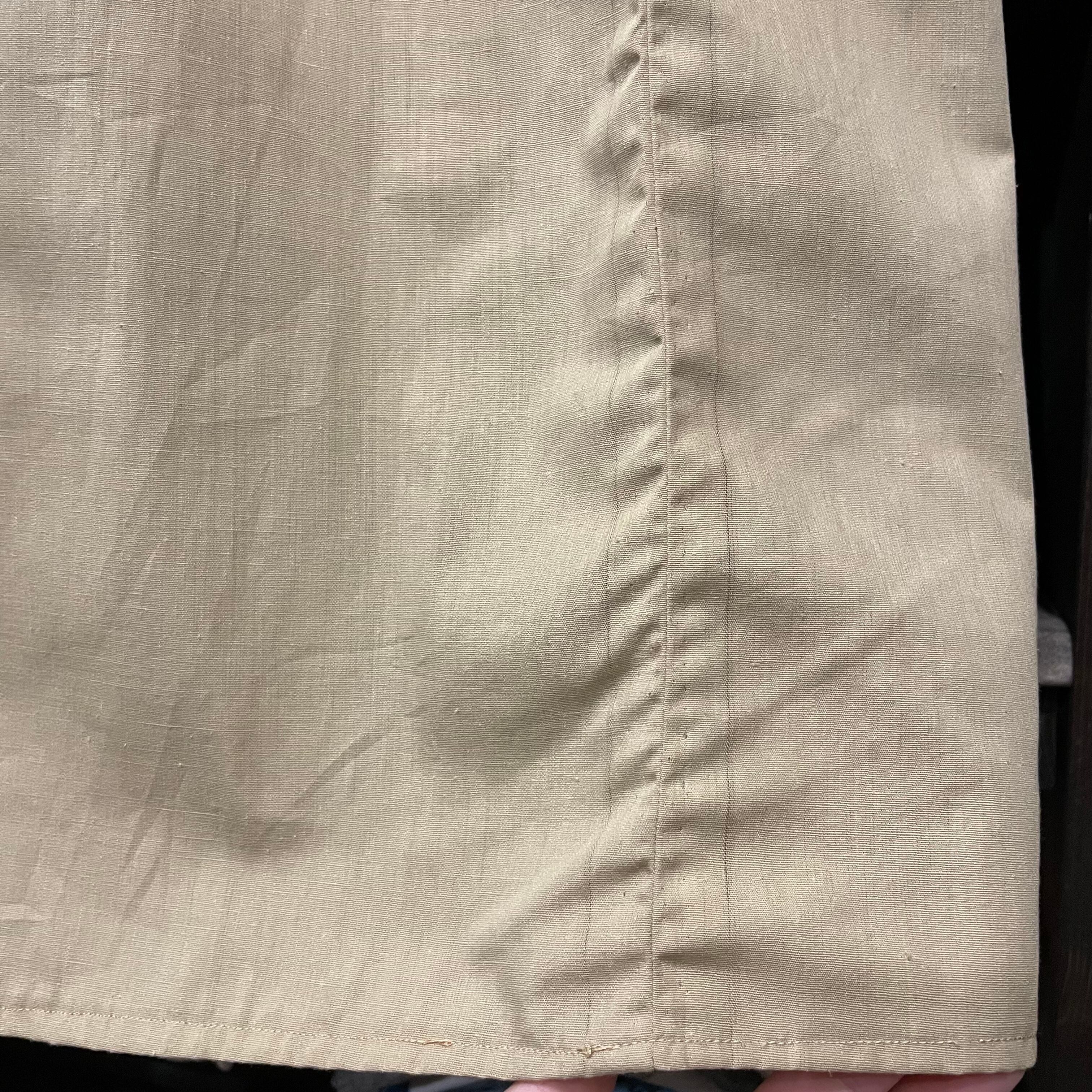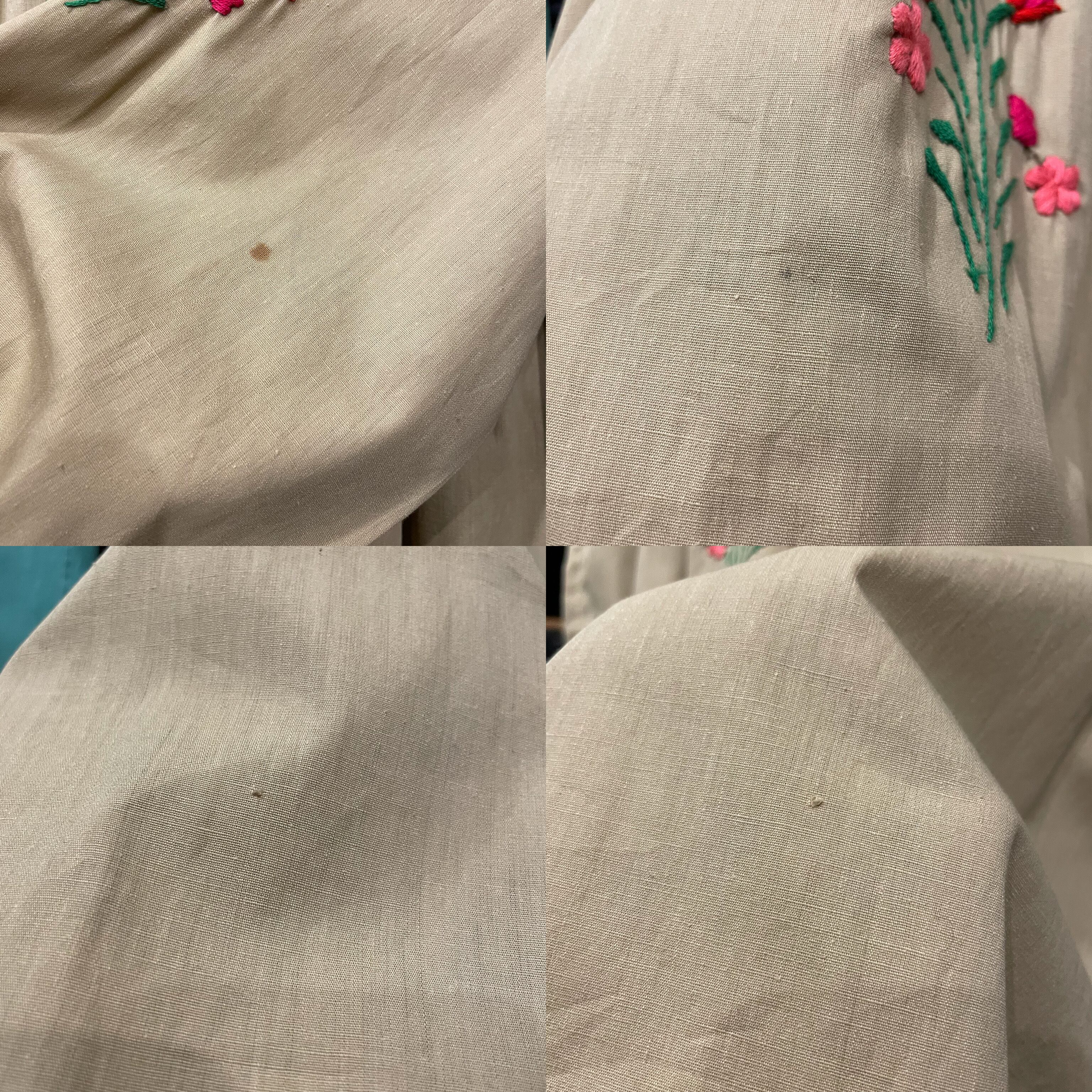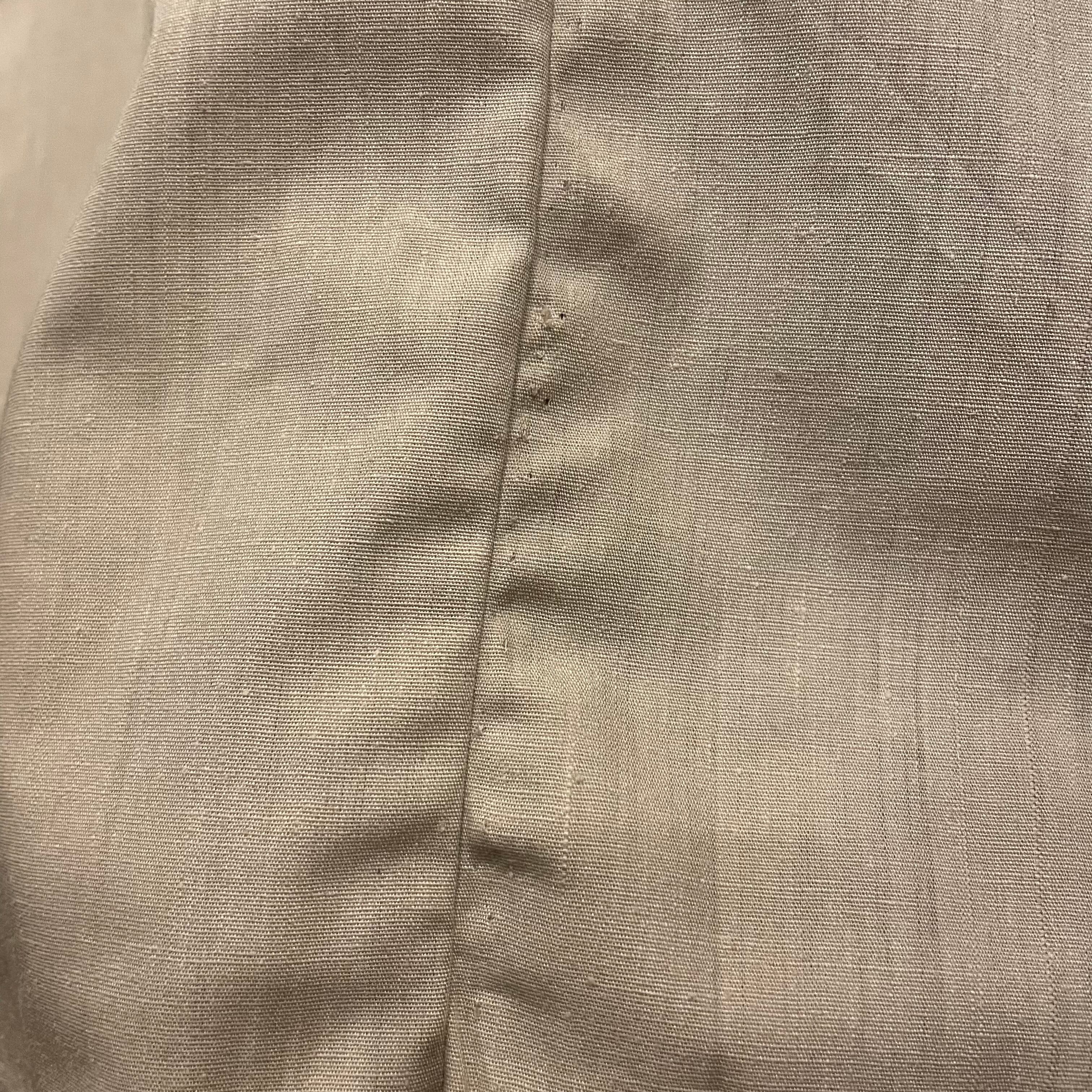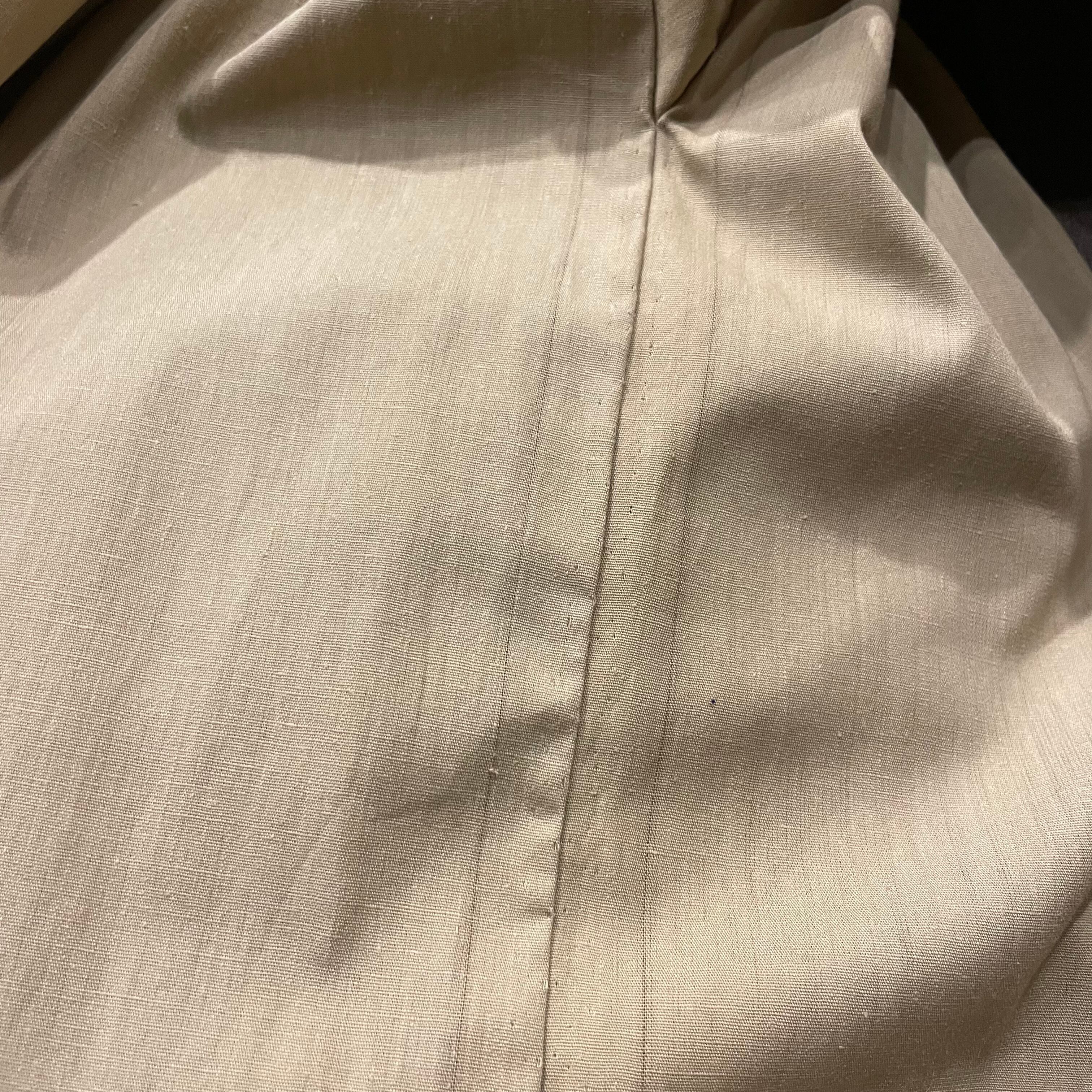 シミやキズ、頑固なシワ、左脇から裾まで生地のみみが使われているのか線とポツポツ穴が開いています。若干縫製の雑さ等も見受けられます。