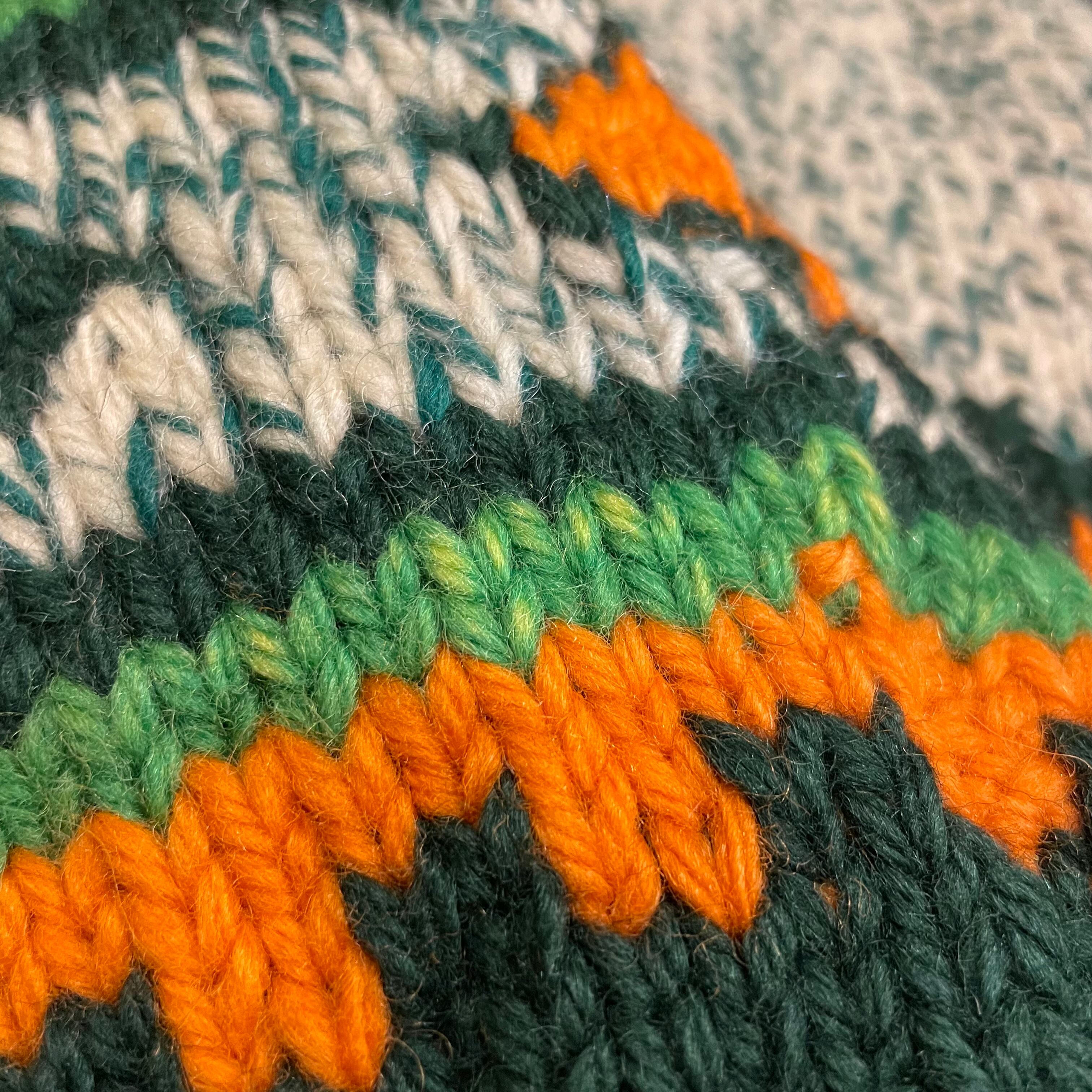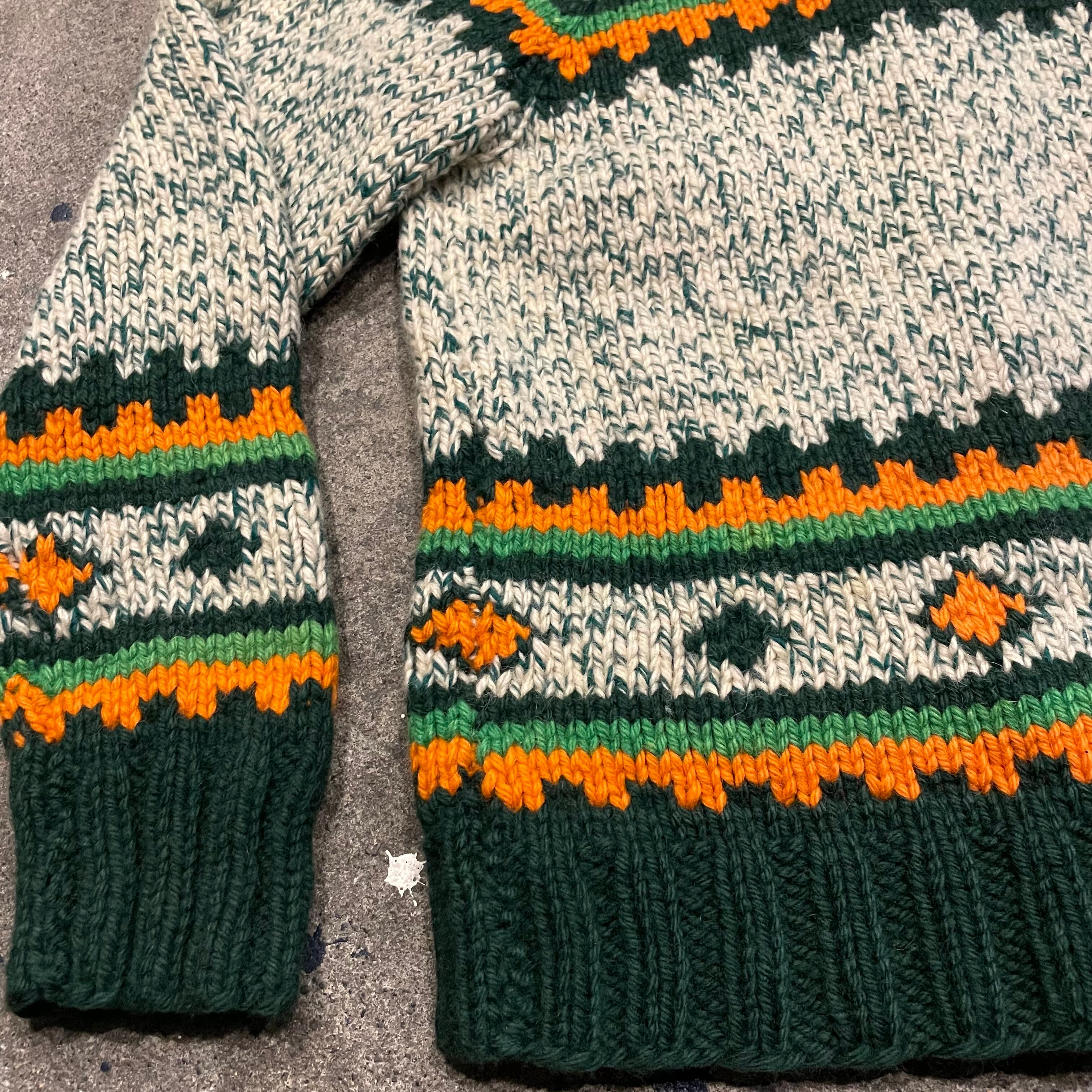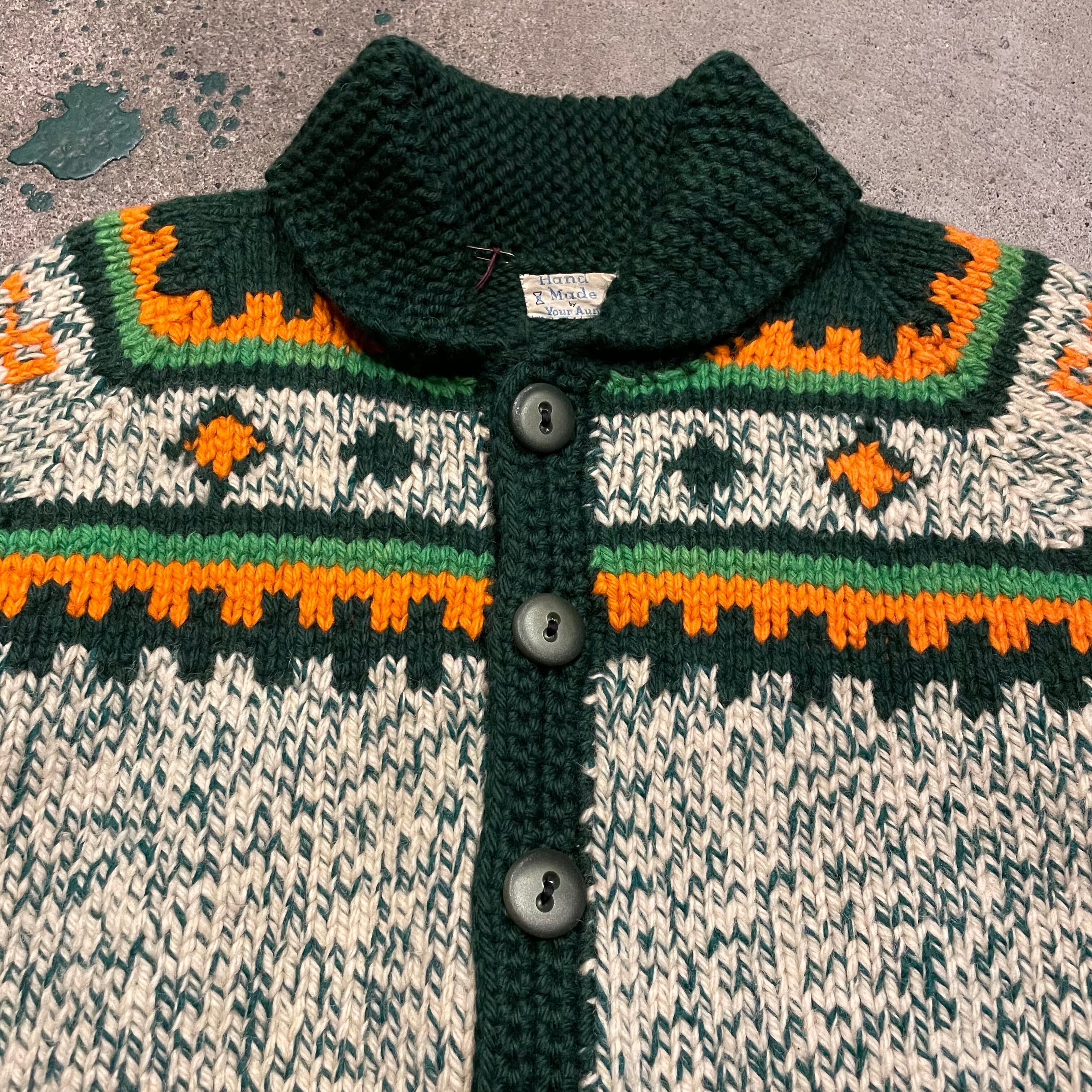 緑×オレンジの色合いがとてもかわいいカーディガンです。手編みのもので丁寧に作られており、しっかり重みもありますが、とても暖かくておすすめの一着です。