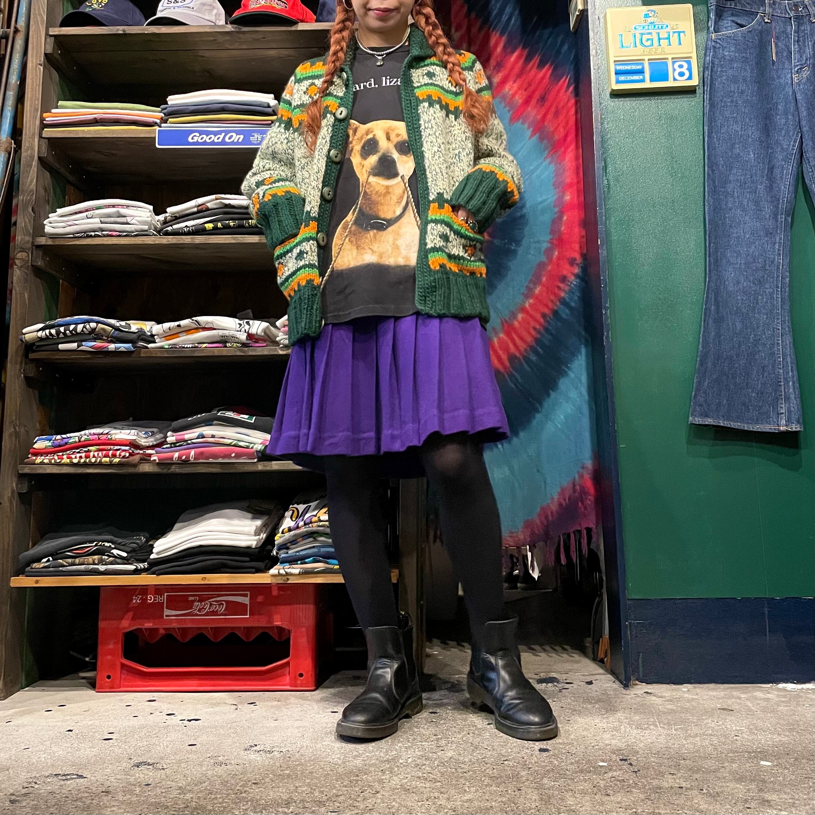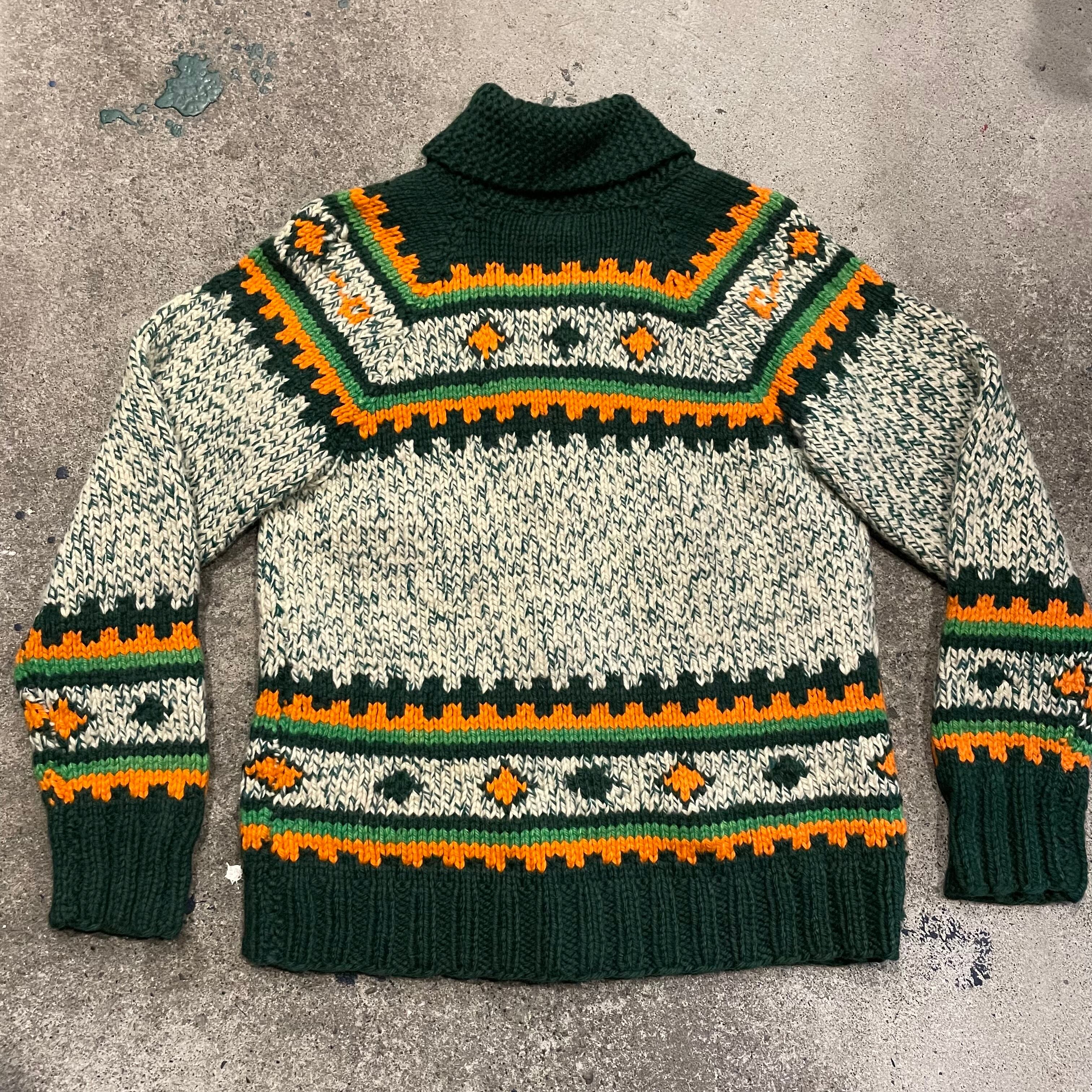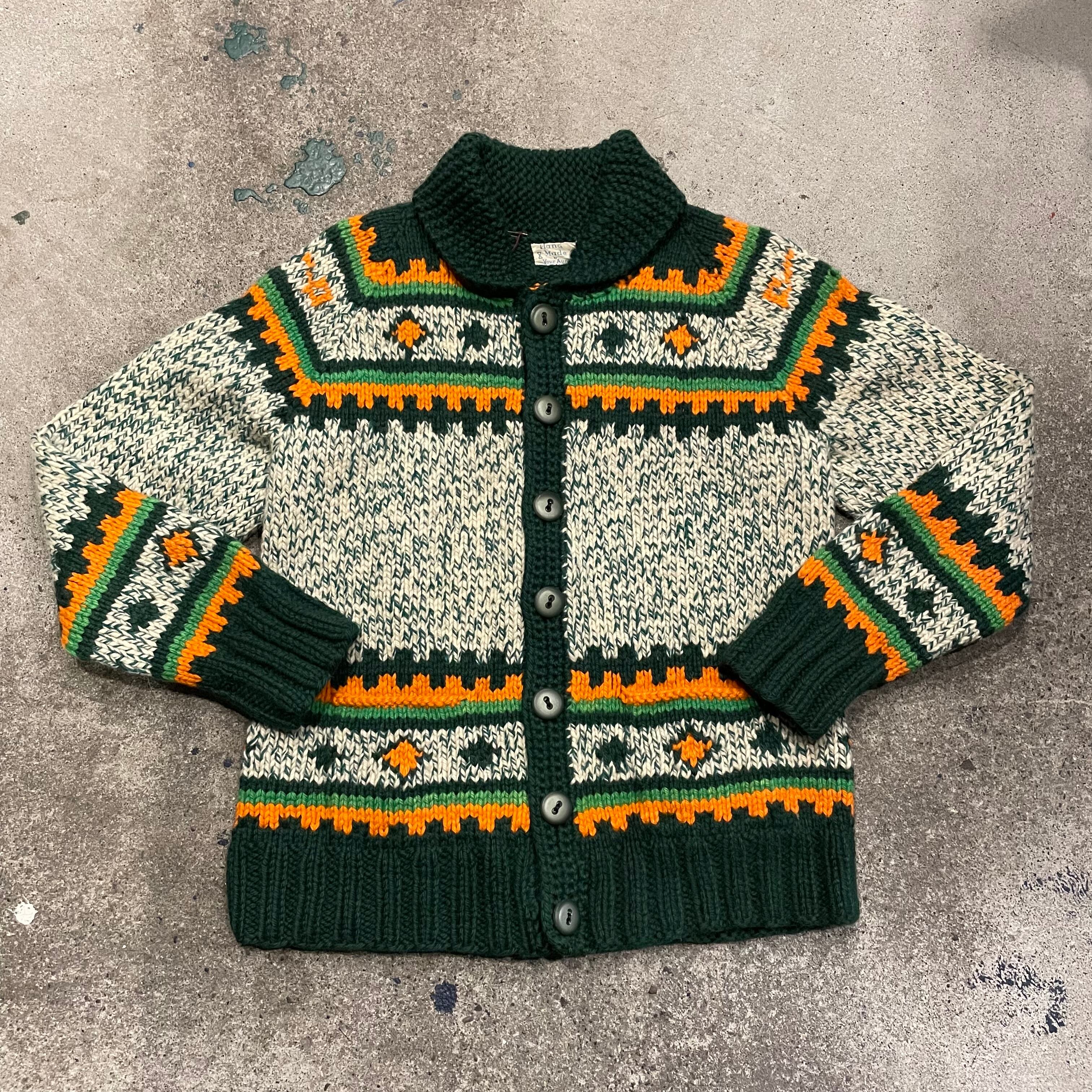 緑×オレンジの色合いがとてもかわいいカーディガンです。手編みのもので丁寧に作られており、しっかり重みもありますが、とても暖かくておすすめの一着です。