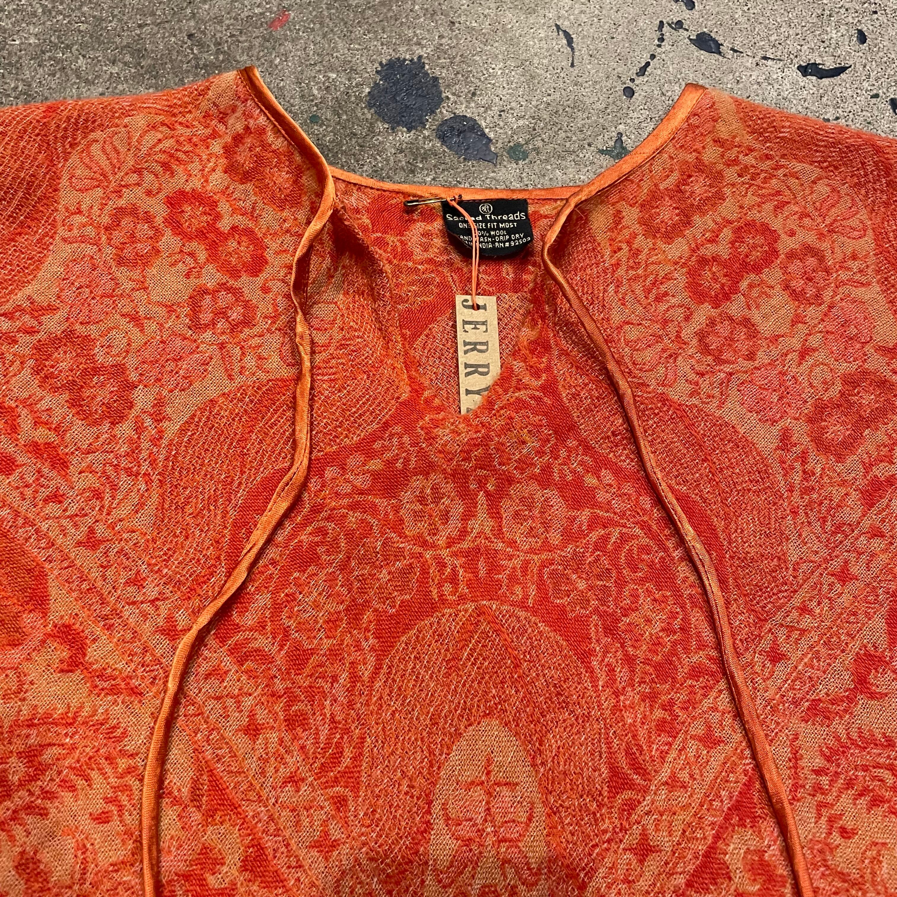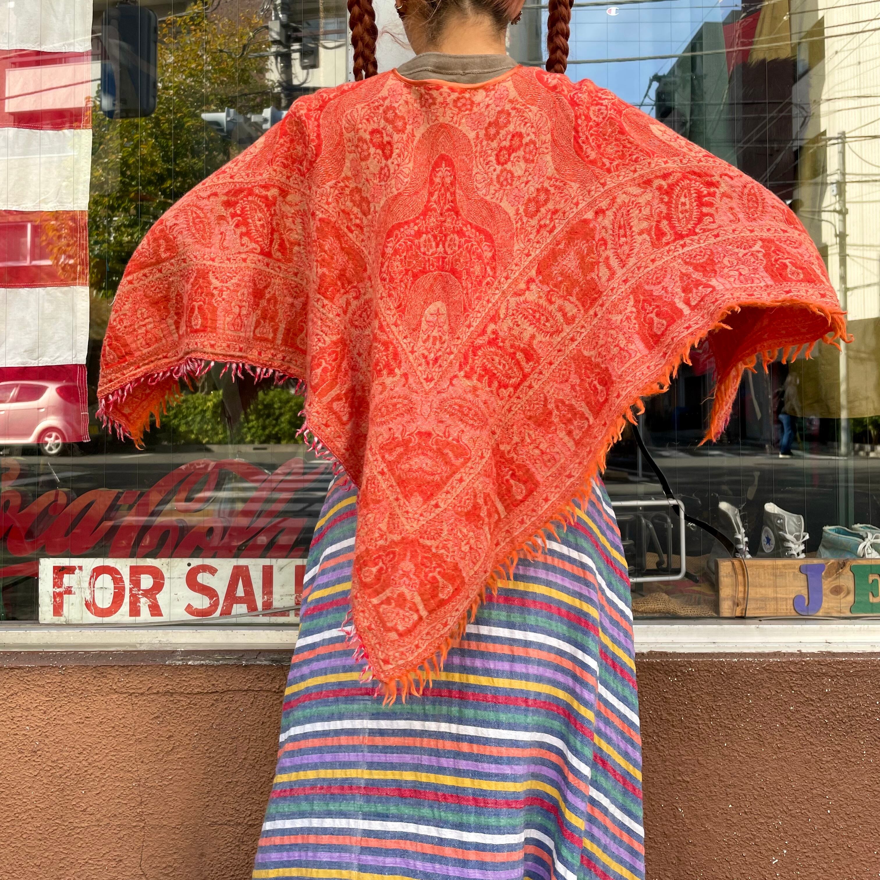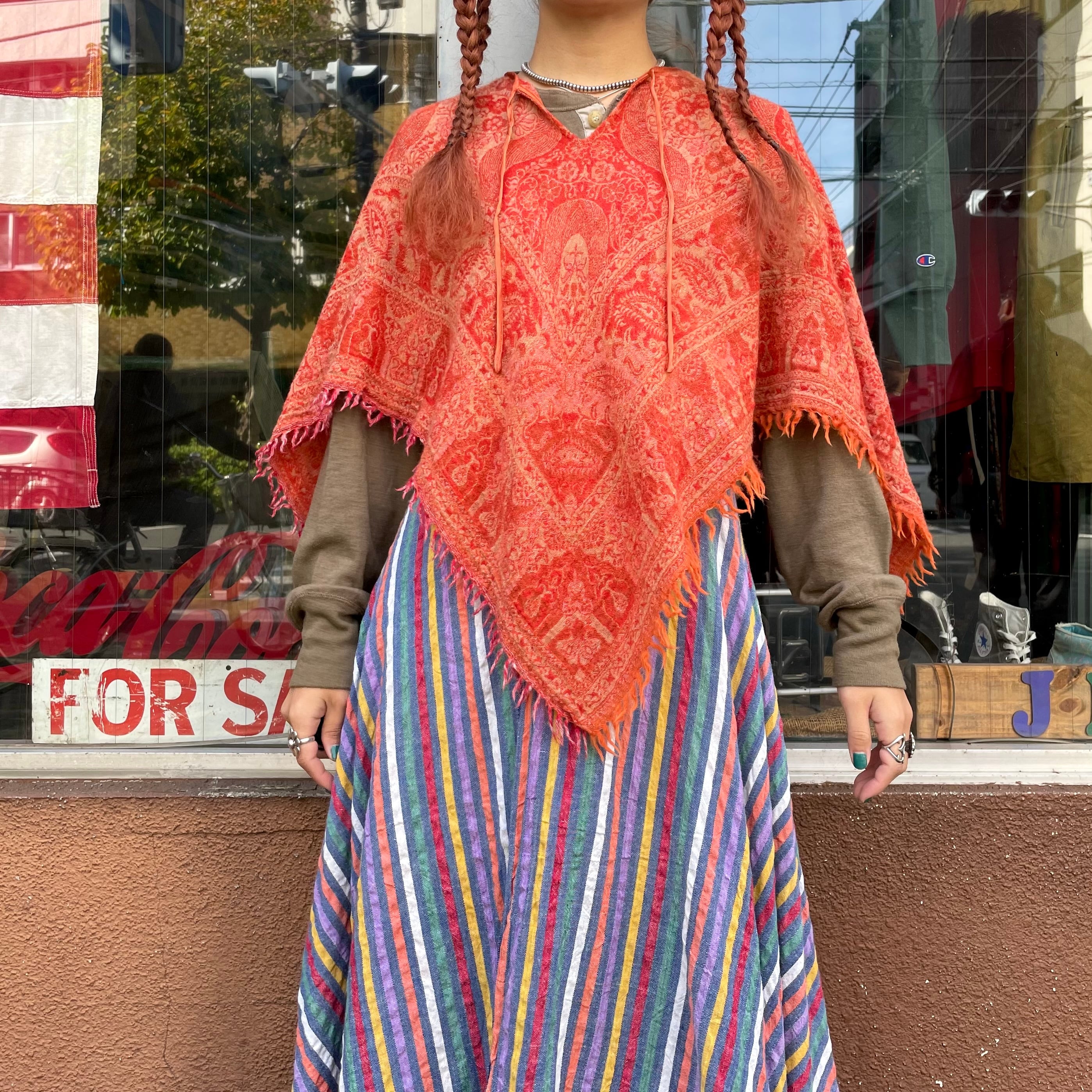 大人っぽいオレンジが良い雰囲気のポンチョです。大判のスカーフを被ったようなデザインがかわいいですし、襟ぐりのボヘミアンなデザインも良い感じです。厚手のニットやパーカーの上に一枚重ねると雰囲気がぐっと変わって楽しいと思います。エスニックなアクセサリーをじゃらっとつけたりしてもかわいいですね!