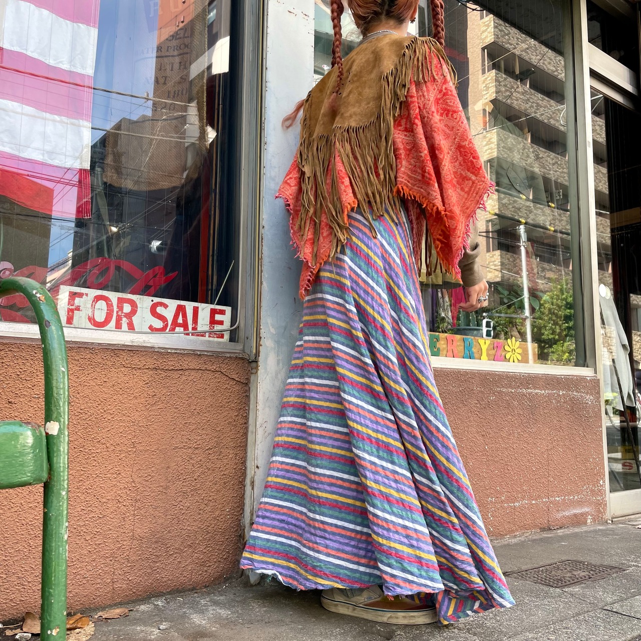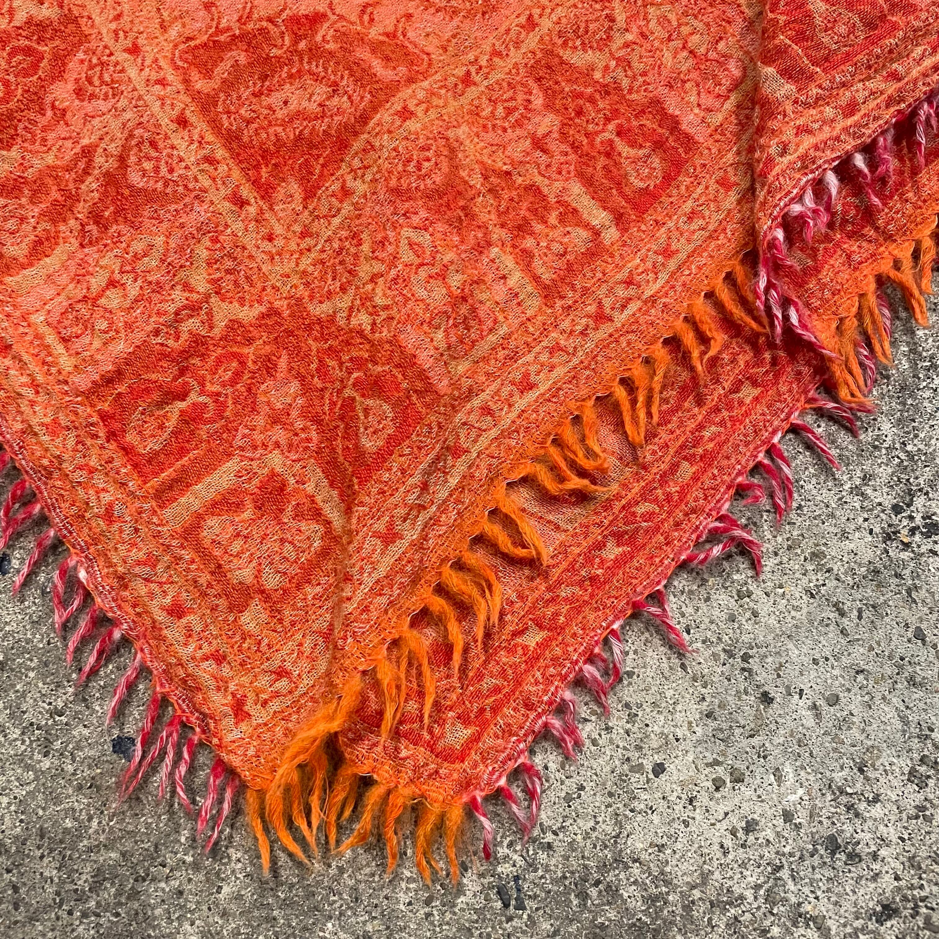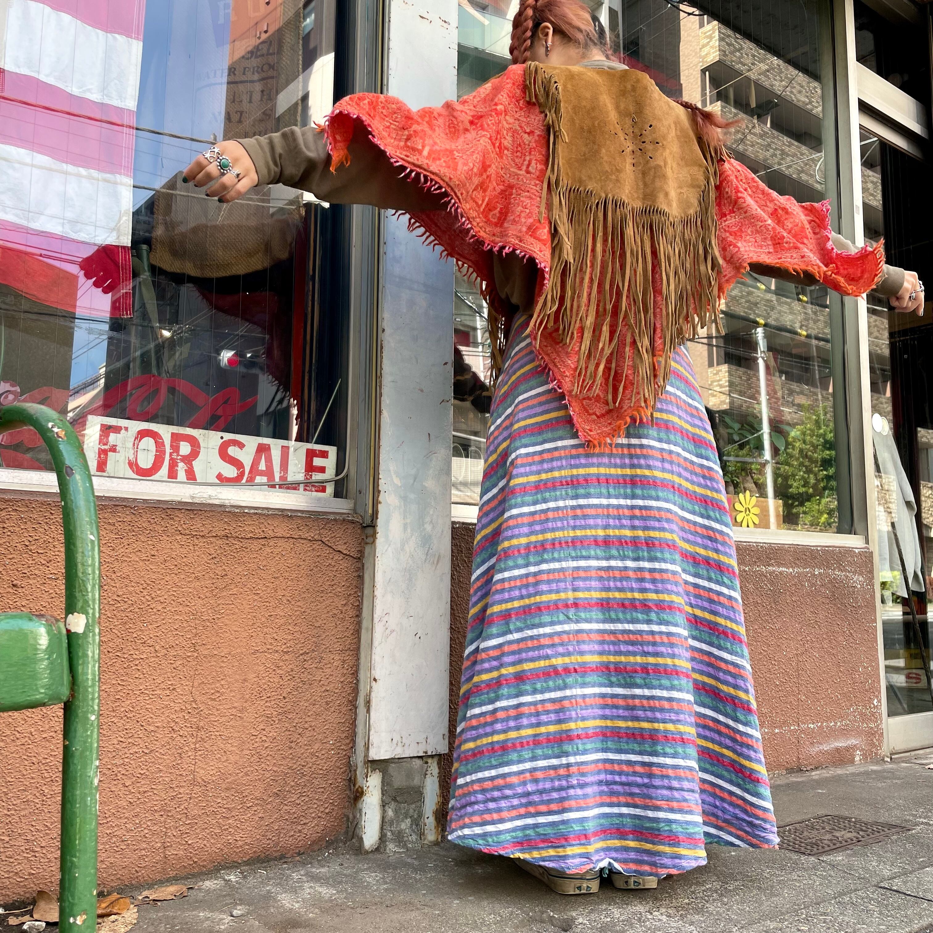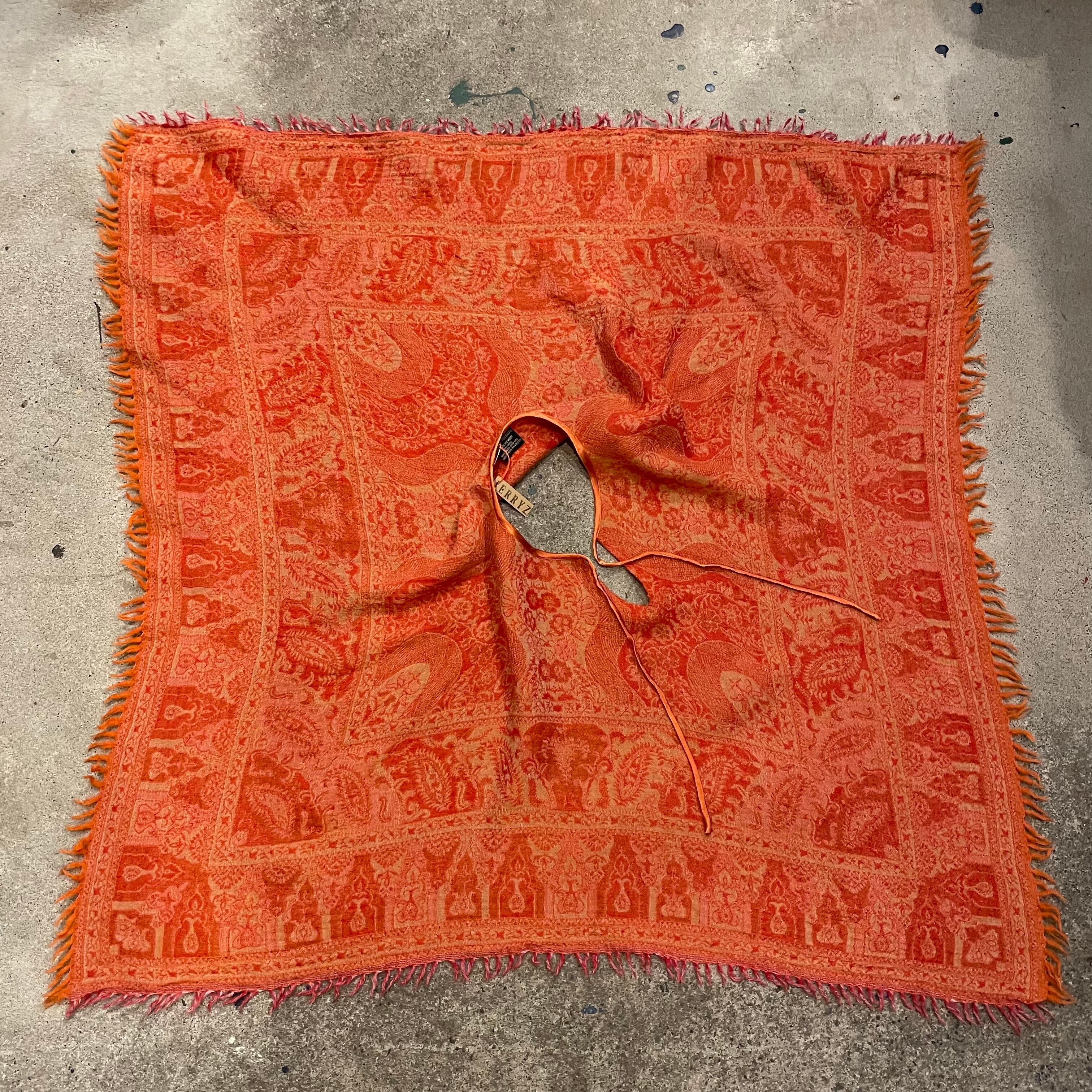 大人っぽいオレンジが良い雰囲気のポンチョです。大判のスカーフを被ったようなデザインがかわいいですし、襟ぐりのボヘミアンなデザインも良い感じです。厚手のニットやパーカーの上に一枚重ねると雰囲気がぐっと変わって楽しいと思います。エスニックなアクセサリーをじゃらっとつけたりしてもかわいいですね!