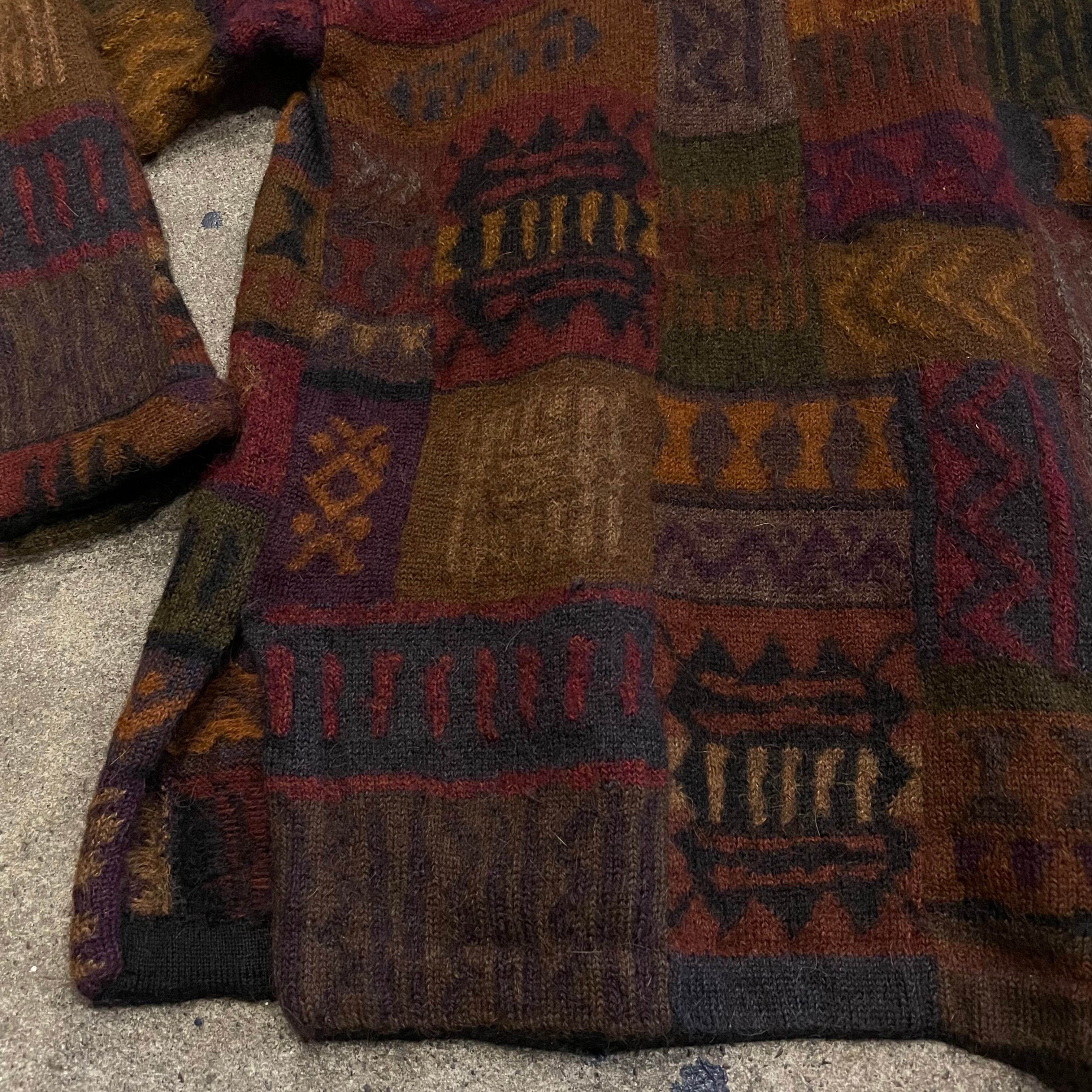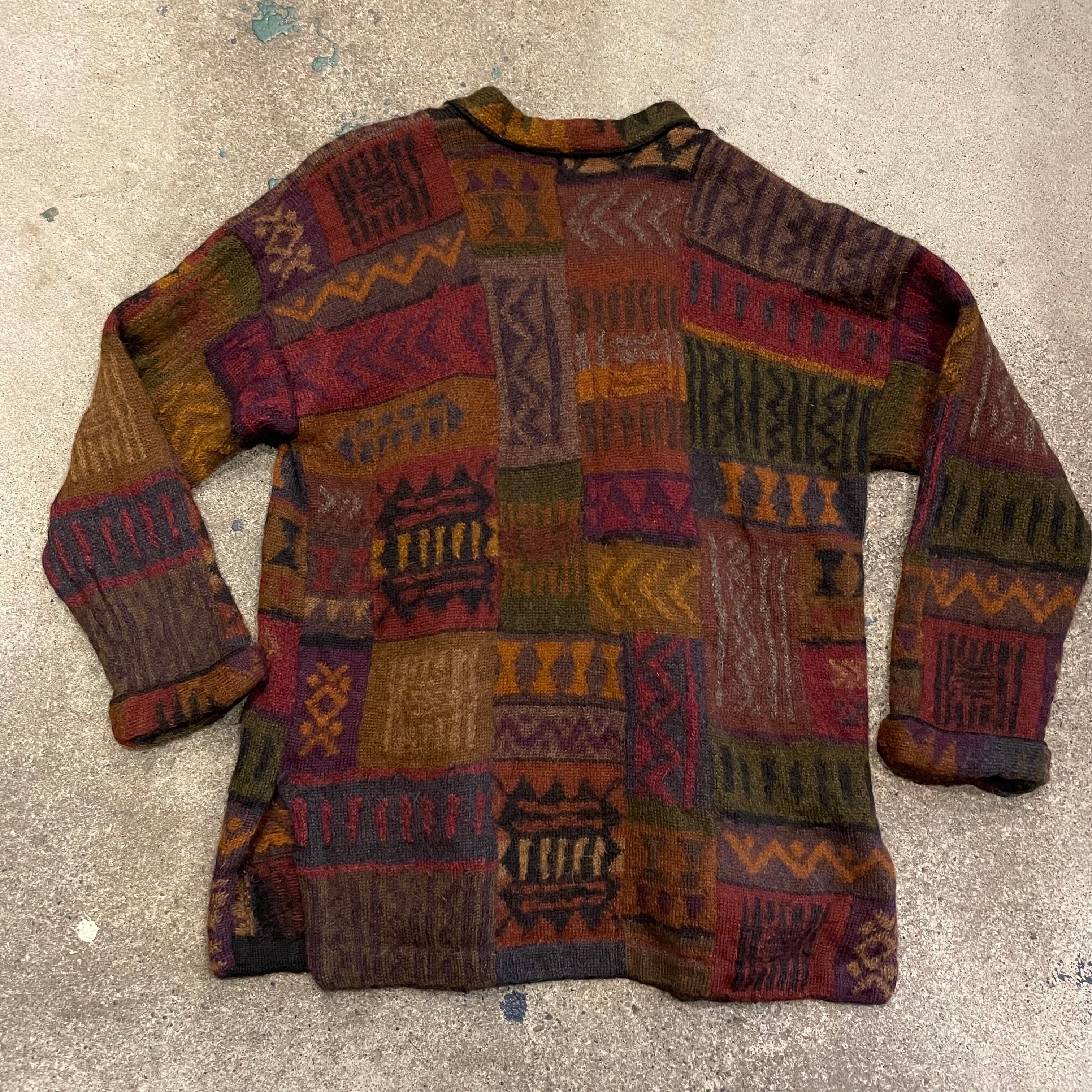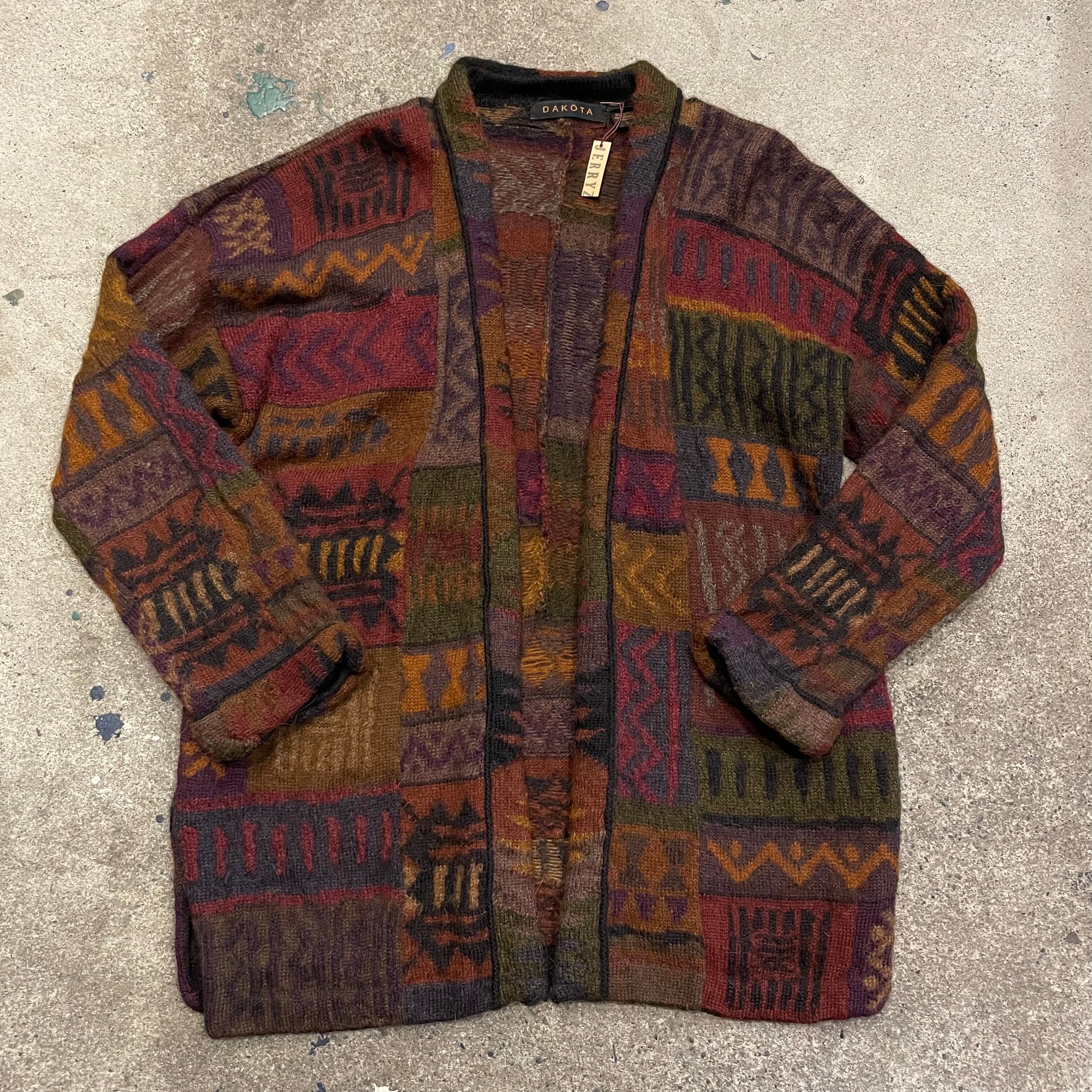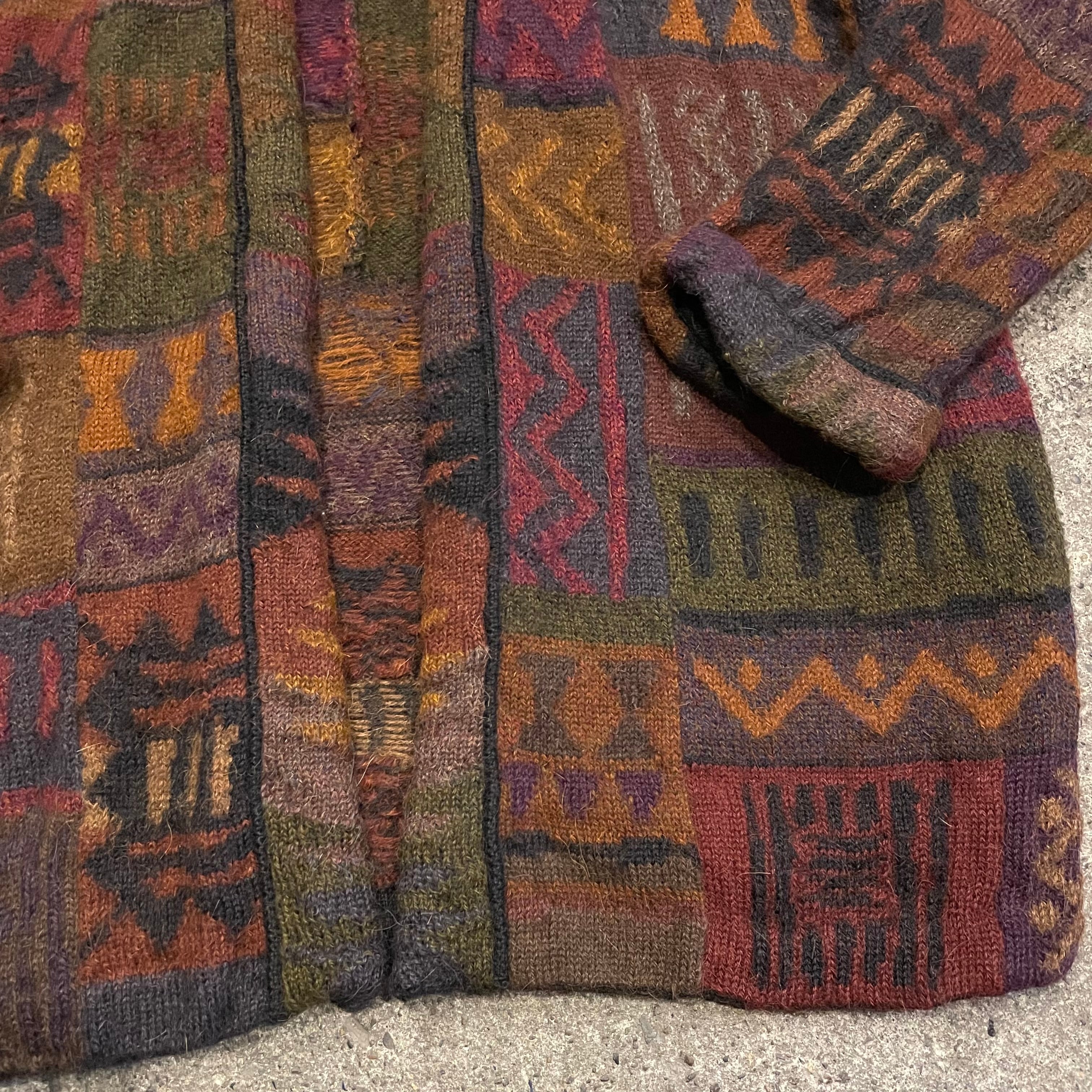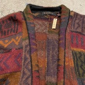 渋めな色味の独特な柄が素敵なニットカーディガンです。