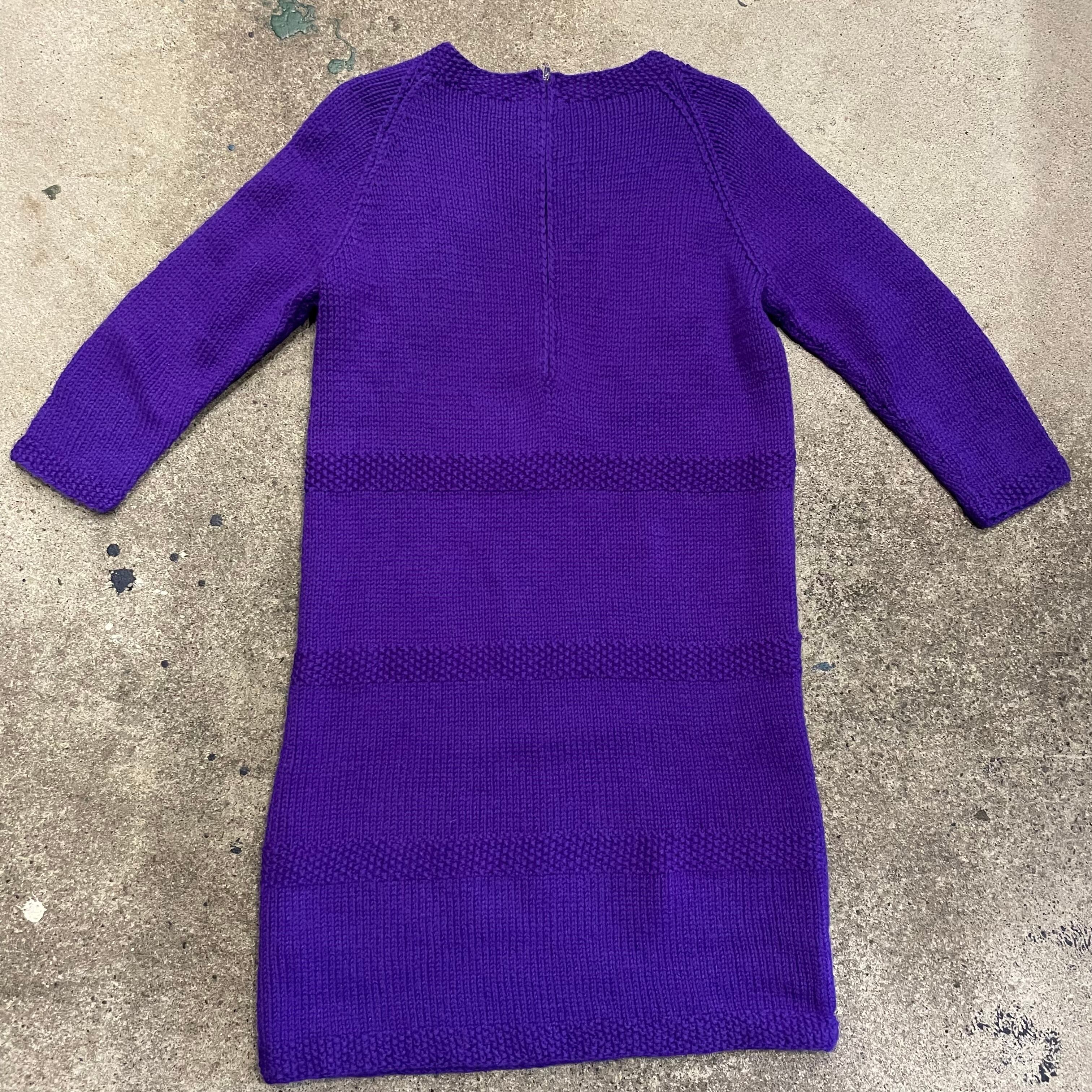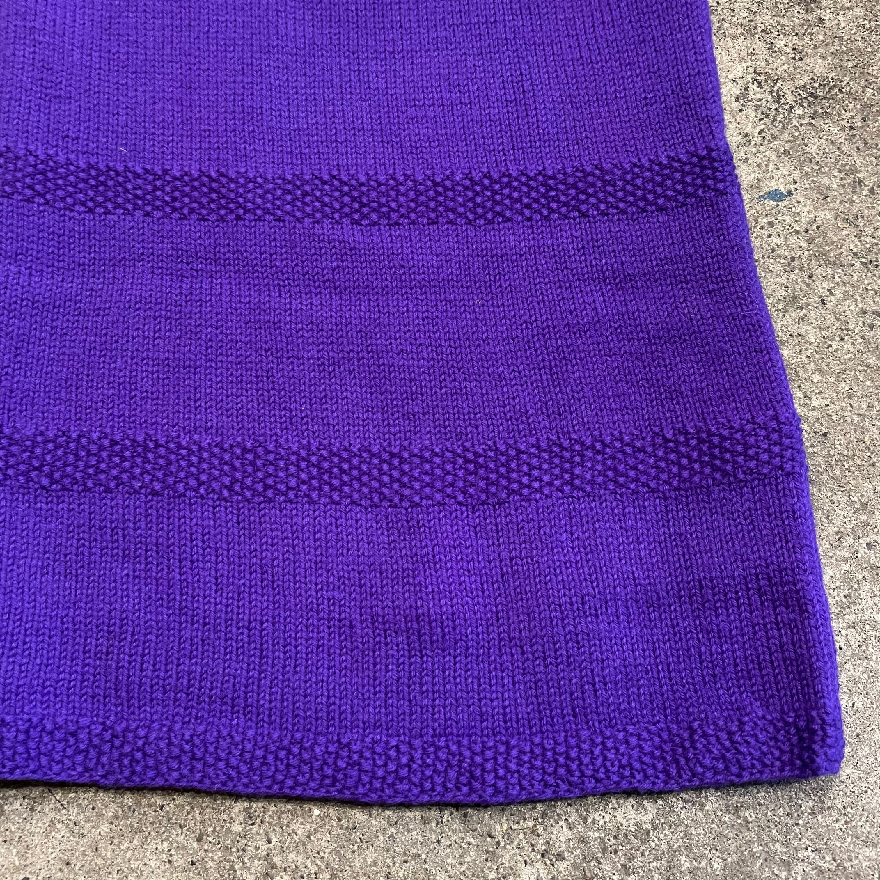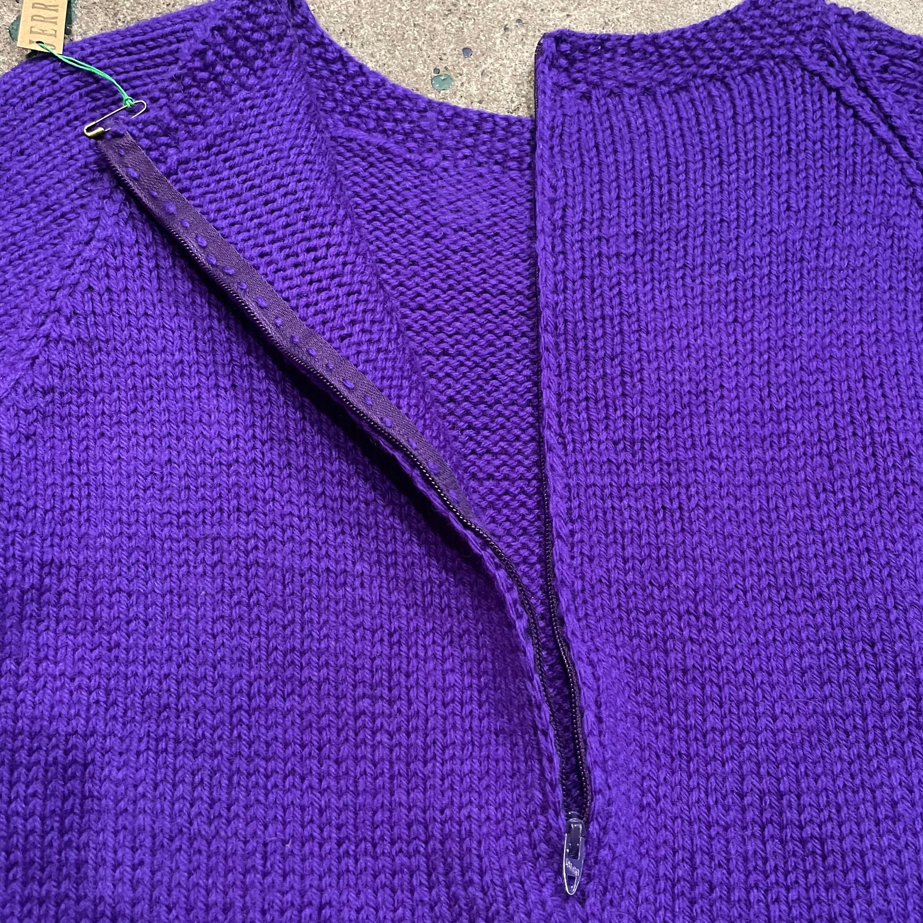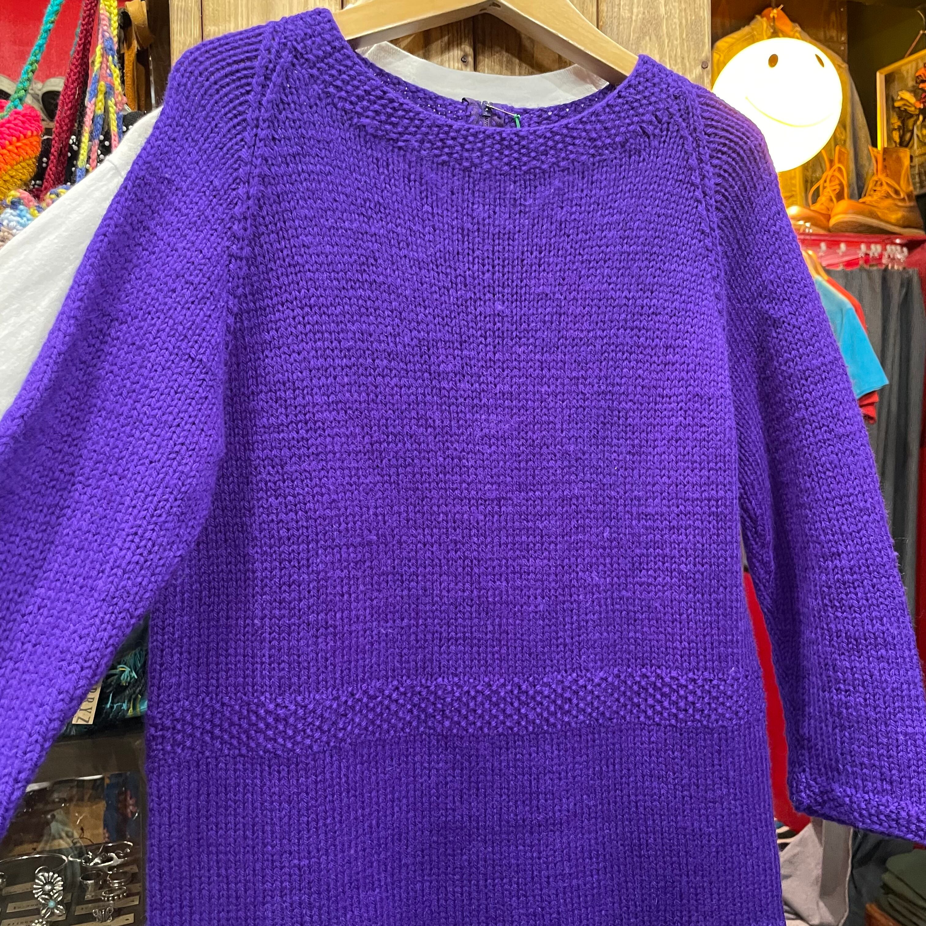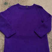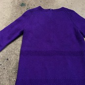 七分丈のラグランスリーブで模様の違う編み目でボーダーのようになっていたり、シンプルながら凝ったデザインがとてもかわいい一着です。