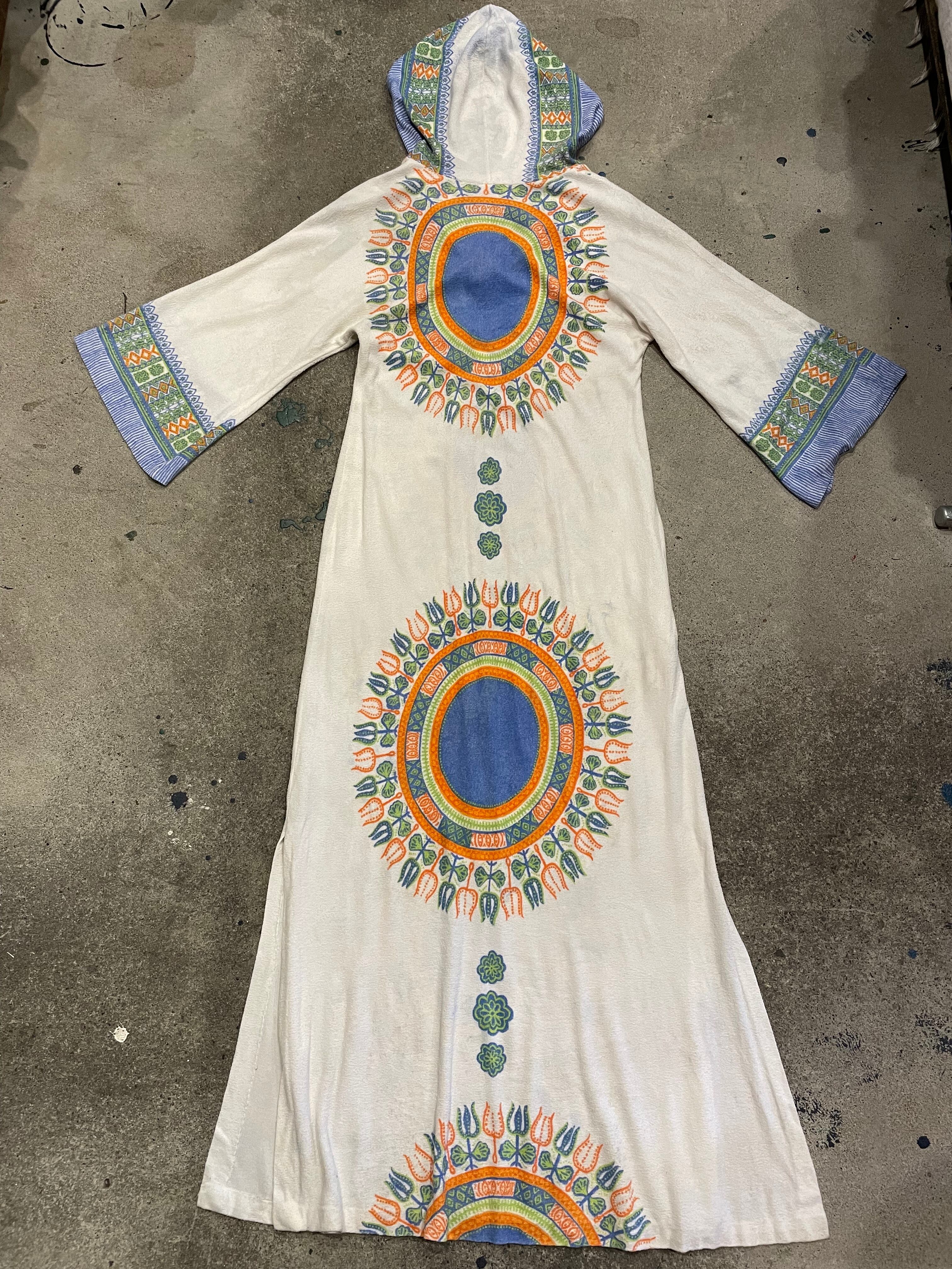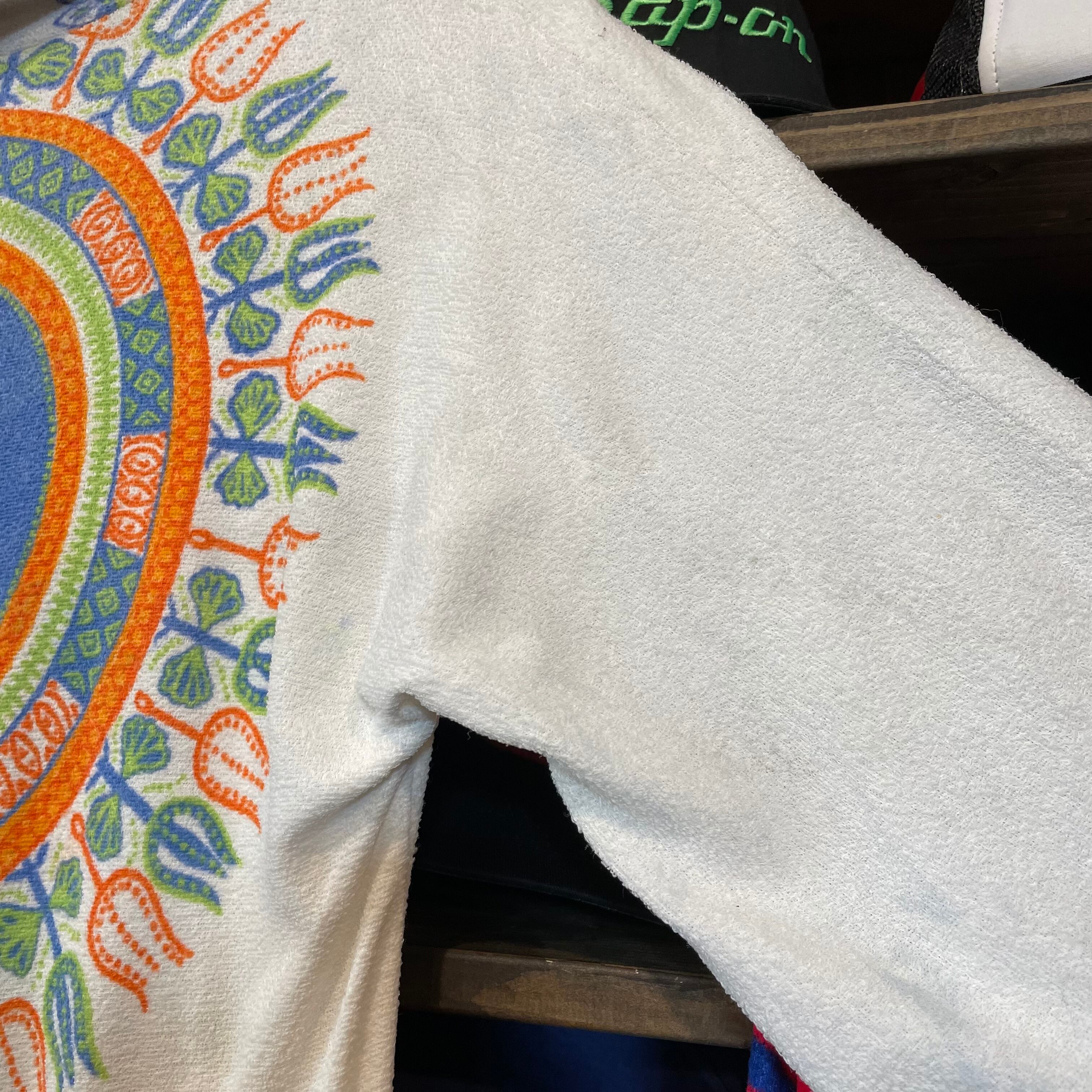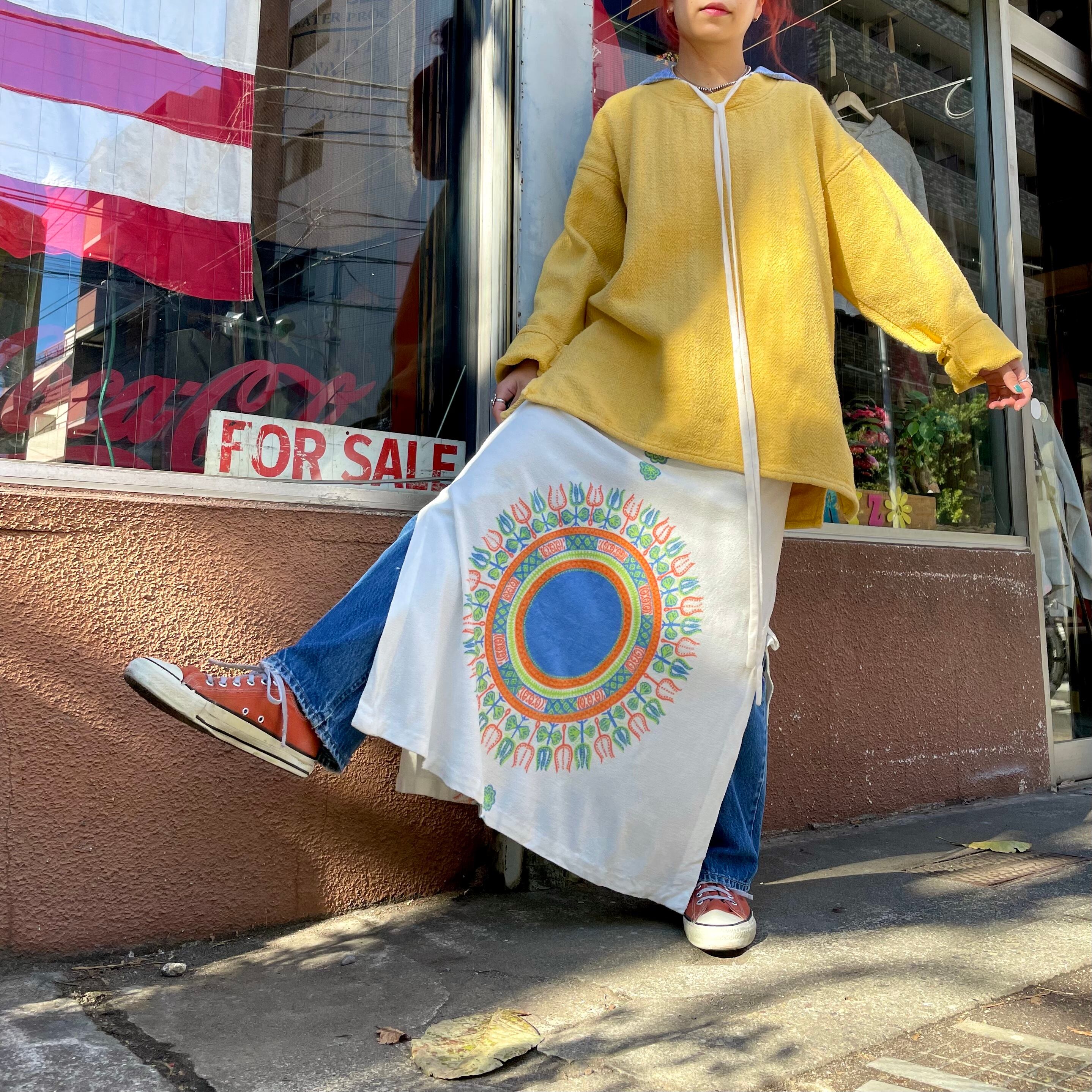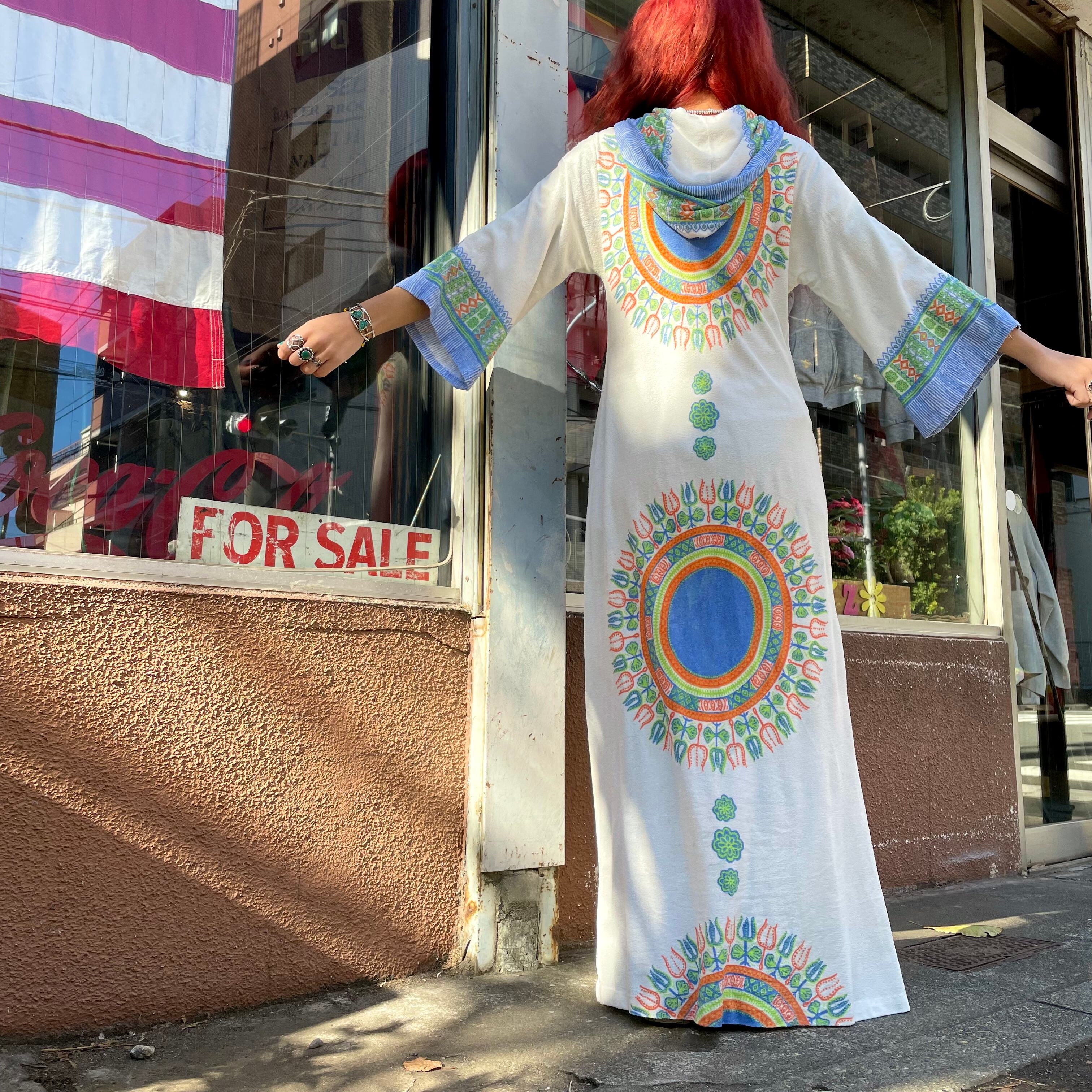 ややフレアスリーブですらっとロングな丈感、フードも付いていてシルエットがとてもかわいい一着です。丸の周りにチューリップがたくさんな模様もかわいいですし、色味も素敵です。
