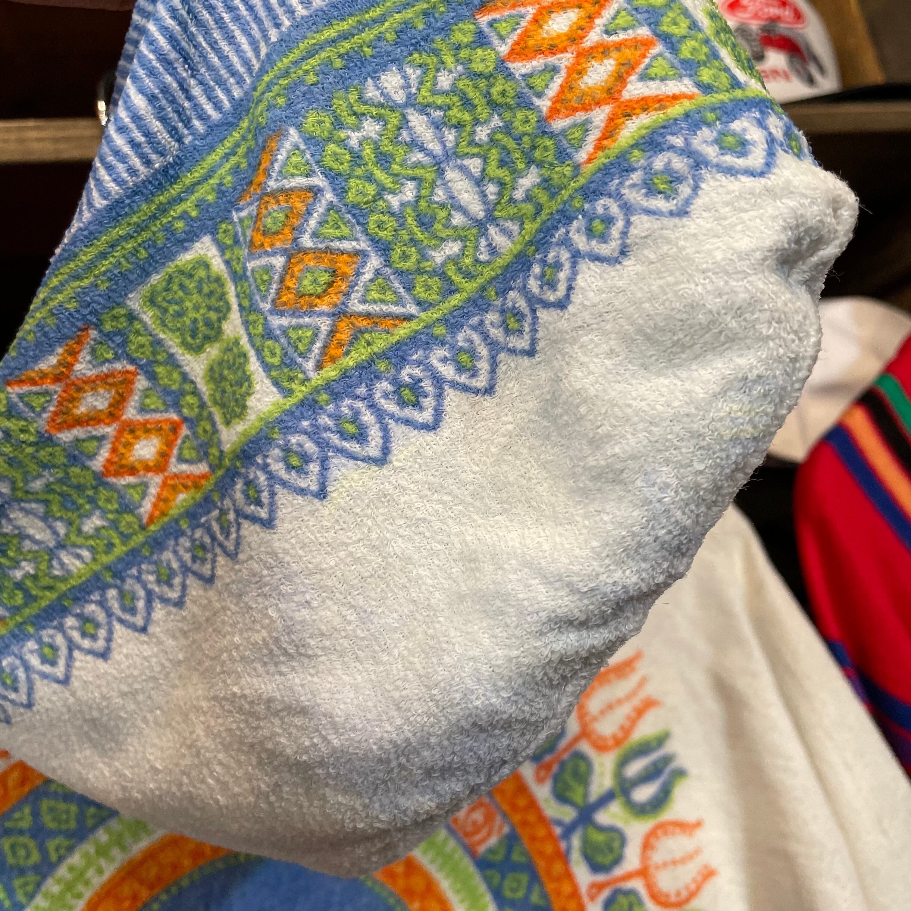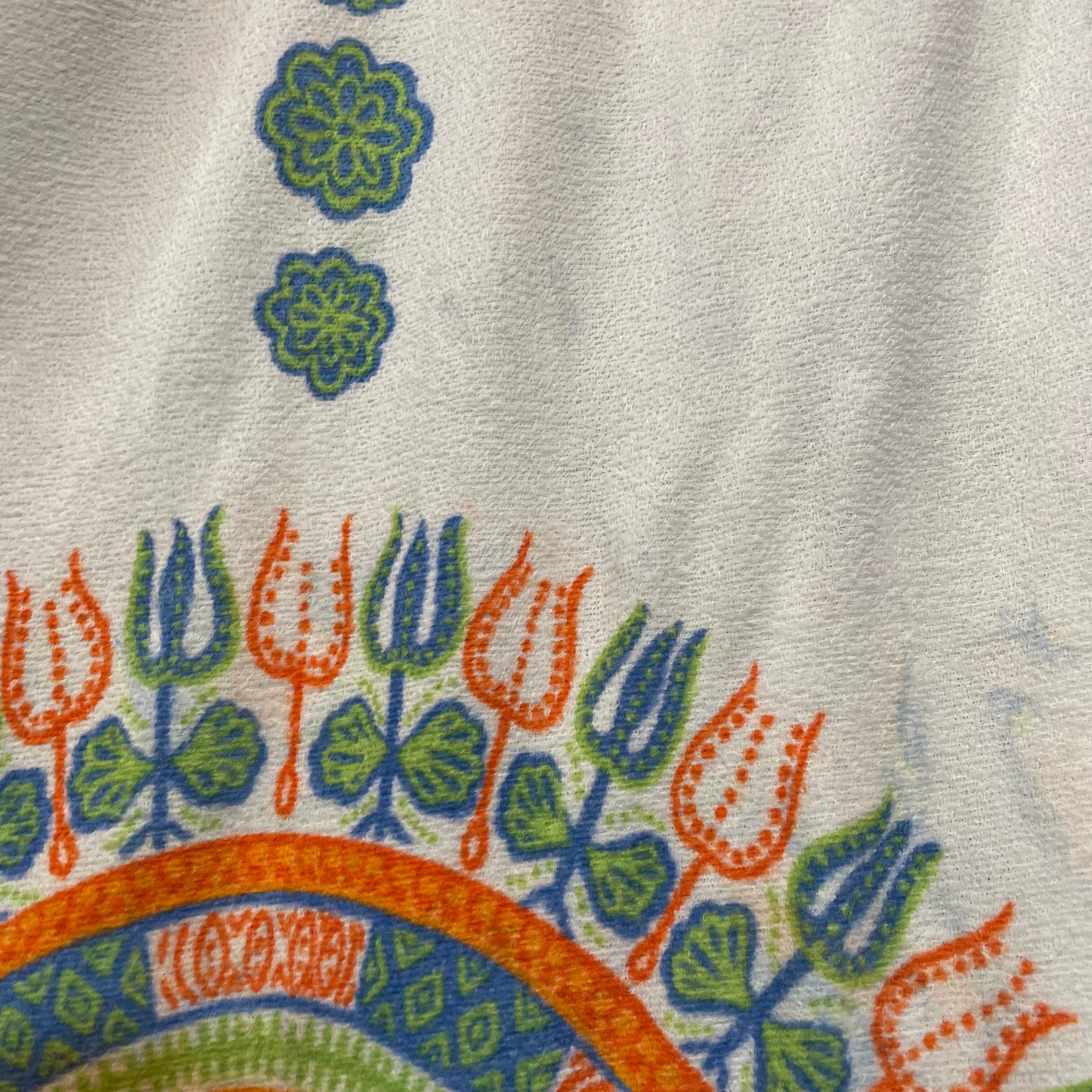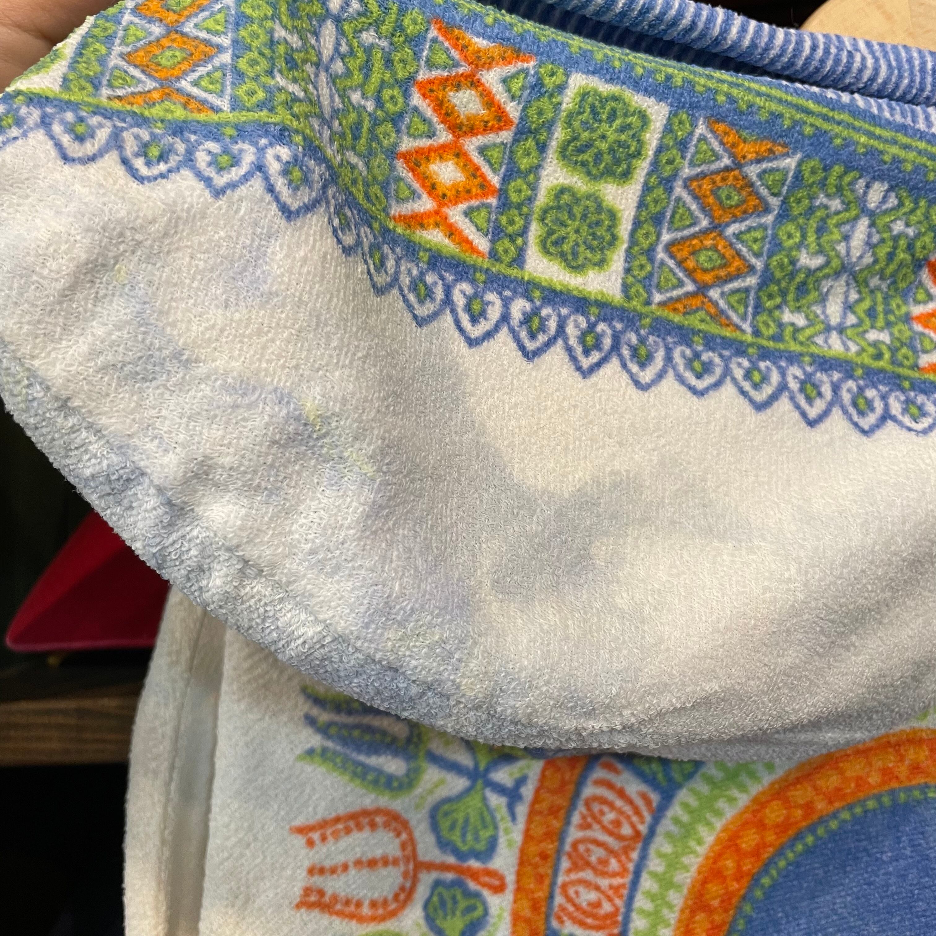 ややフレアスリーブですらっとロングな丈感、フードも付いていてシルエットがとてもかわいい一着です。丸の周りにチューリップがたくさんな模様もかわいいですし、色味も素敵です。