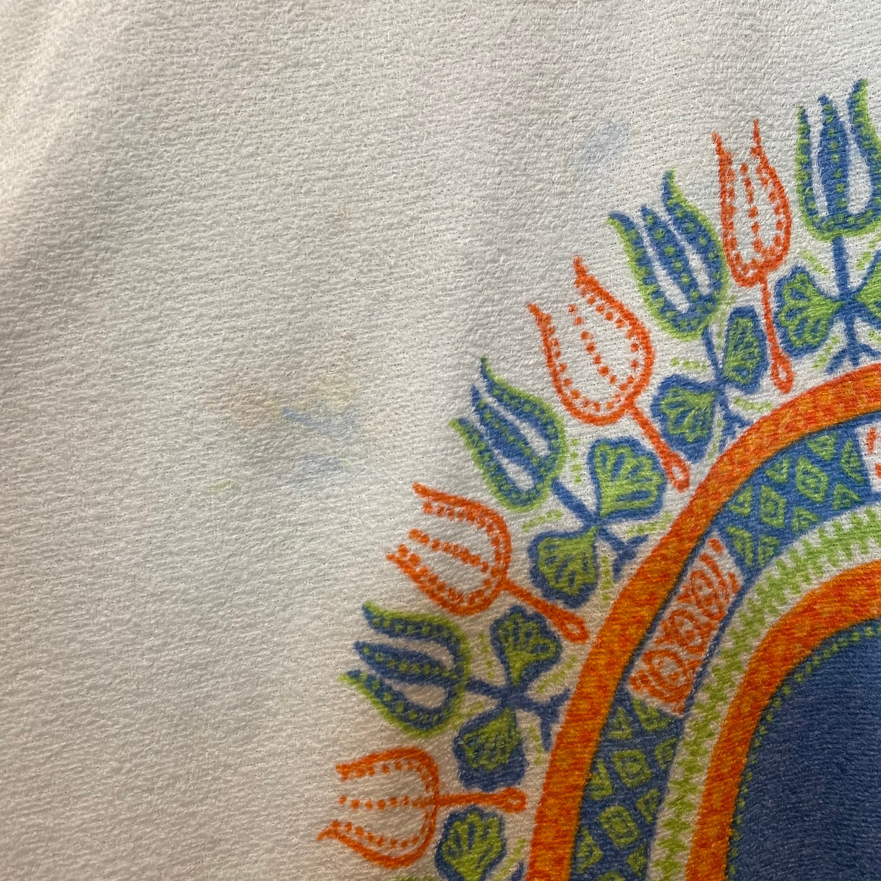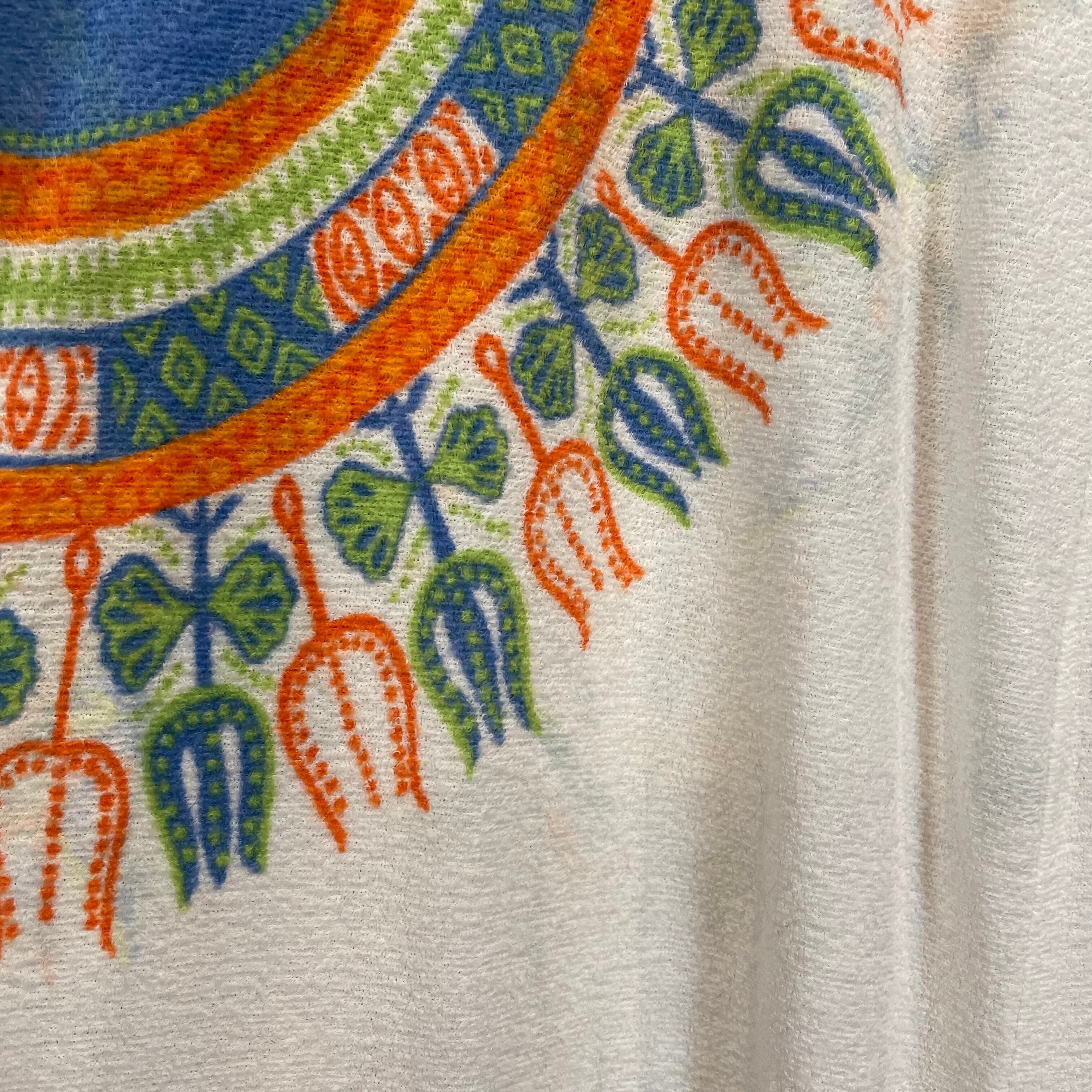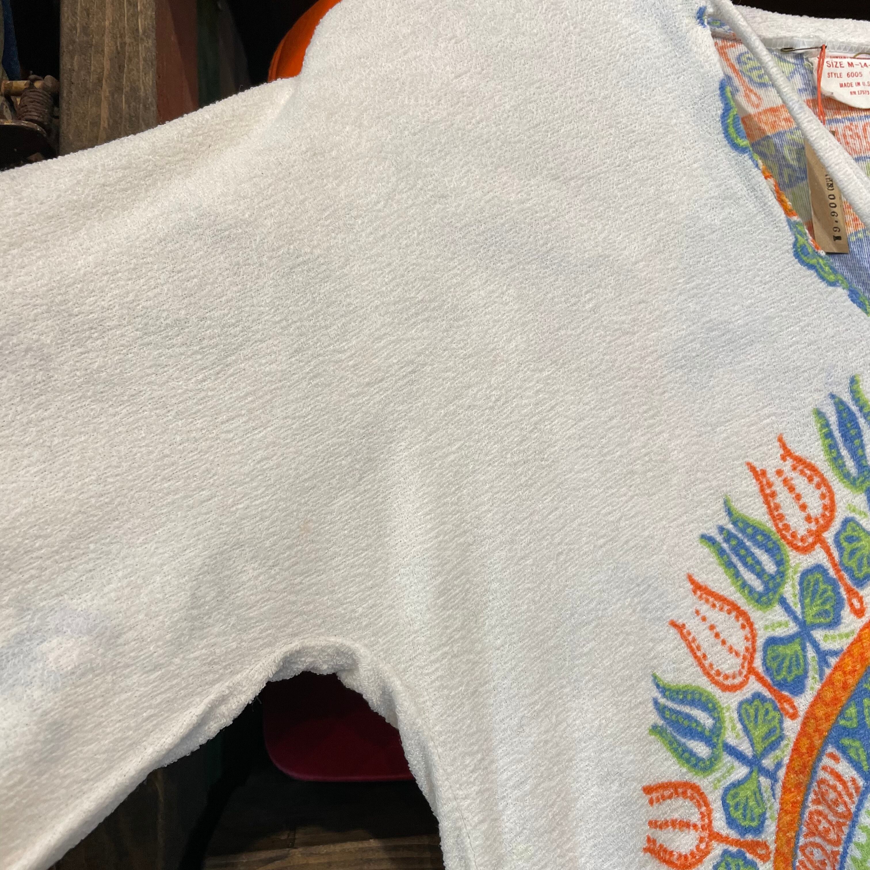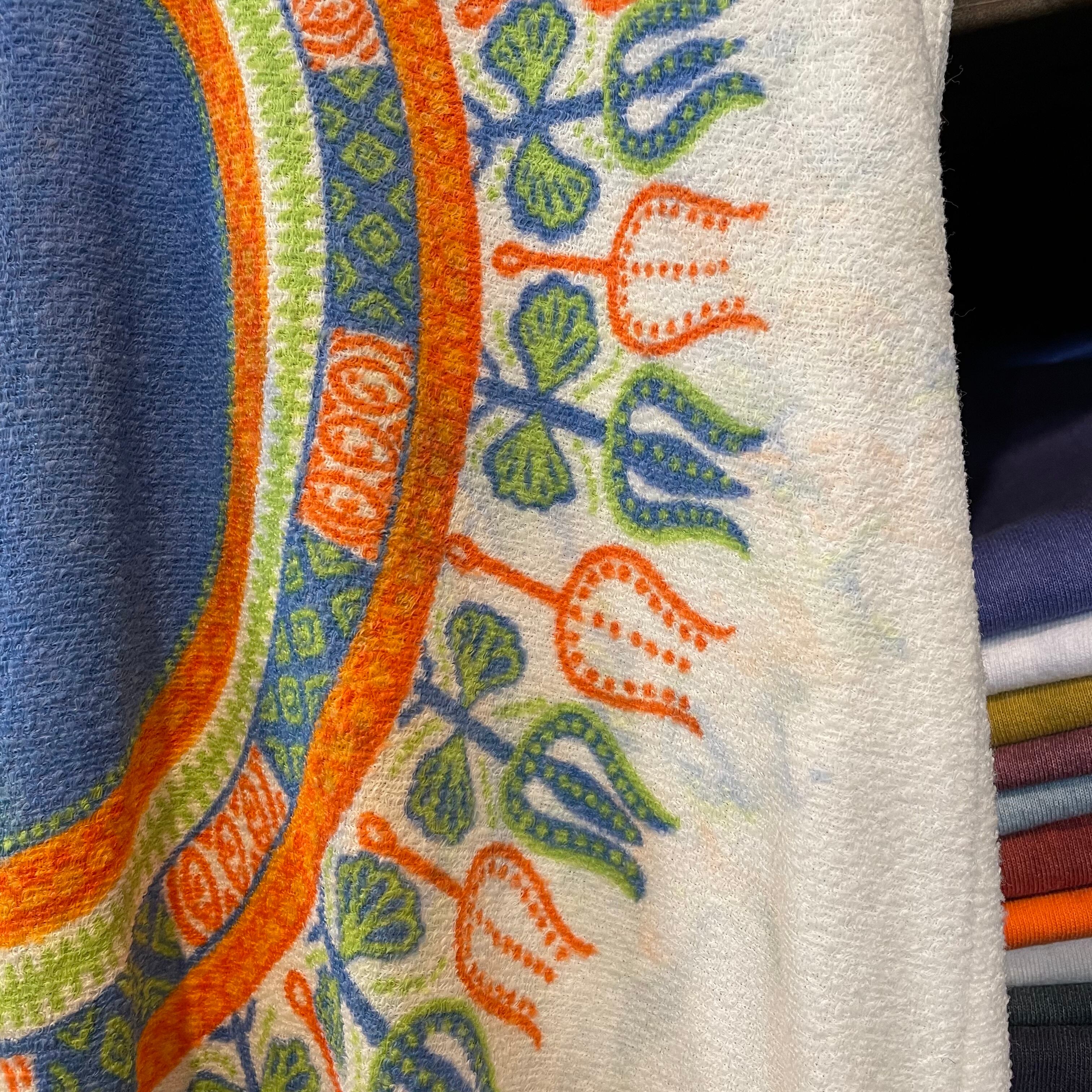 ややフレアスリーブですらっとロングな丈感、フードも付いていてシルエットがとてもかわいい一着です。丸の周りにチューリップがたくさんな模様もかわいいですし、色味も素敵です。