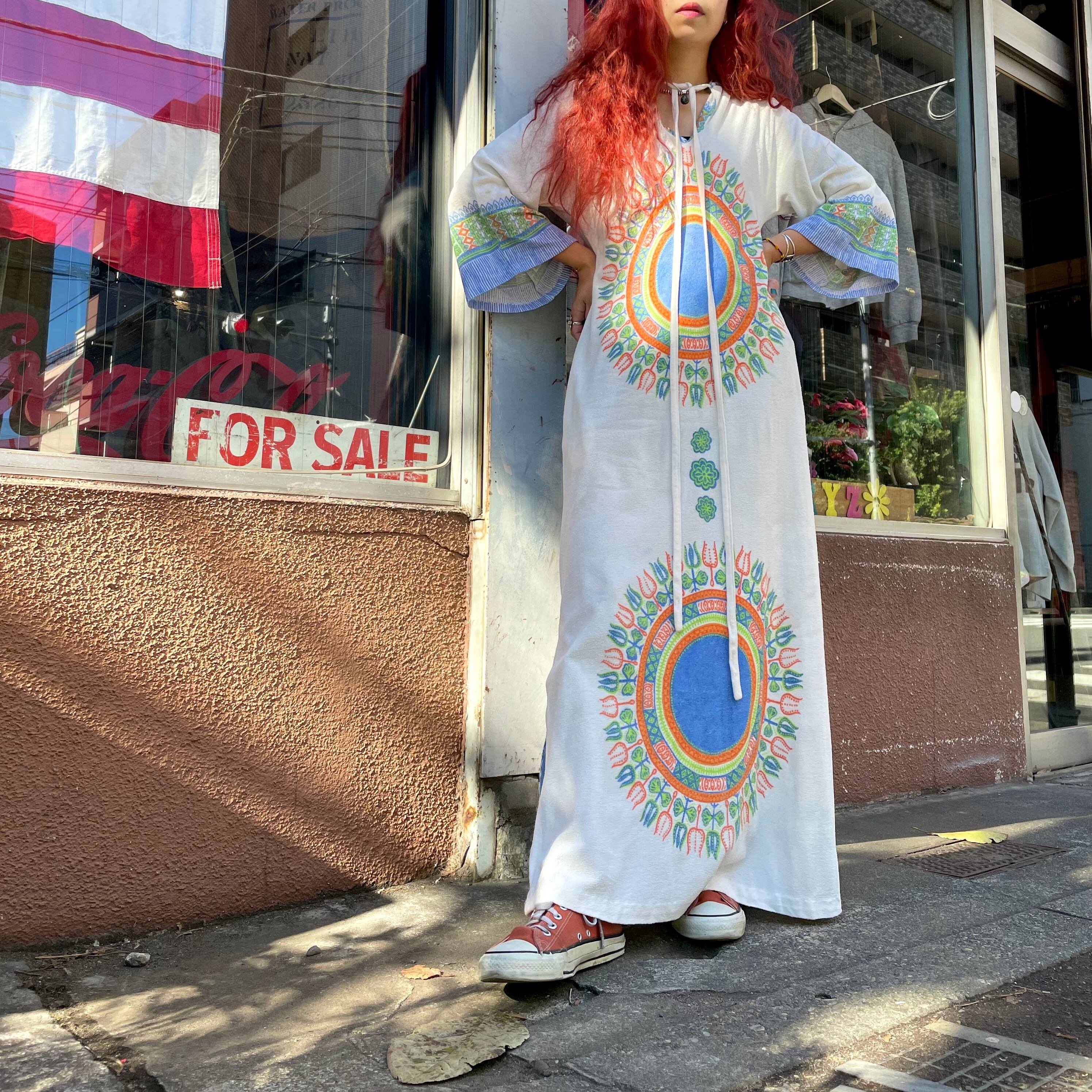 襟ぐりの紐がやたらと長いのもおもしろい、かなり存在感のあるワンピースです。